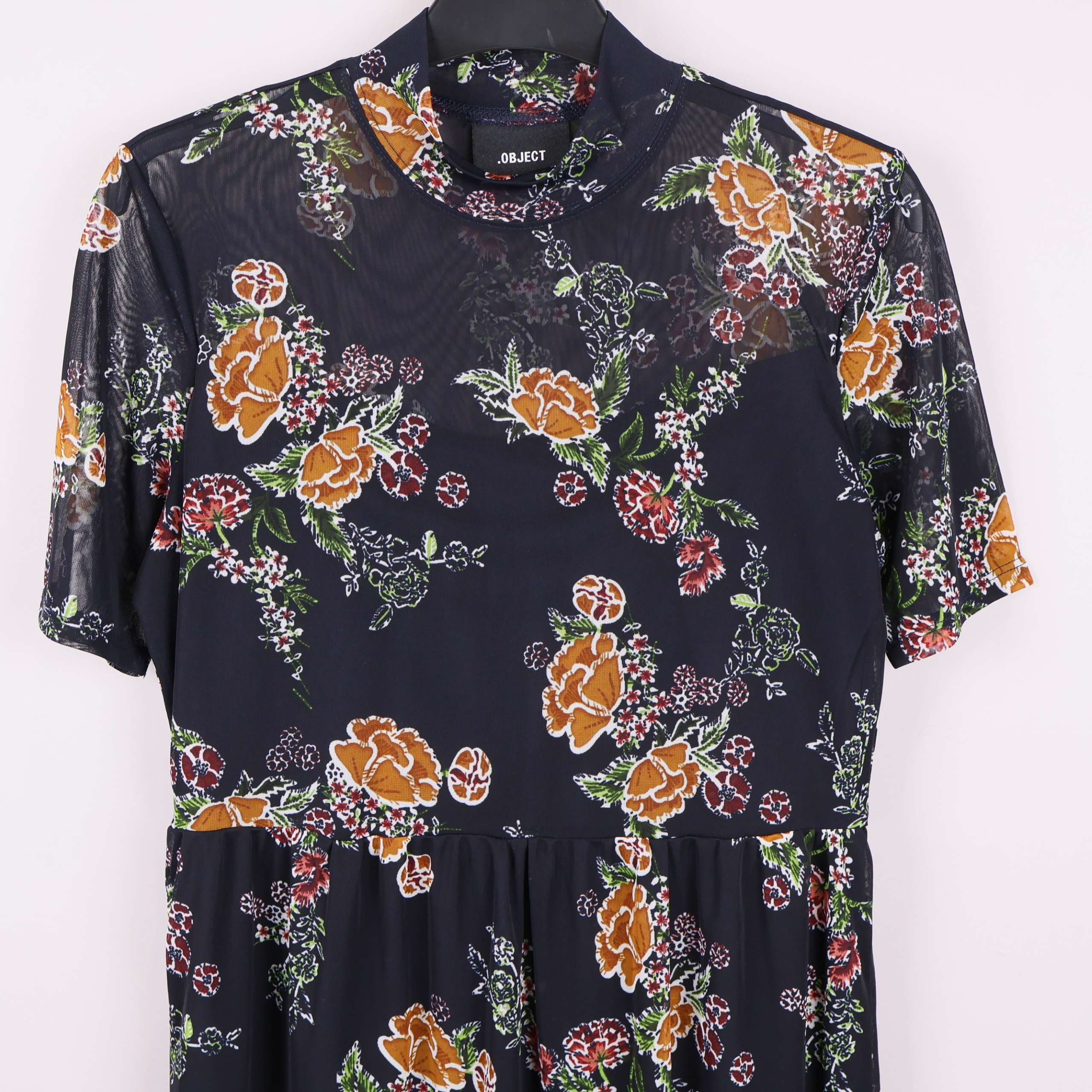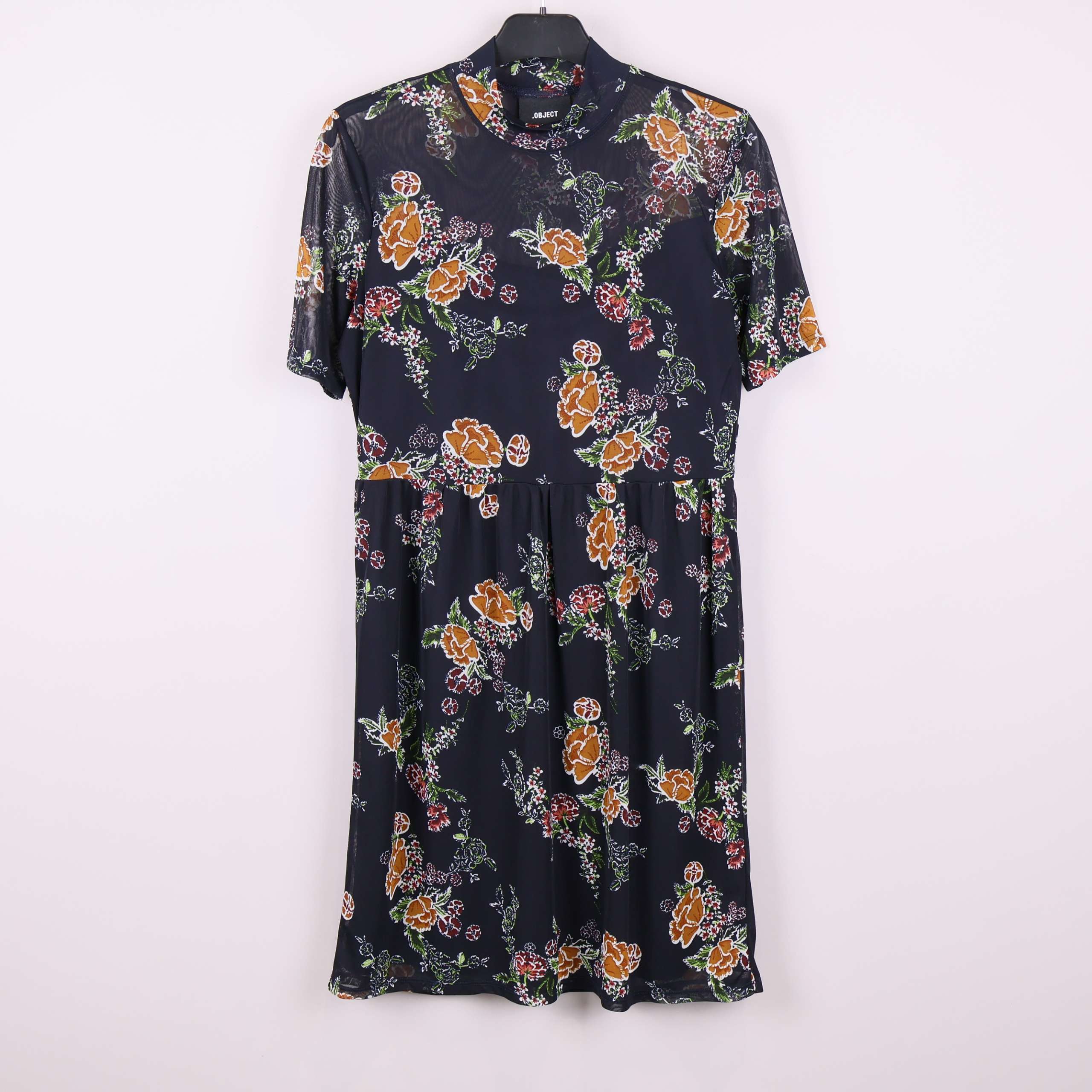 Kortärmad klänning i mesh med blommigt mönster och mörk botten. Tyget har en transparent känsla upptill, medan kjolen har ett mjukare innerfoder. Midjan har en lätt rynkad effekt för en relaxed fit.