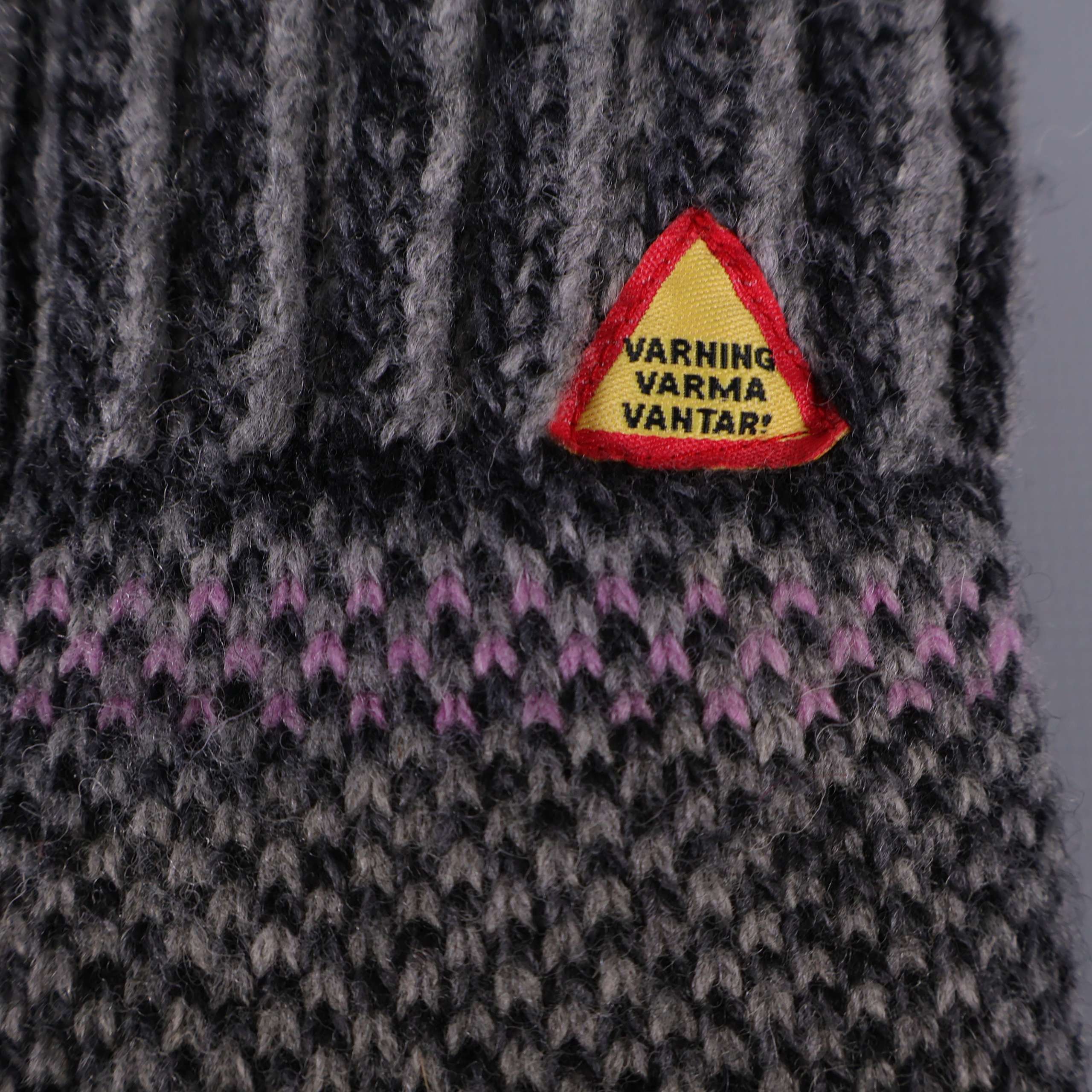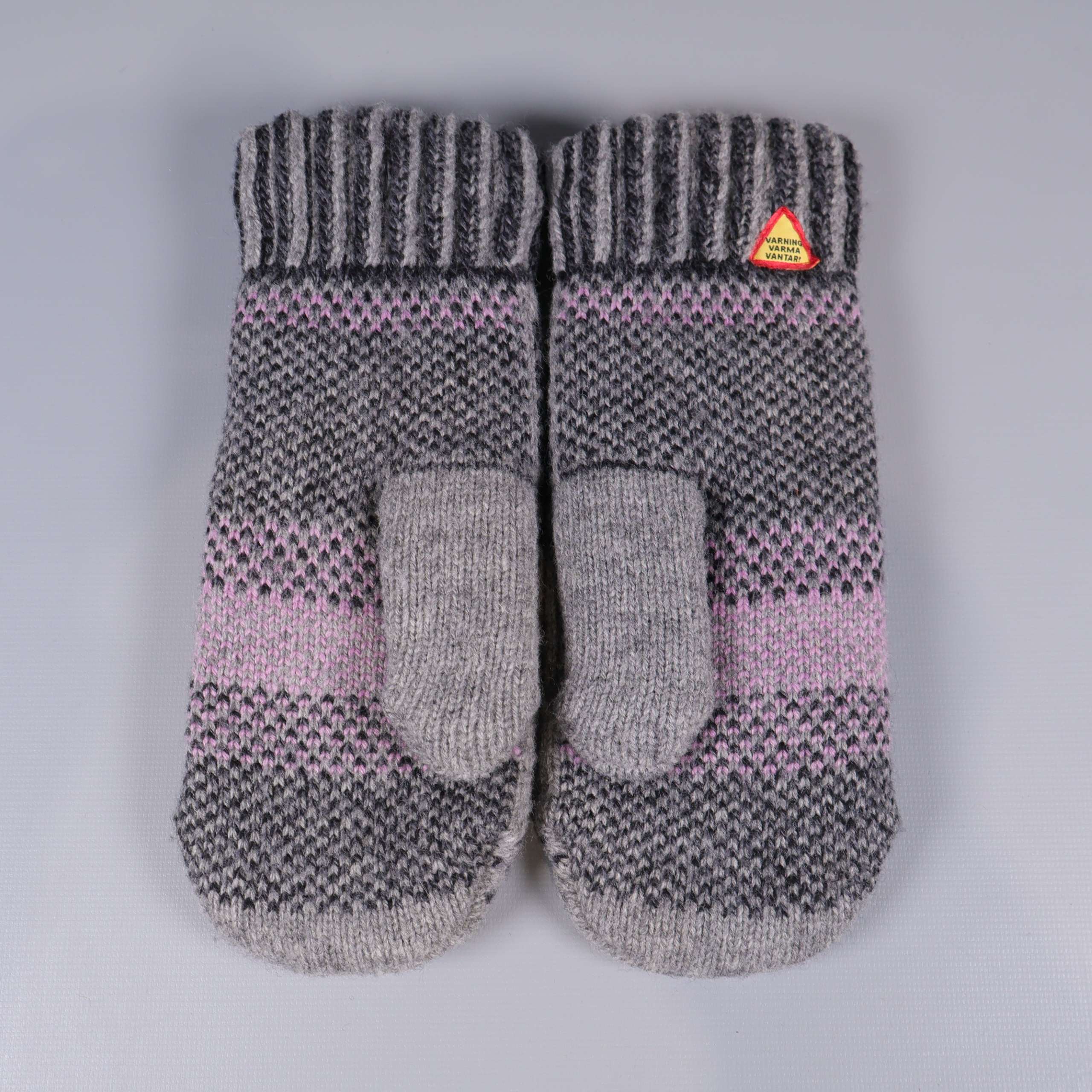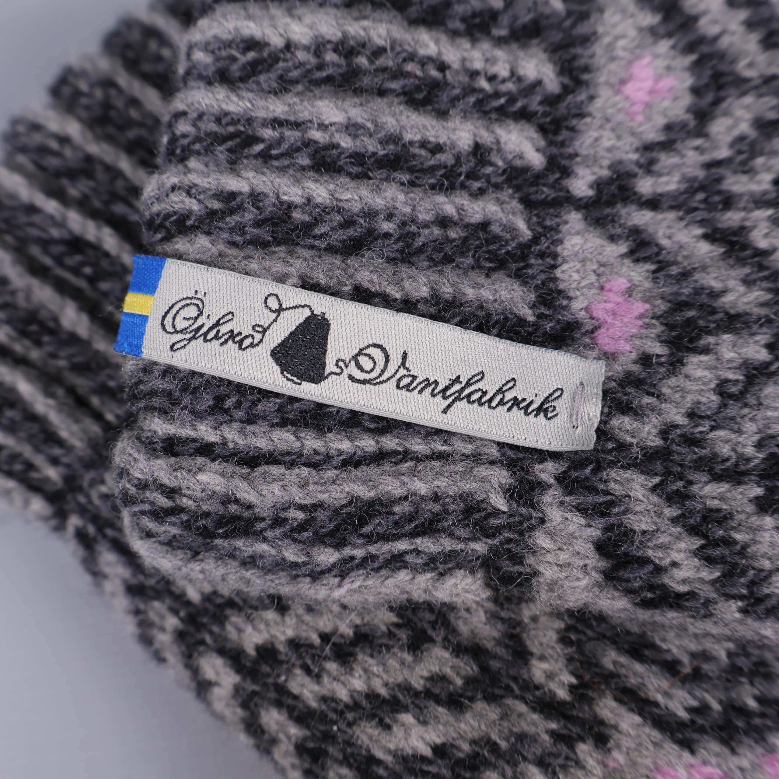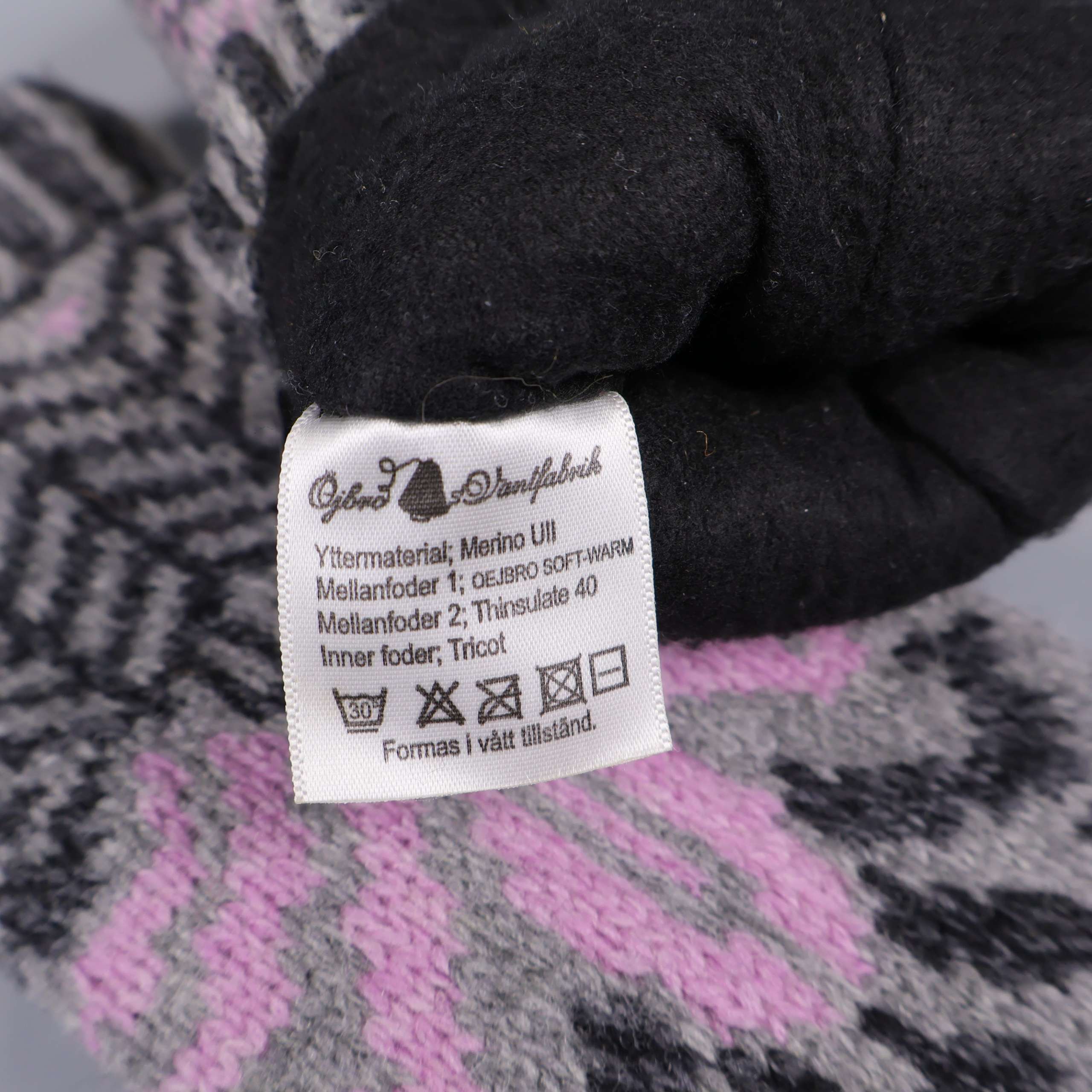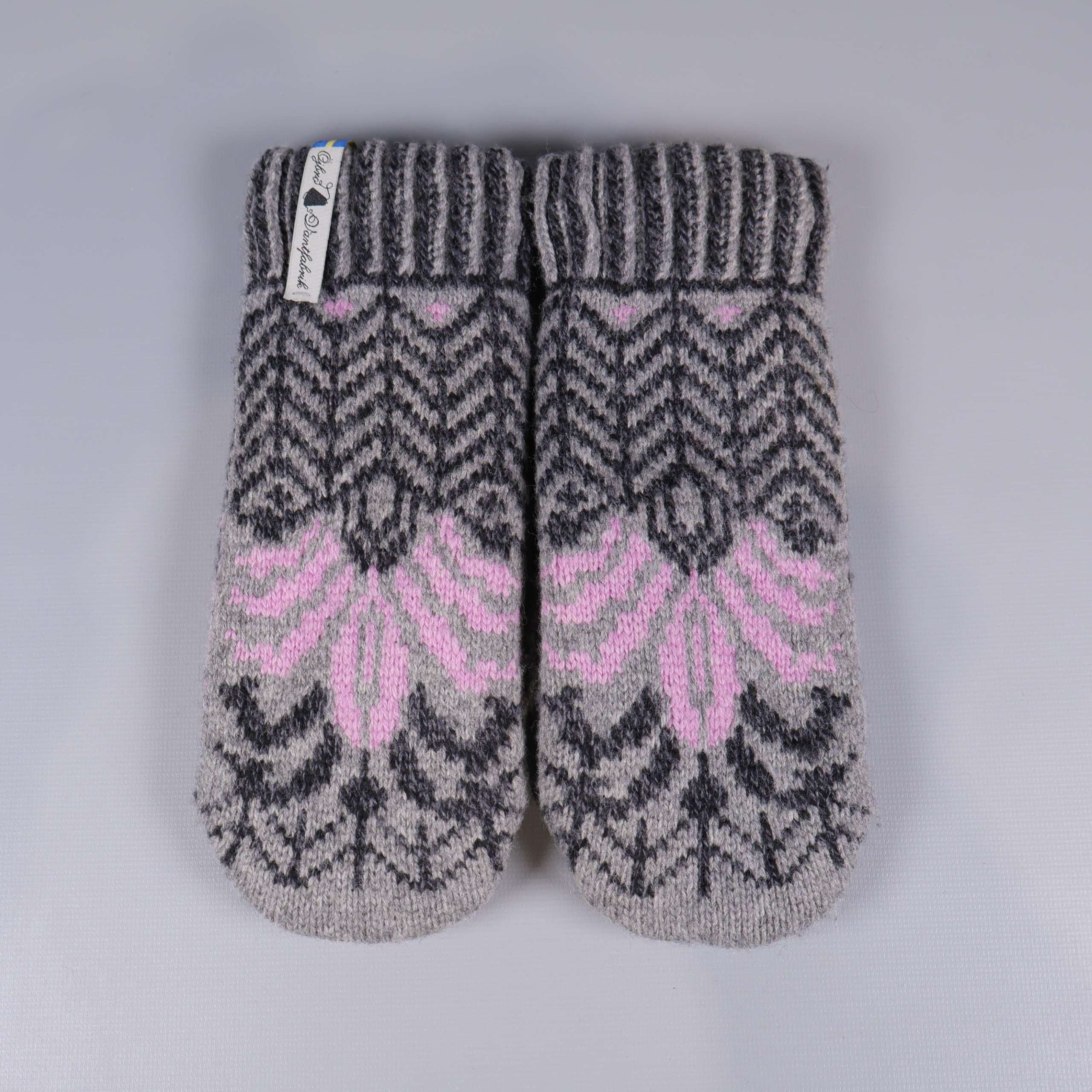 Stickade tumvantar med ett dekorativt mönster i grått, svart och ljusrosa. Ribbad mudd för extra komfort och en liten etikett med varningsskylt för värme samt märkning från Öjbro Vantfabrik. Insidan har mjukt trikåfoder. Perfekt när du vill ha ett par varma och mysiga vantar med unik design och skön känsla.