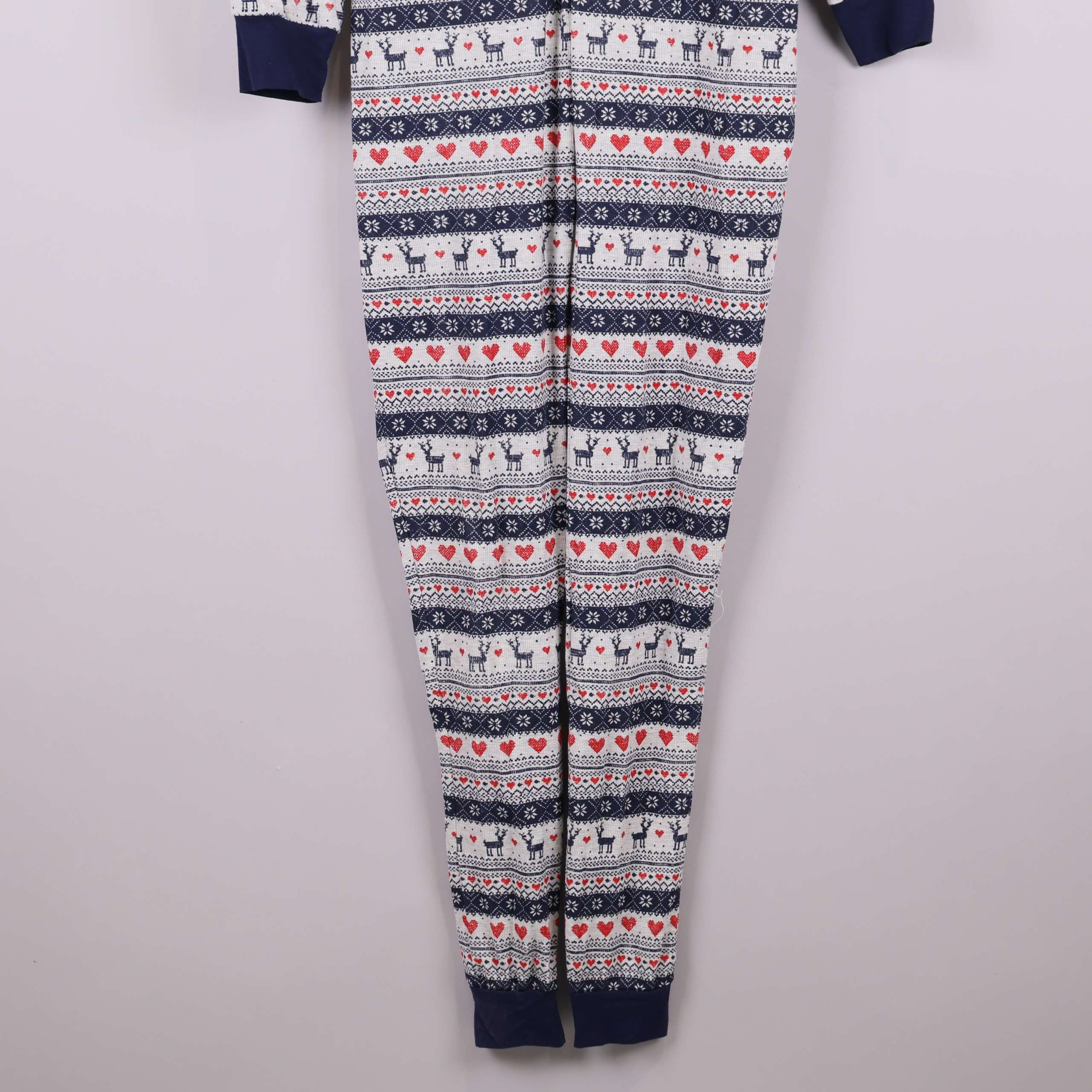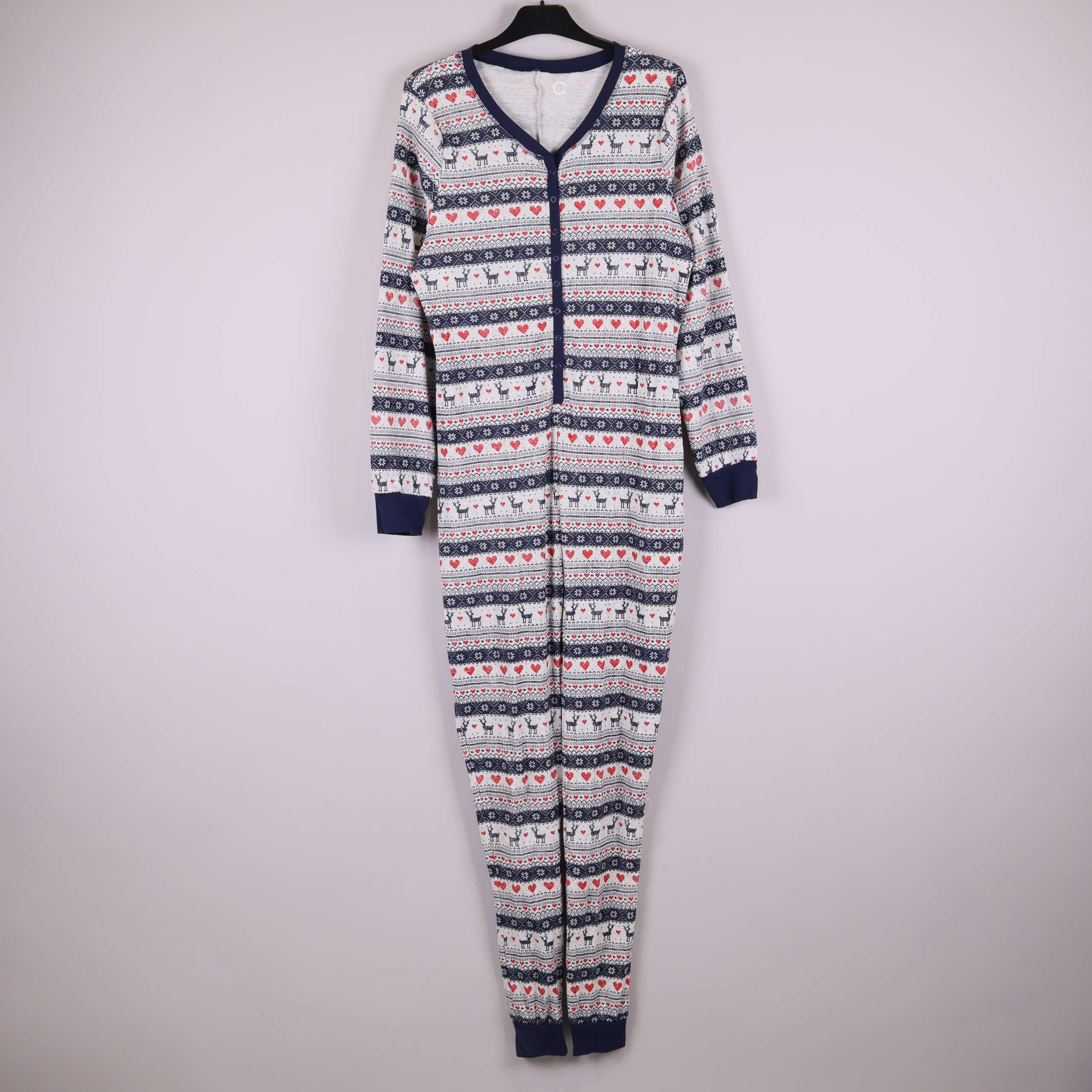 Mysig onesie med klassiskt vinterinspirerat mönster i blått, vitt och röda detaljer. Heldräkt med långa ärmar, ben och mudd vid ärmar och benslut för extra komfort. Dragkedja framtill gör plagget enkelt att ta på och av. Perfekt för en avslappnad och skön känsla hemma.