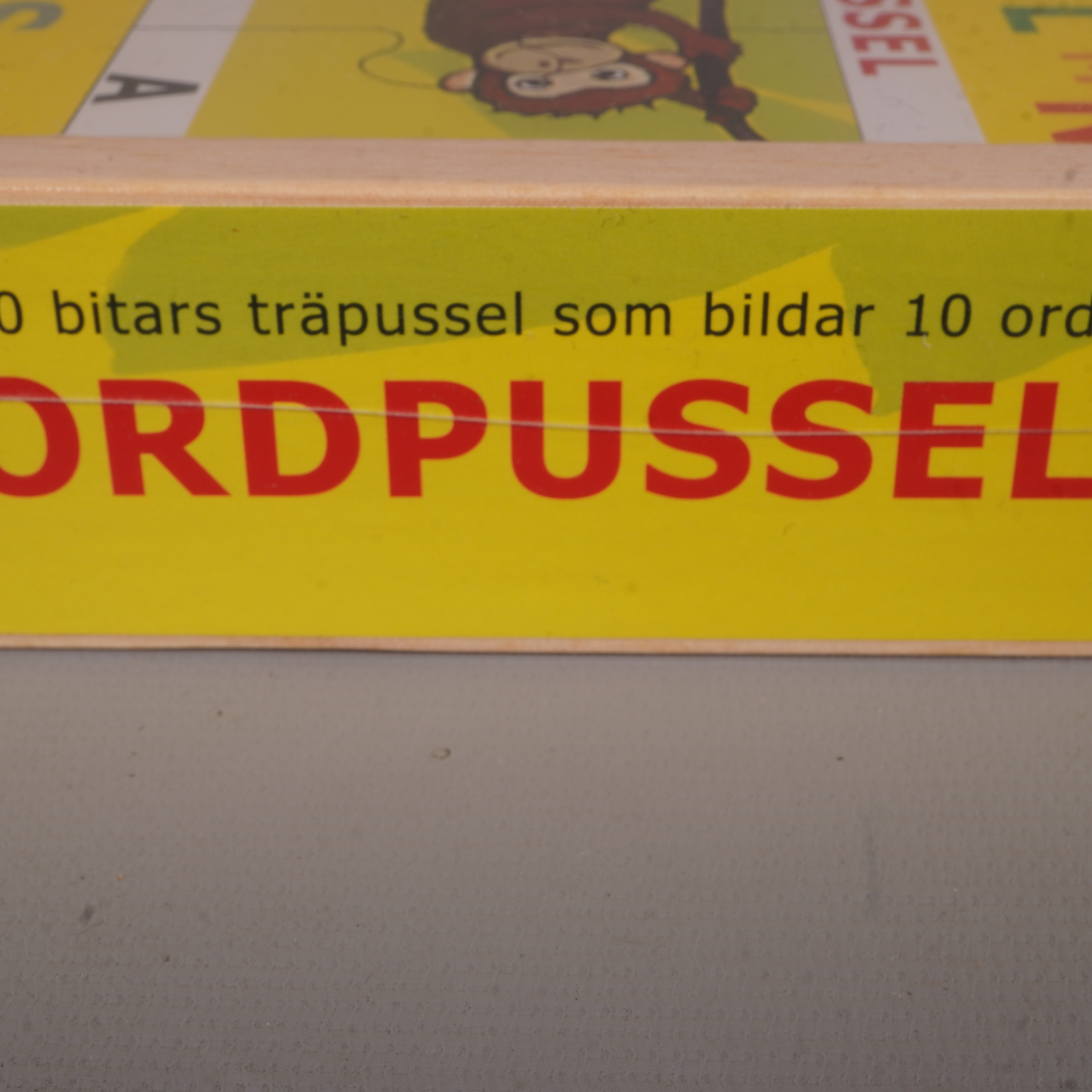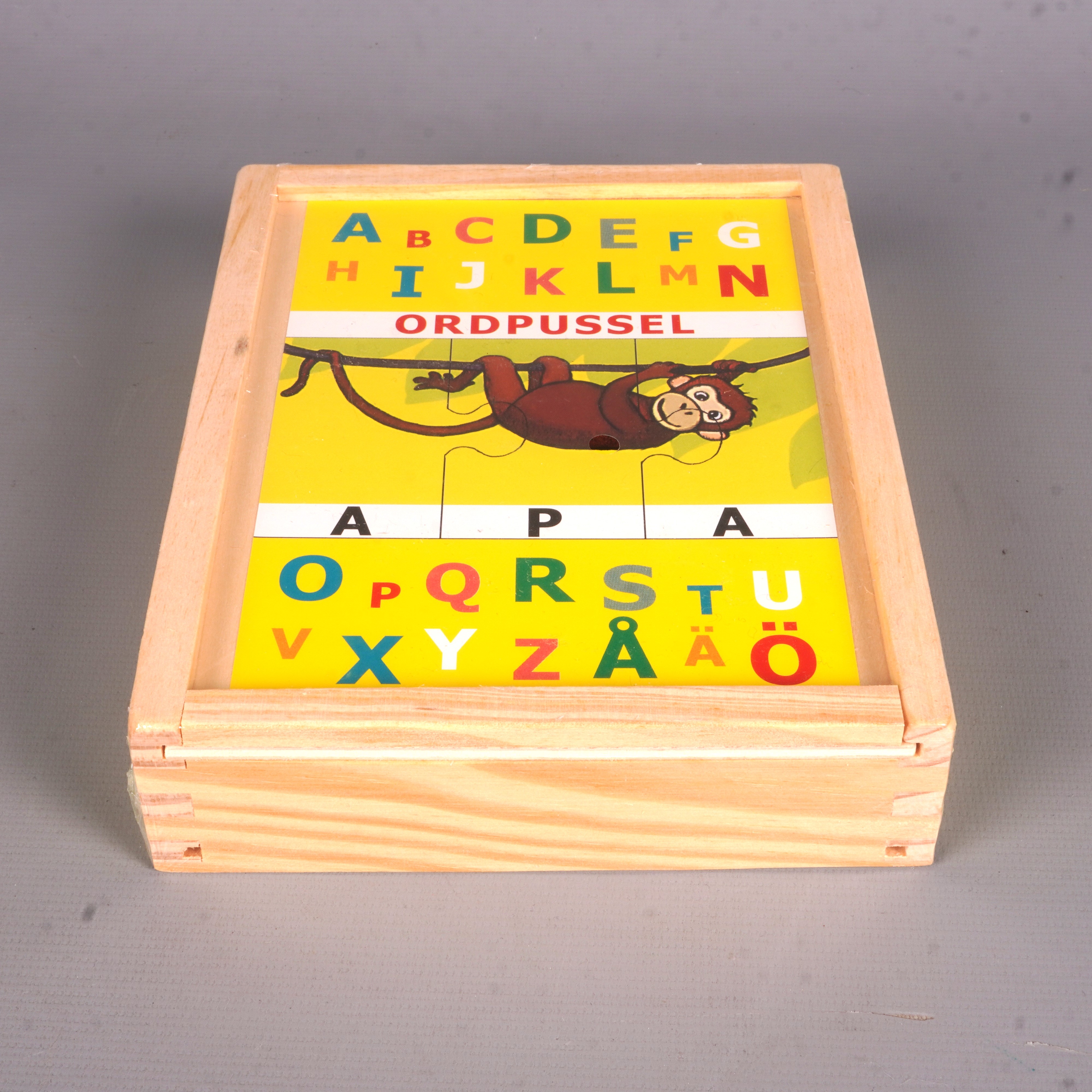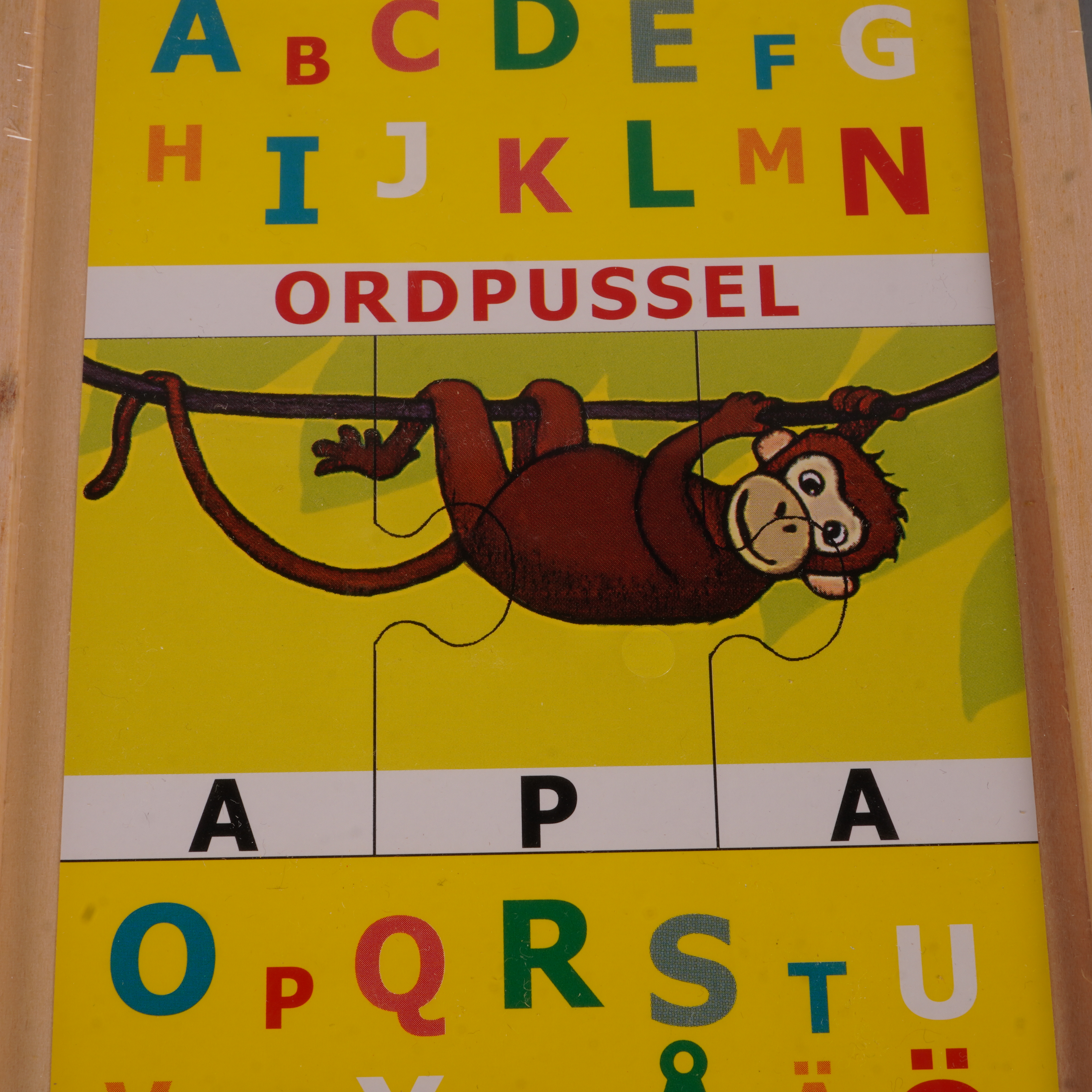 Färgglatt ordpussel i robust träram med illustration av apa och alfabetets bokstäver i klara, glada färger. Pusslet består av 30 bitar och hjälper till att forma olika ord. Perfekt för att träna bokstäver och stavning på ett lekfullt sätt. Förvaringslådan gör det enkelt att hålla ordning på bitarna.