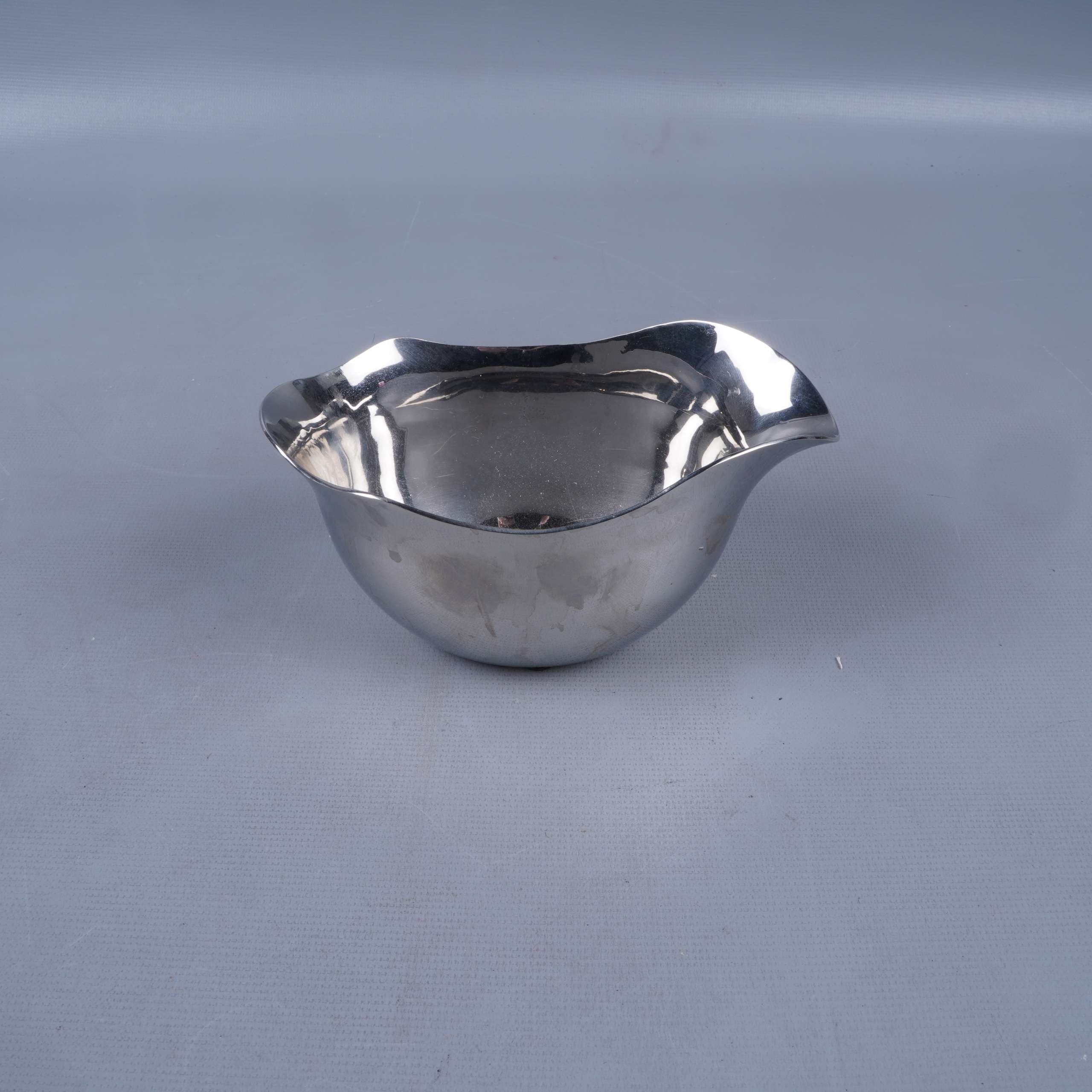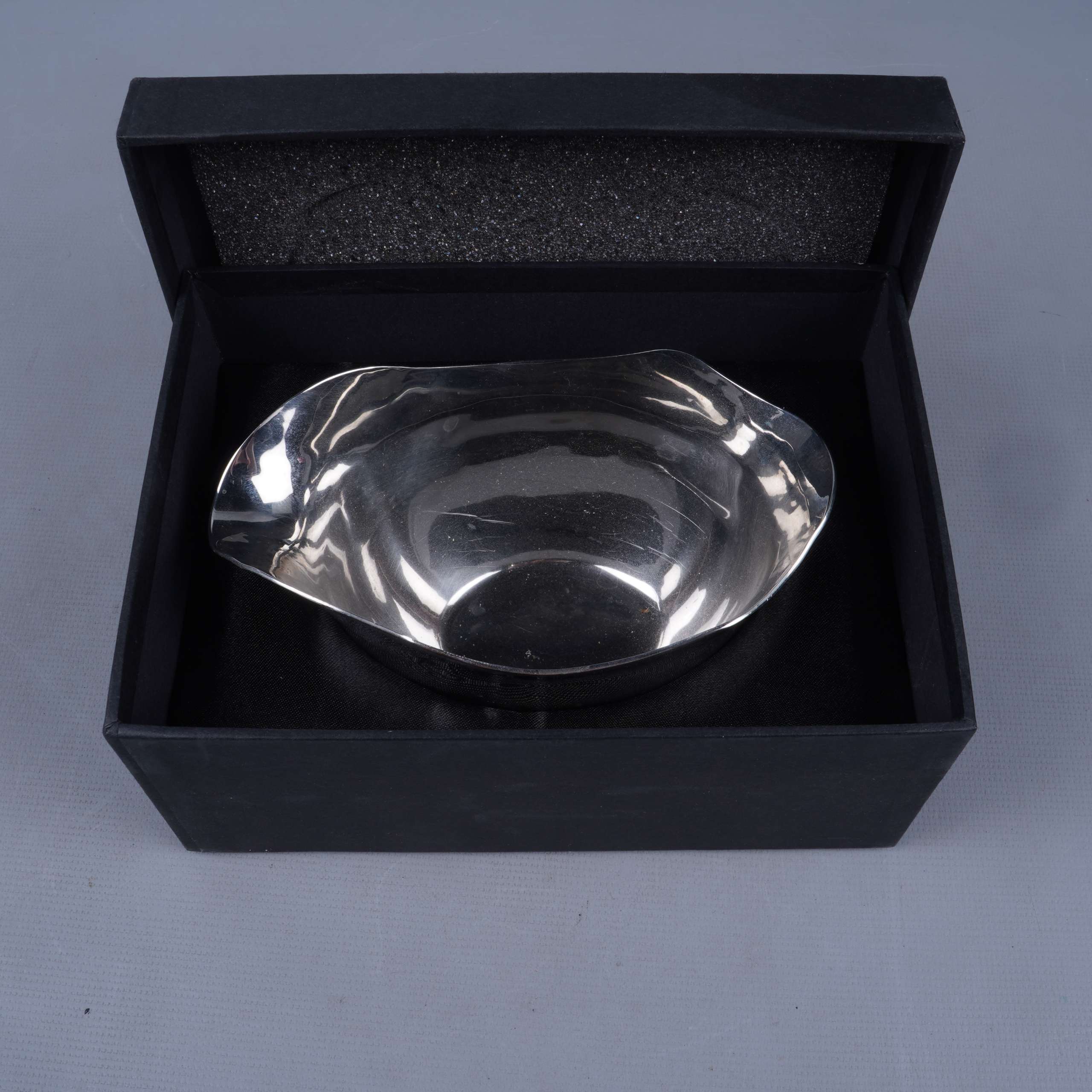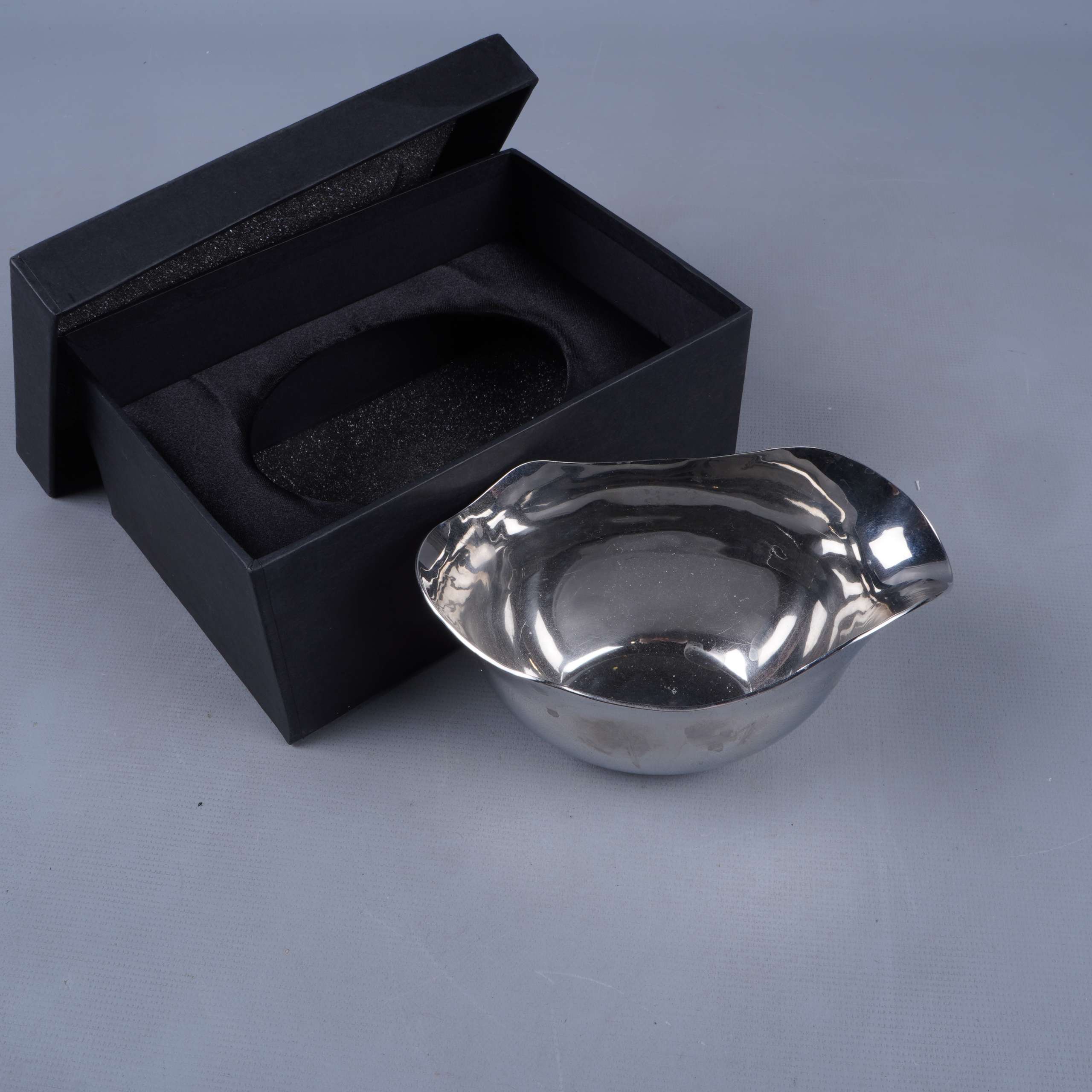 Elegant skål i rostfritt stål med mjuka, organiska former och en blank, spegelliknande yta. Designen av Gunnar Cyrén ger en modern känsla som passar både till vardag och fest. Levereras i svart presentask med skumgummi för säker förvaring.