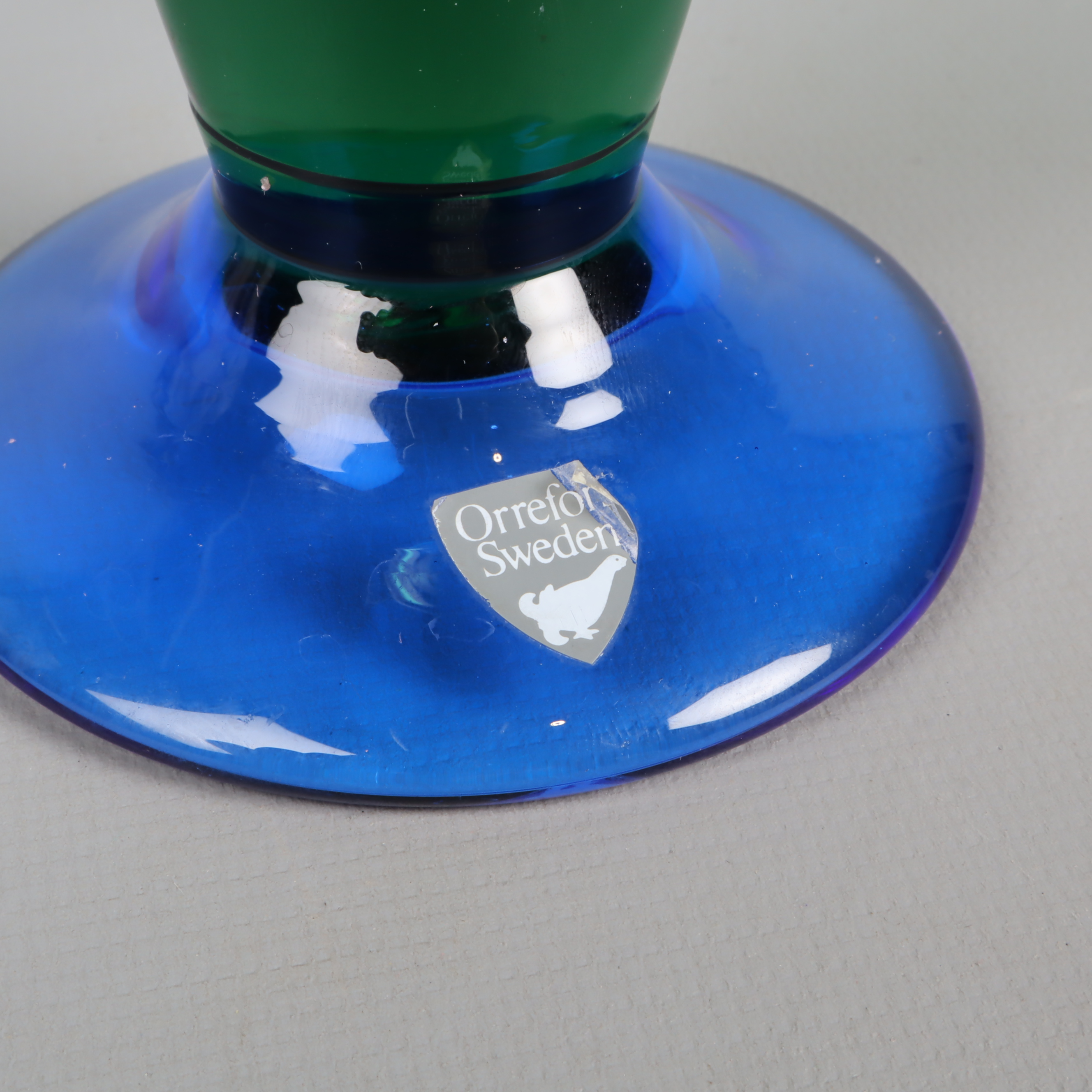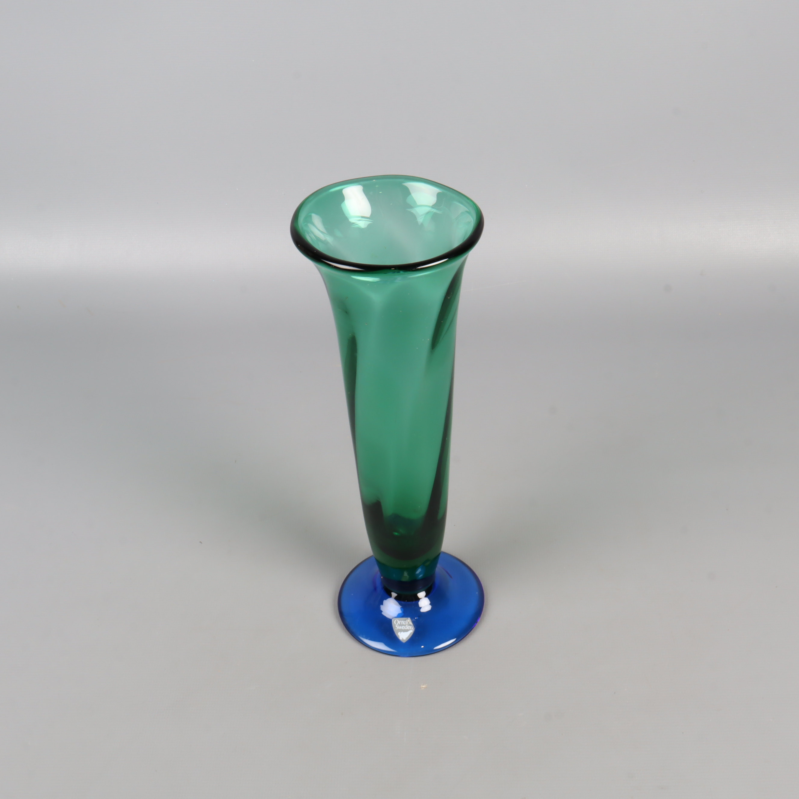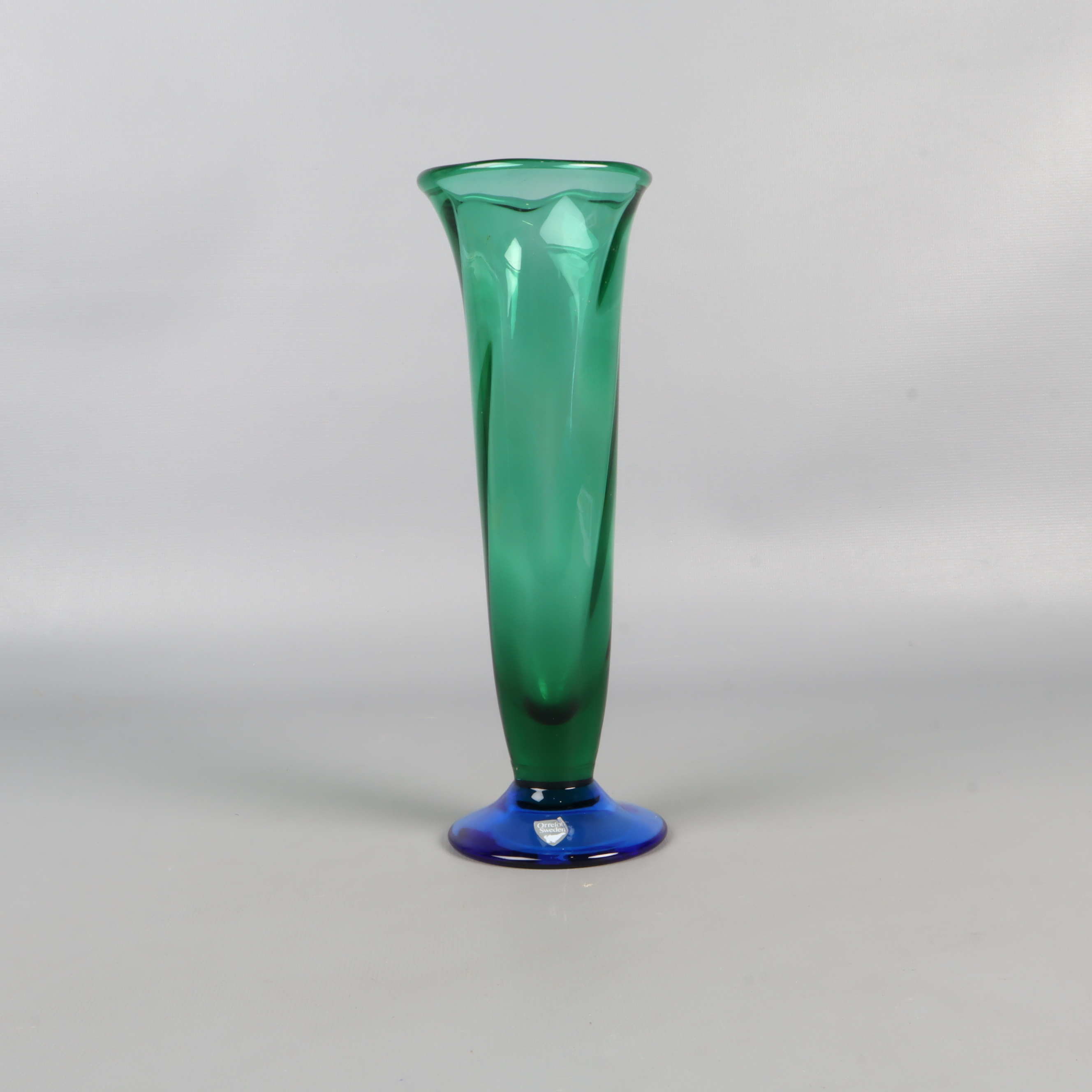 Elegant vas i munblåst glas med en smal, grön kropp och distinkt blå fot. De stilrena, svepande formerna ger en modern känsla, medan färgkombinationen skapar en tydlig retro-vibe.
