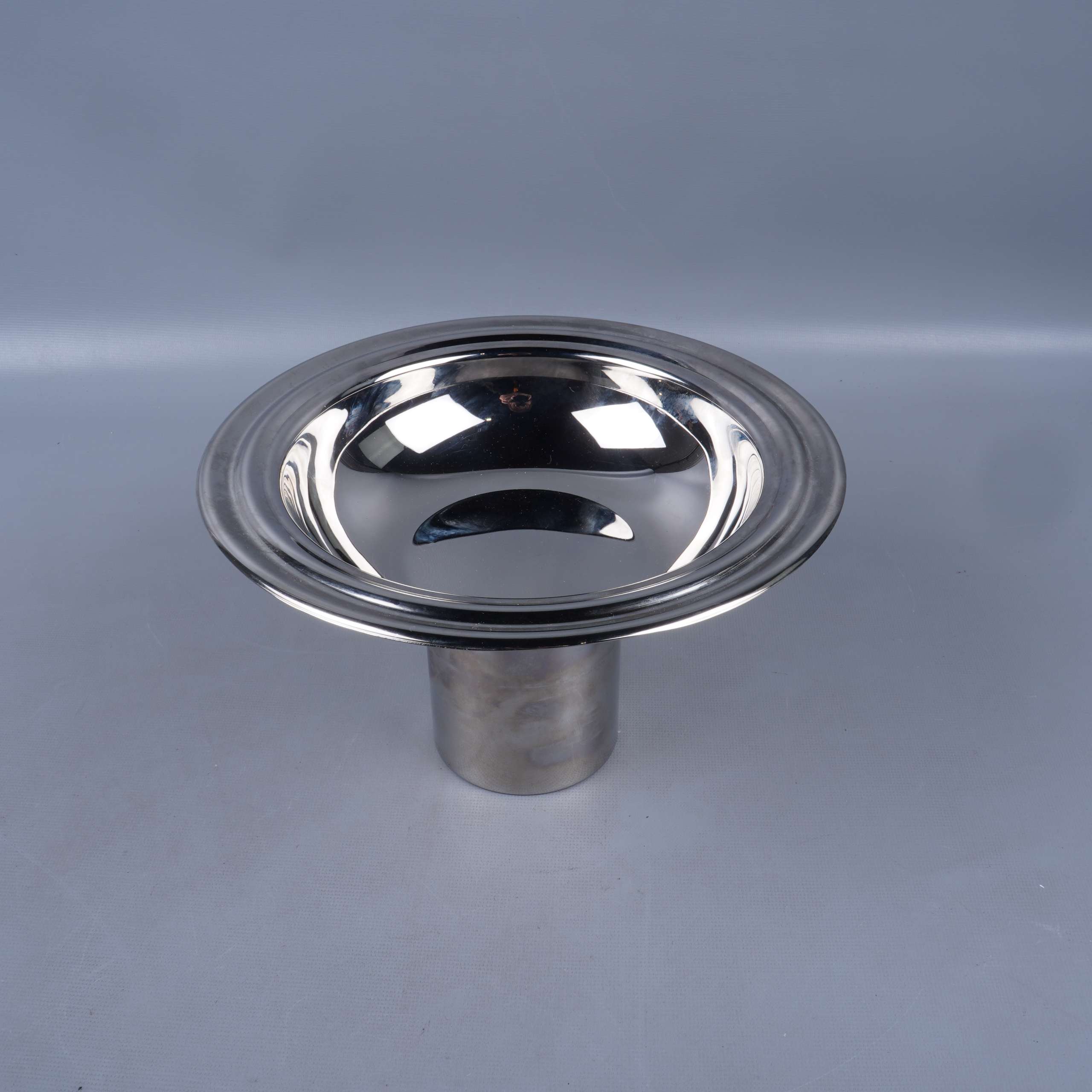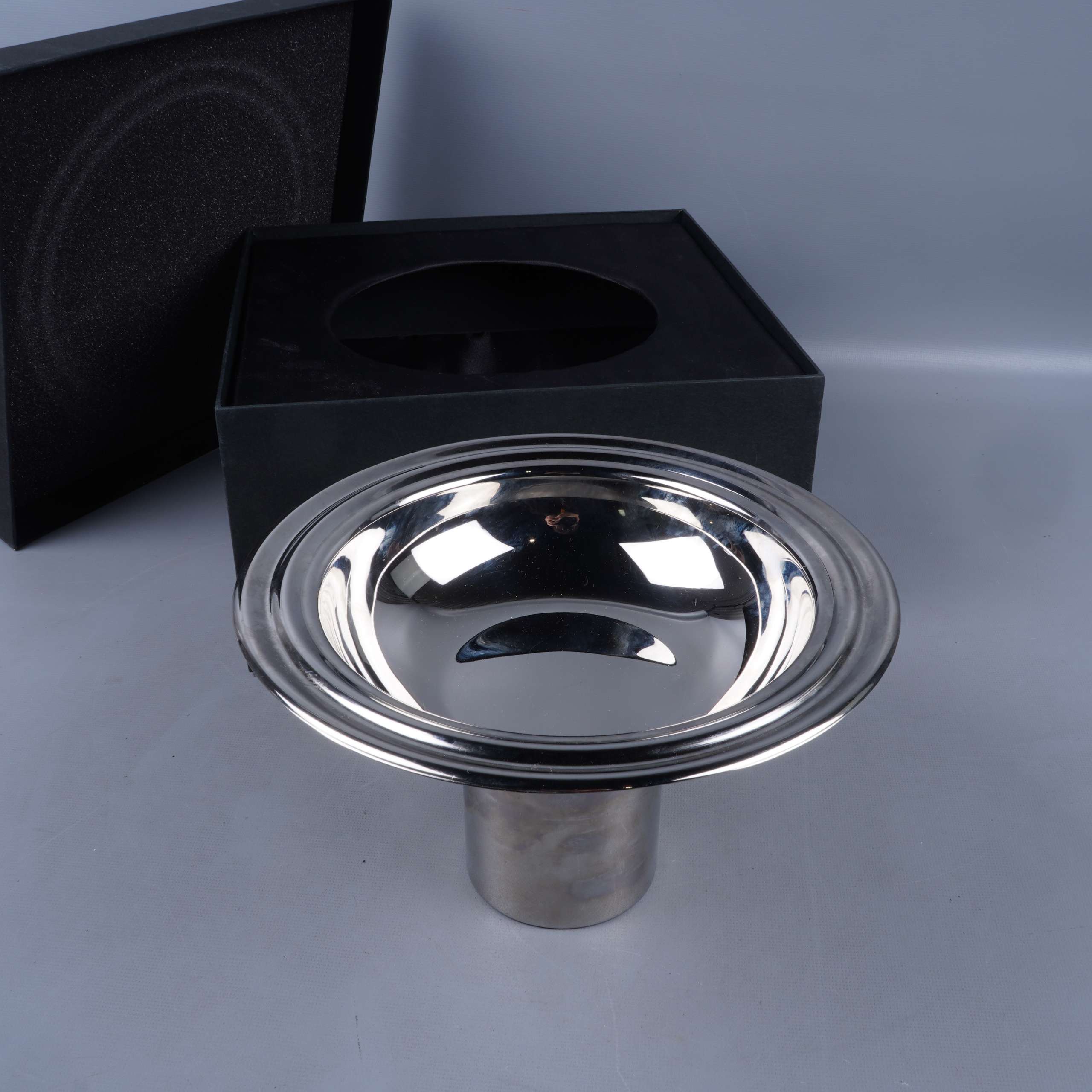 Elegant skål med rundad fot och stilren design i blank metallfinish. Perfekt som statement piece på bordet eller i hyllan, och levereras i en svart presentask med vadderad insida. Den blanka ytan ger ett modernt och exklusivt intryck.