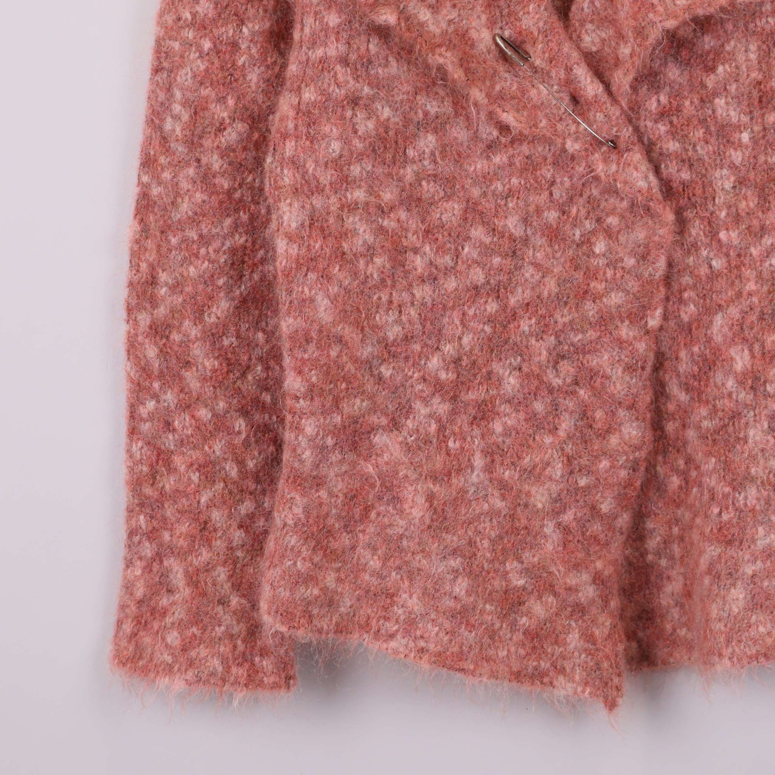 Mysig och strukturerad stickad kofta. Den har en unik rosa färg, lite melerad look och klassisk krage. Designen har en skön fluffy känsla och asymmetrisk knäppning framtill som ger en modern touch.