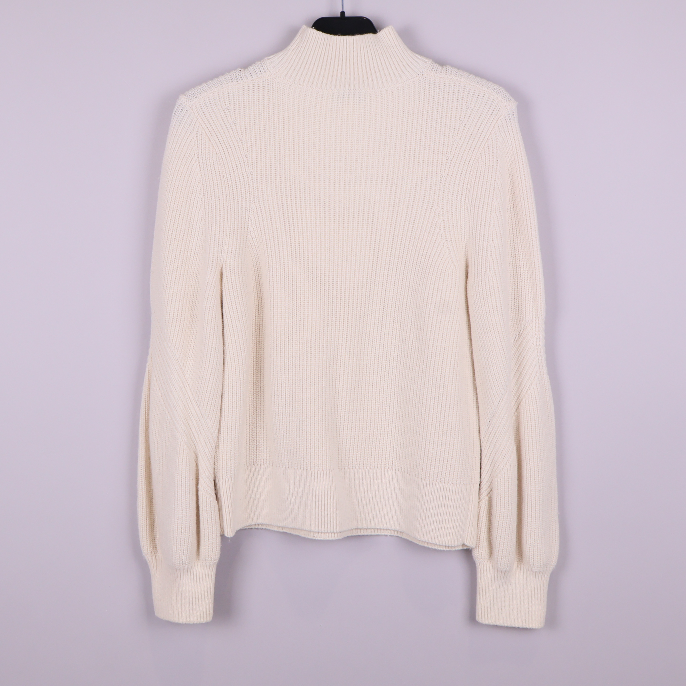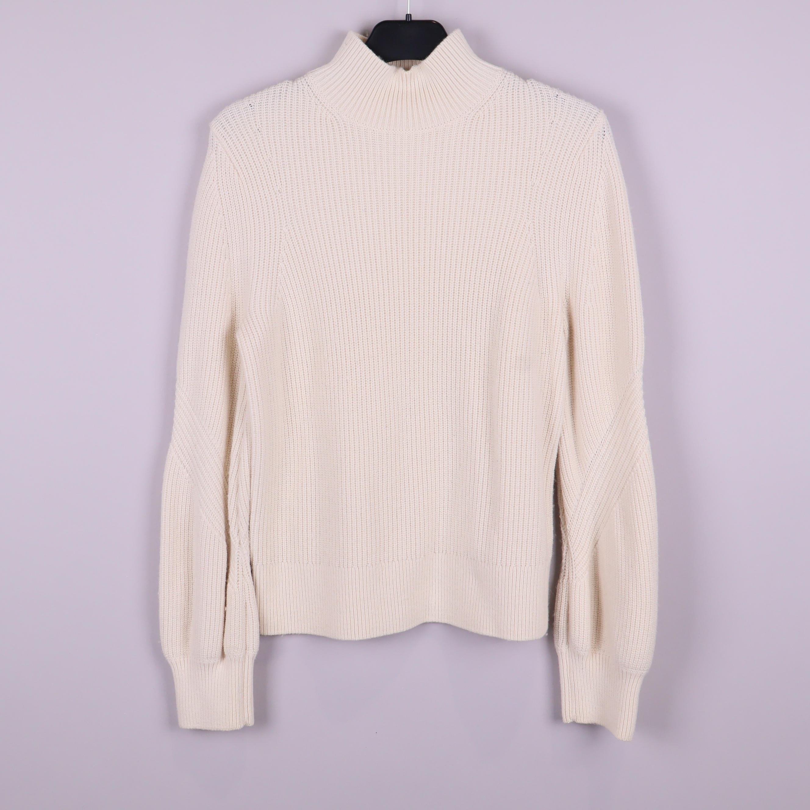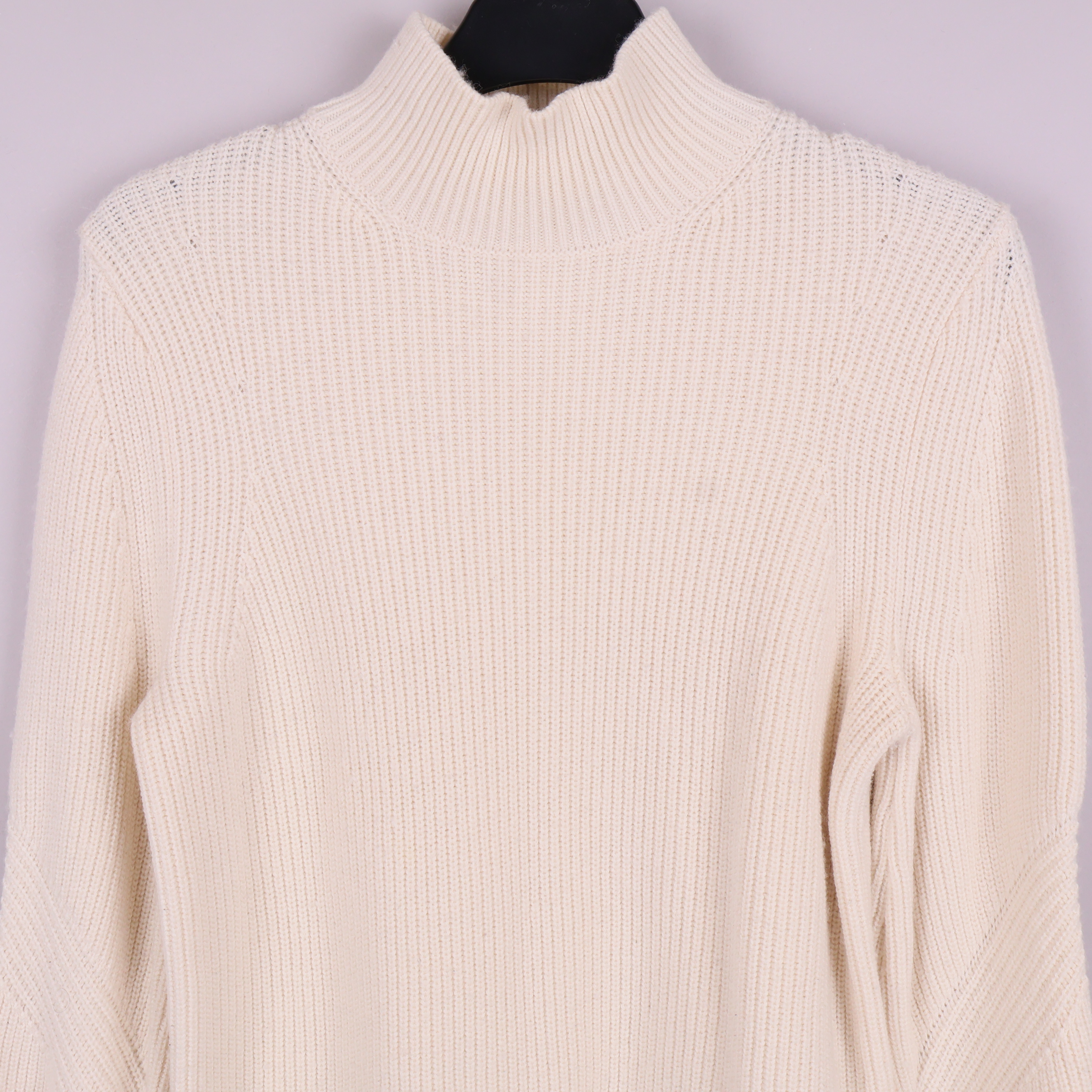 Mjuk stickad tröja i ljus naturvit ton med hög krage och strukturstickat mönster. Plagget har långa ärmar med subtila detaljer vid mudden som ger en modern twist till en klassisk siluett.