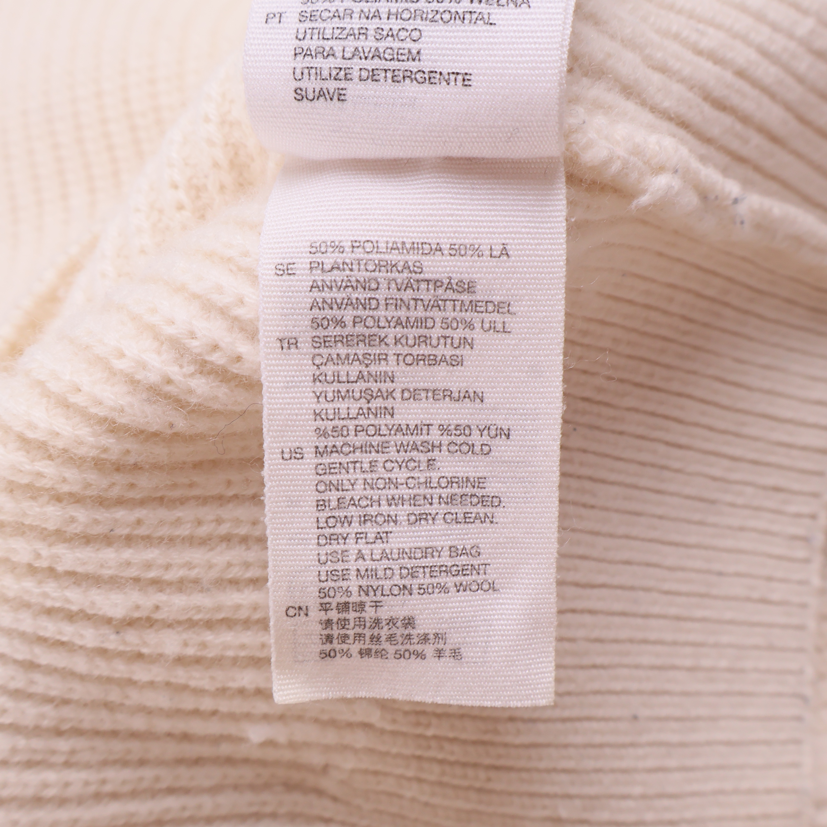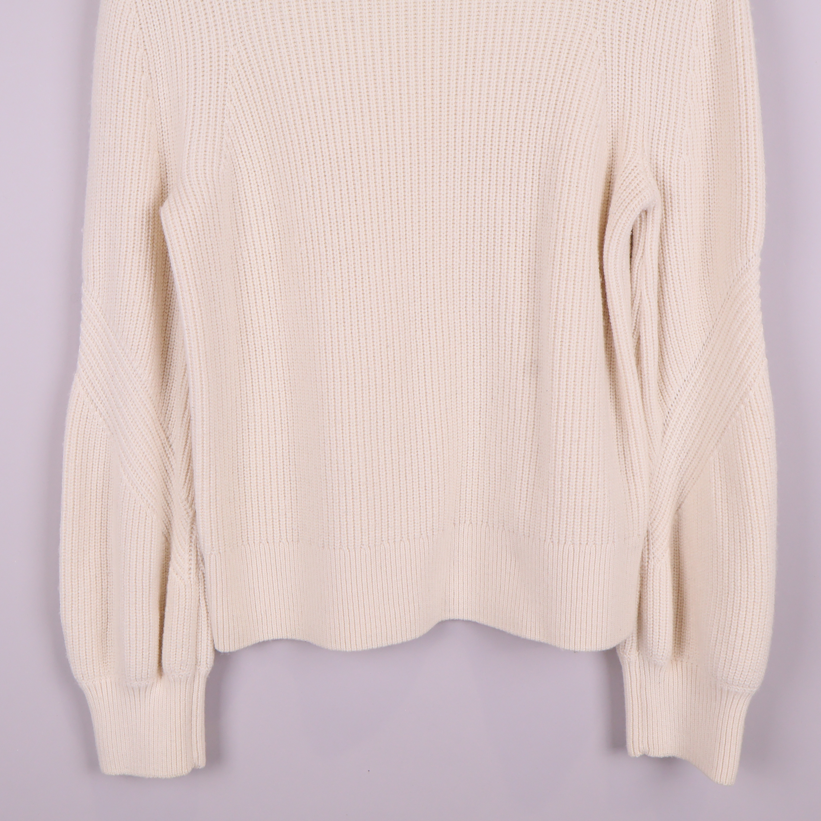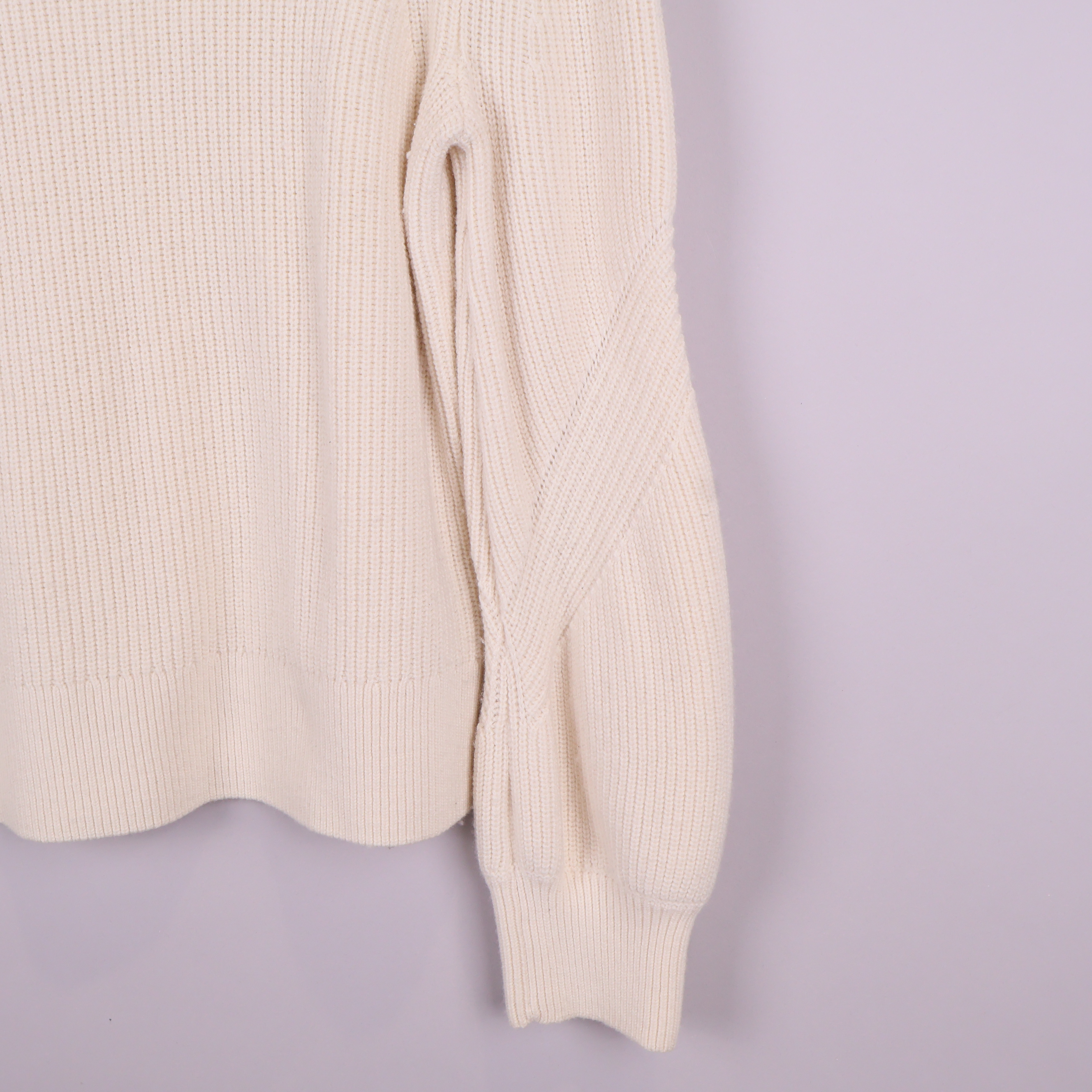 Mjuk stickad tröja i ljus naturvit ton med hög krage och strukturstickat mönster. Plagget har långa ärmar med subtila detaljer vid mudden som ger en modern twist till en klassisk siluett.
