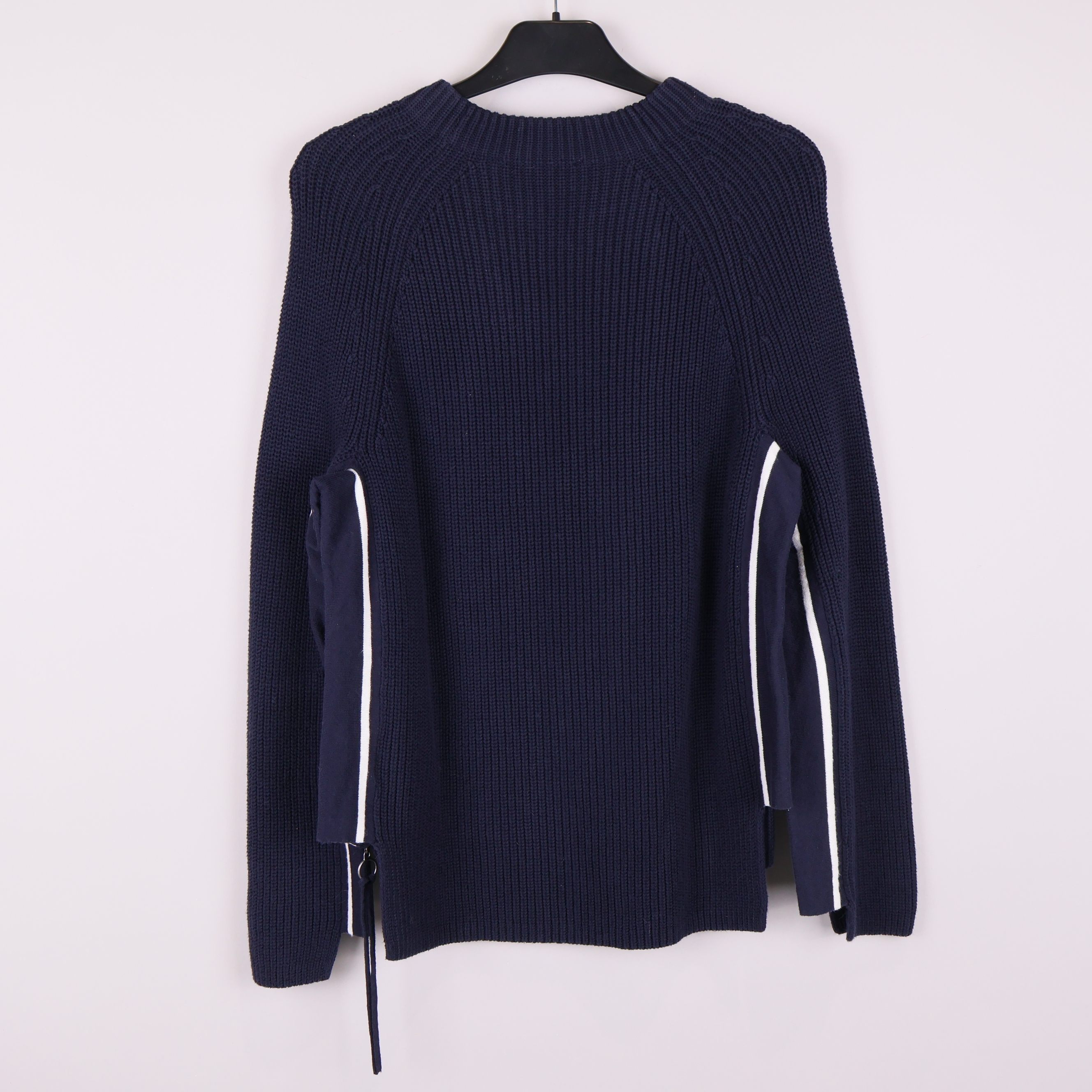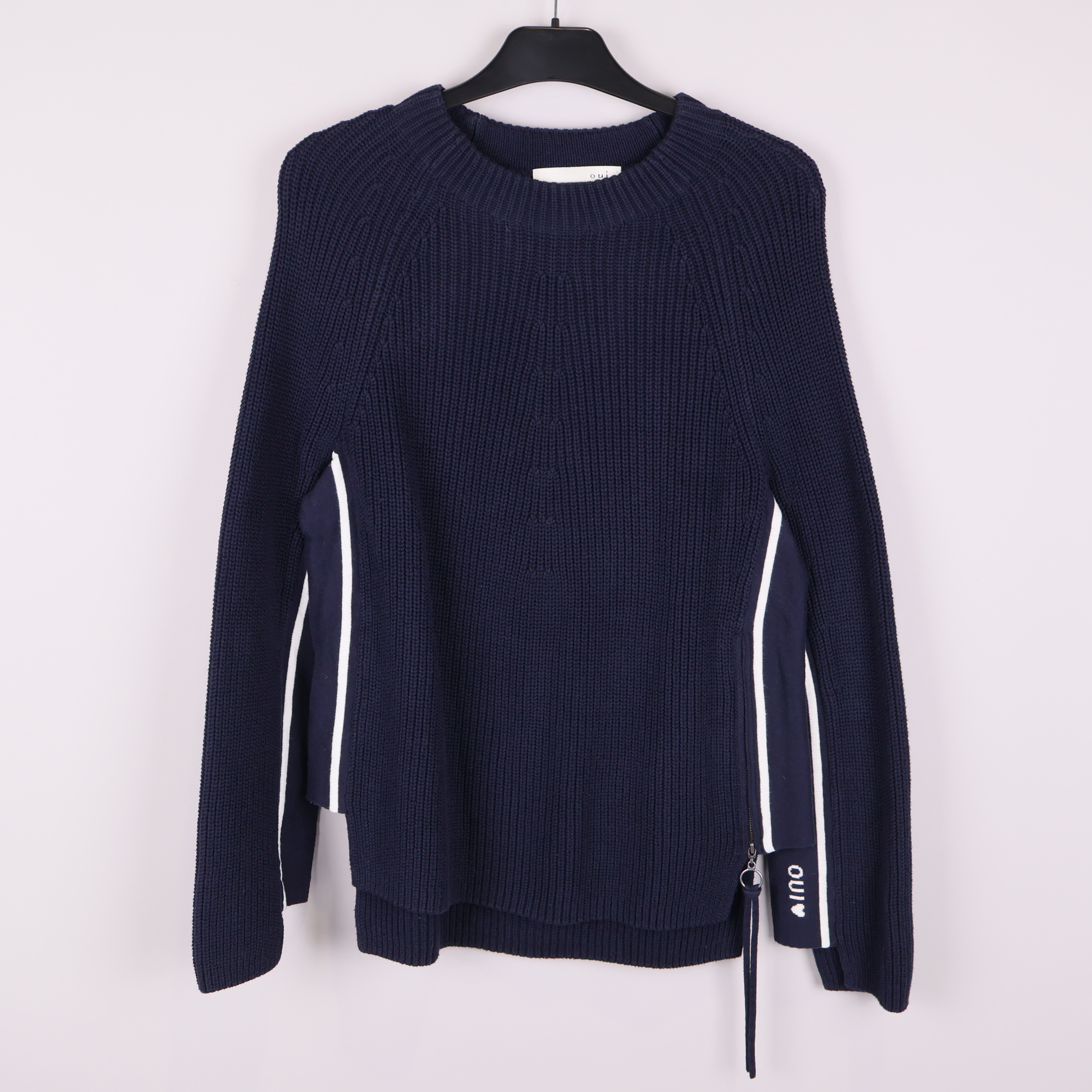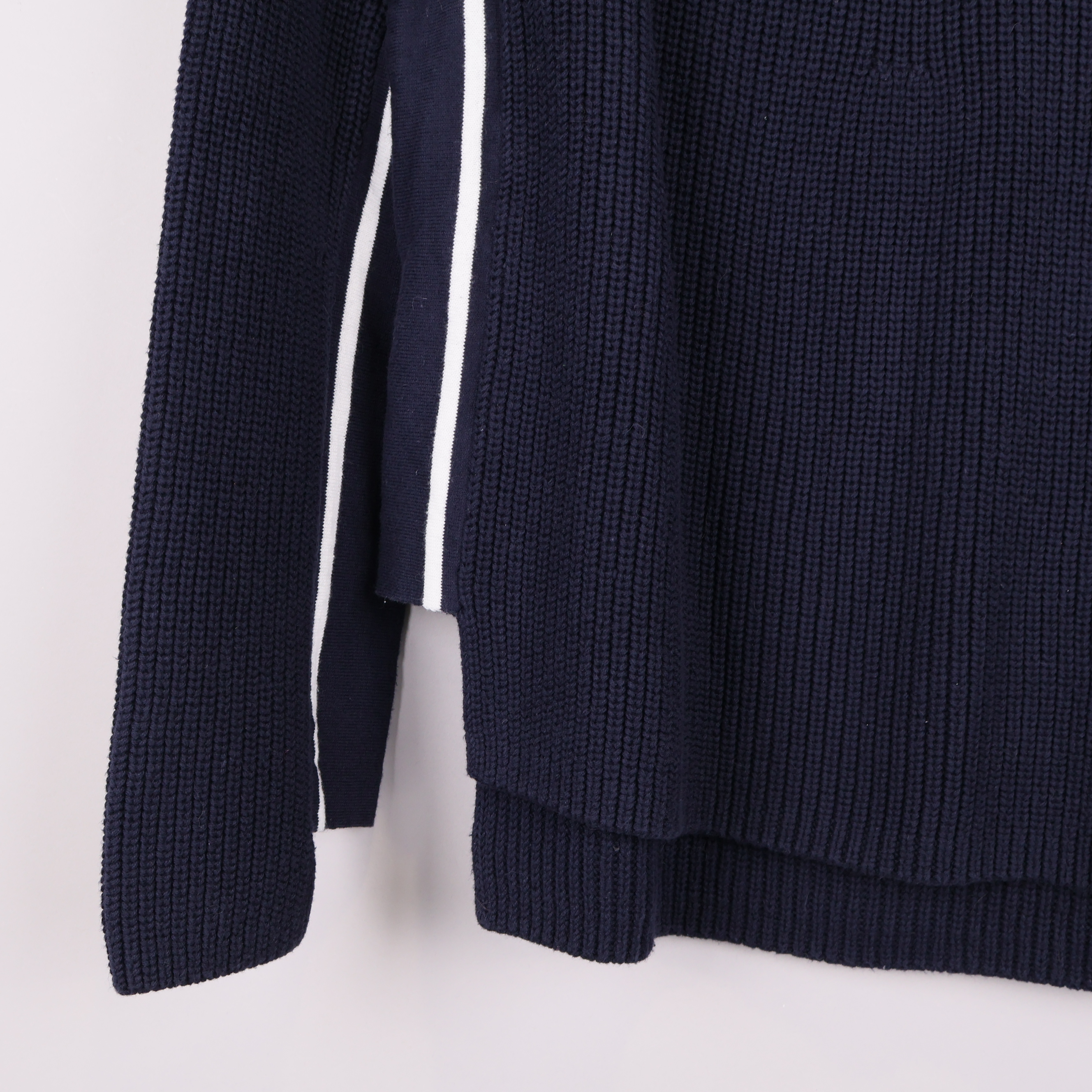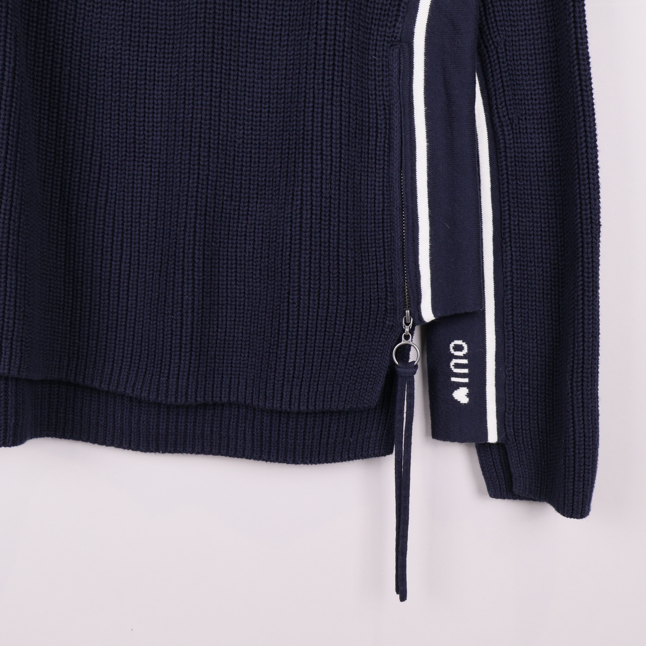 Mysig stickad tröja i mörkblått med vita detaljer längs sidorna. Snygg och sportig look med dragkedjor på båda sidor som ger en unik touch. Ribbstickad struktur och rund halsringning för en klassisk känsla.