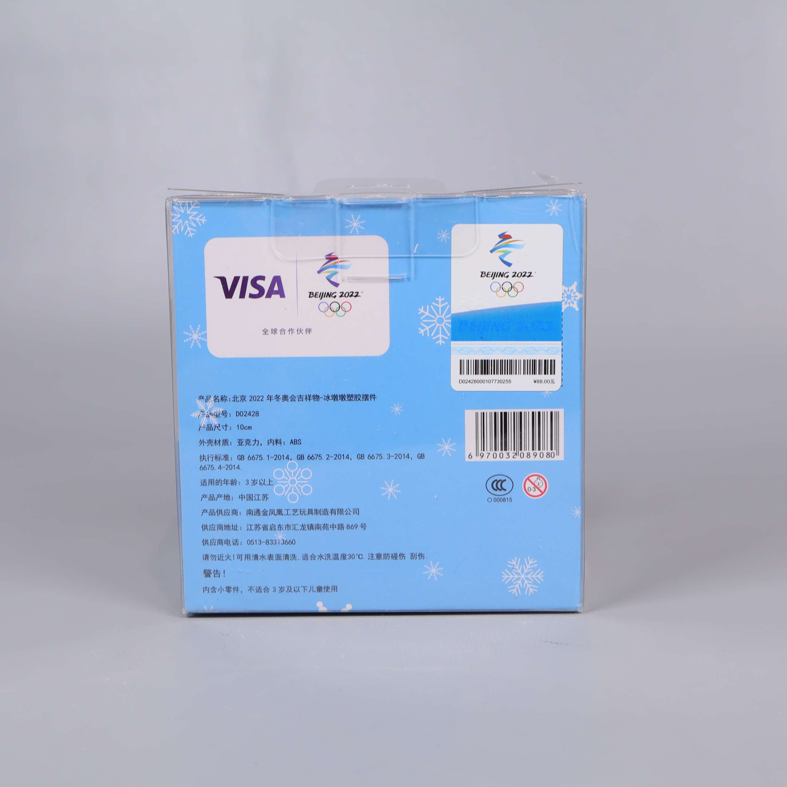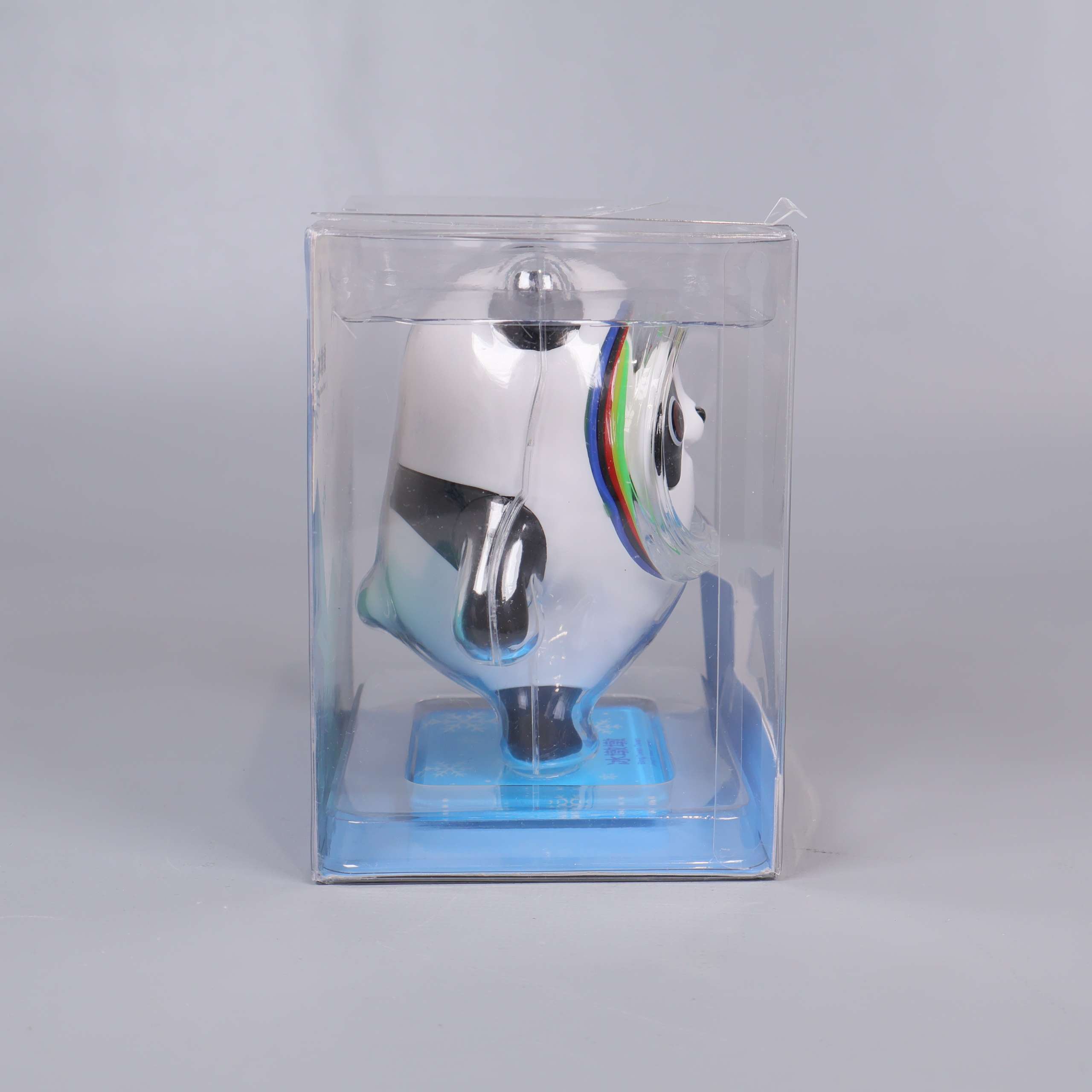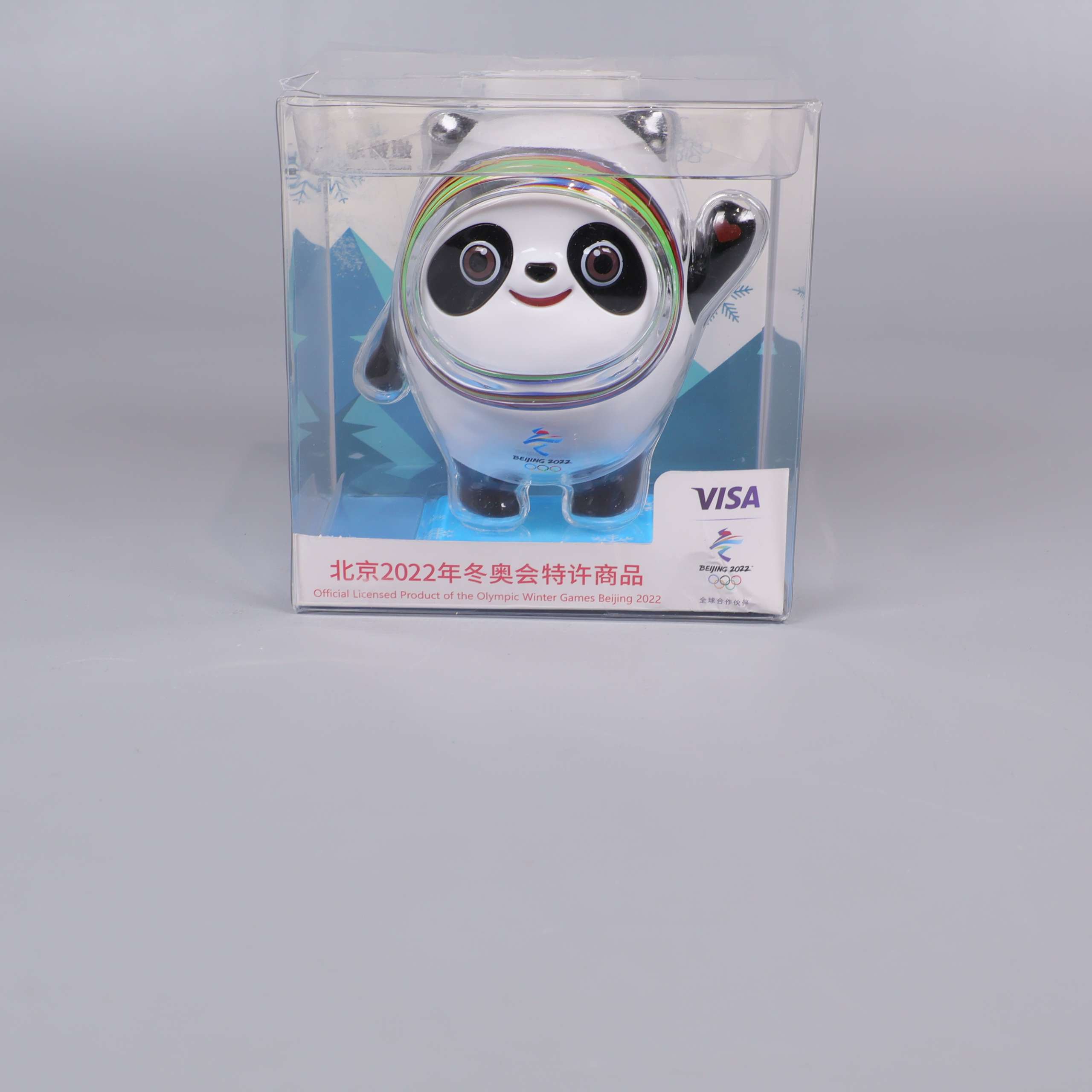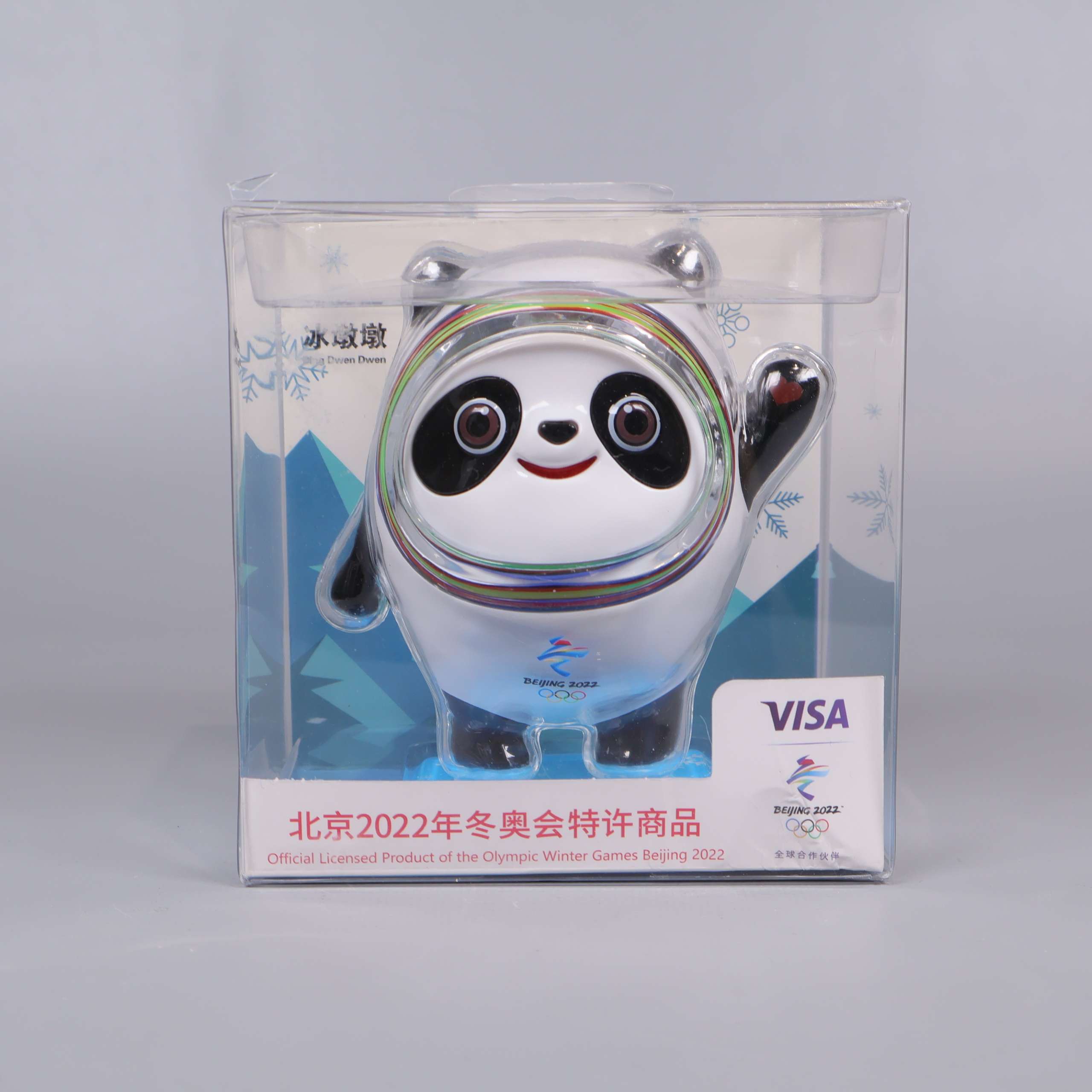 Söt pandafigur Bing Dwen Dwen i genomskinlig förpackning med färgglada detaljer och blanka ytor. Designen för tankarna till sport och olympiska spel med sin unika look och lekfulla utformning, perfekt för dig som gillar samlarprylar och minnen från stora sporthändelser.