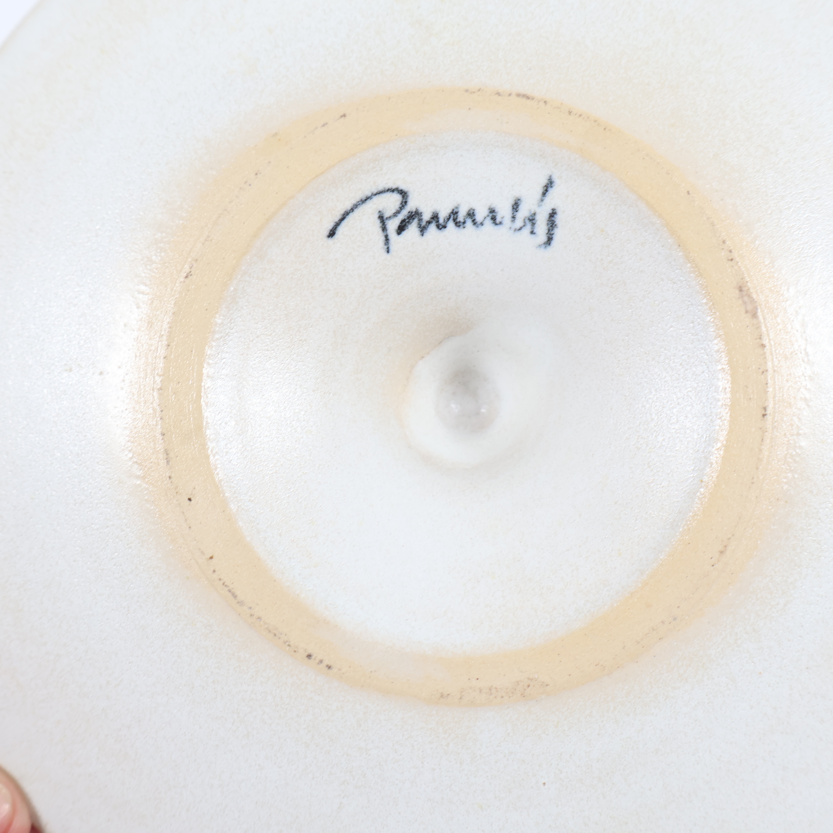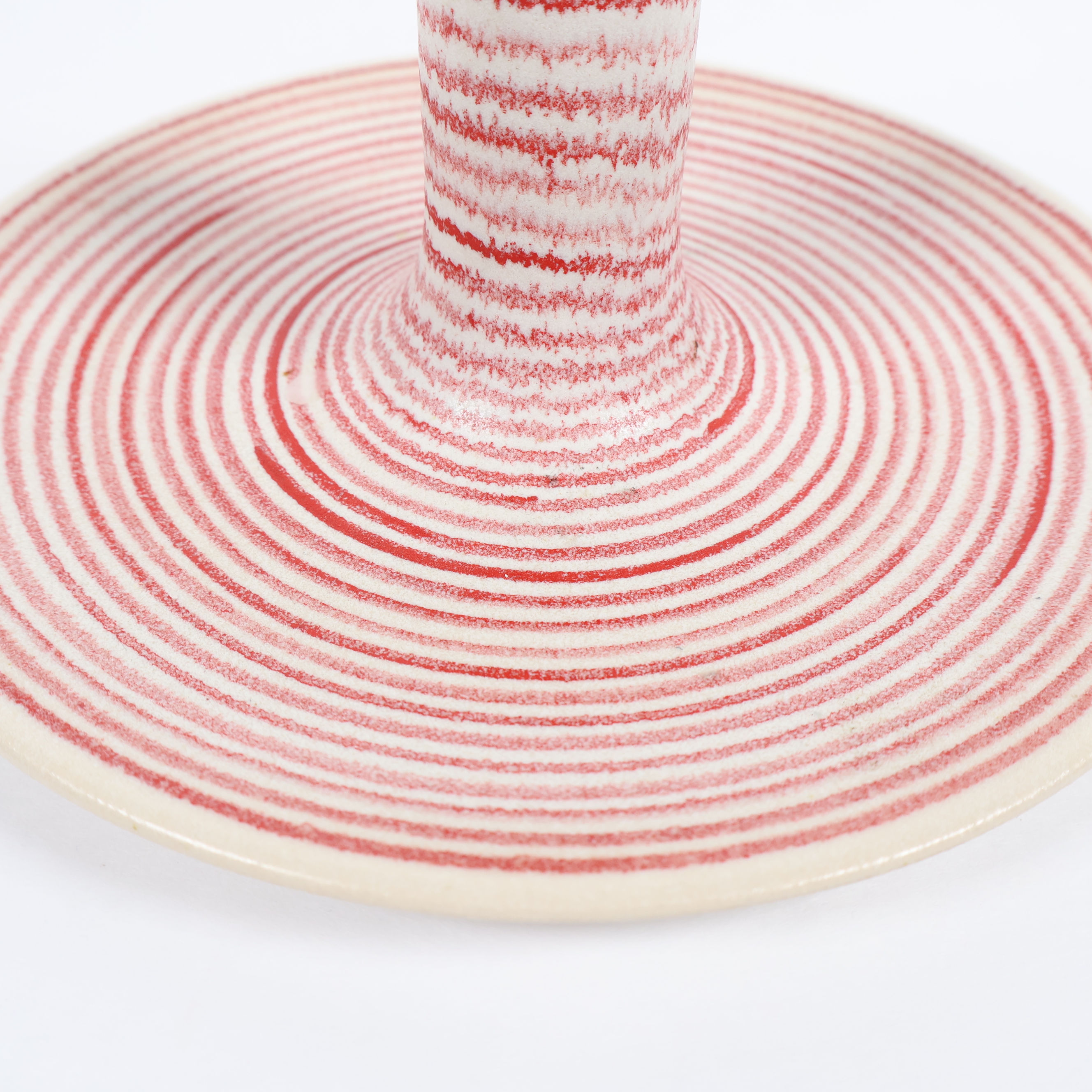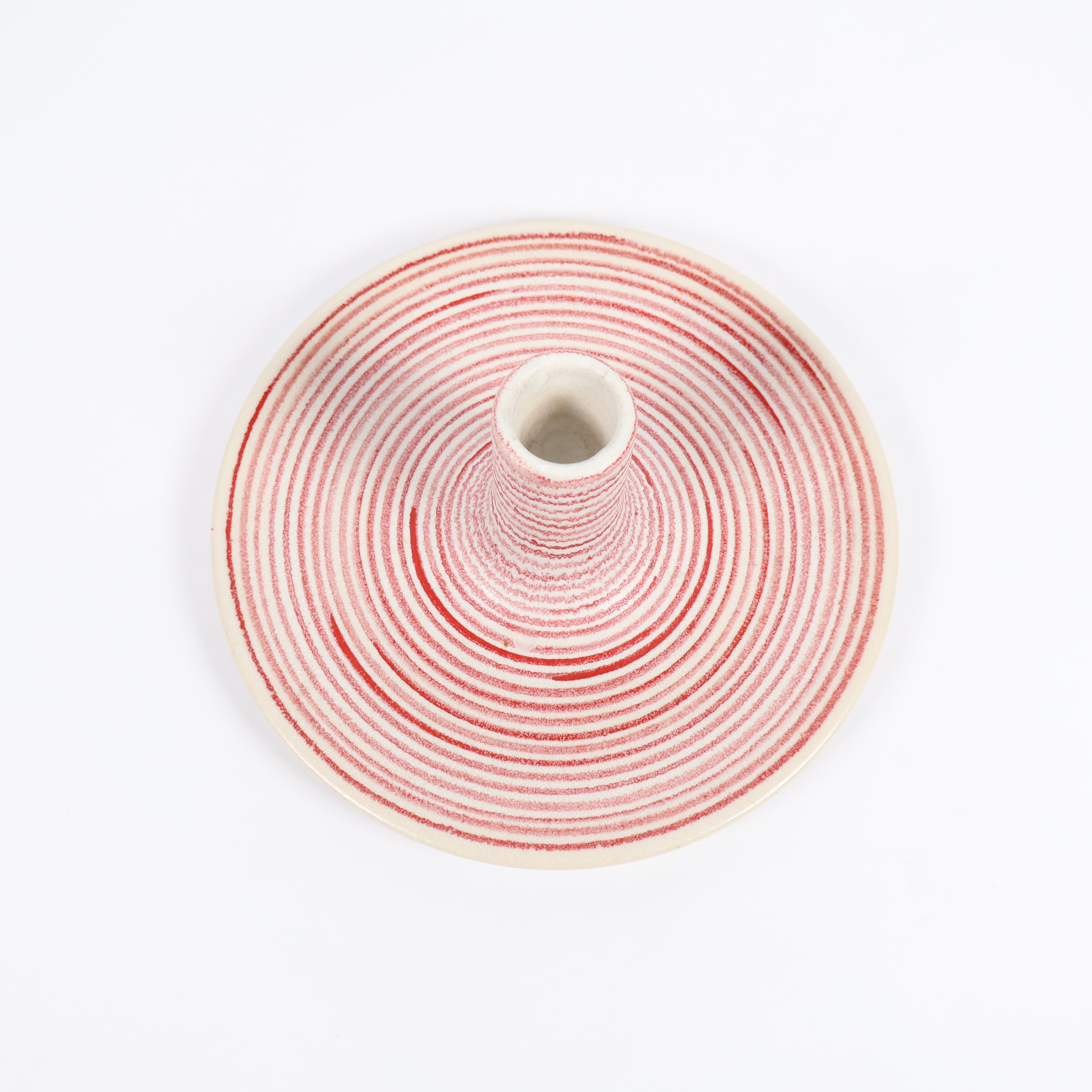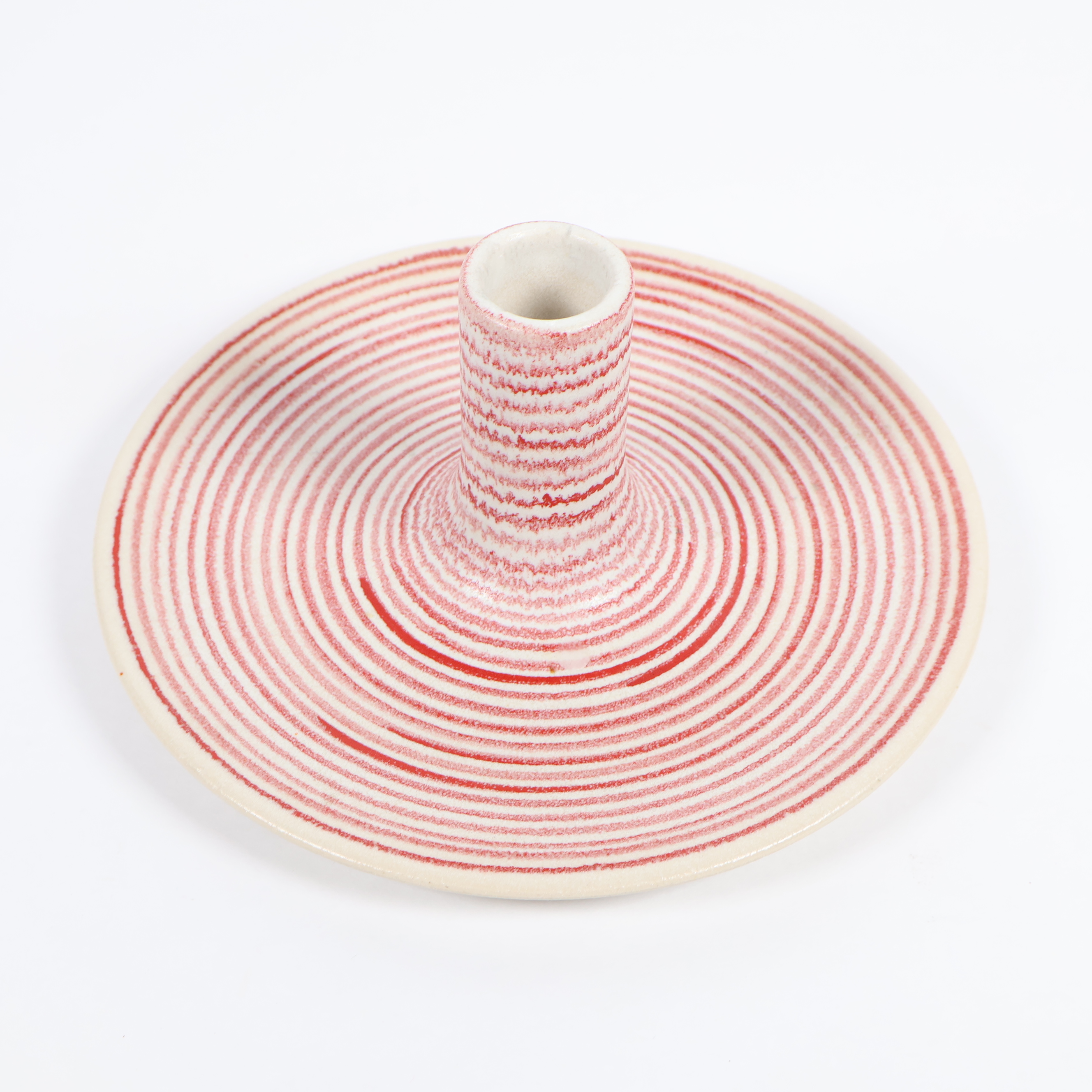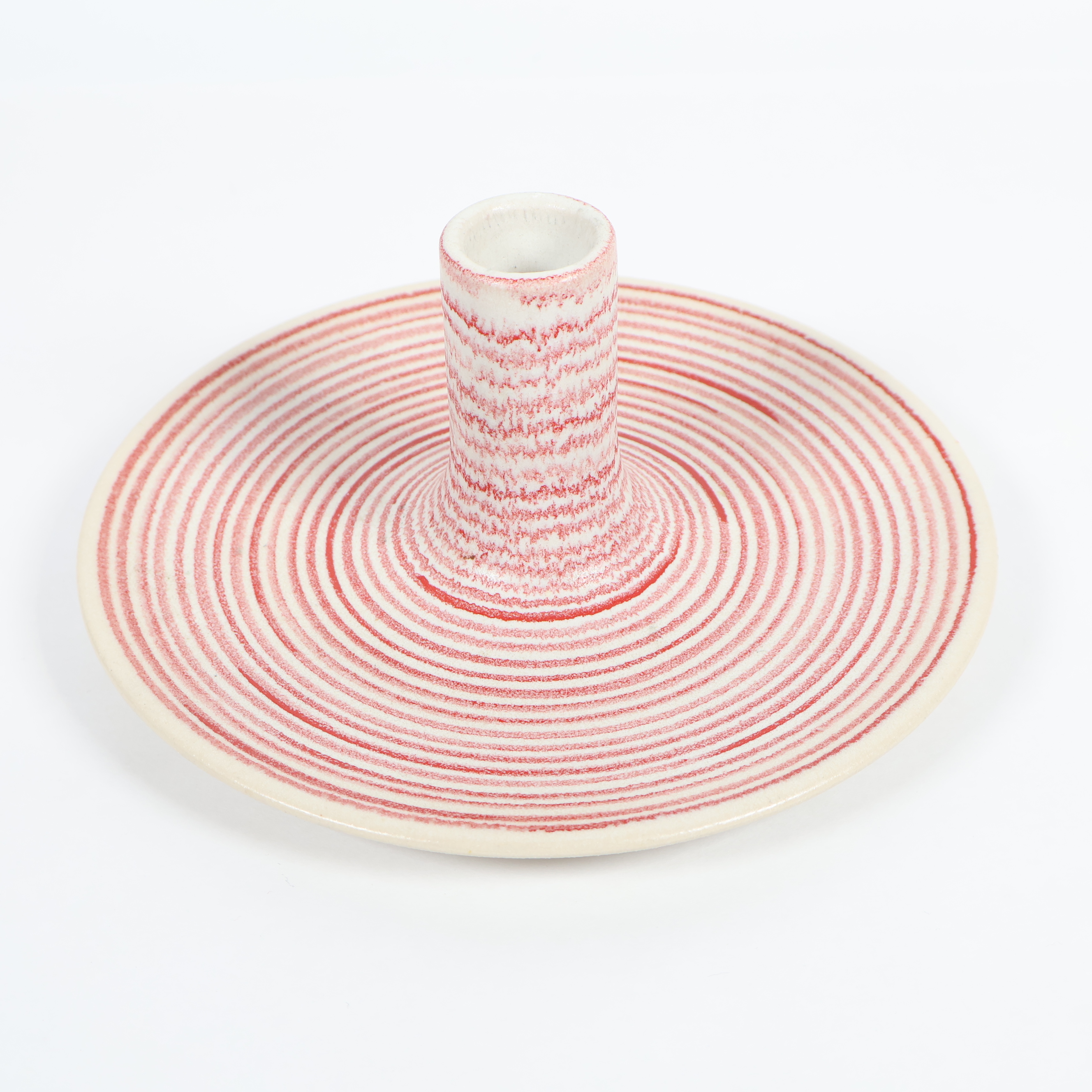 Unik ljusstake i keramik med handmålade röda och vita ränder som ger ett levande intryck. Den cirkulära designen och den höga hållaren skapar ett modernt uttryck. Perfekt för att addera ett personligt och lekfullt inslag till hemmet.