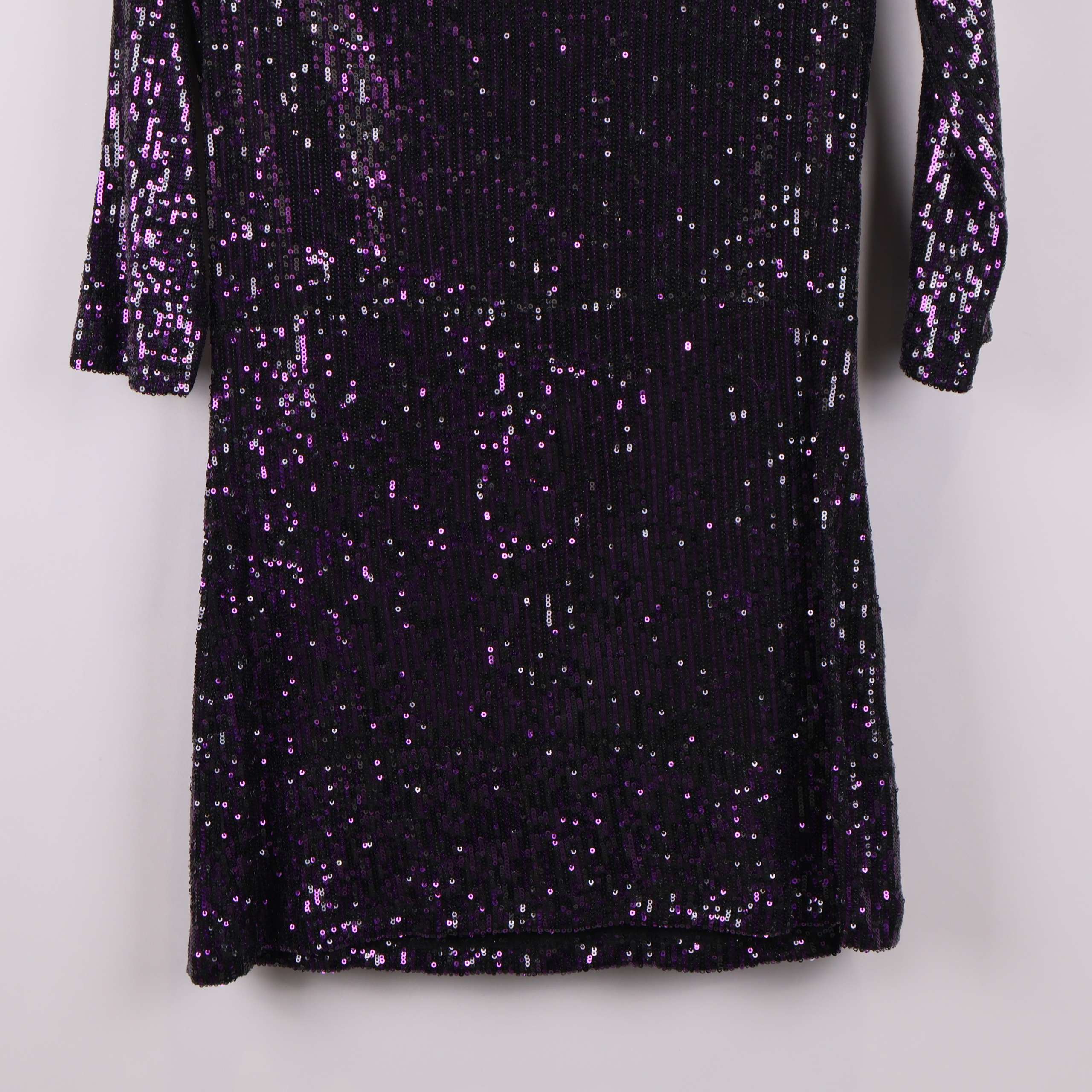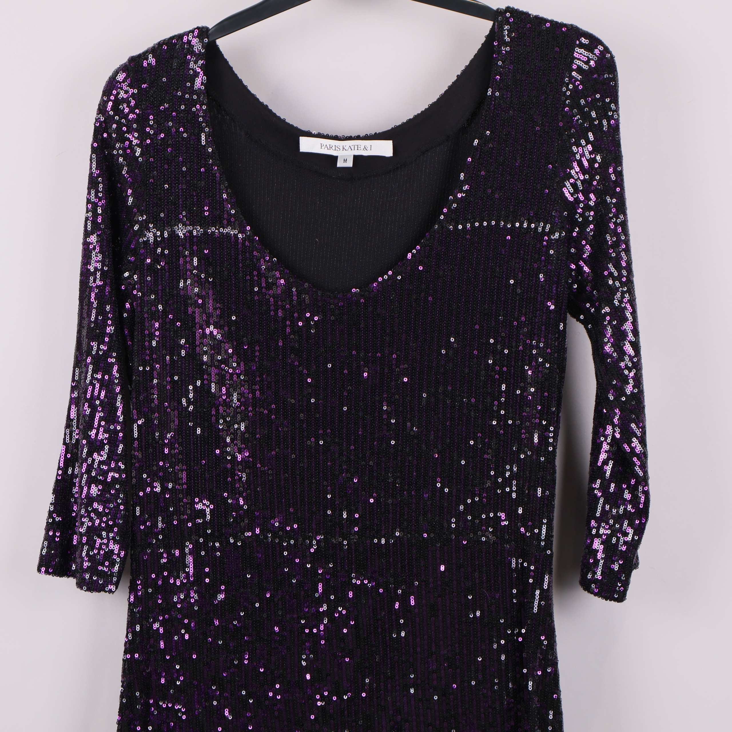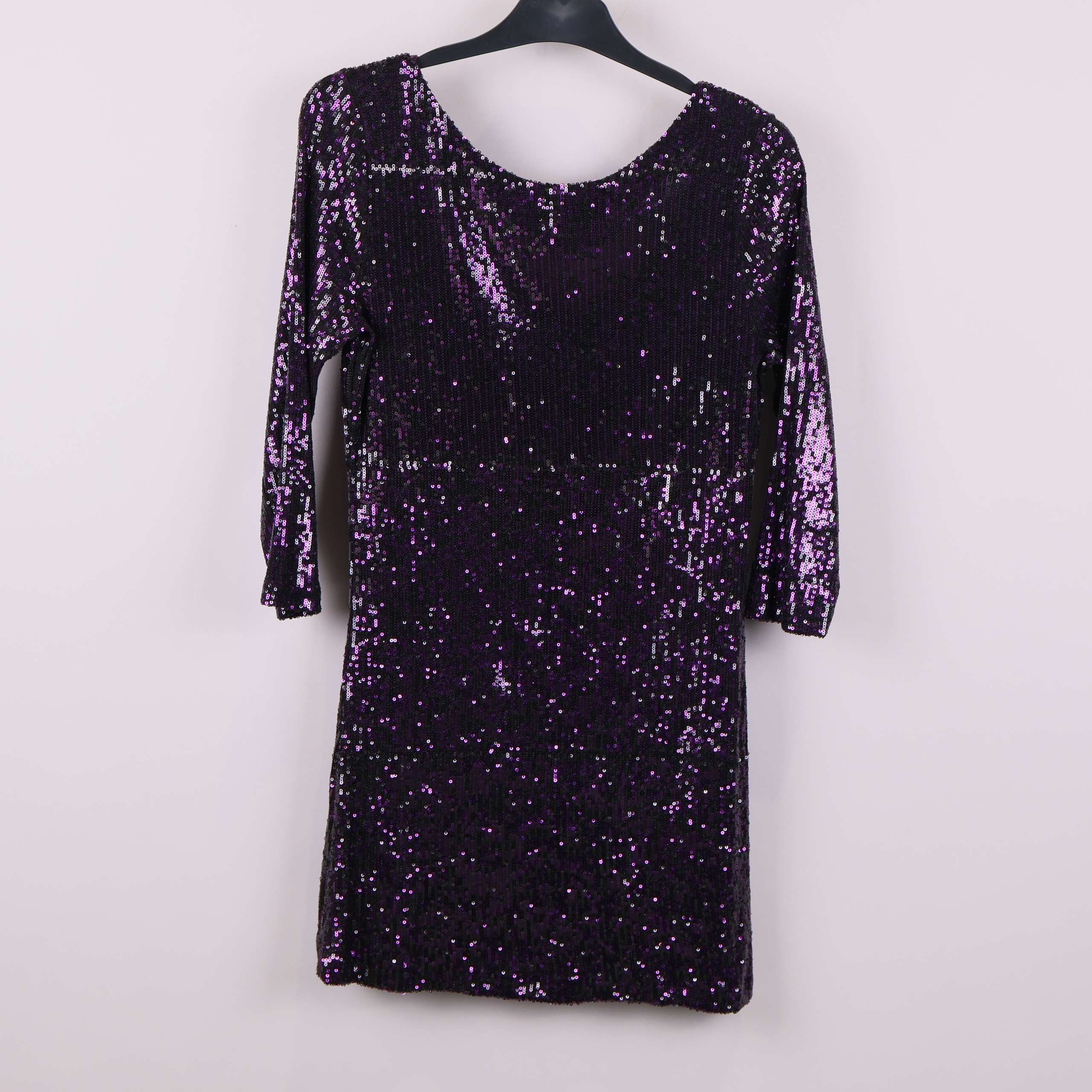 Glittrande paljettklänning med svart bas och djup ringning fram. Hela ytan är täckt av lila och svarta paljetter för en lyxig festkänsla. Modellen har 3/4-långa ärmar och rak, enkel passform. Mjuk insida av viskos som känns behaglig mot huden. Supersnygg för dig som gillar att sticka ut med en elegant, modern vibe.