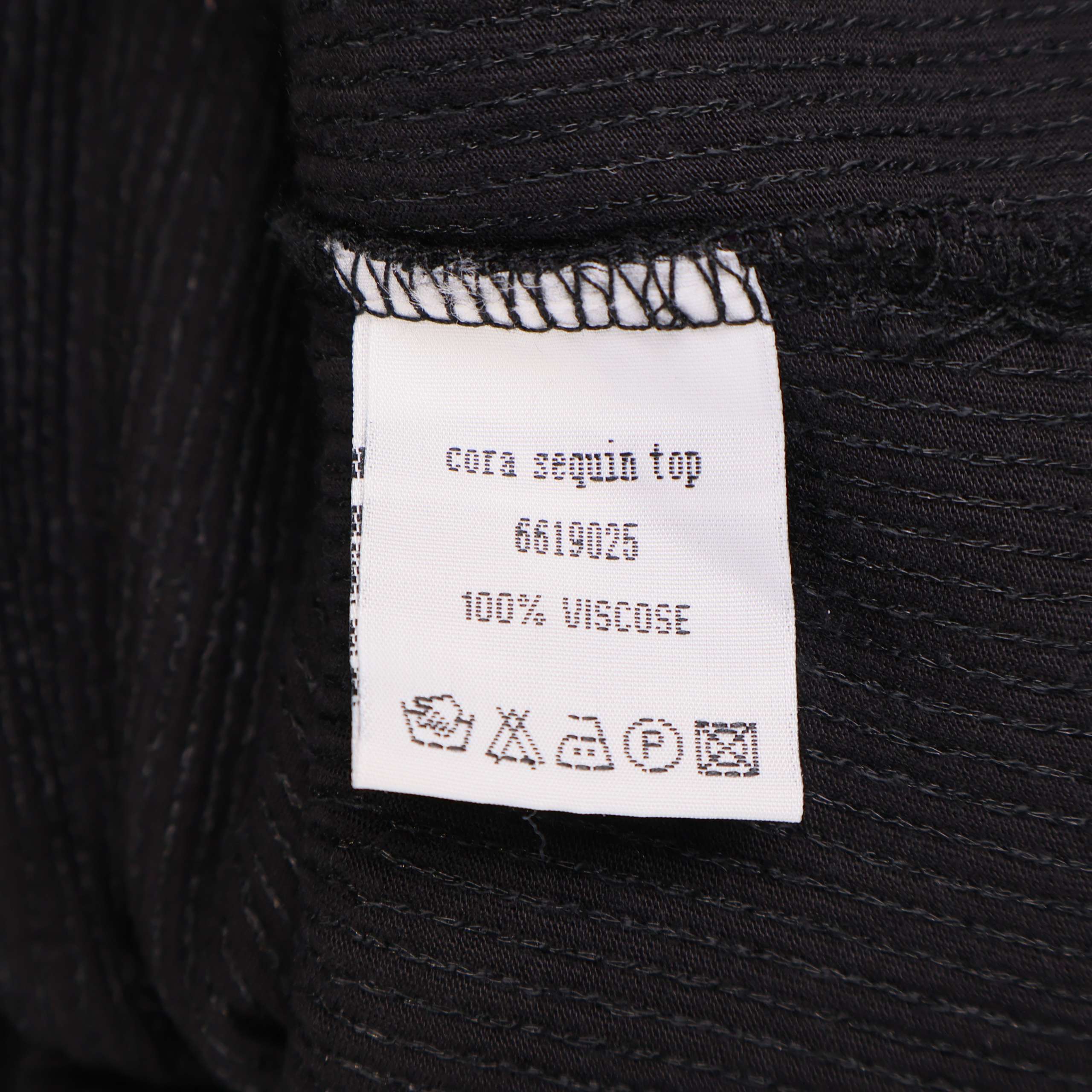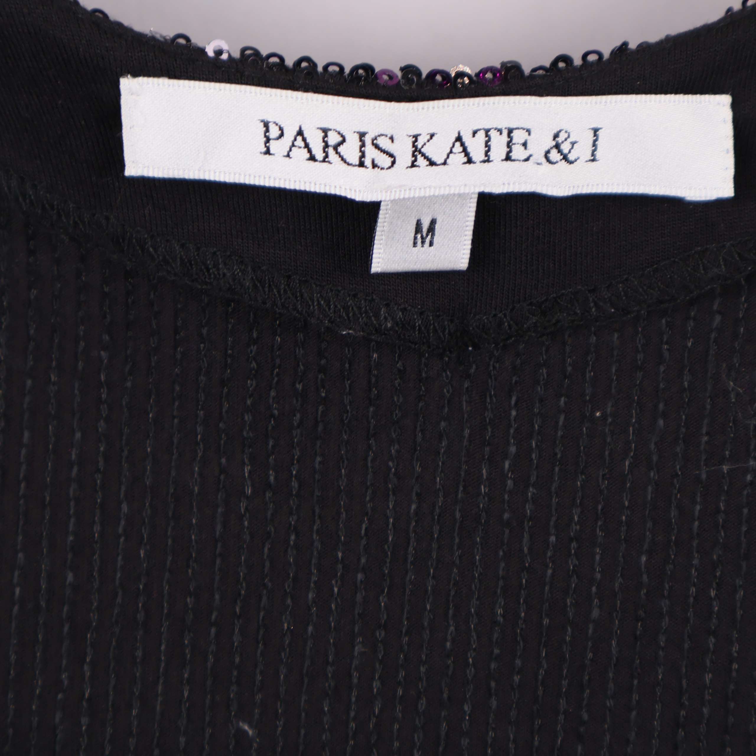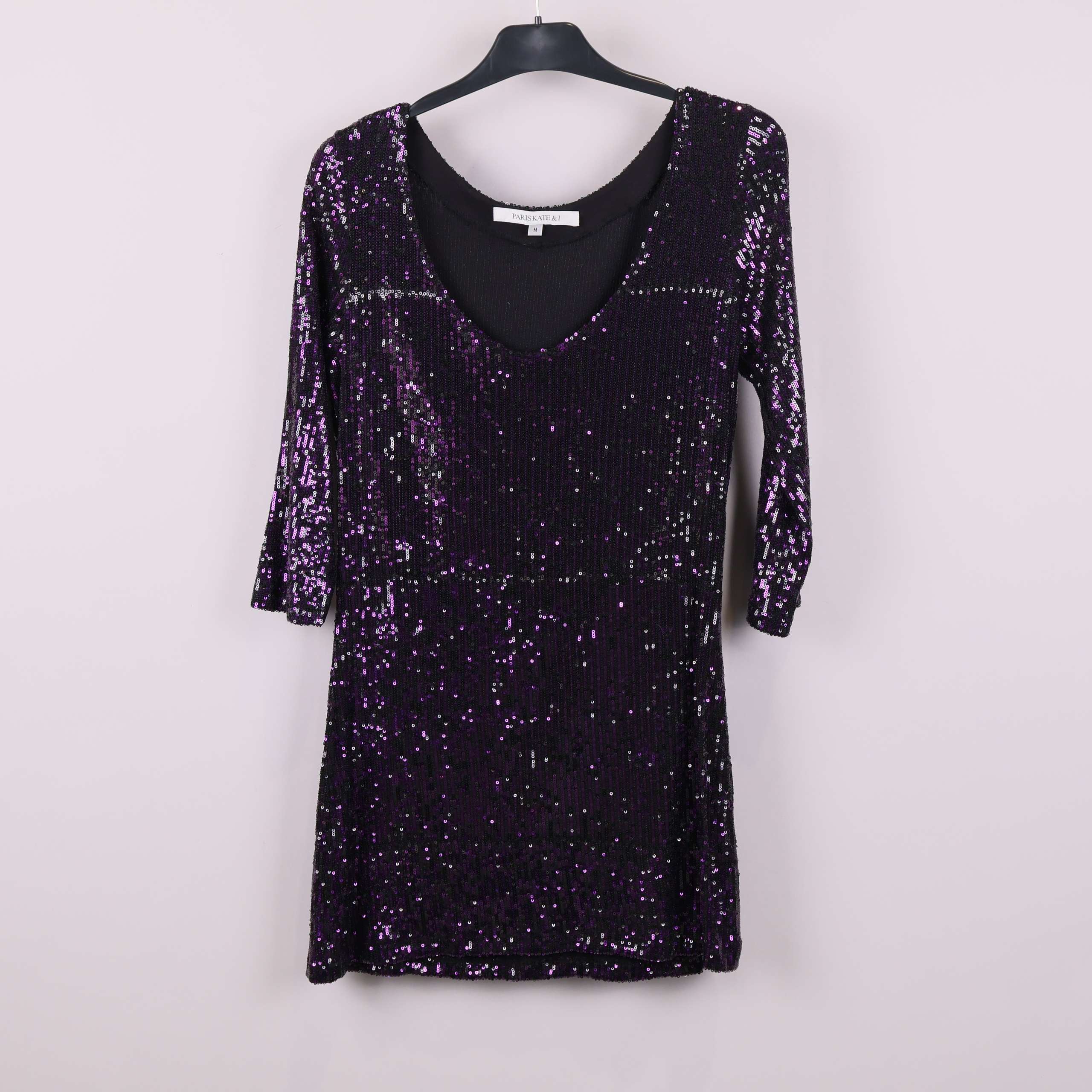 Glittrande paljettklänning med svart bas och djup ringning fram. Hela ytan är täckt av lila och svarta paljetter för en lyxig festkänsla. Modellen har 3/4-långa ärmar och rak, enkel passform. Mjuk insida av viskos som känns behaglig mot huden. Supersnygg för dig som gillar att sticka ut med en elegant, modern vibe.