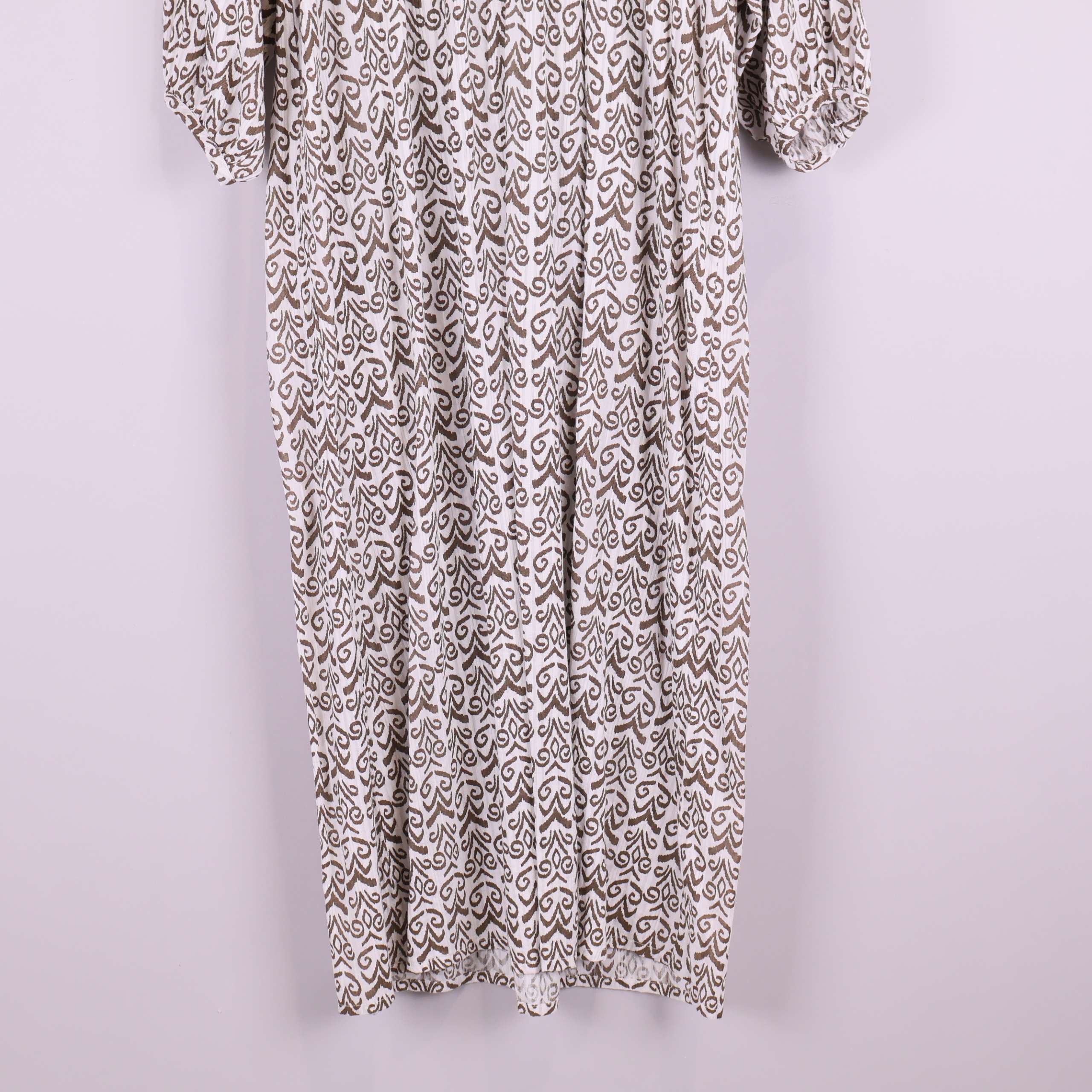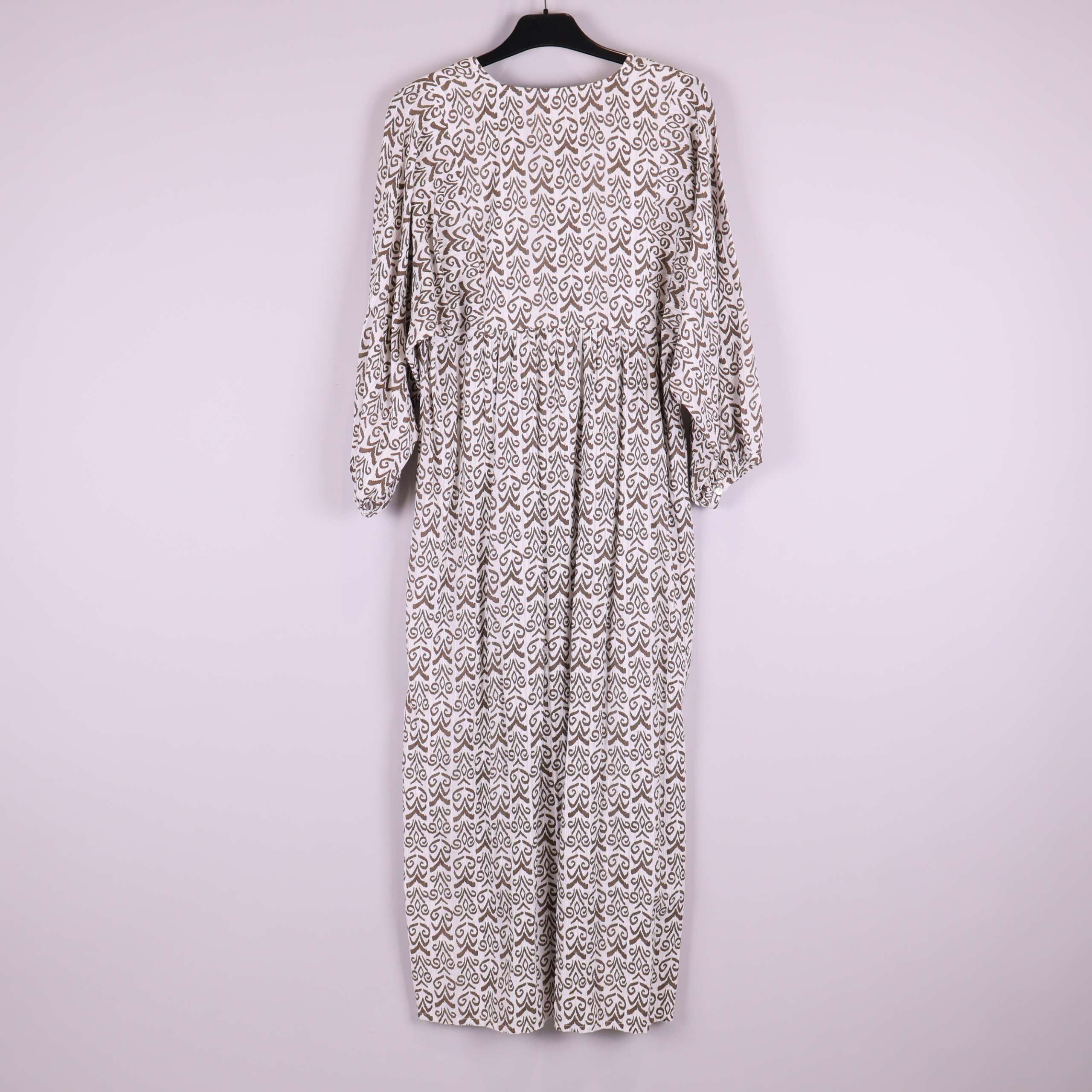 Luftig långklänning med vackert mönster i mjukt bomullstyg. Klänningen har generös vidd, V-ringning och långa ärmar med resår vid handlederna för en avslappnad silhuett. Perfekt för dig som gillar bekväm stil med en hint av bohemisk känsla. Materialet känns lätt och andas, vilket ger en skön känsla hela dagen.