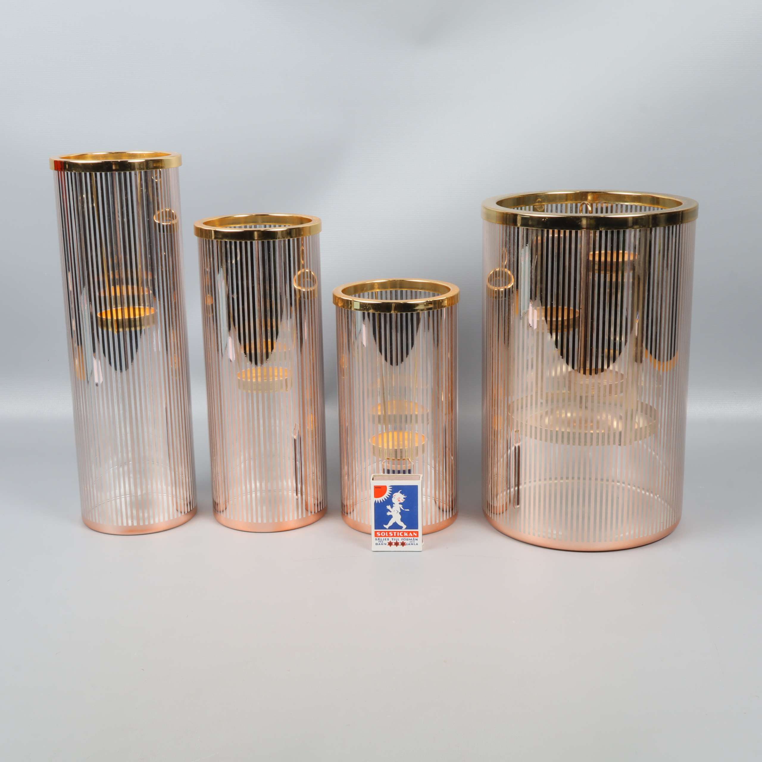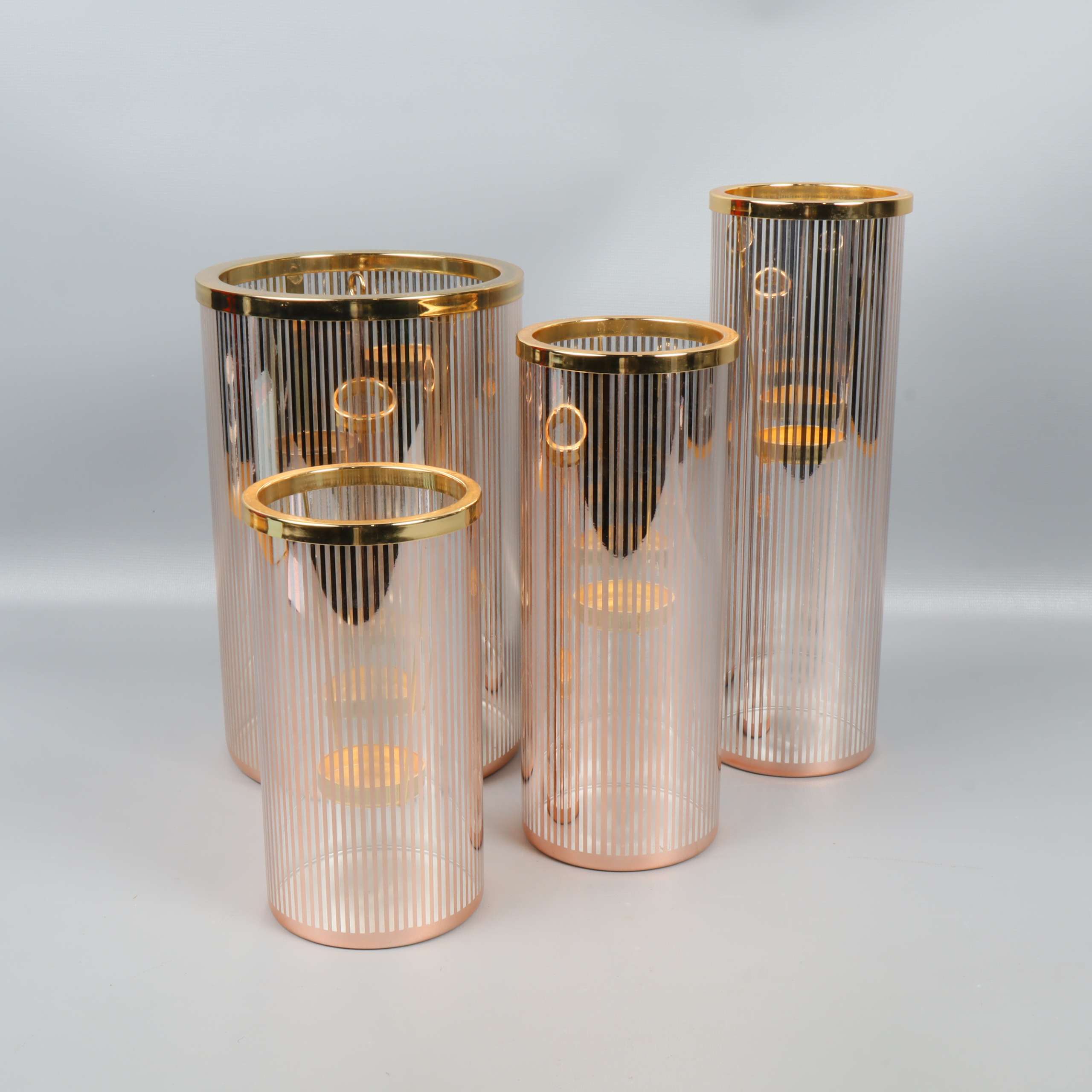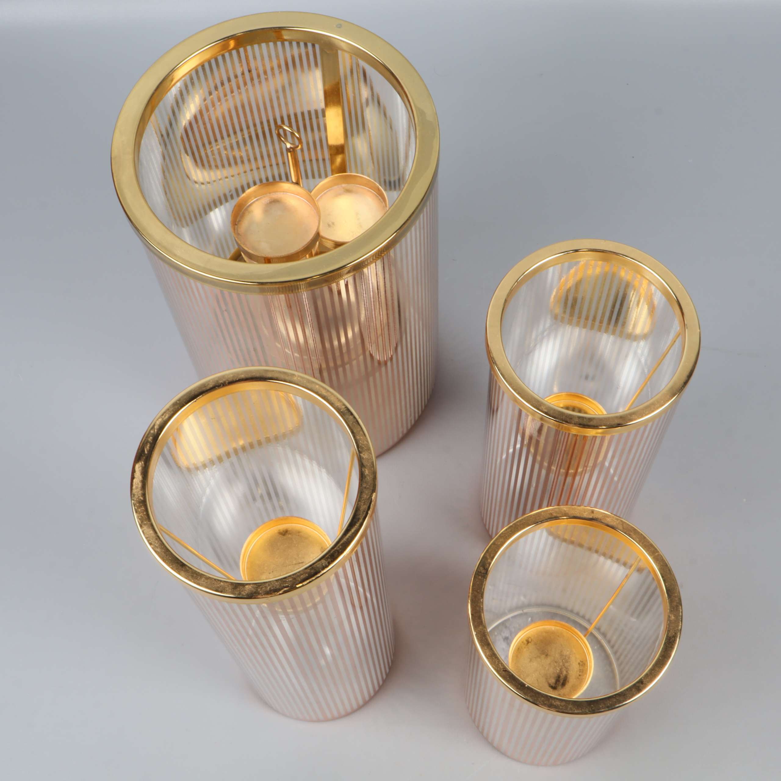 Set med fyra cylinderformade ljuslyktor i glas med eleganta vertikala linjer och detaljer i guldton. Varje lykta har en stabil, separerbar insats för värmeljus eller små ljus.