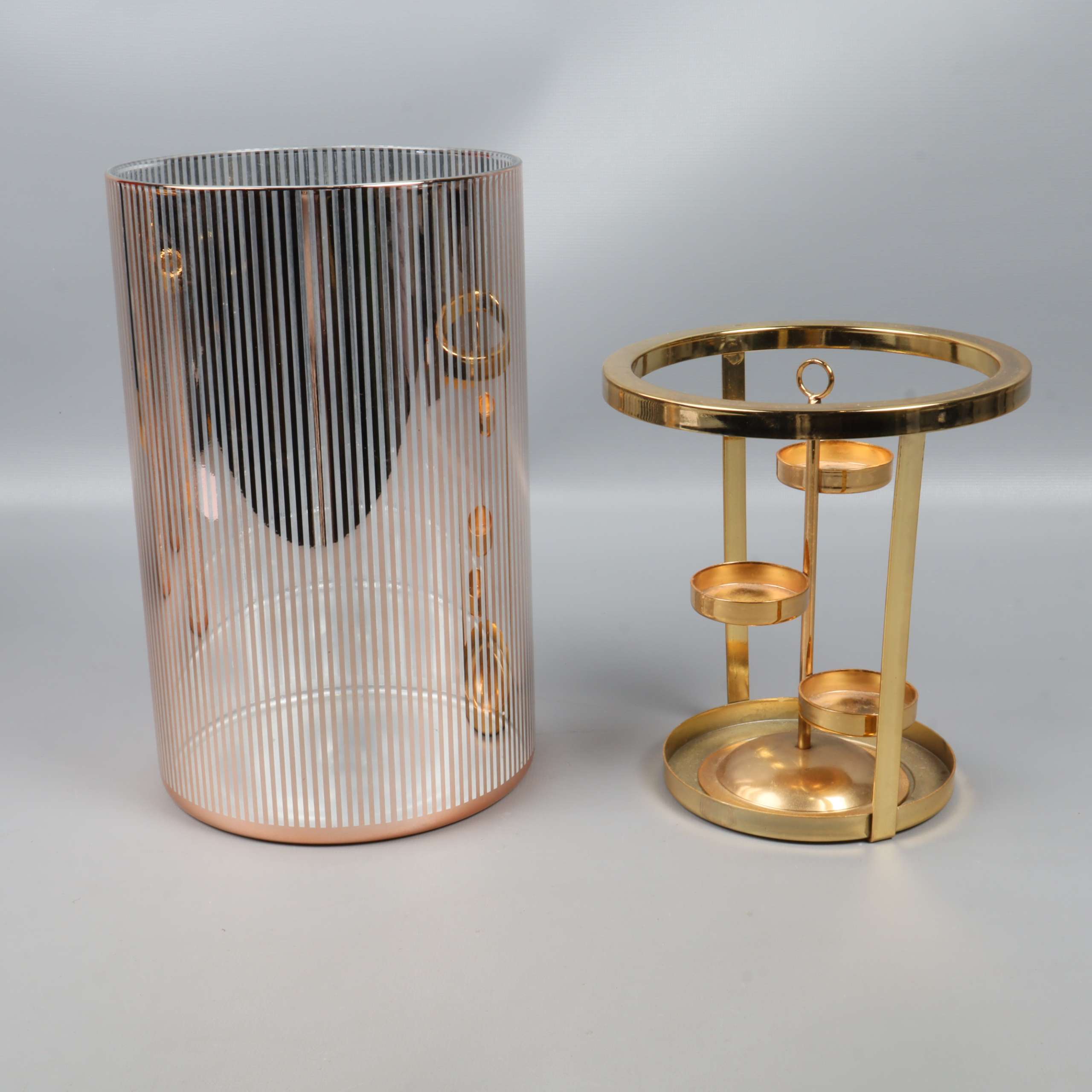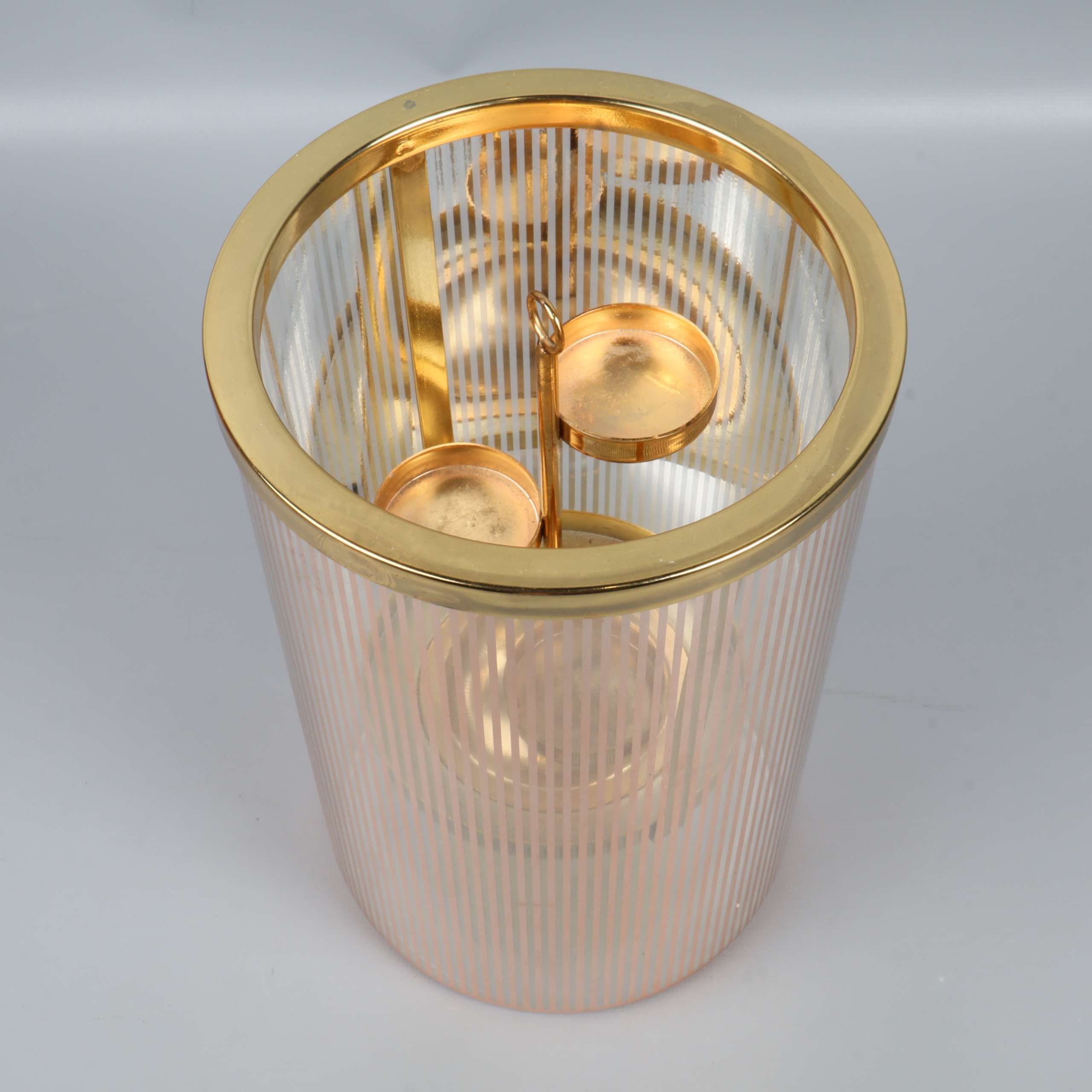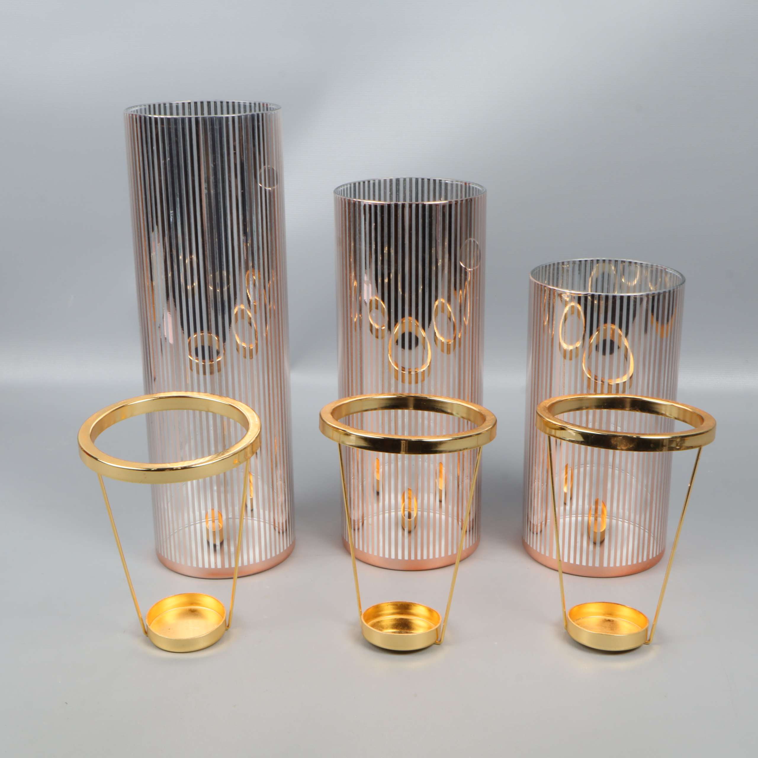 Set med fyra cylinderformade ljuslyktor i glas med eleganta vertikala linjer och detaljer i guldton. Varje lykta har en stabil, separerbar insats för värmeljus eller små ljus.