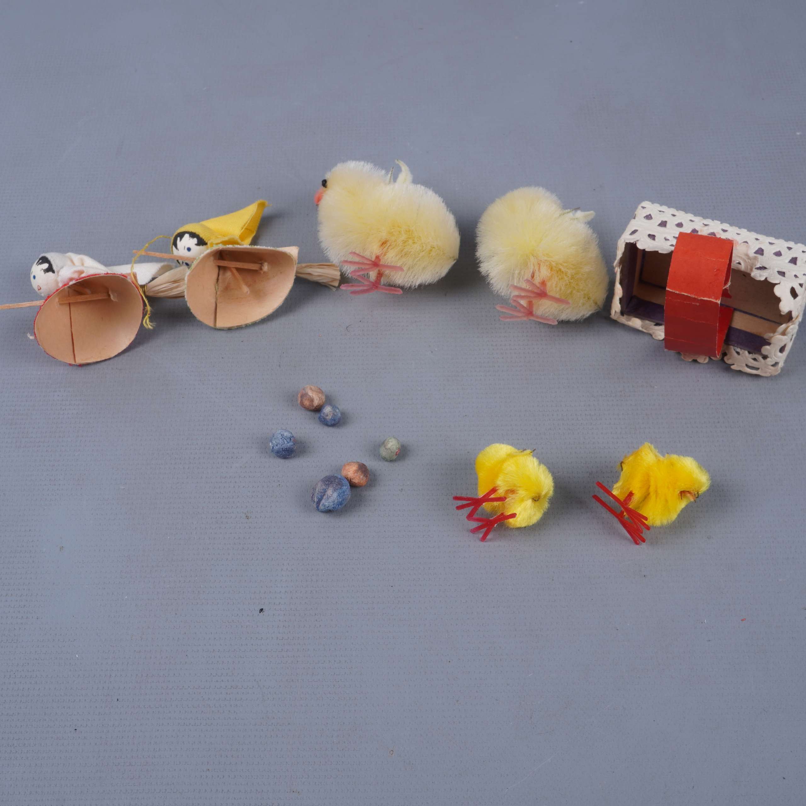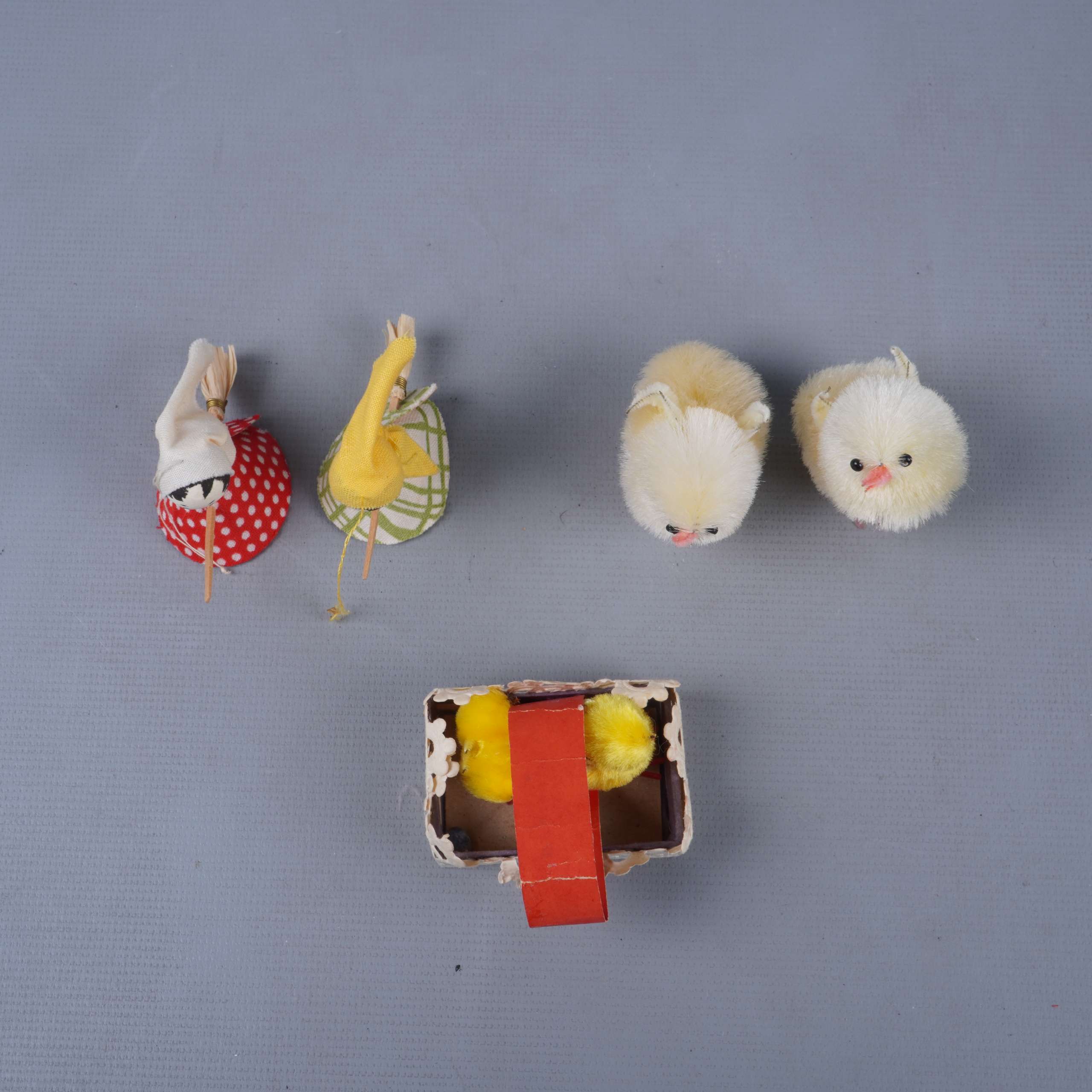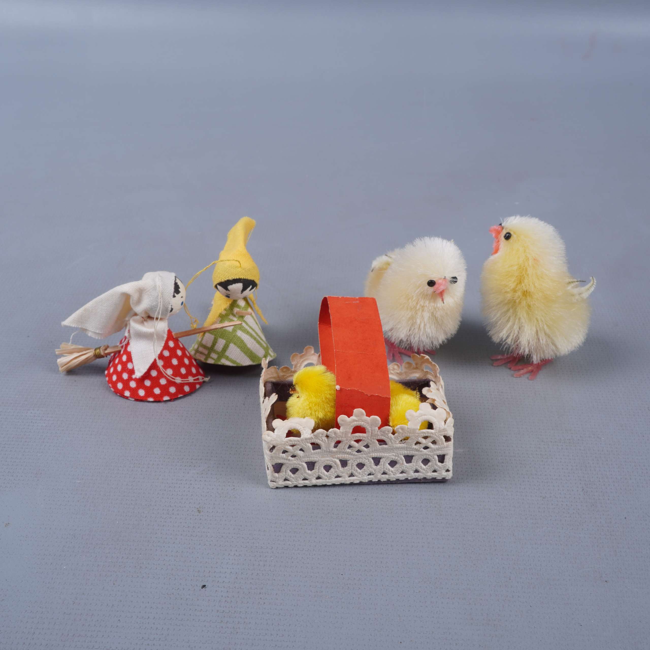 Charmig påskdekoration med små mjuka kycklingar, färgglada hantverksfigurer och en liten brun och röd korg med spetskant. Roliga detaljer och klassisk påskkänsla för ett lekfullt inslag i hemmets dekorationer.