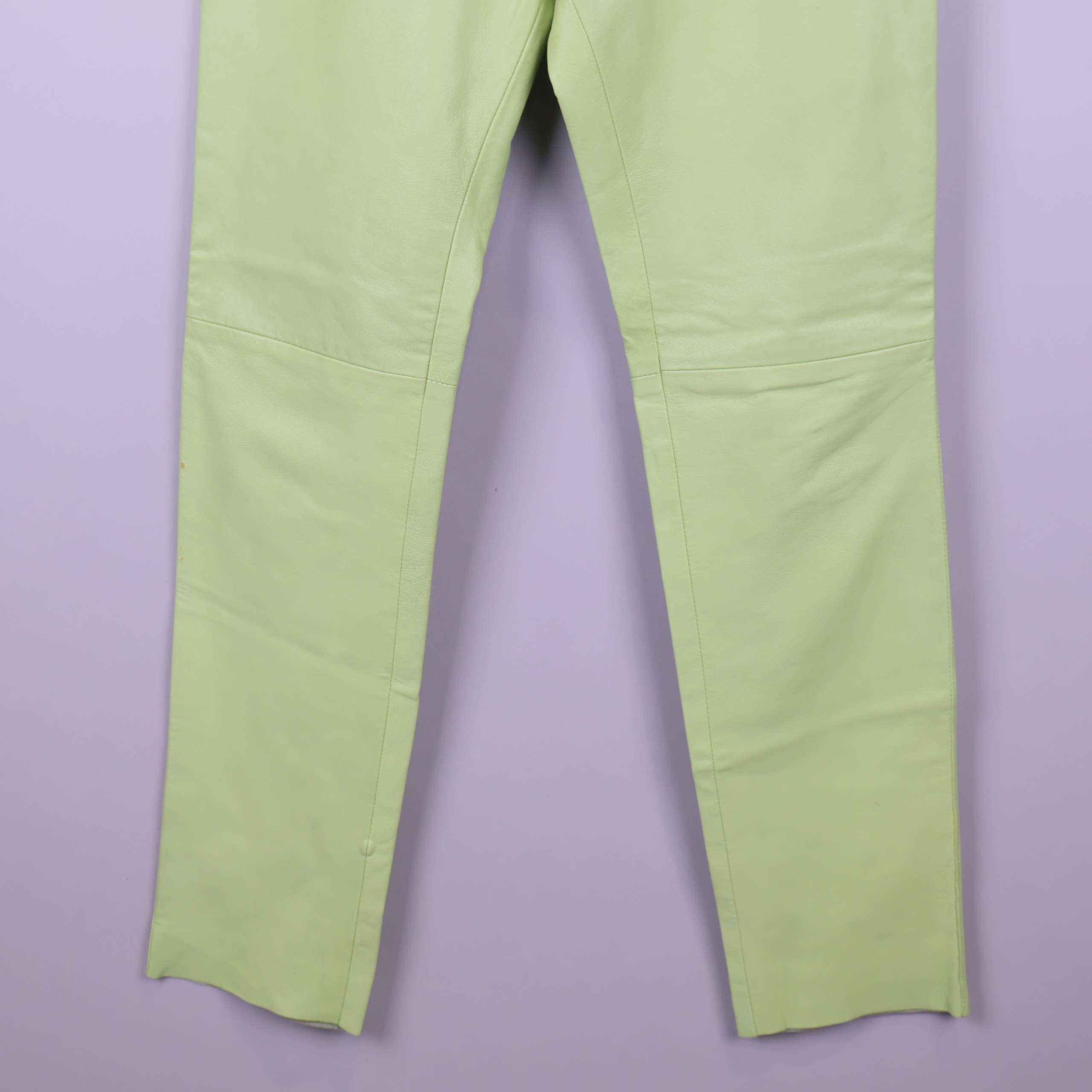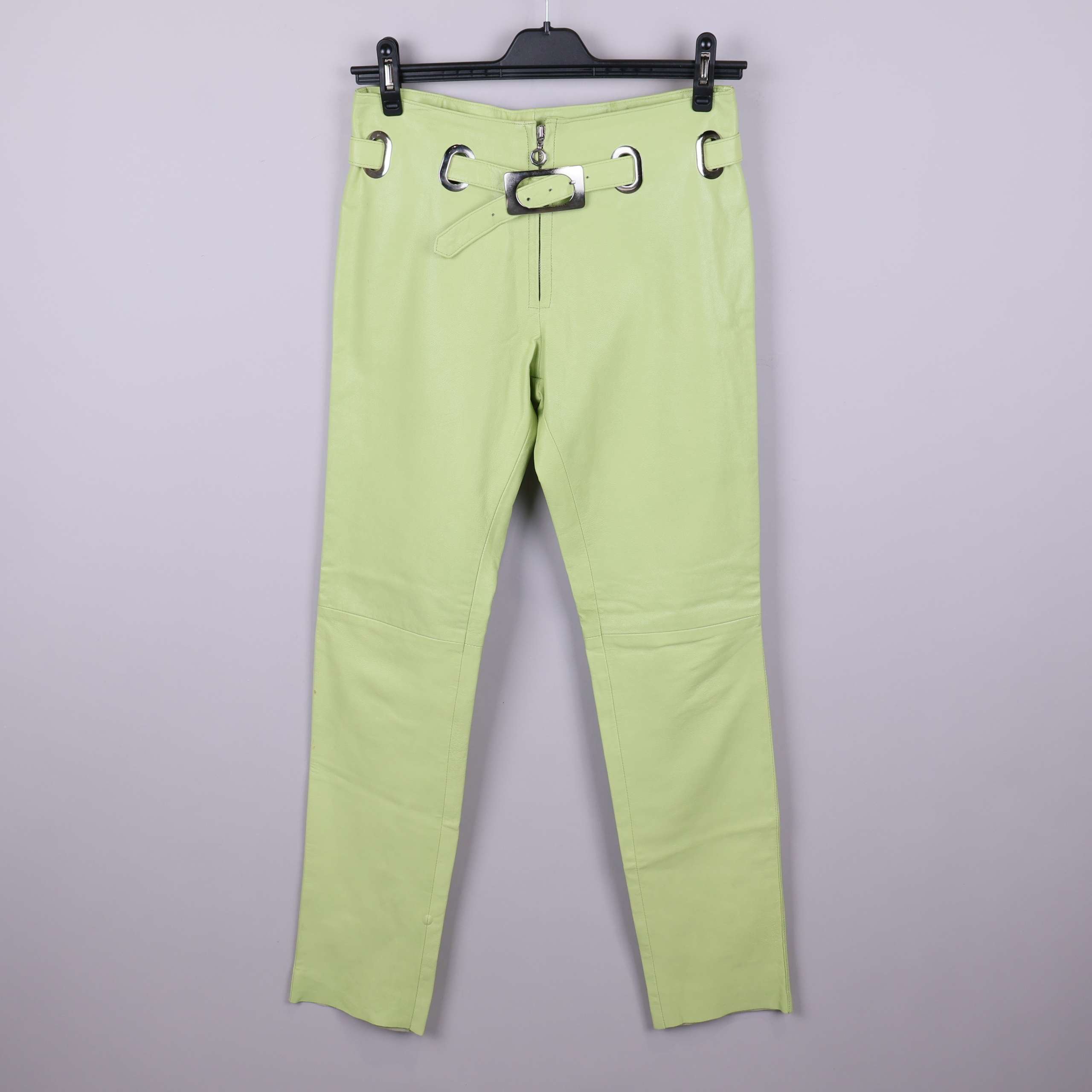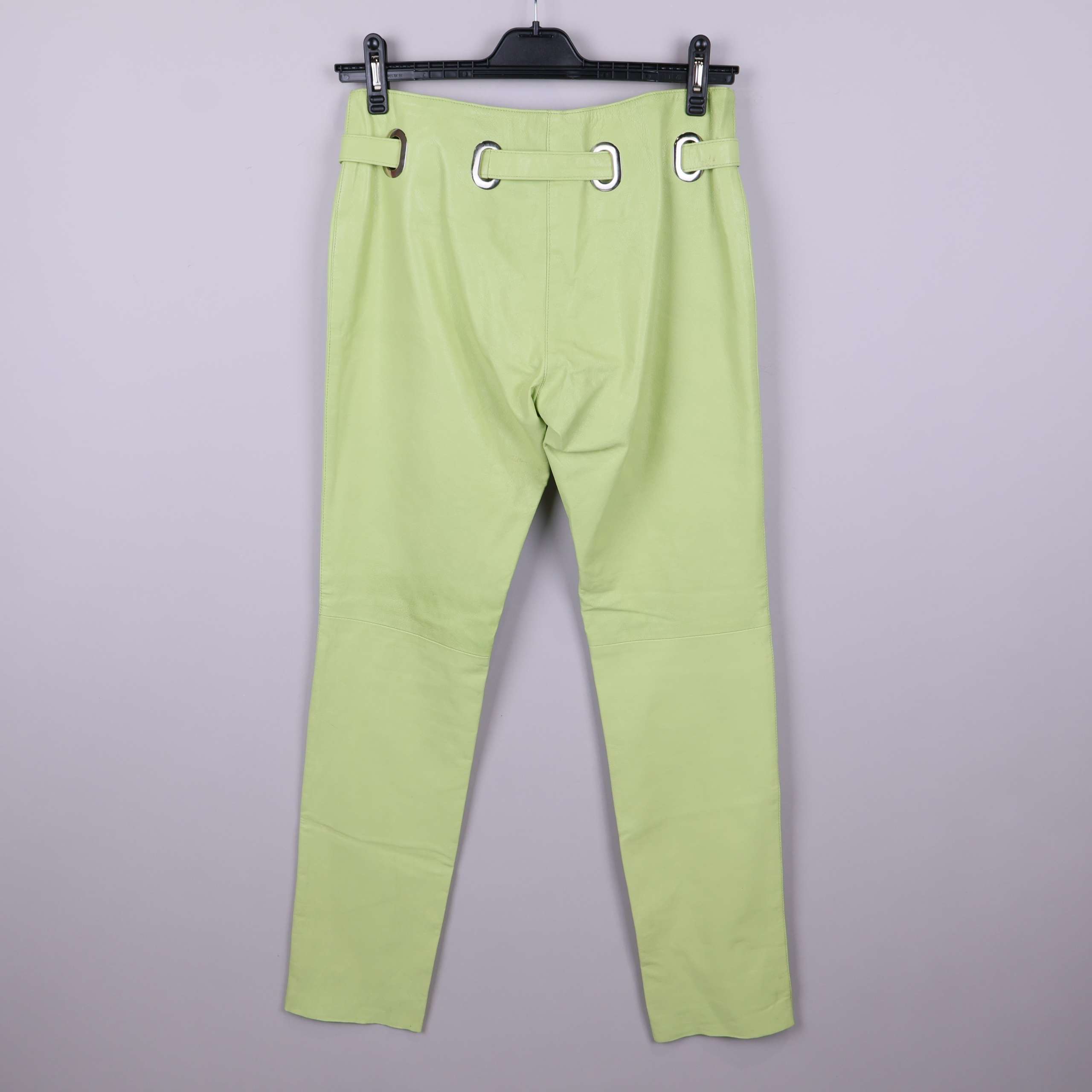 Unika byxor i ljusgrönt läder med dekorativa metalldetaljer och tillhörande bälte för en cool look. Materialet har en mjuk finish med nubuckkänsla, och byxorna har raka ben samt hög midja. Insidan är försedd med ett satinliknande foder som ger extra komfort och en exklusiv känsla.