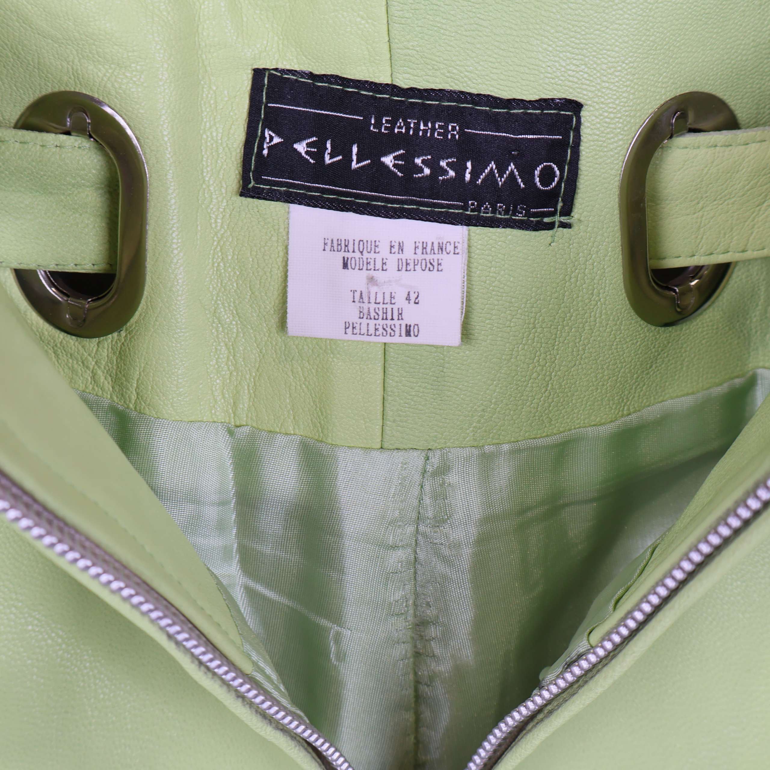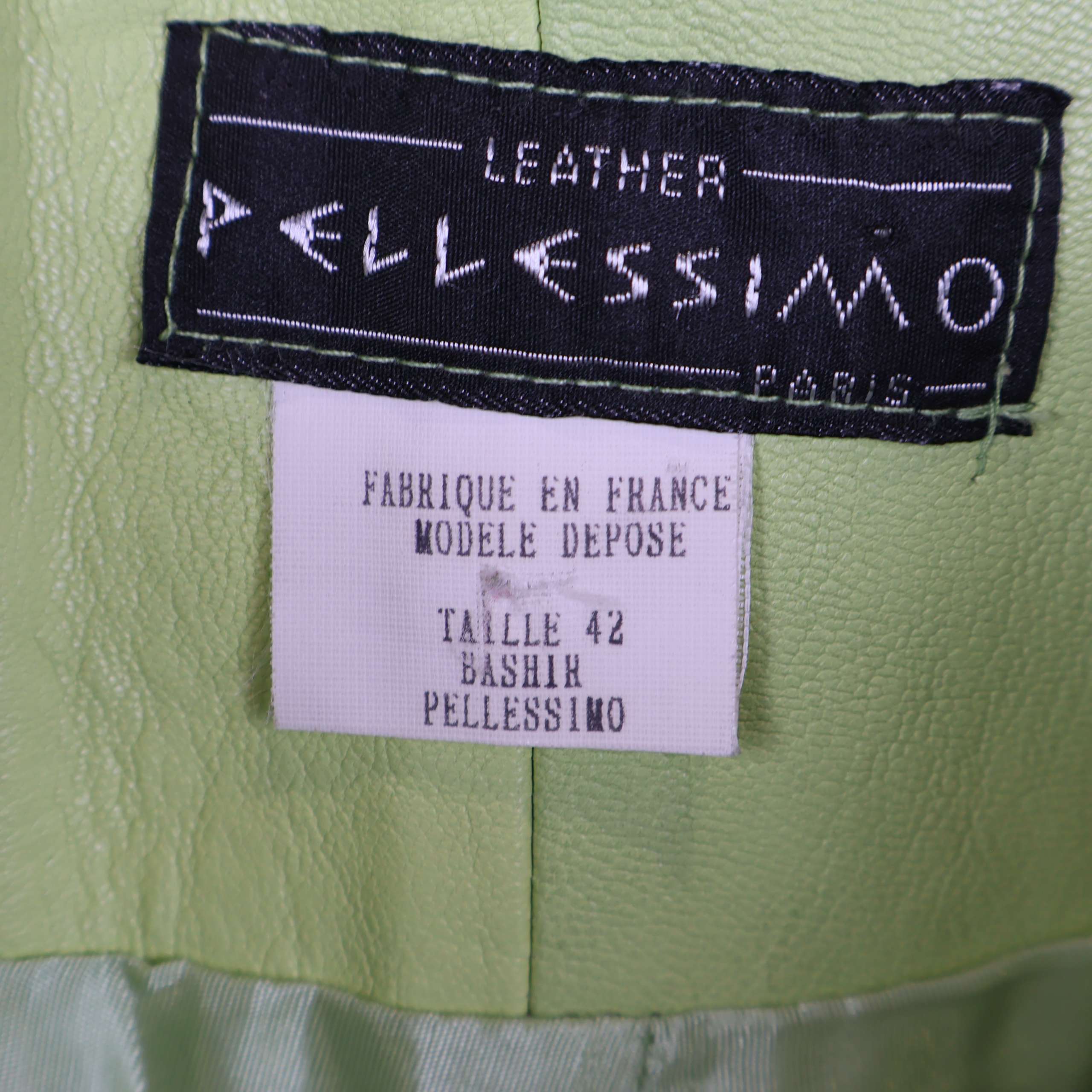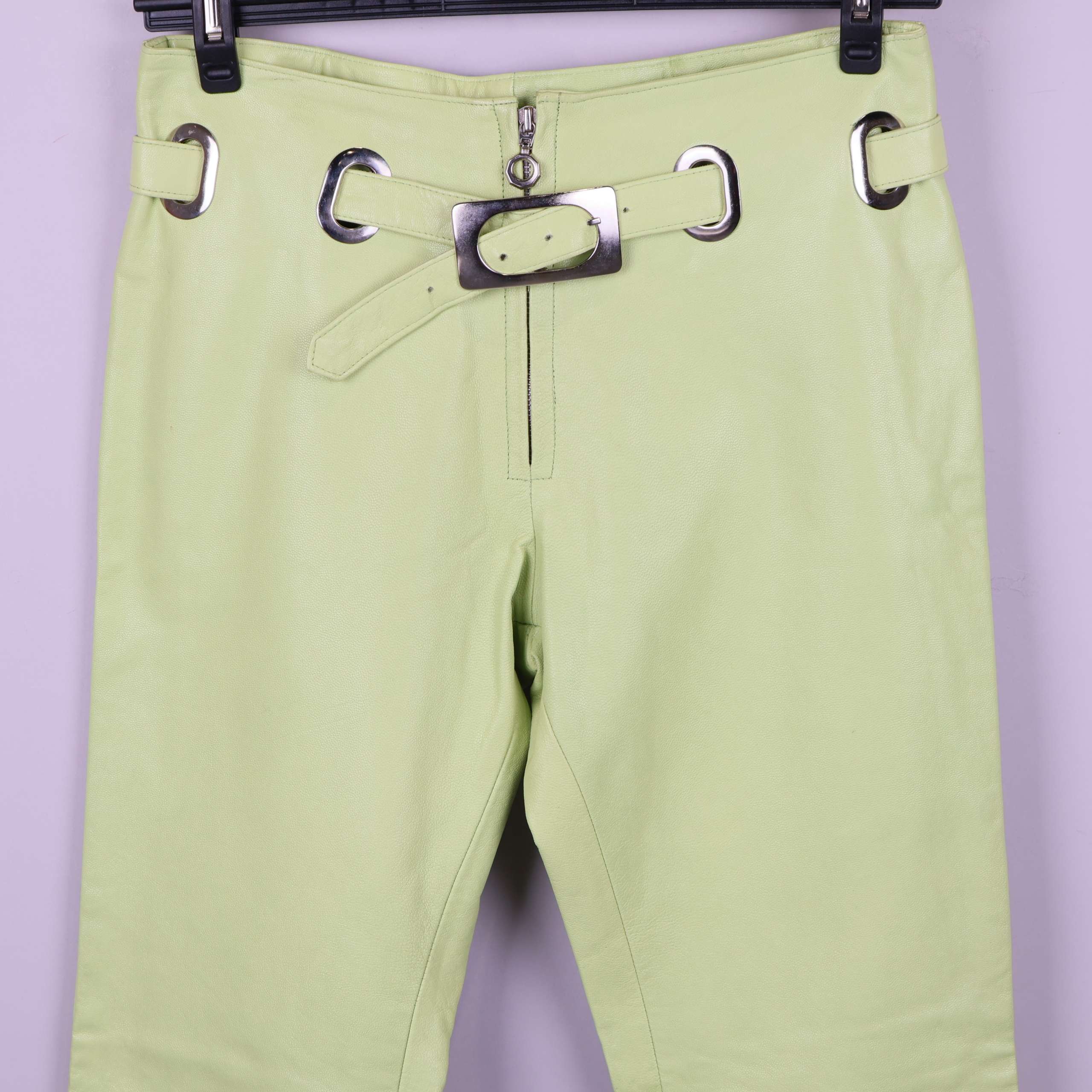 Unika byxor i ljusgrönt läder med dekorativa metalldetaljer och tillhörande bälte för en cool look. Materialet har en mjuk finish med nubuckkänsla, och byxorna har raka ben samt hög midja. Insidan är försedd med ett satinliknande foder som ger extra komfort och en exklusiv känsla.