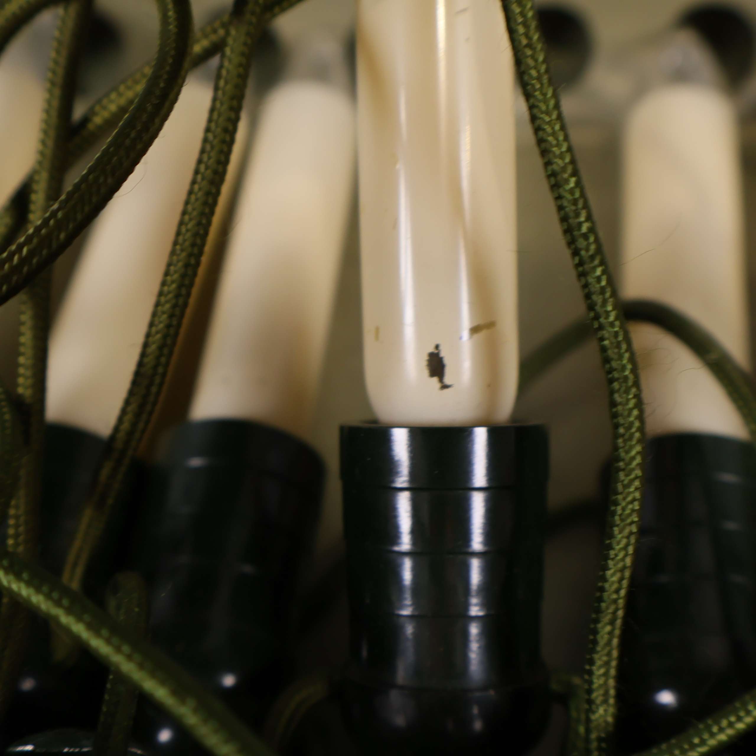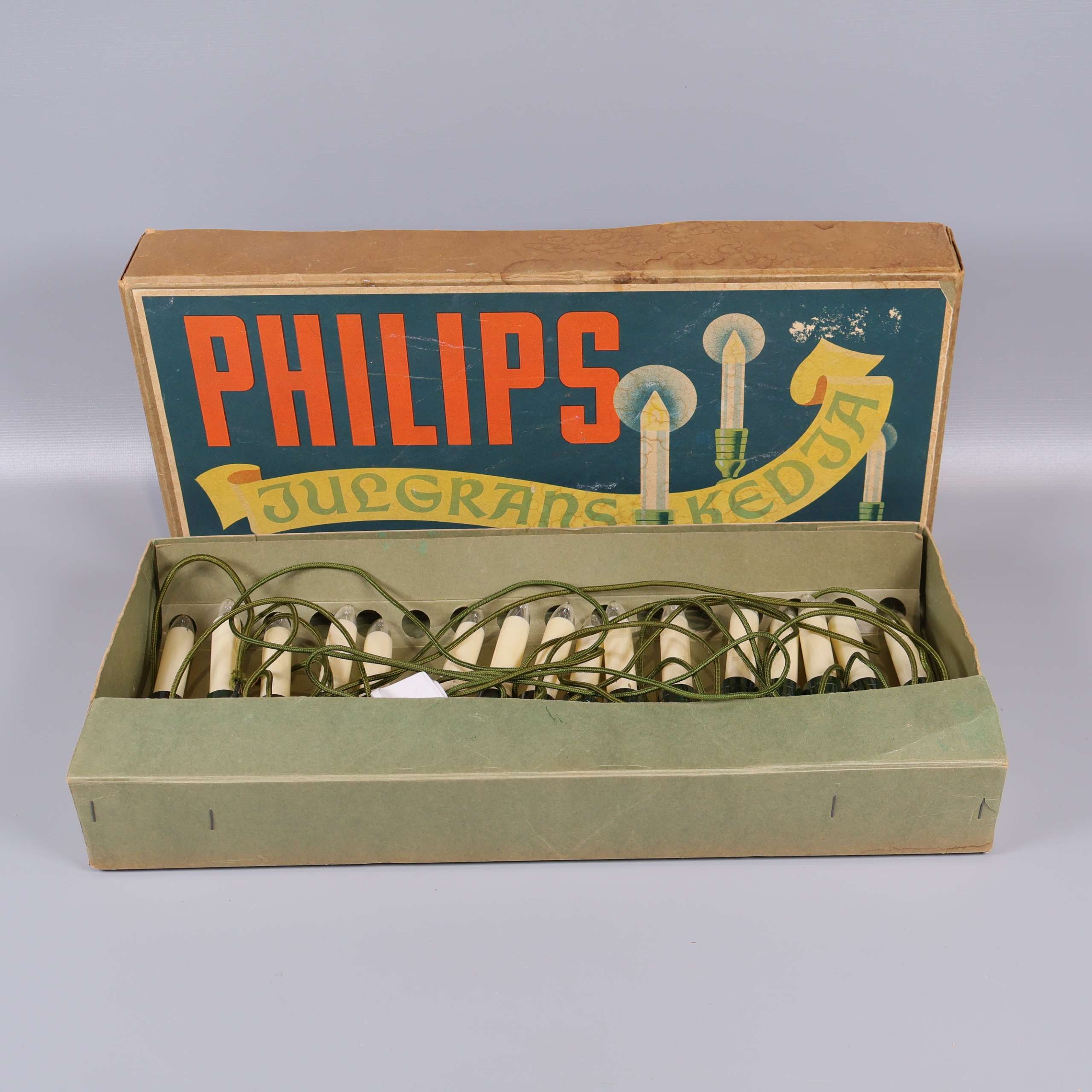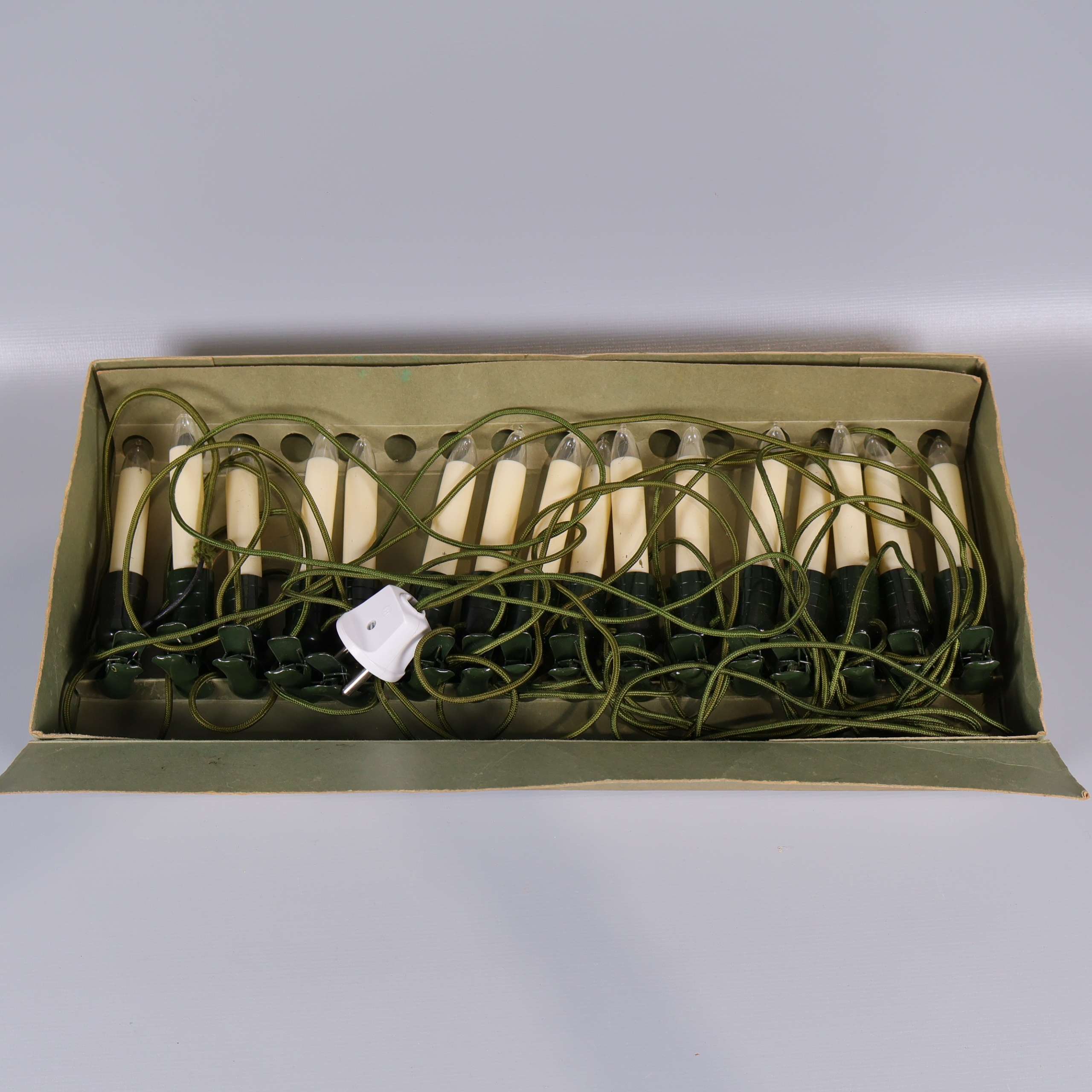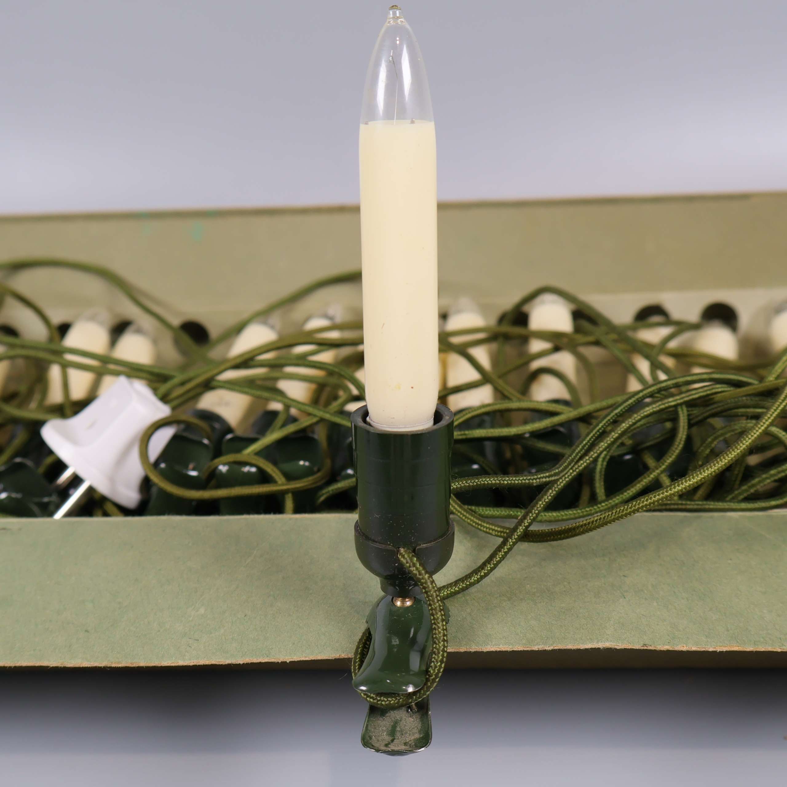 En tidlös julgransslinga med flera gräddvita elektriska ljus och gröna hållare, komplett med klassisk design och originalkartong. Slingan har grön textilkabel och europastickpropp, vilket skapar en mysig vintage vibe till vinterdekorationen.