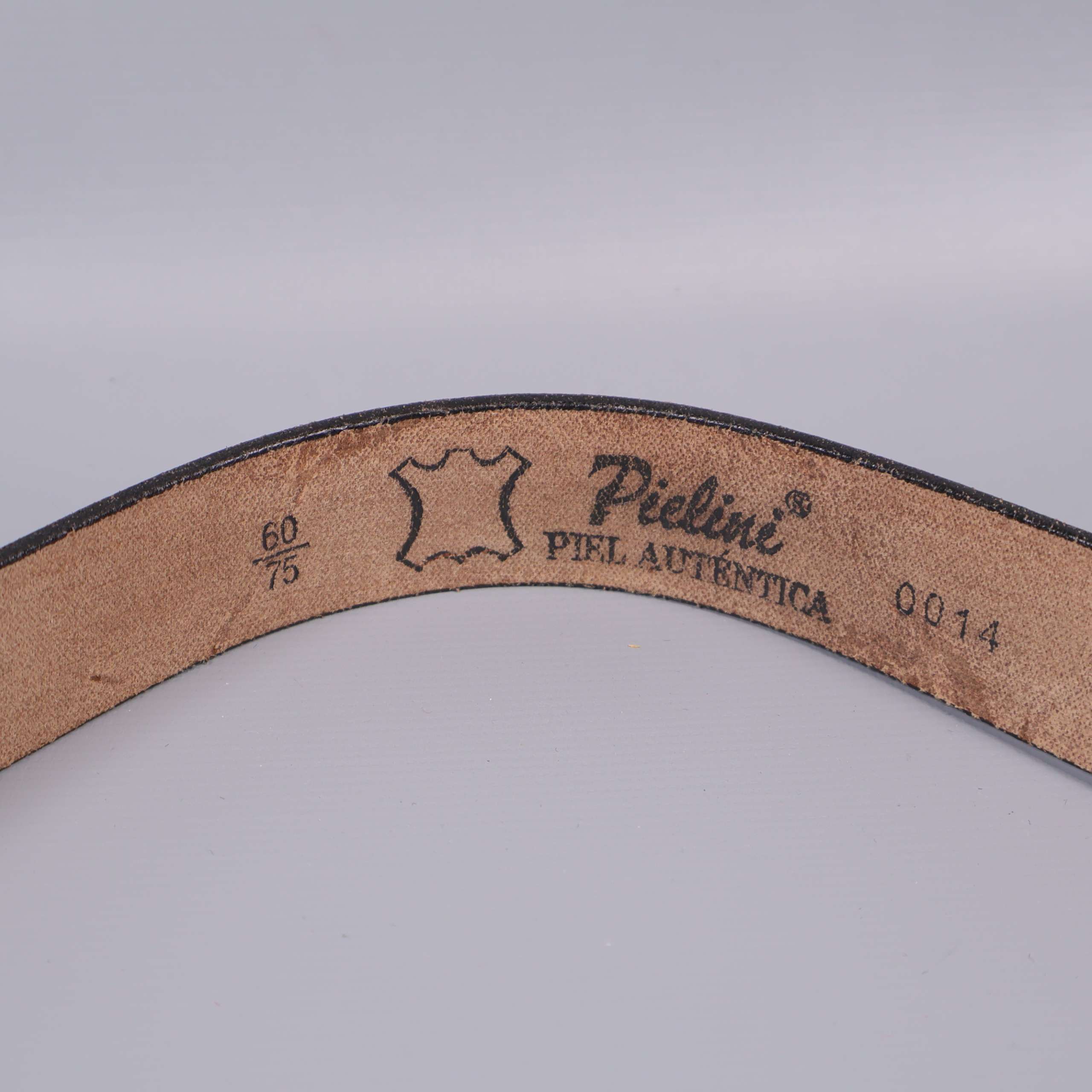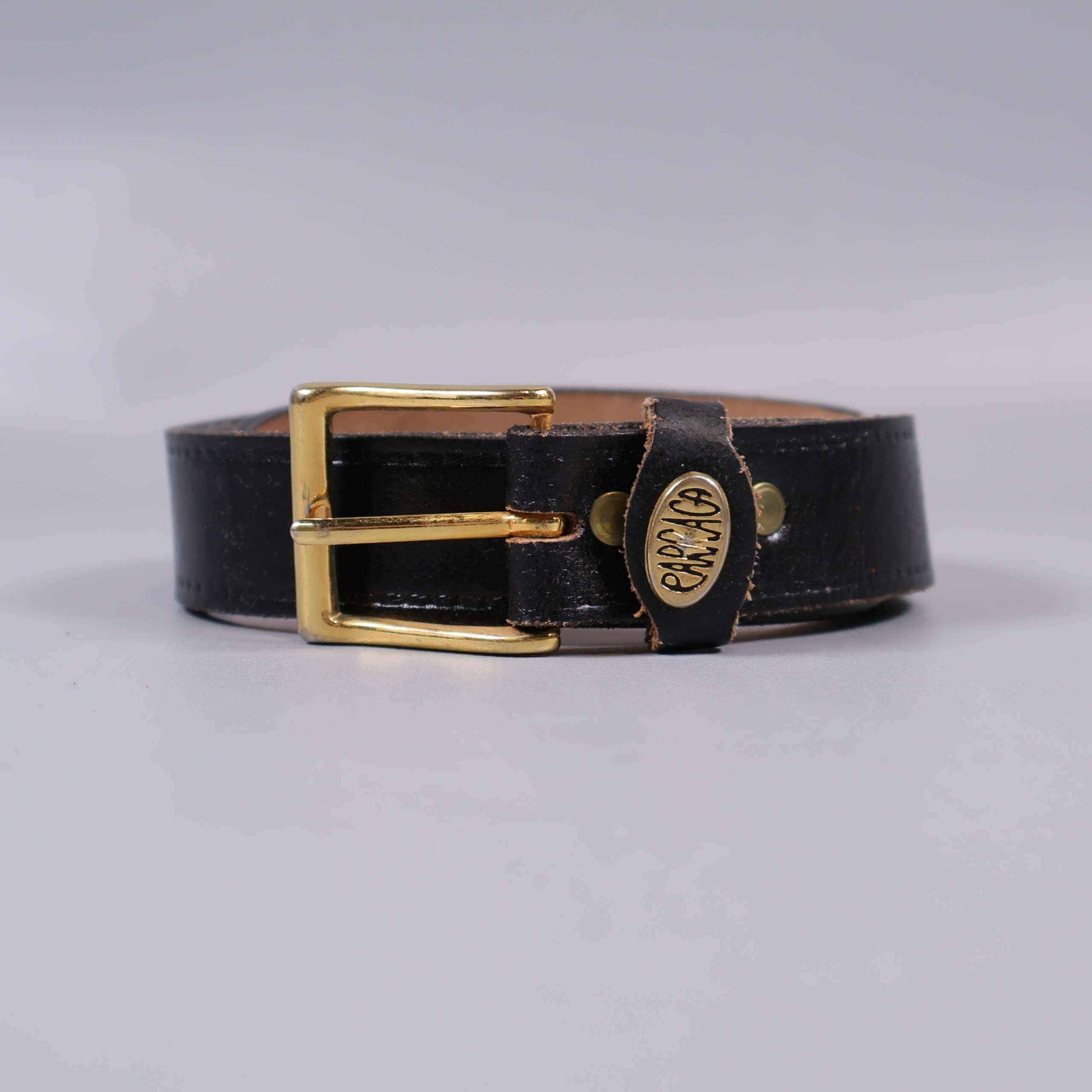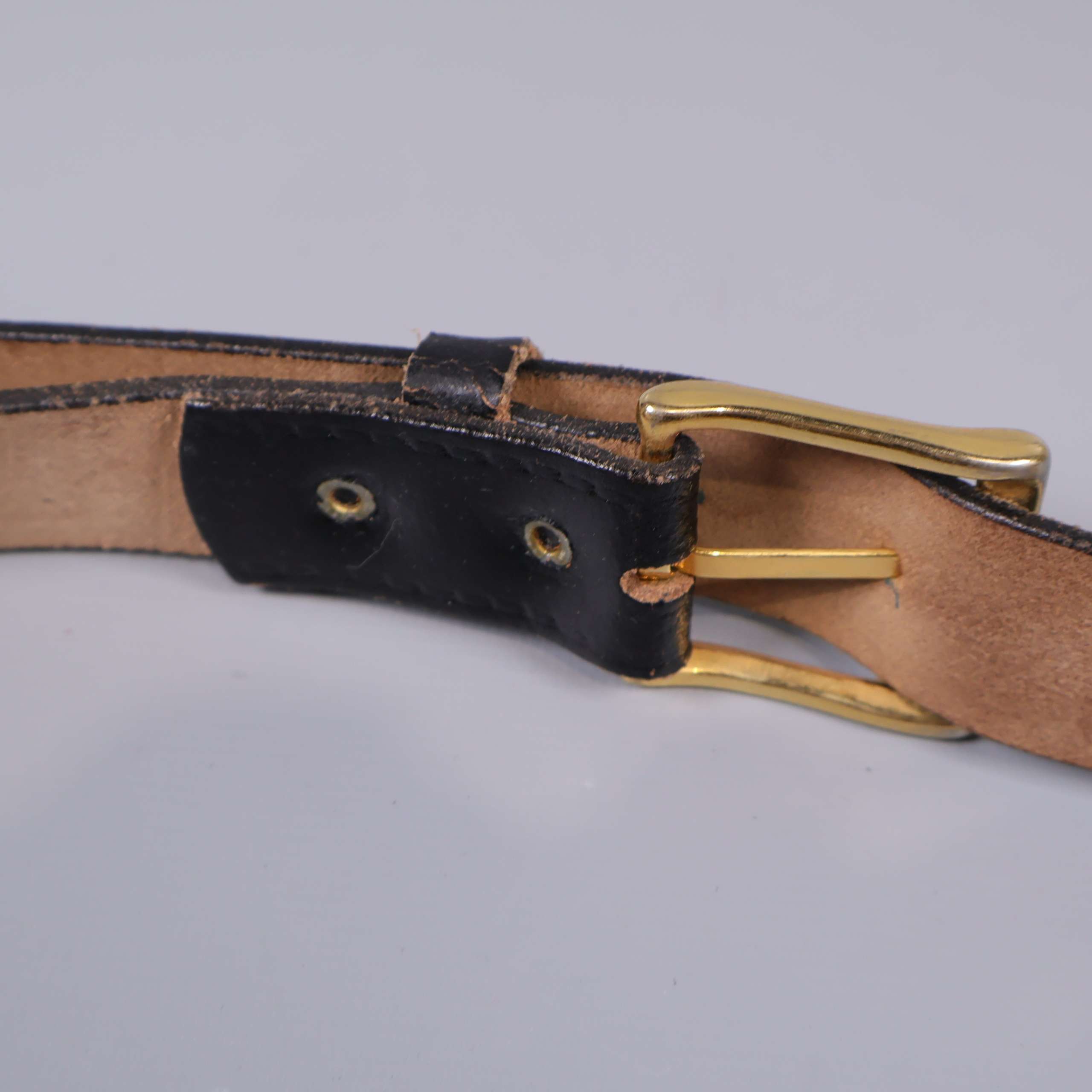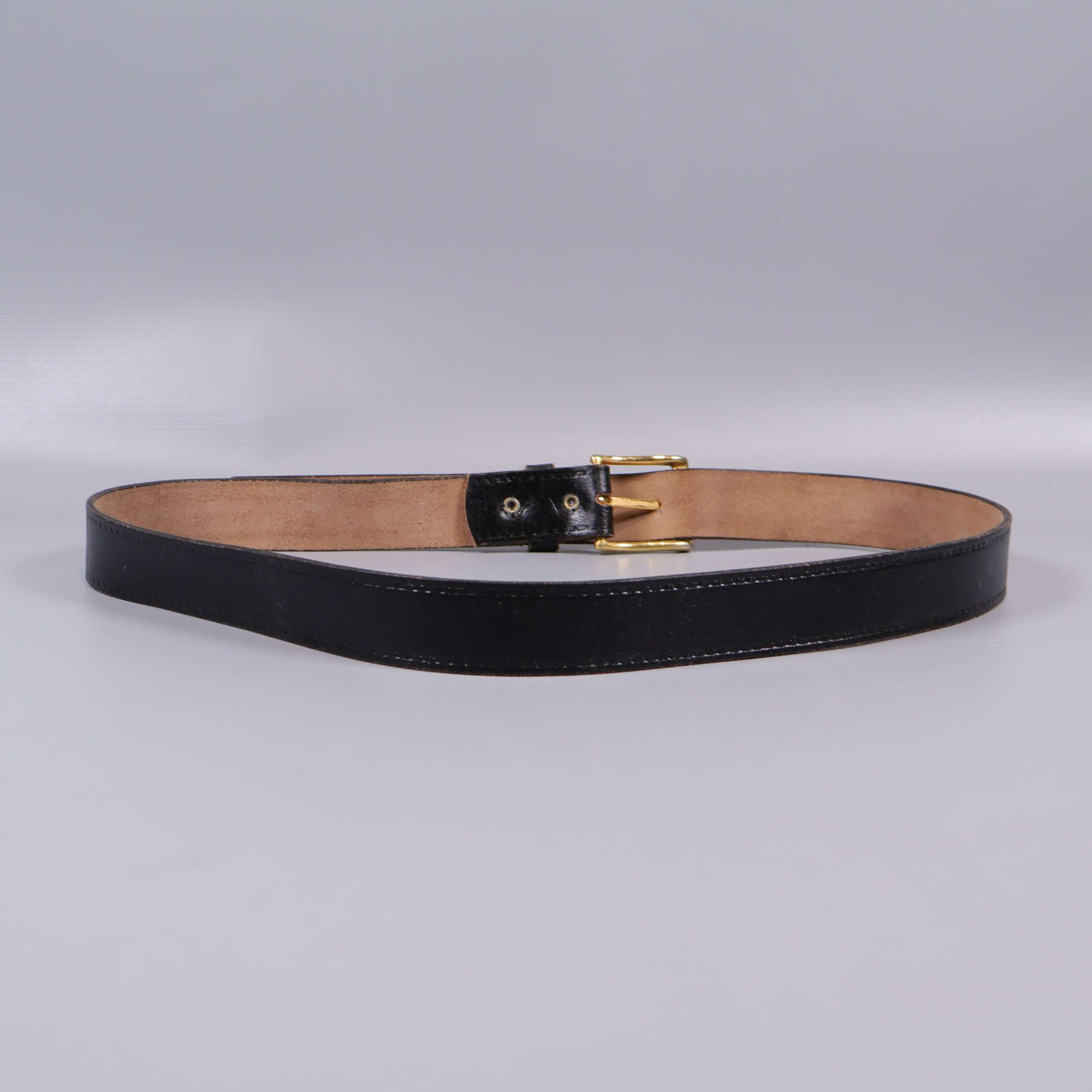 Klassiskt svart bälte med elegant guldfärgat spänne och diskret logodetalj framtill. Bältet har slät yta och tydliga sömmar längs kanterna. Insidan i naturlig läderfärg med märkning som intygar äkta läder. Passar både till vardag och dressade tillfällen.