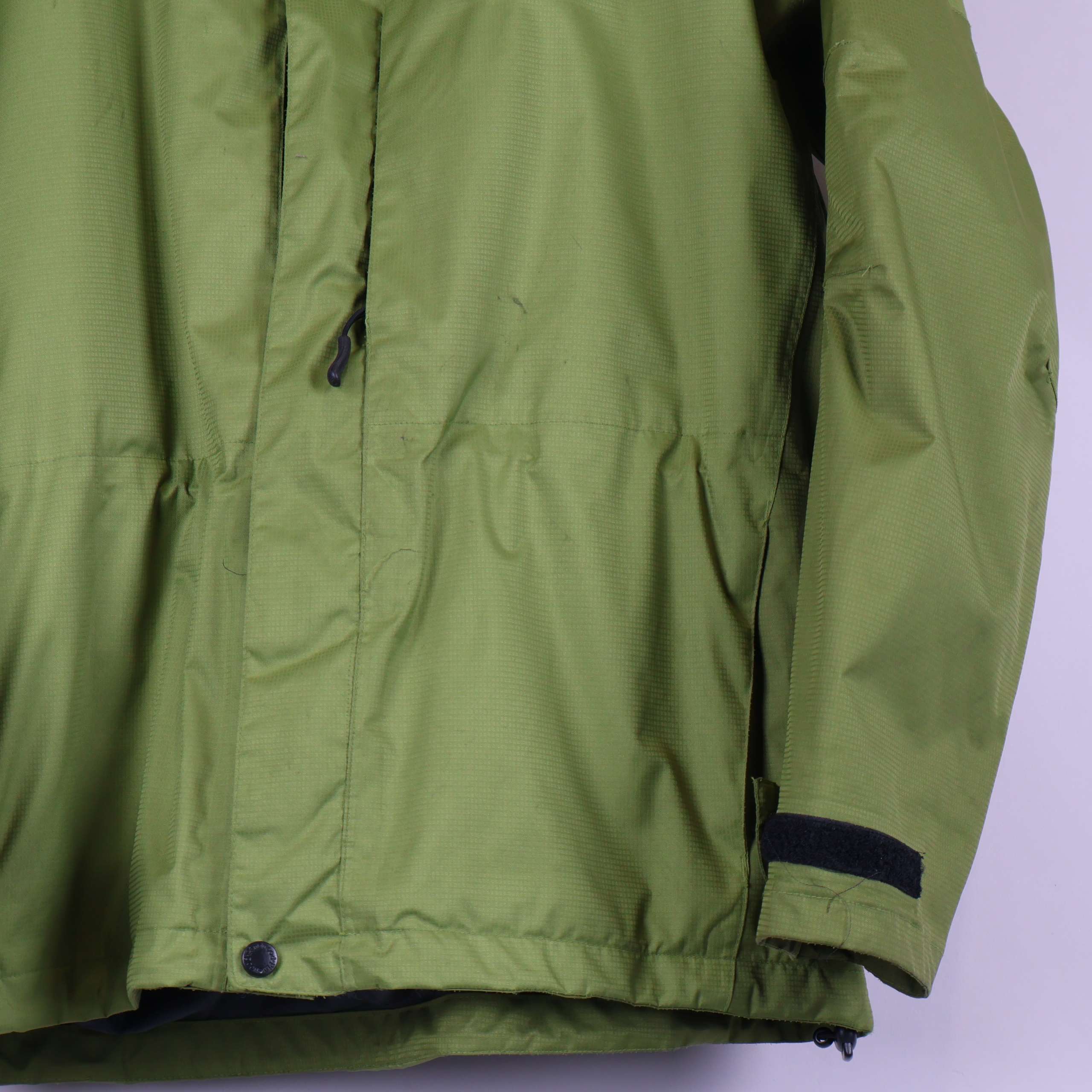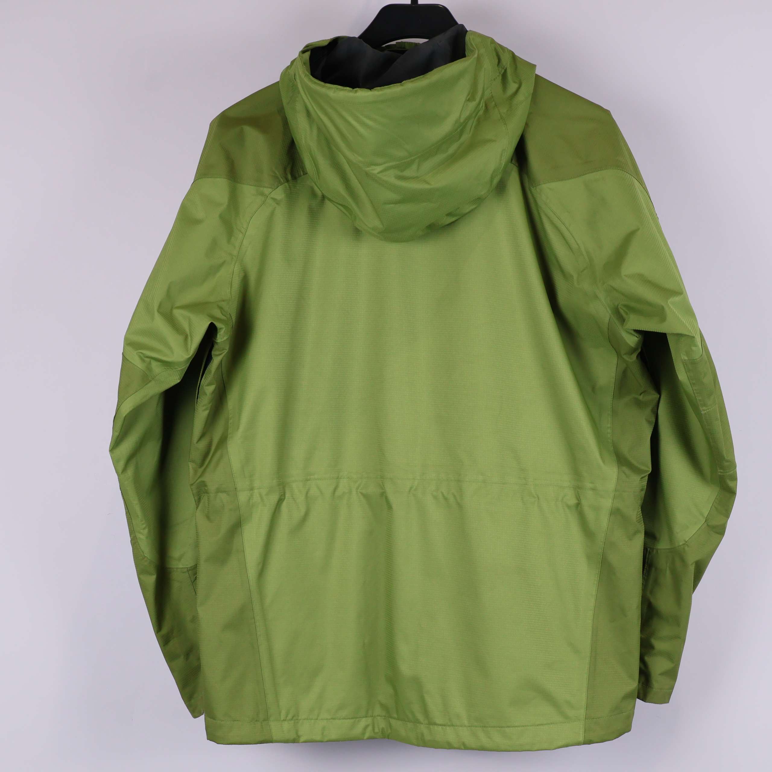 Lätt grön skaljacka med huva, justerbar dragsko vid halsen och praktiska fickor framtill. Jackan har diskreta sömmar som ger en clean look och enkel design. Jackan har små fläckar och lite slitage på framsidan.