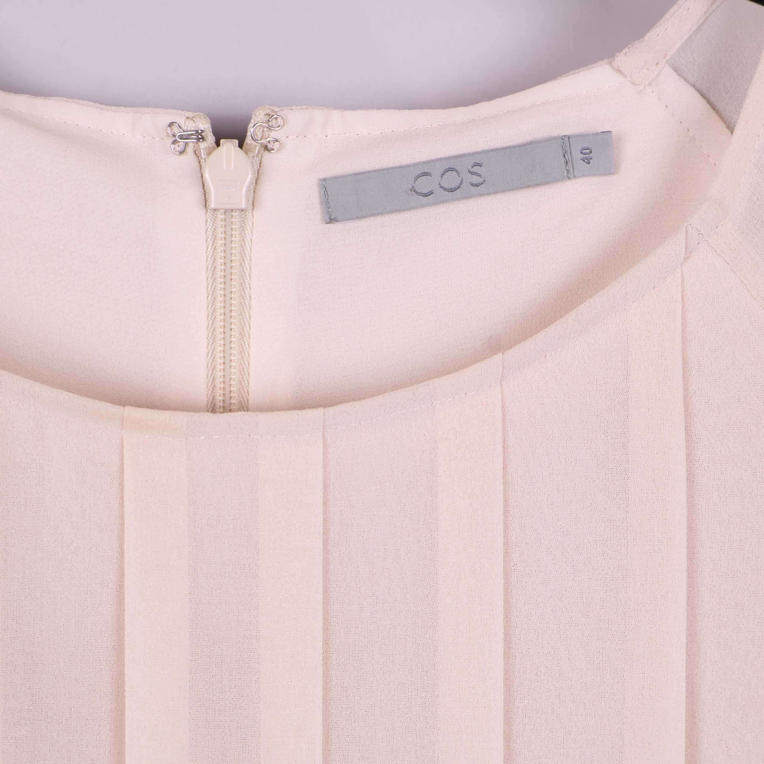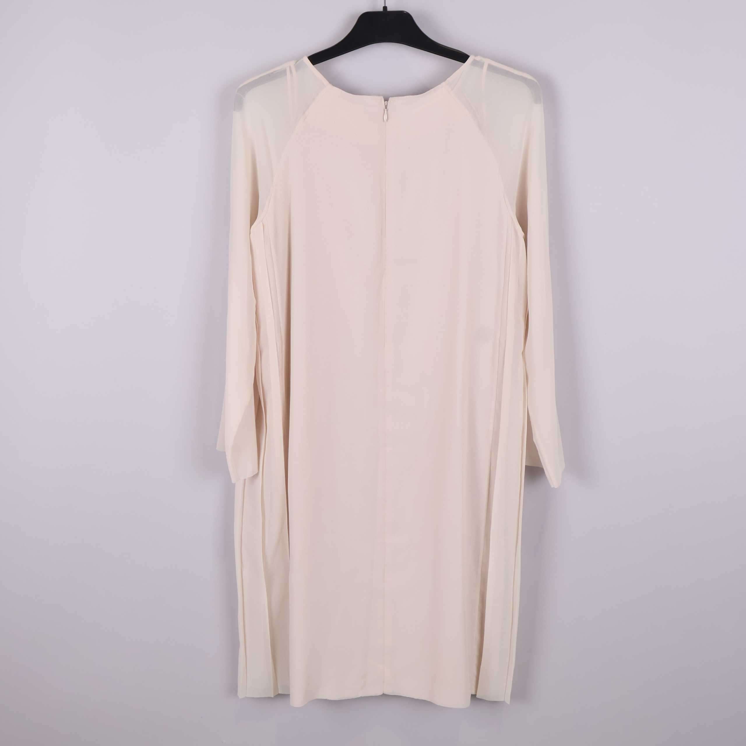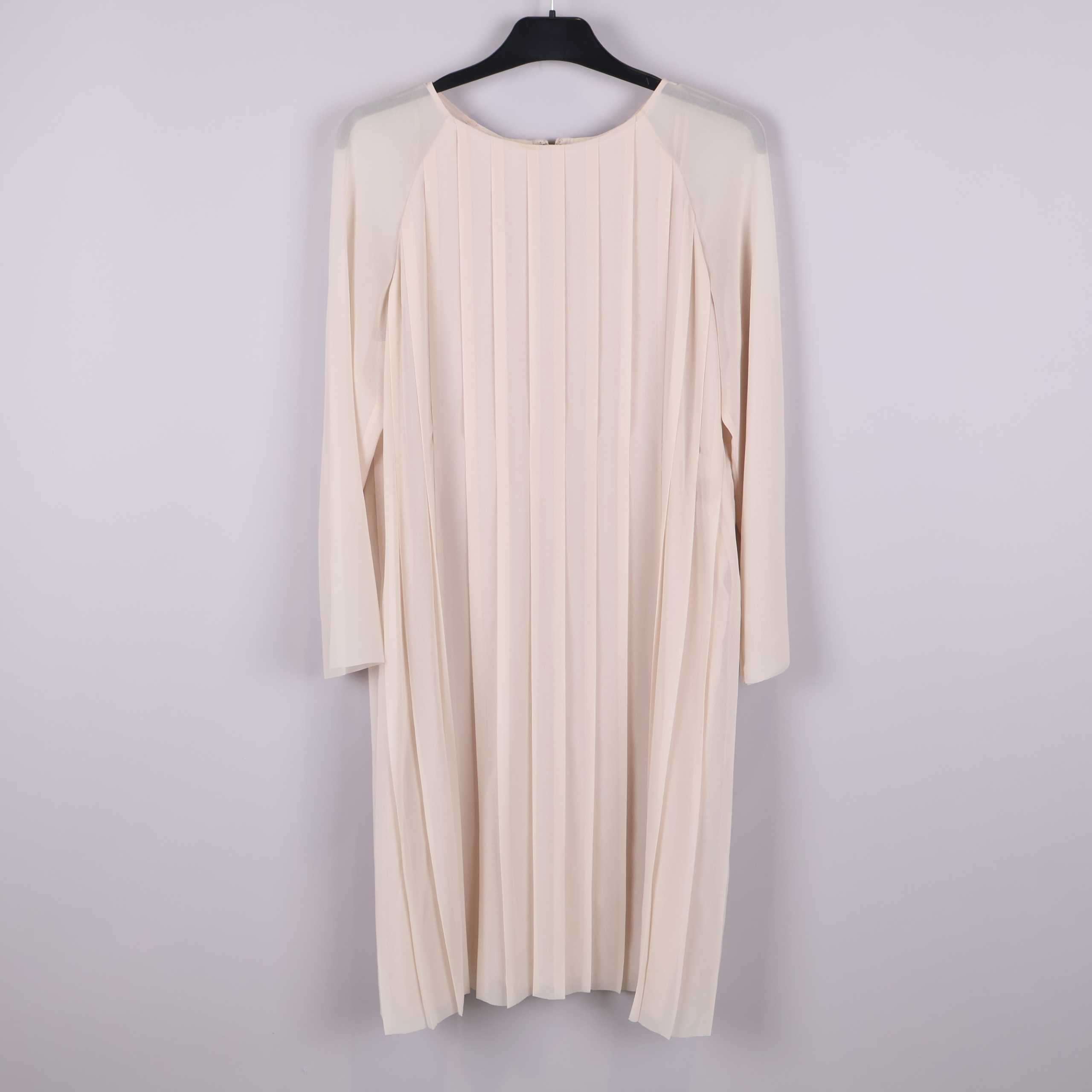 Stilren klänning med plisserad framsida i mjukt, beige tyg som draperar snyggt och ger en luftig känsla. Långa ärmar och rund halsringning gör modellen klassisk och samtidigt modern. Dragkedja bak ger en clean look samtidigt som plagget är lätt att ta på.