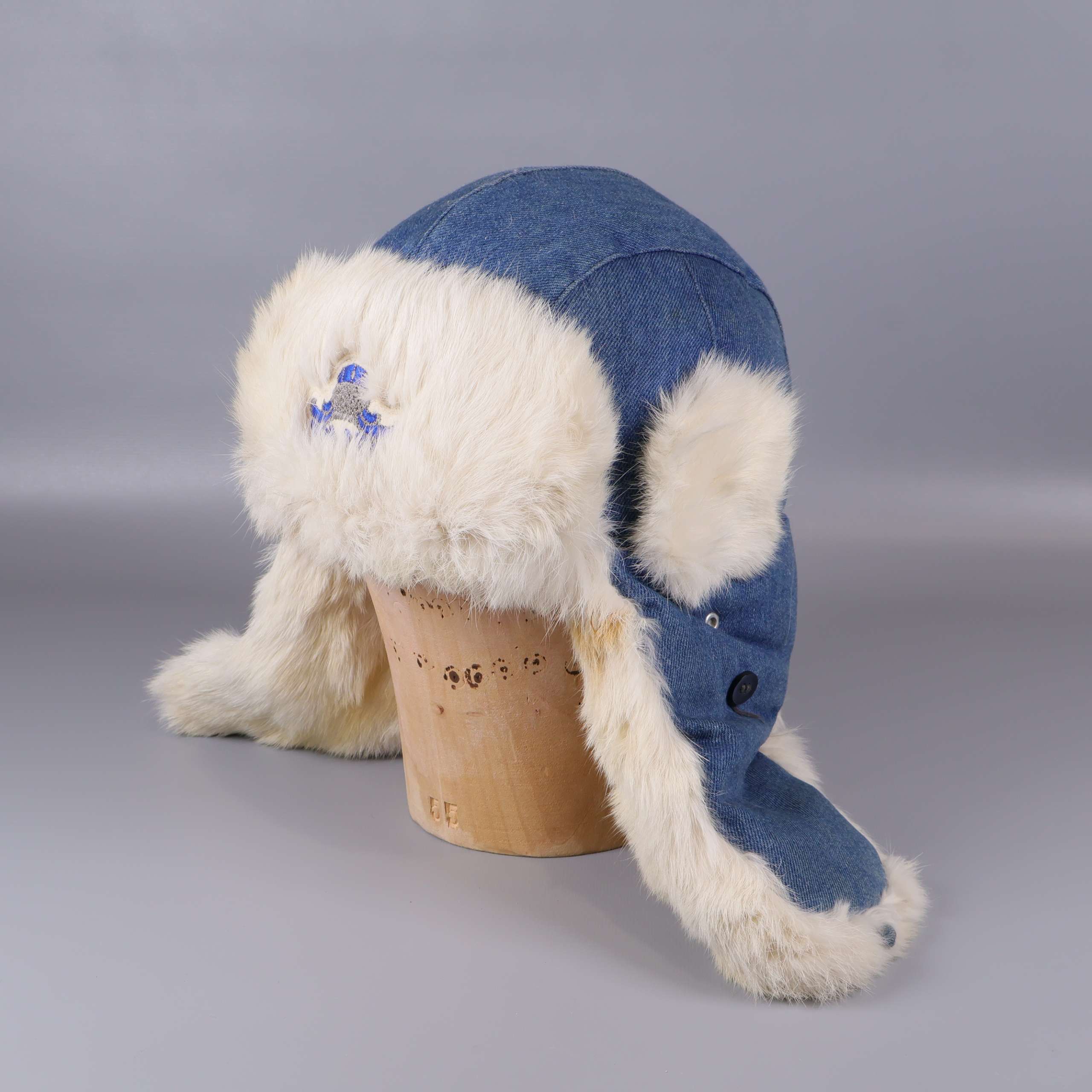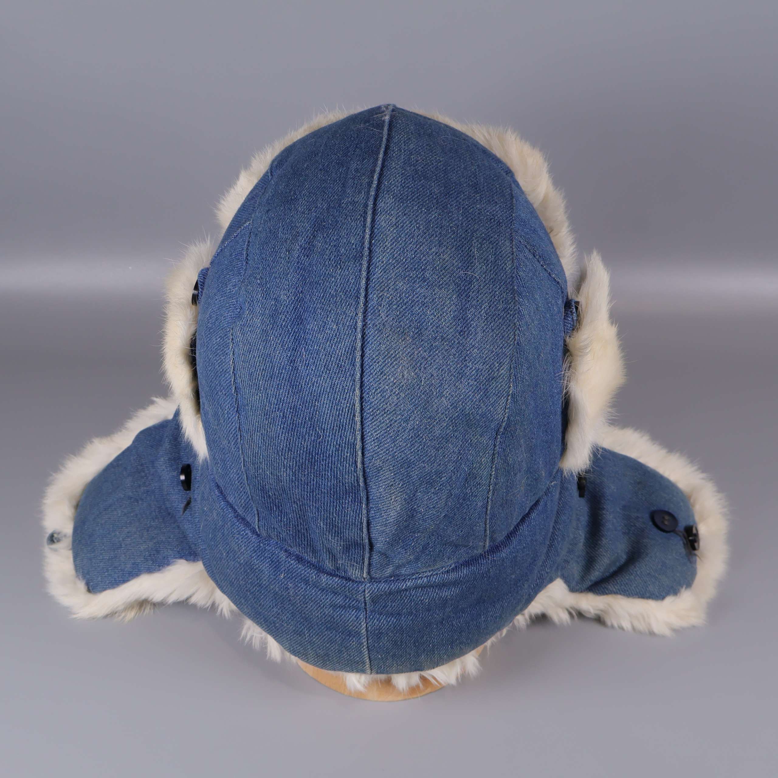 Stilren vintermössa med ovandel i denim och mjuk, ljust fuskpälsfoder runt om öron och kant. Designen har praktiska öronlappar som kan vikas upp eller ner och fästs med tryckknappar. Broderad logga framtill i blått ger mössan en unik touch. Trendig accessoar för kalla dagar med klassisk vinterkänsla.