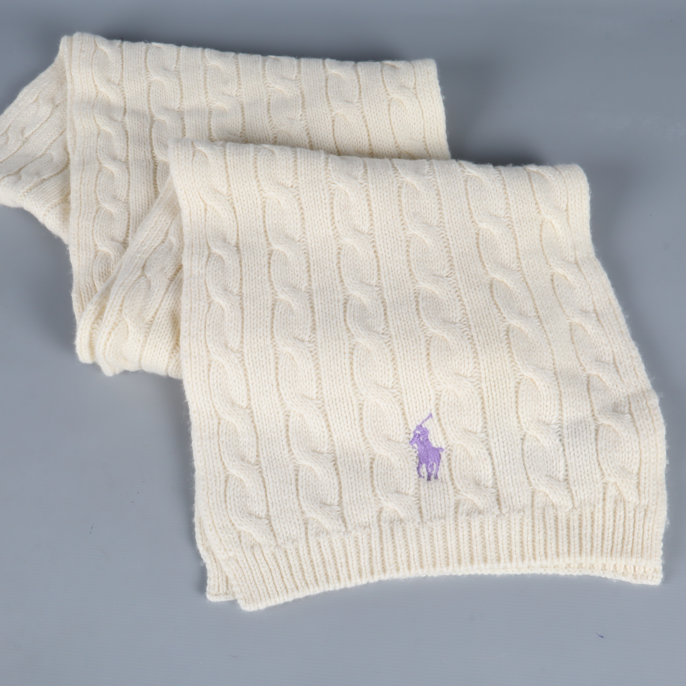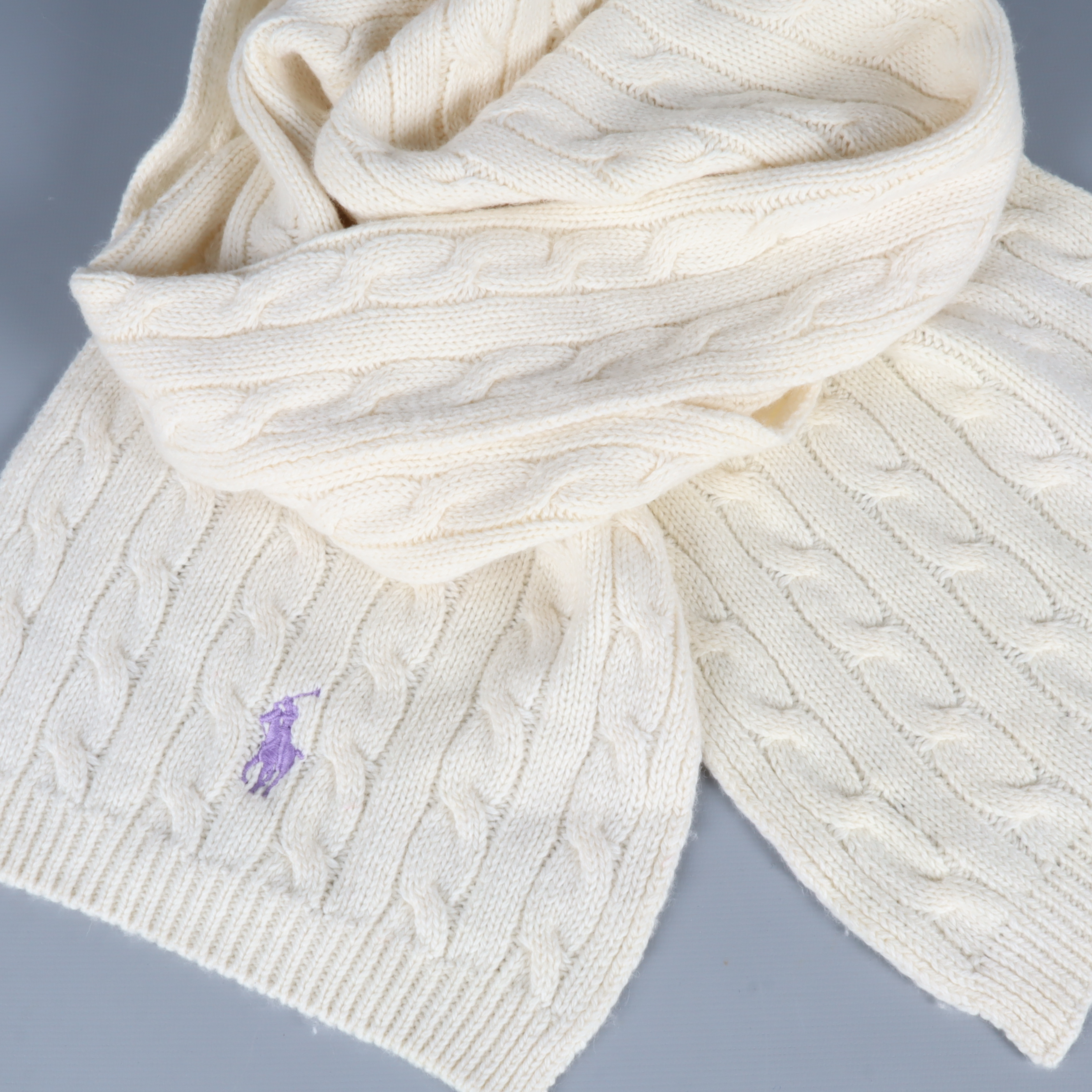 Mjuk kabelstickad halsduk i naturvit nyans med klassisk struktur och broderad logotyp i lila. Stickningen ger en tidlös och ombonad känsla som passar lika bra till vardag som till lite mer dressade looks. Tydlig märkesetikett och elegant form för en stilren look.