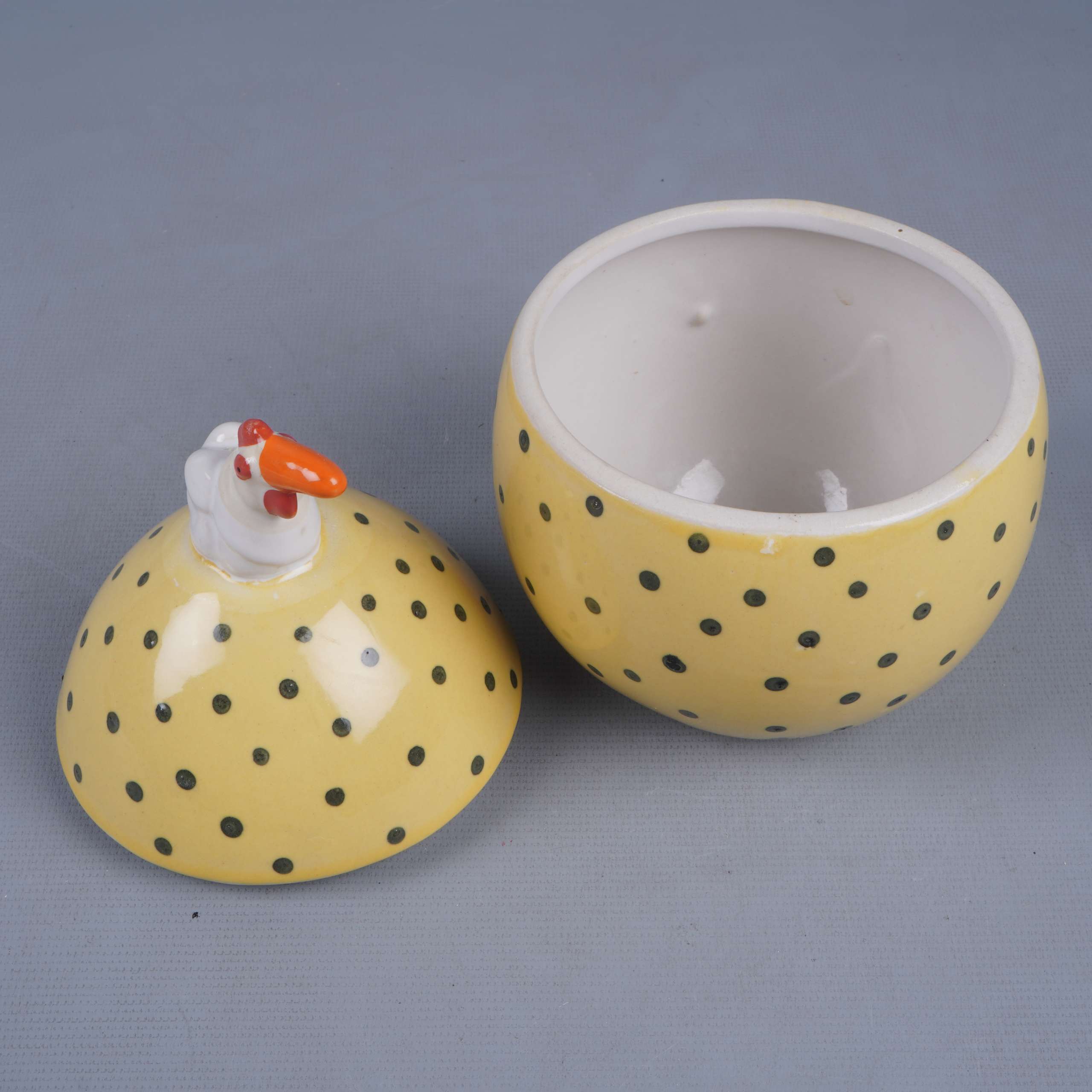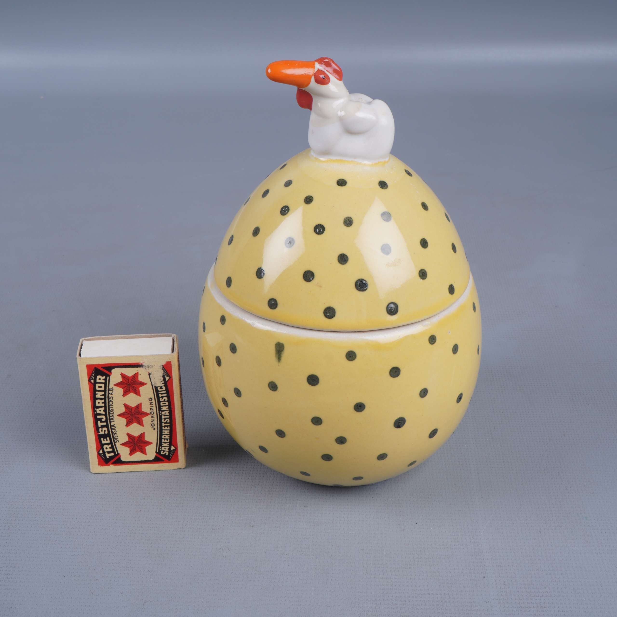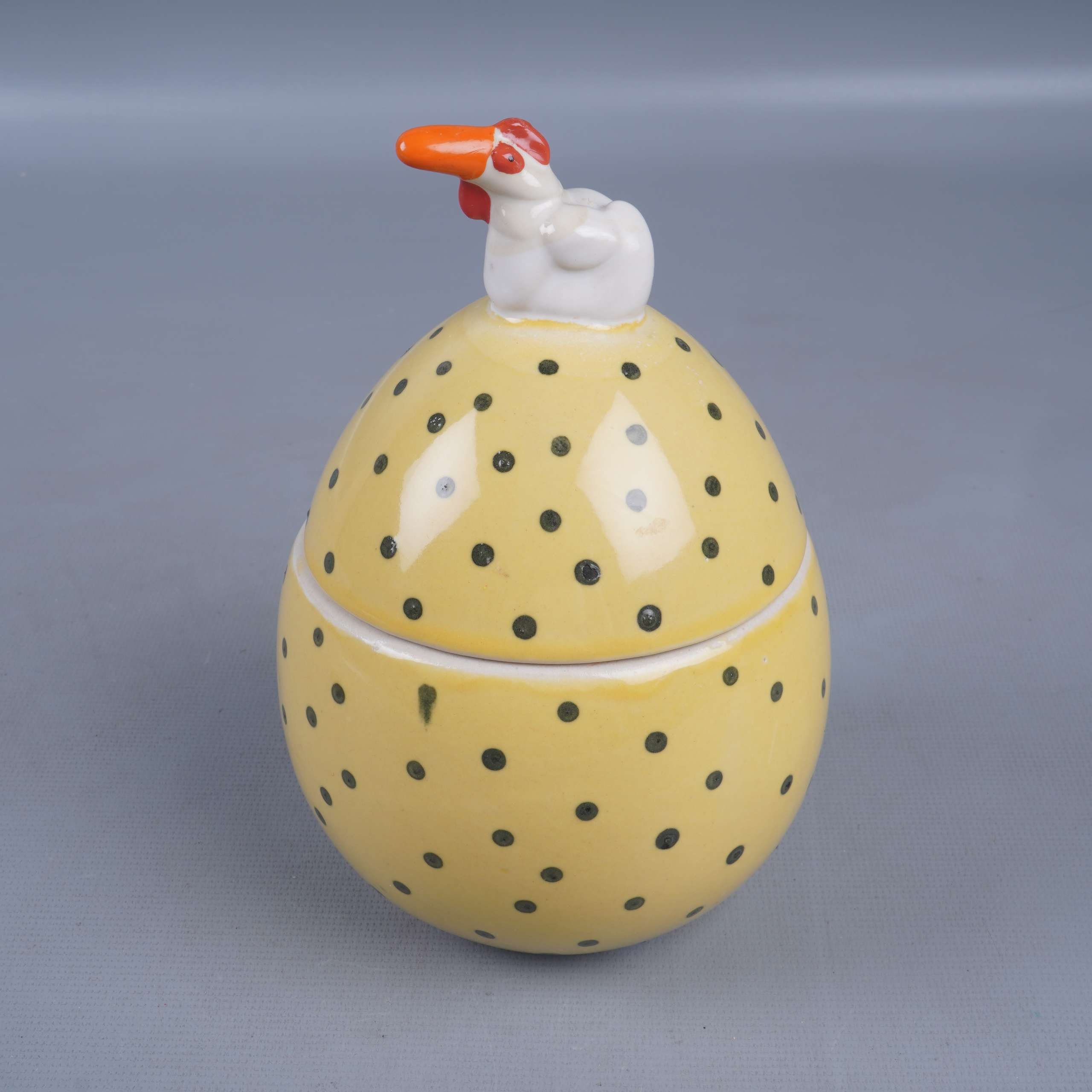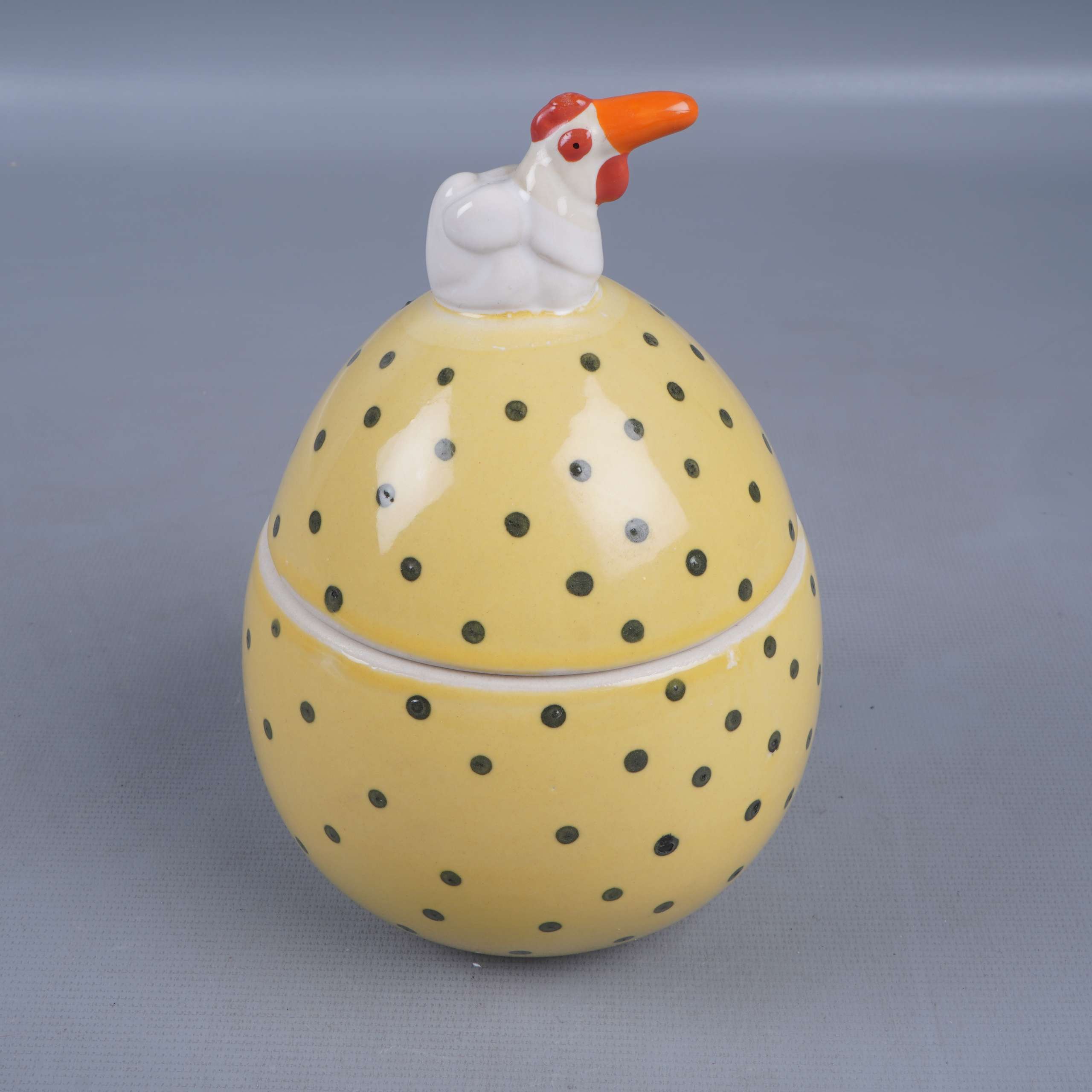 En lekfull keramisk burk i äggform med svarta prickar och en charmig höna på locket. Perfekt för att skapa en glad känsla i köket eller på påskbordet. Båda delarna är glaserade med en blank finish.