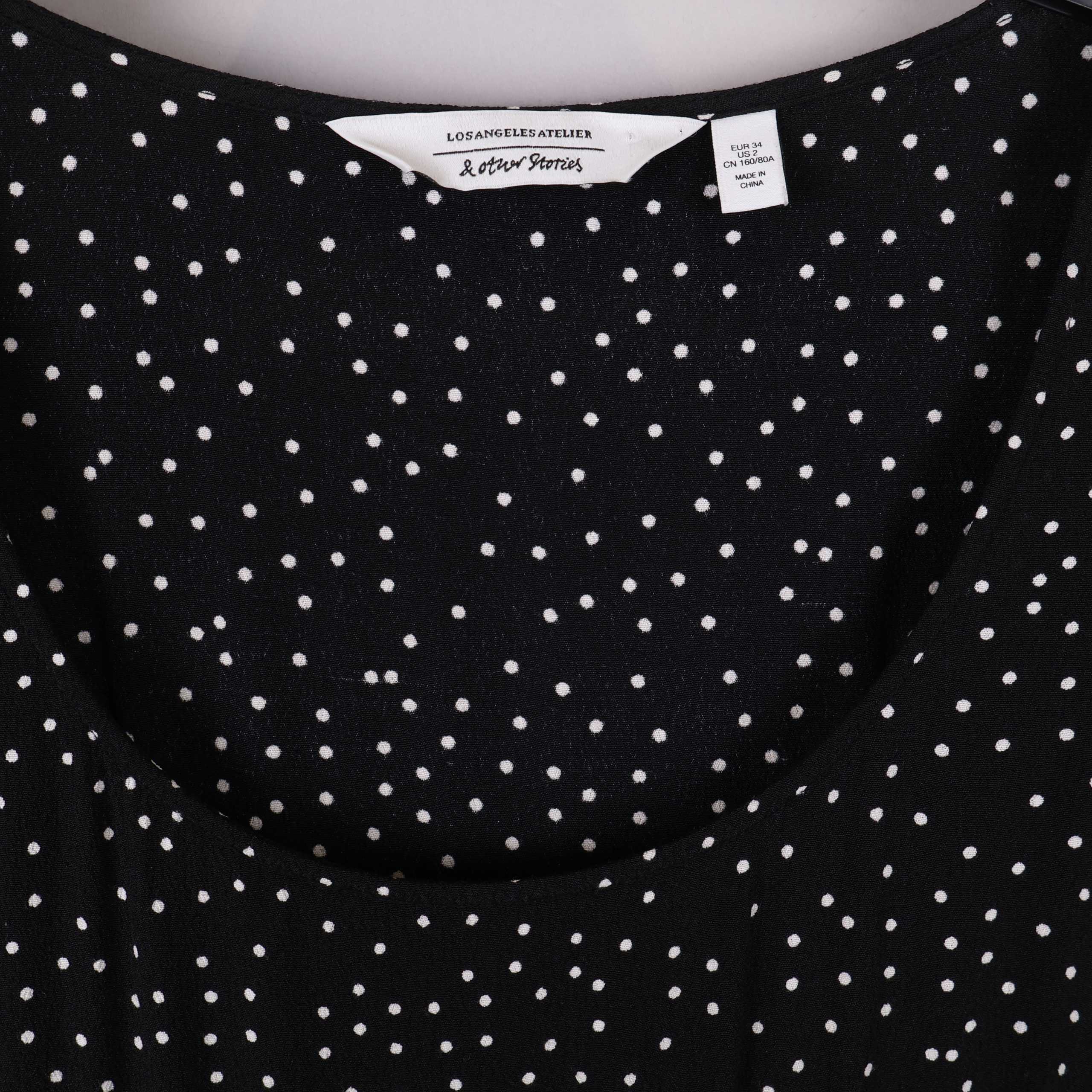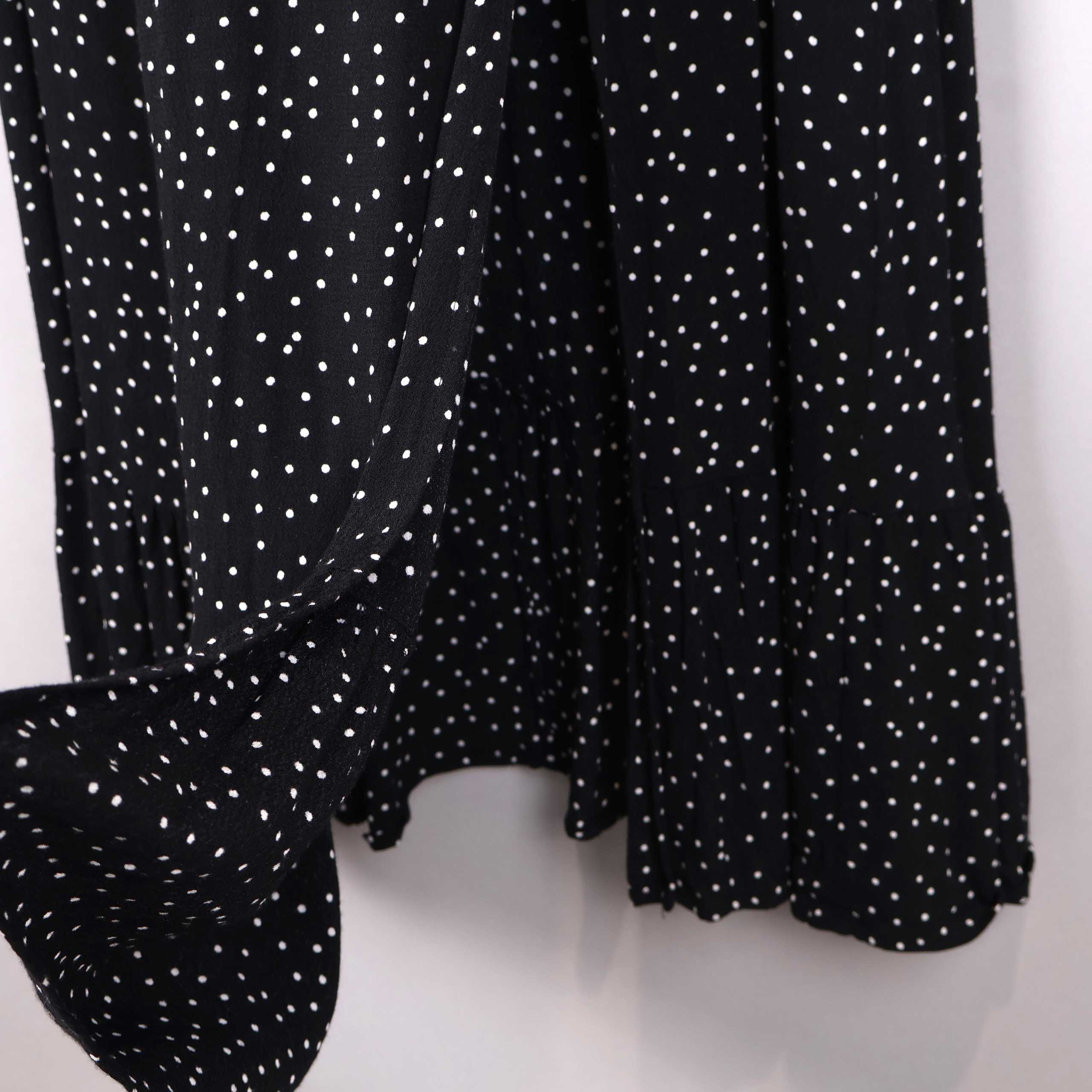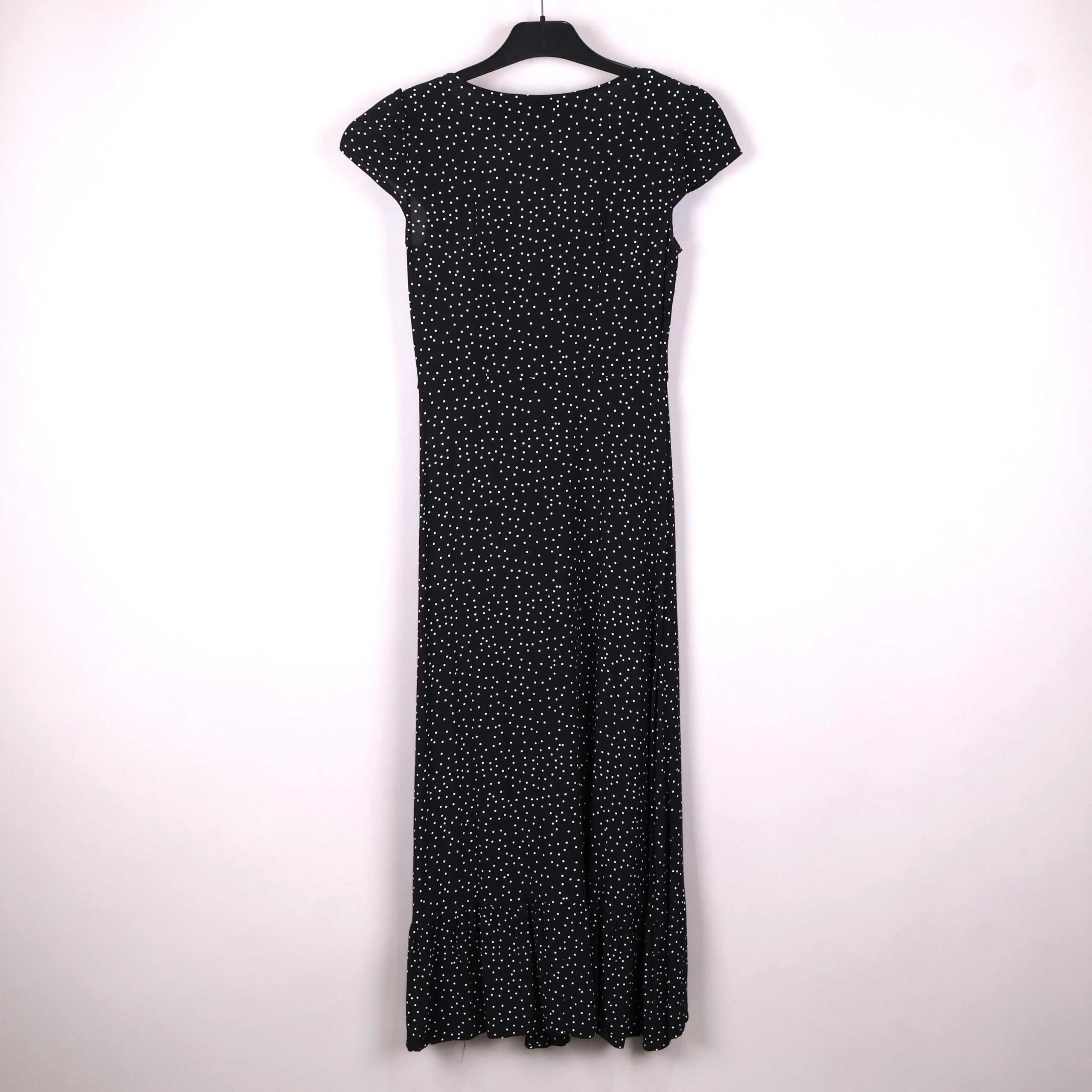 Klänning med korta ärmar och ett lekfullt prickigt mönster mot en svart bakgrund. Kjolen faller vackert och ger en flödande rörelse.