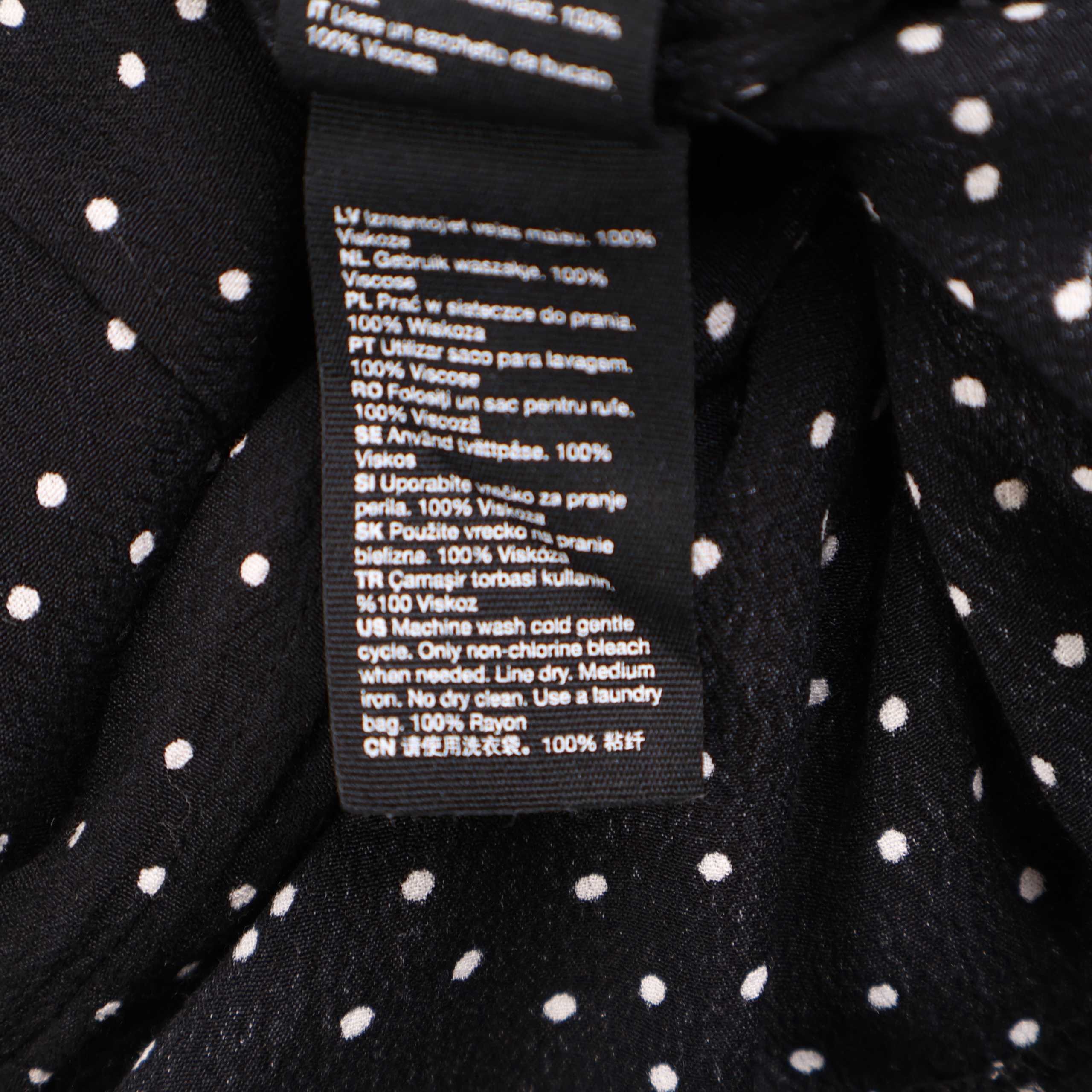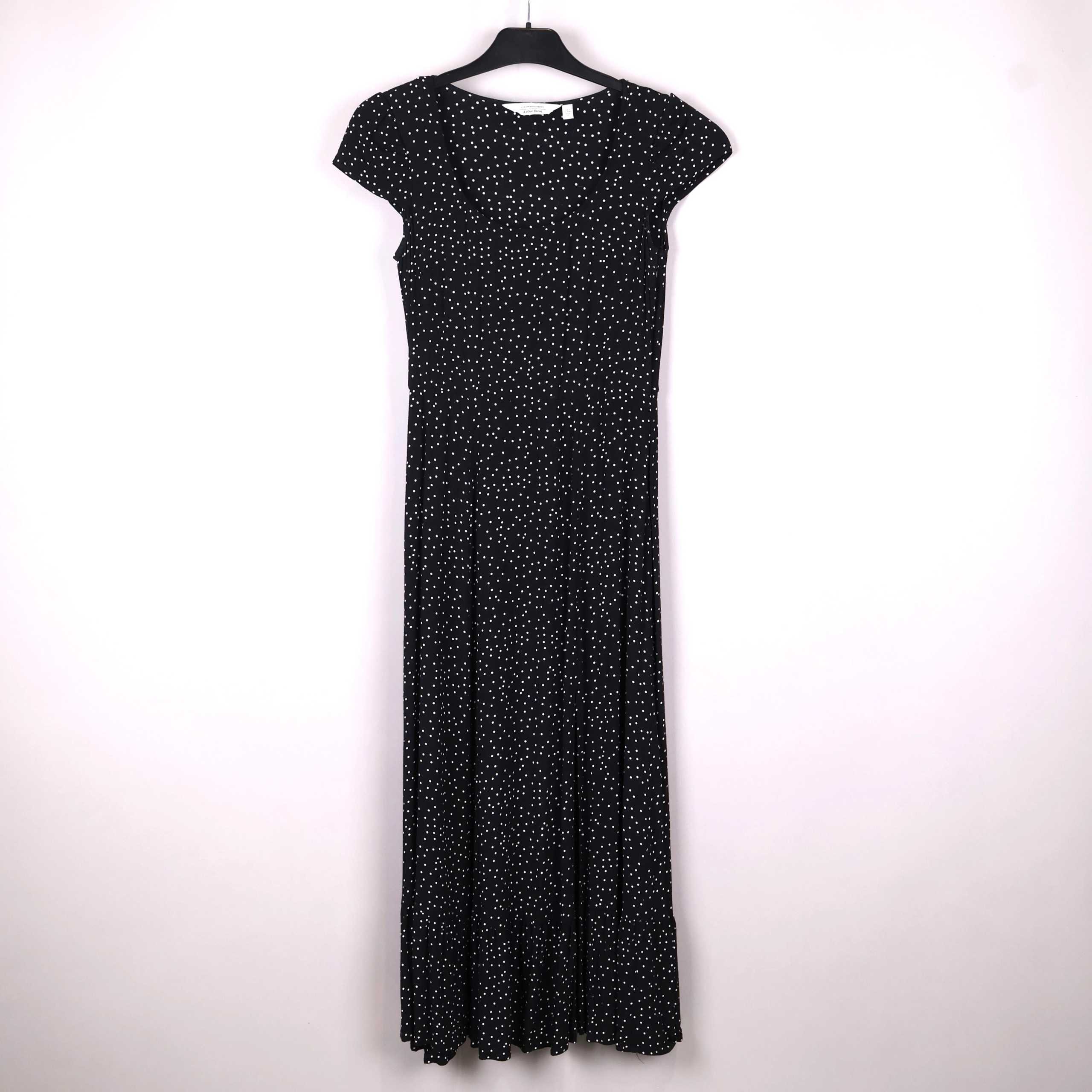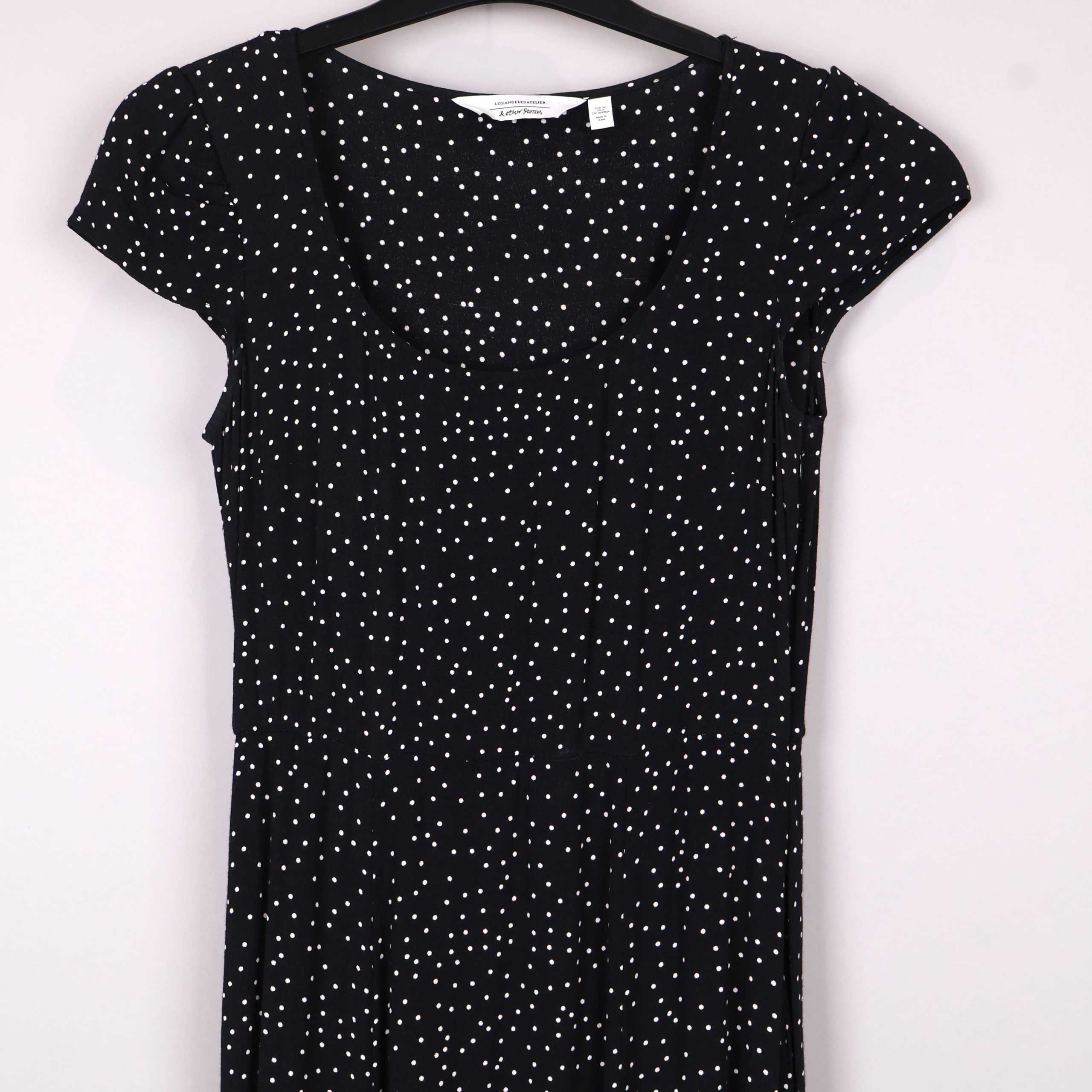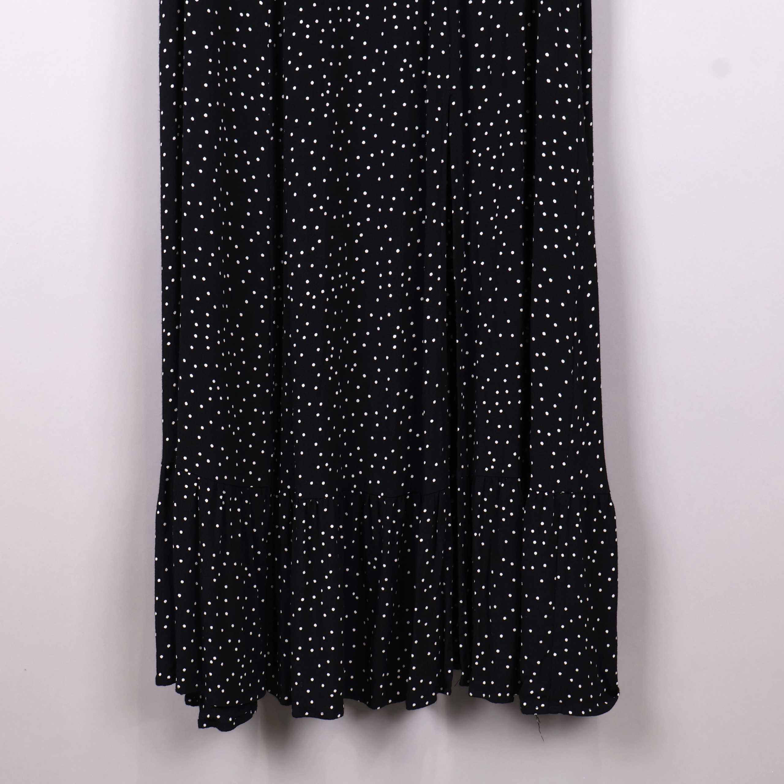 Klänning med korta ärmar och ett lekfullt prickigt mönster mot en svart bakgrund. Kjolen faller vackert och ger en flödande rörelse.