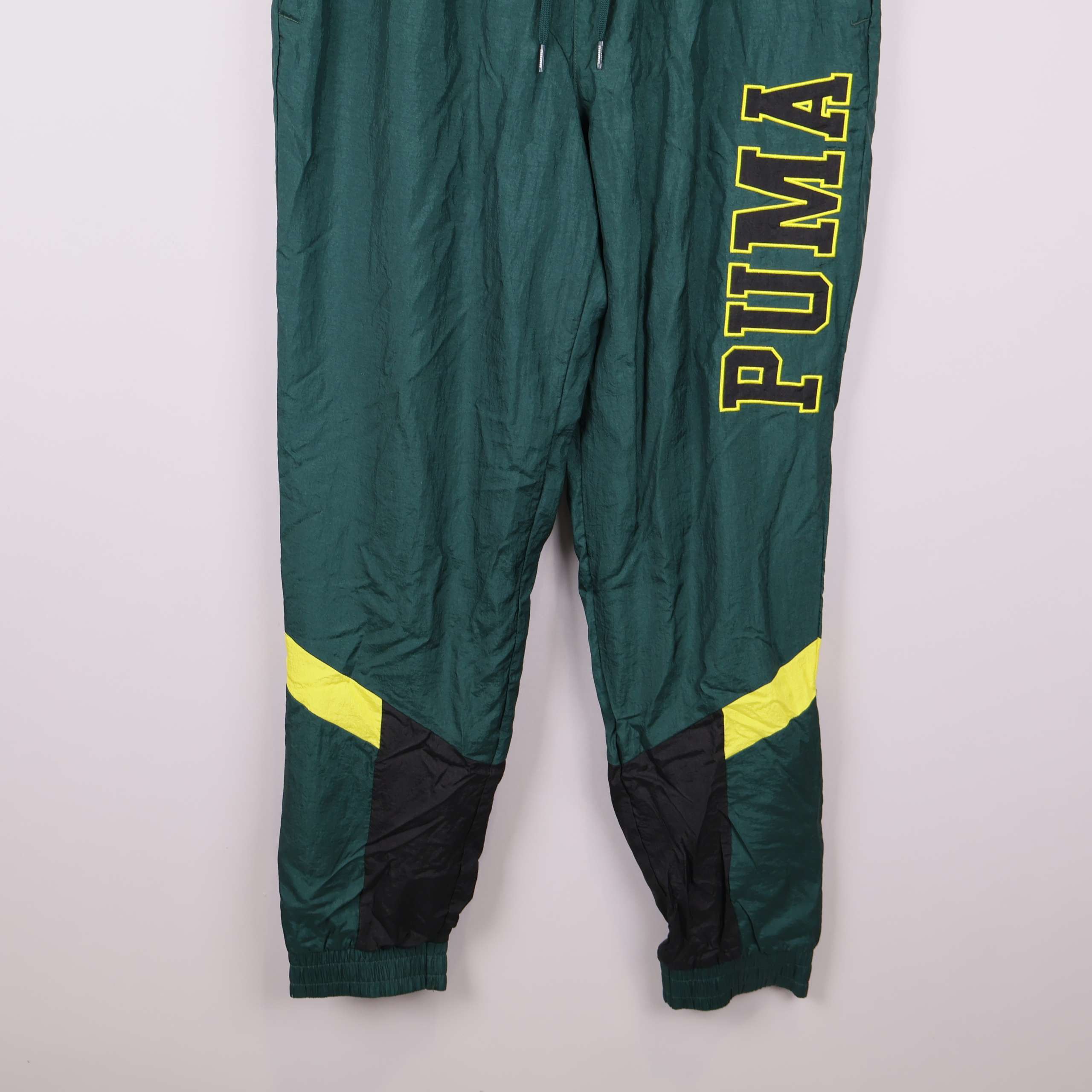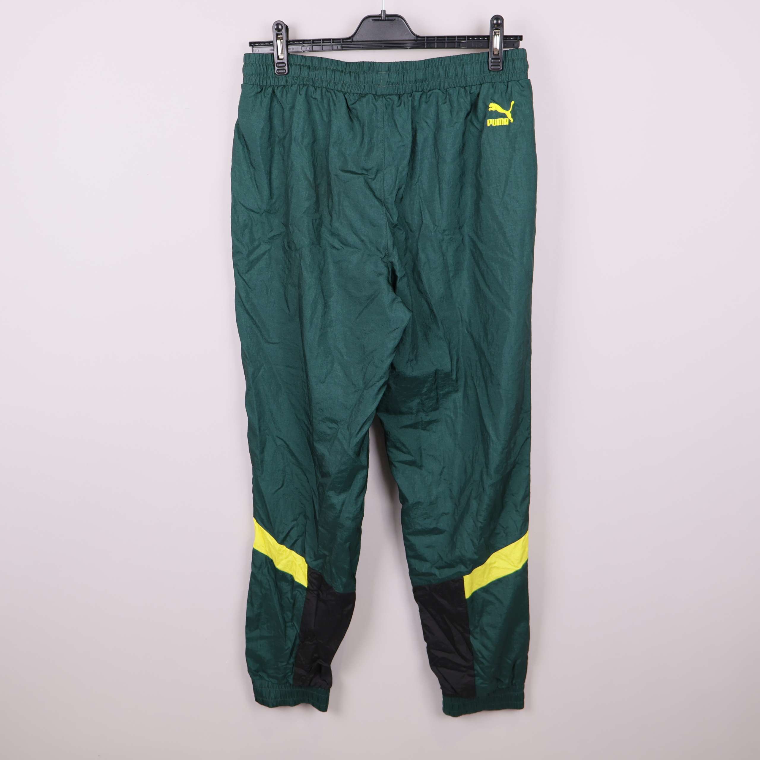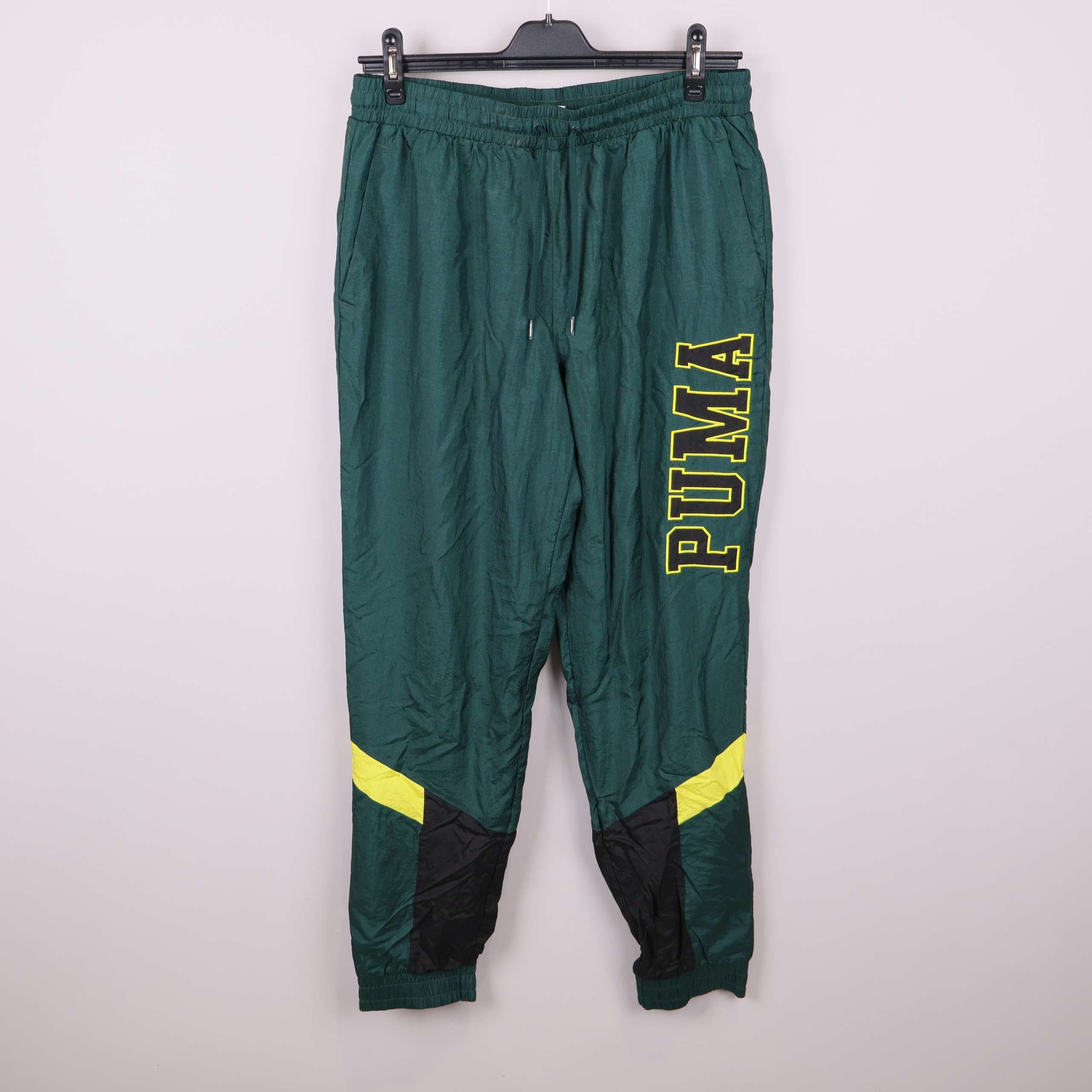 Sportiga byxor i grön färg med tydligt PUMA-tryck på benet och svarta samt gula detaljer. Elastisk midja med dragsko och bekvämt meshfoder ger en relaxed fit. Perfekta för en aktiv och avslappnad stil med praktiska fickor samt resår vid benslut.