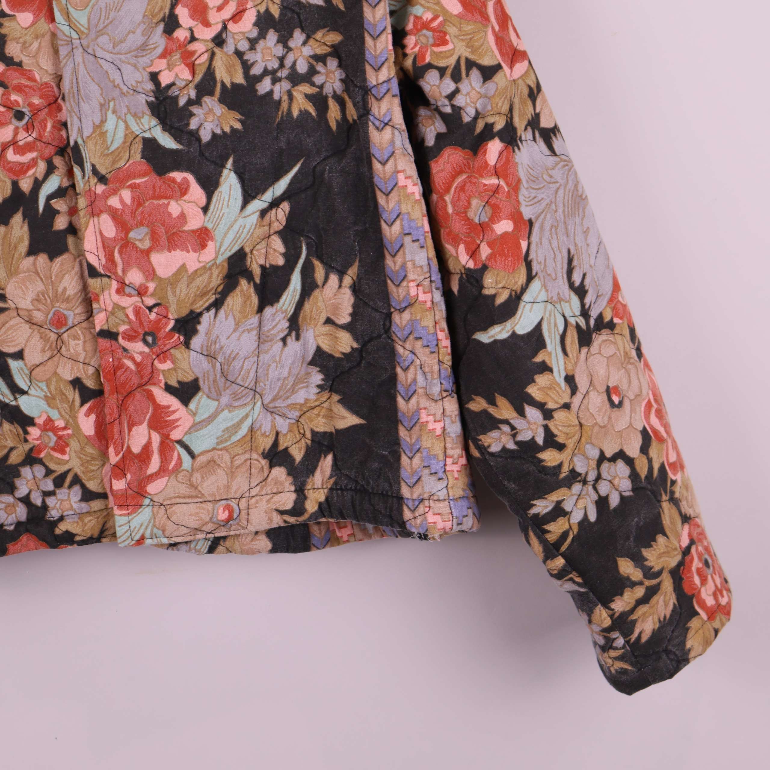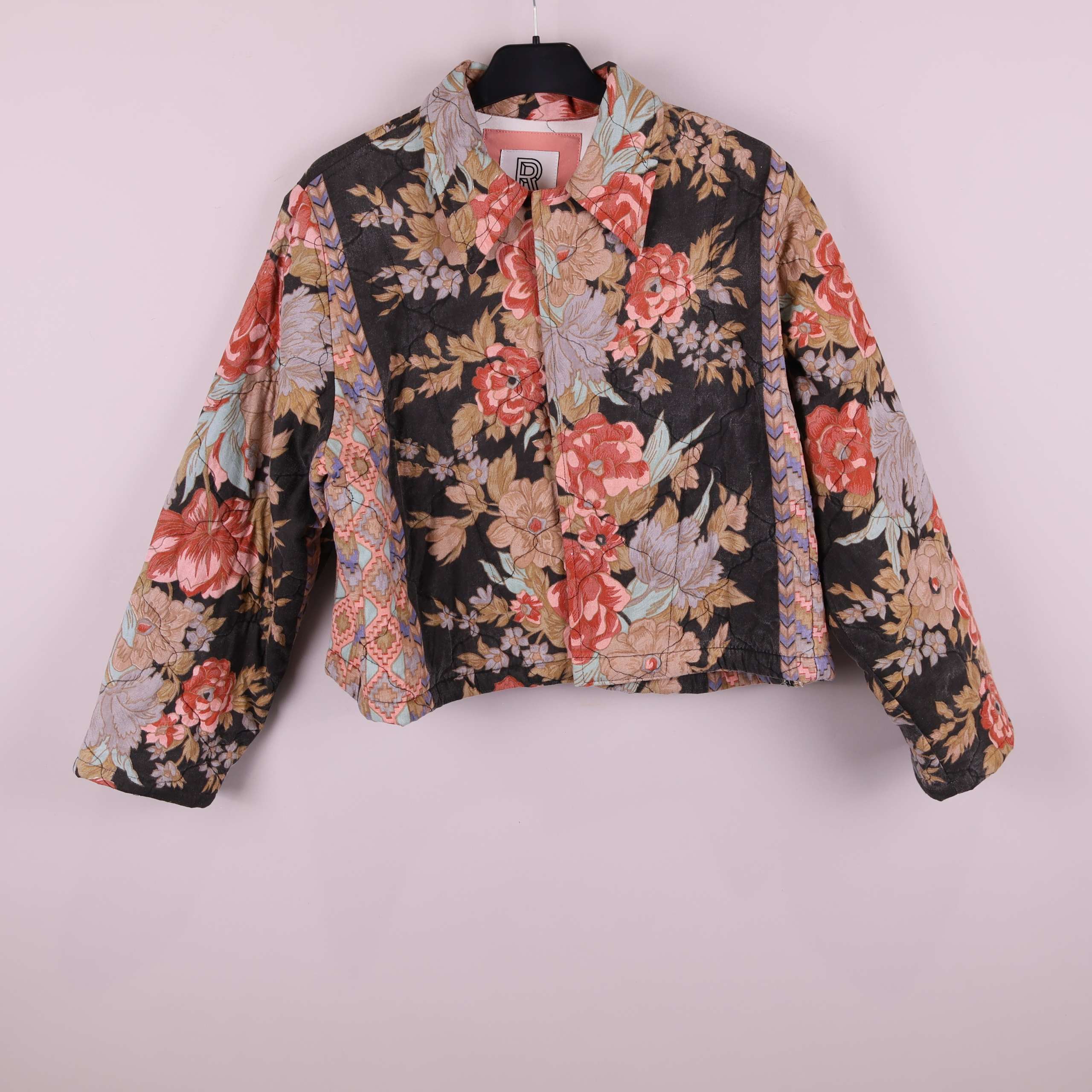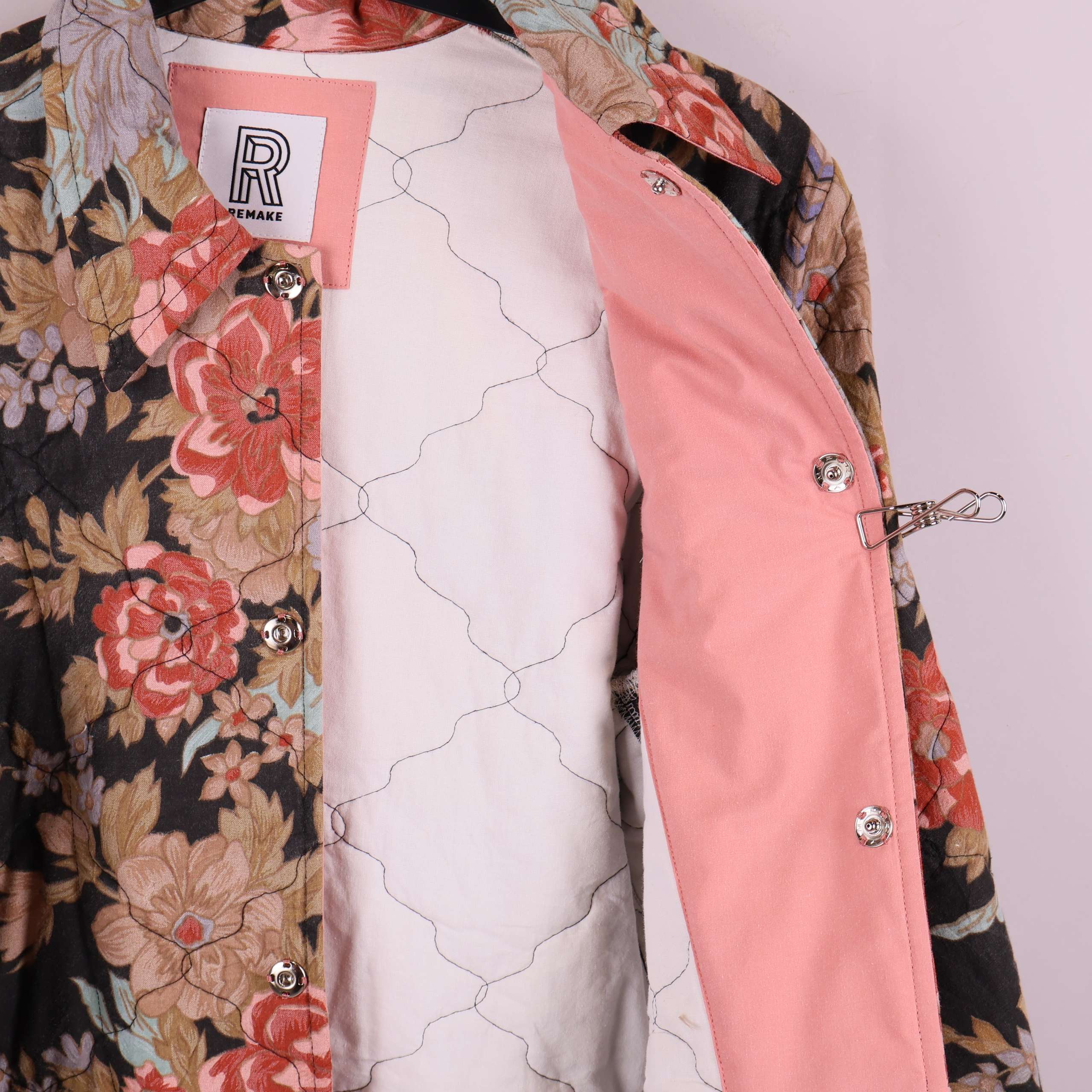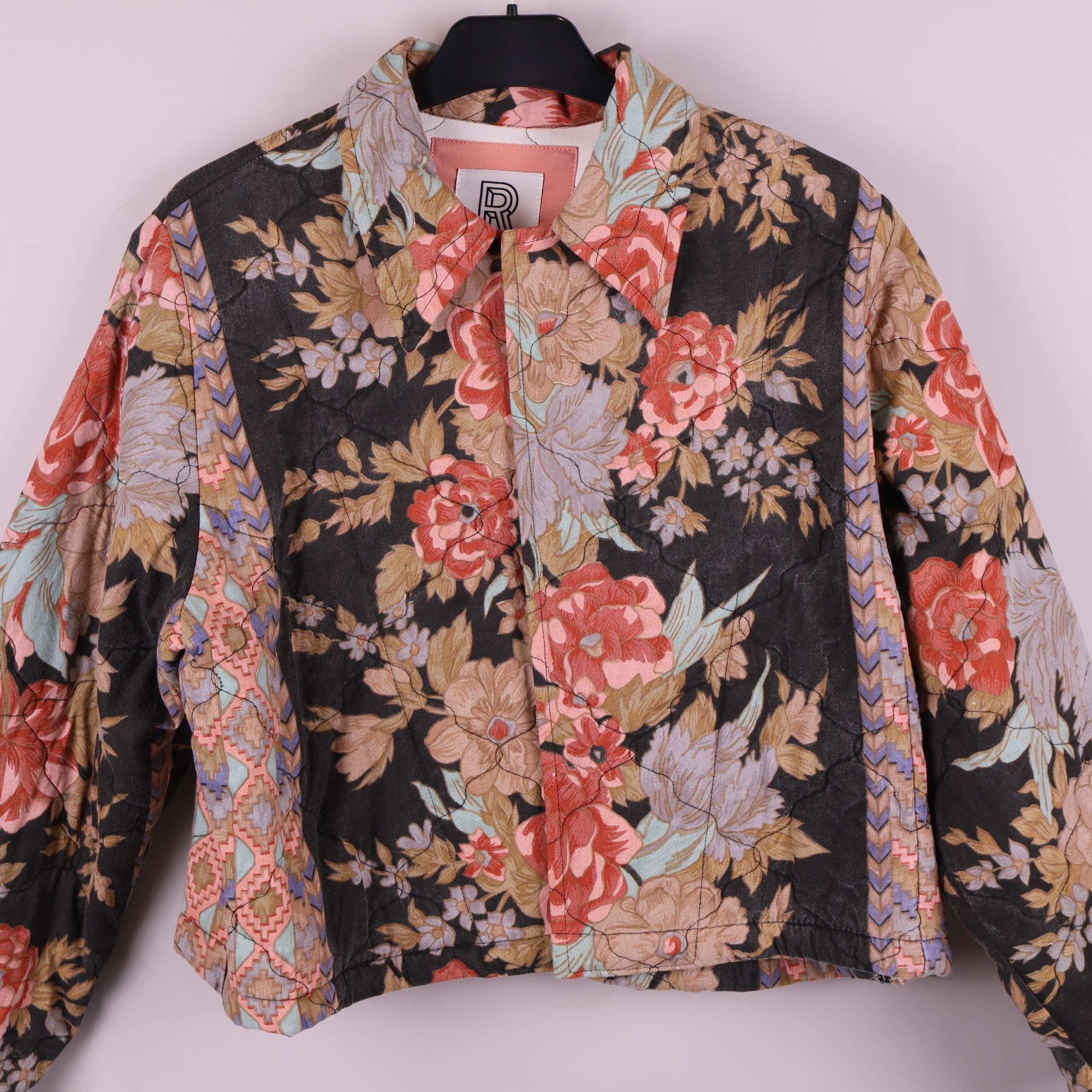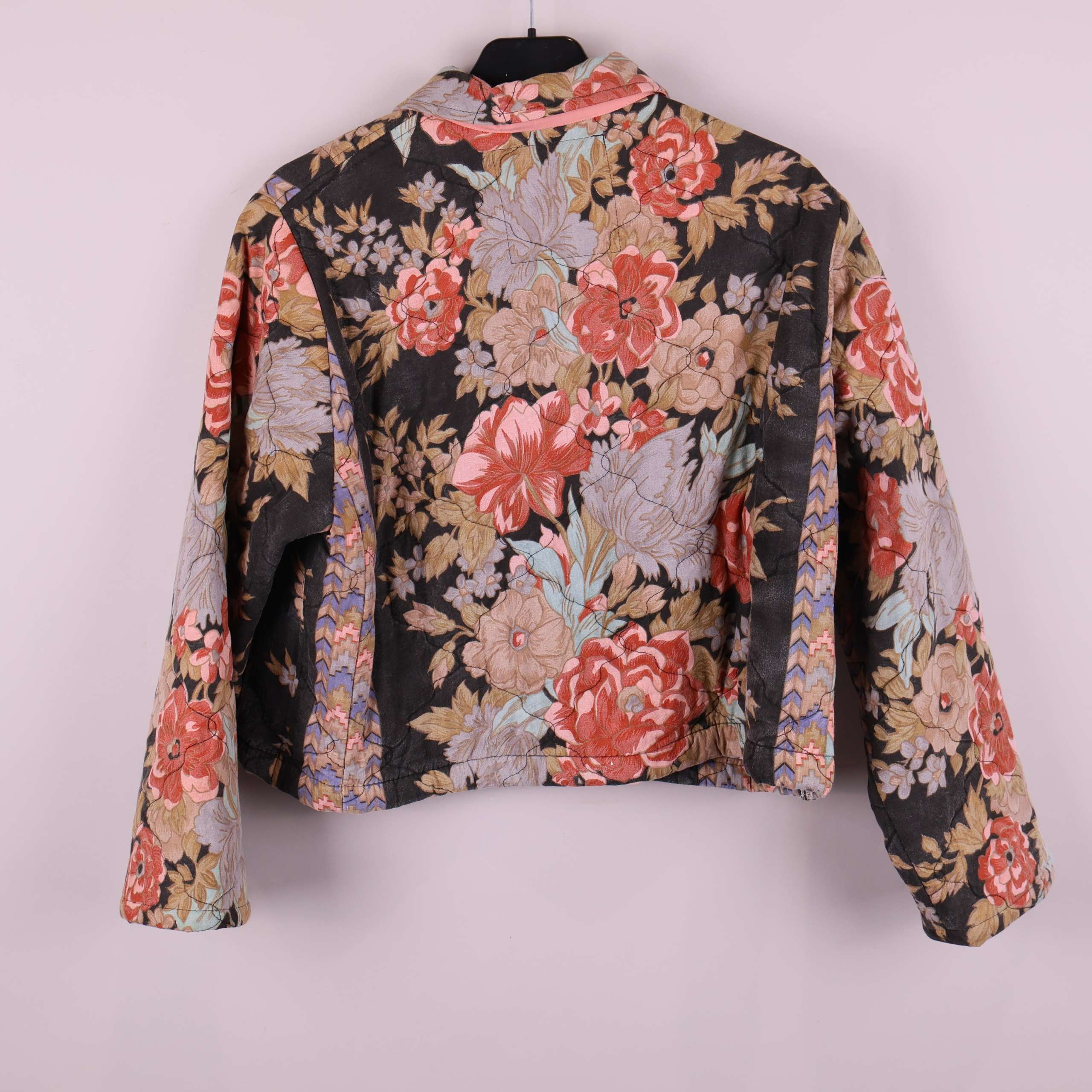 Jacket Mika from quilted bedthrow, crafted from fabric donated to Stockholms Stadsmission. Each piece is carefully cut, featuring two front pockets and a collar. The design is straight, hip-length, and fastens with snap buttons at the front.