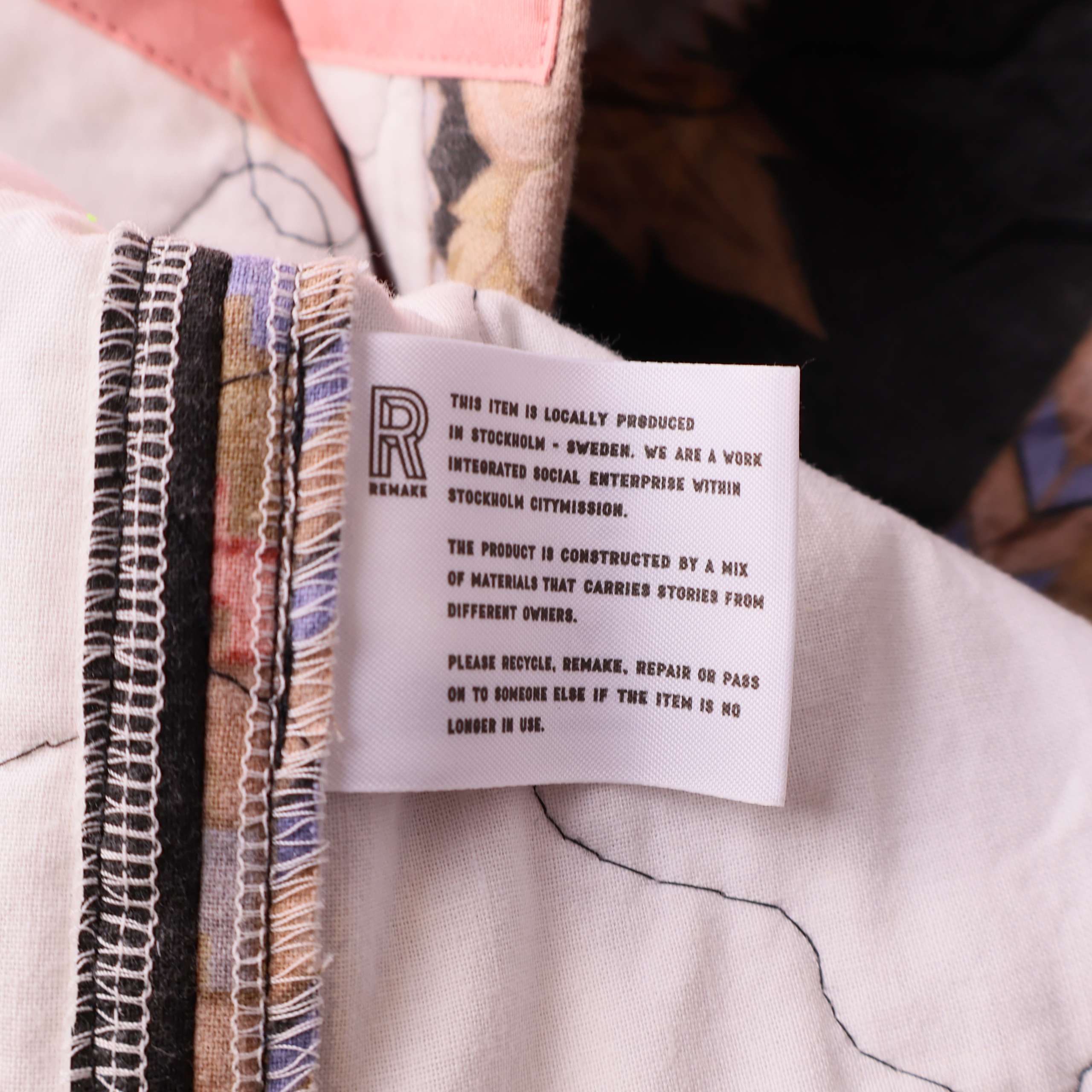 Jackan Mika av quiltat överkast, sydd av donerat material till Stockholms Stadsmission. Varje modell är noggrant tillskuren med krage och två framfickor. Modellen är rak, höftlång och den stängs med tryckknappar fram.