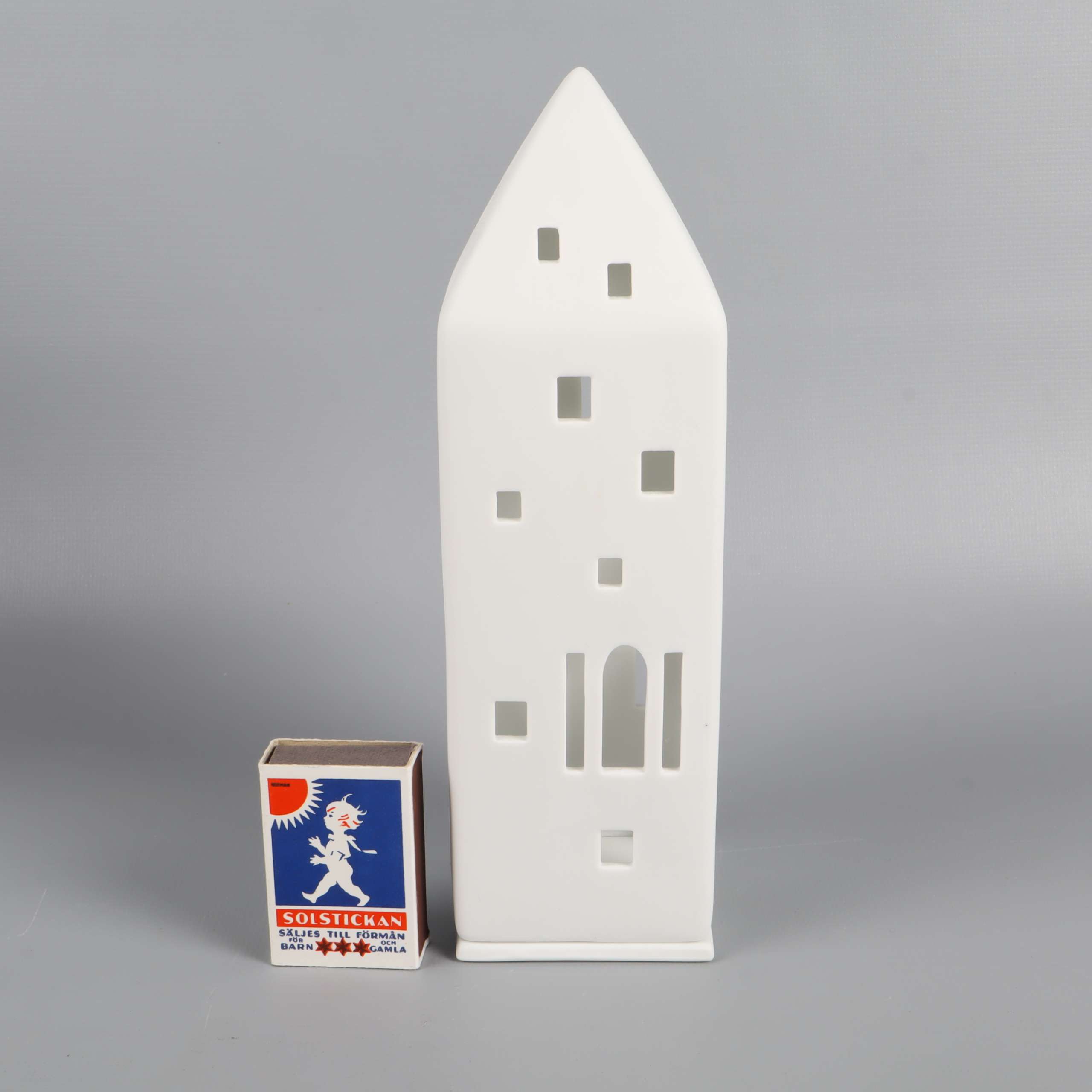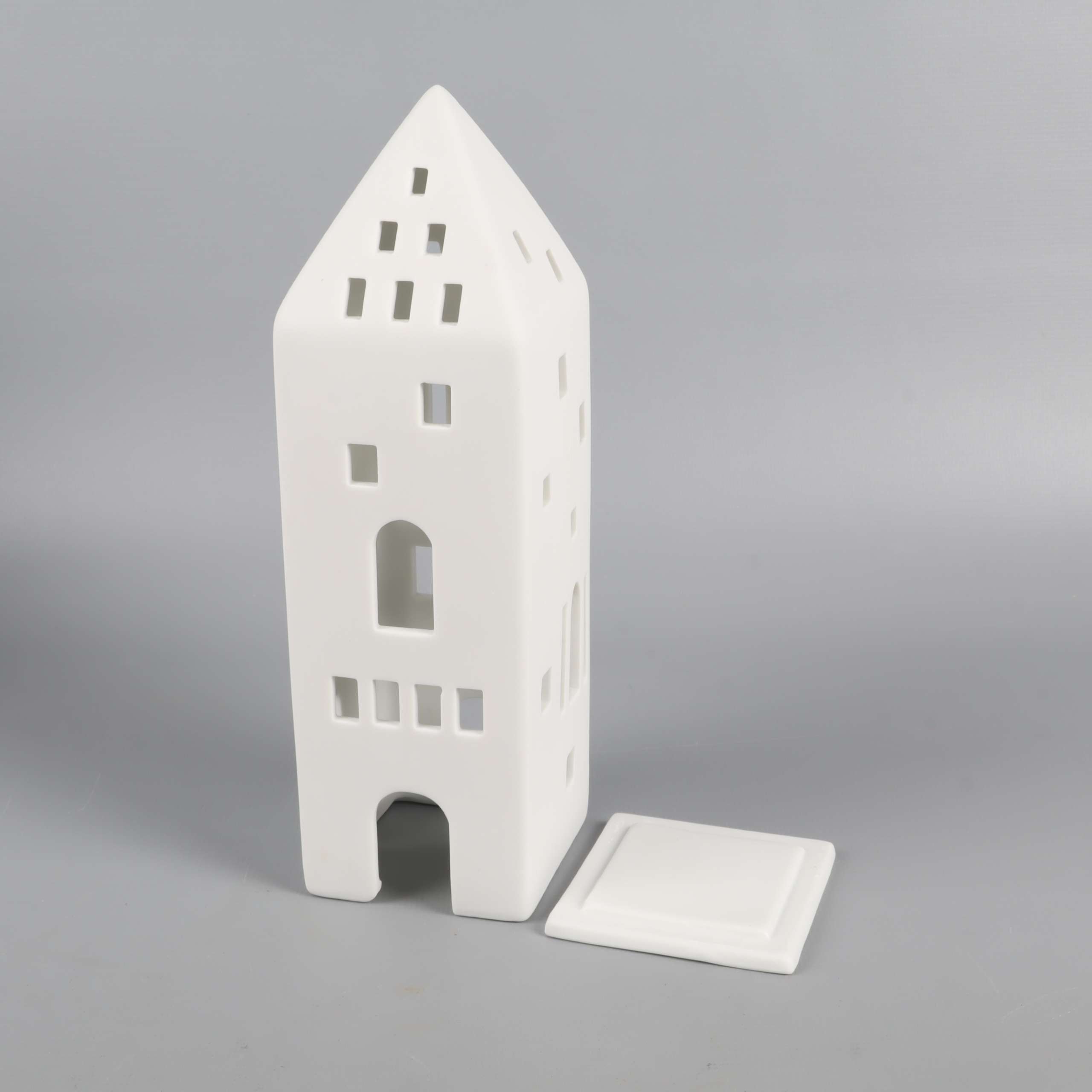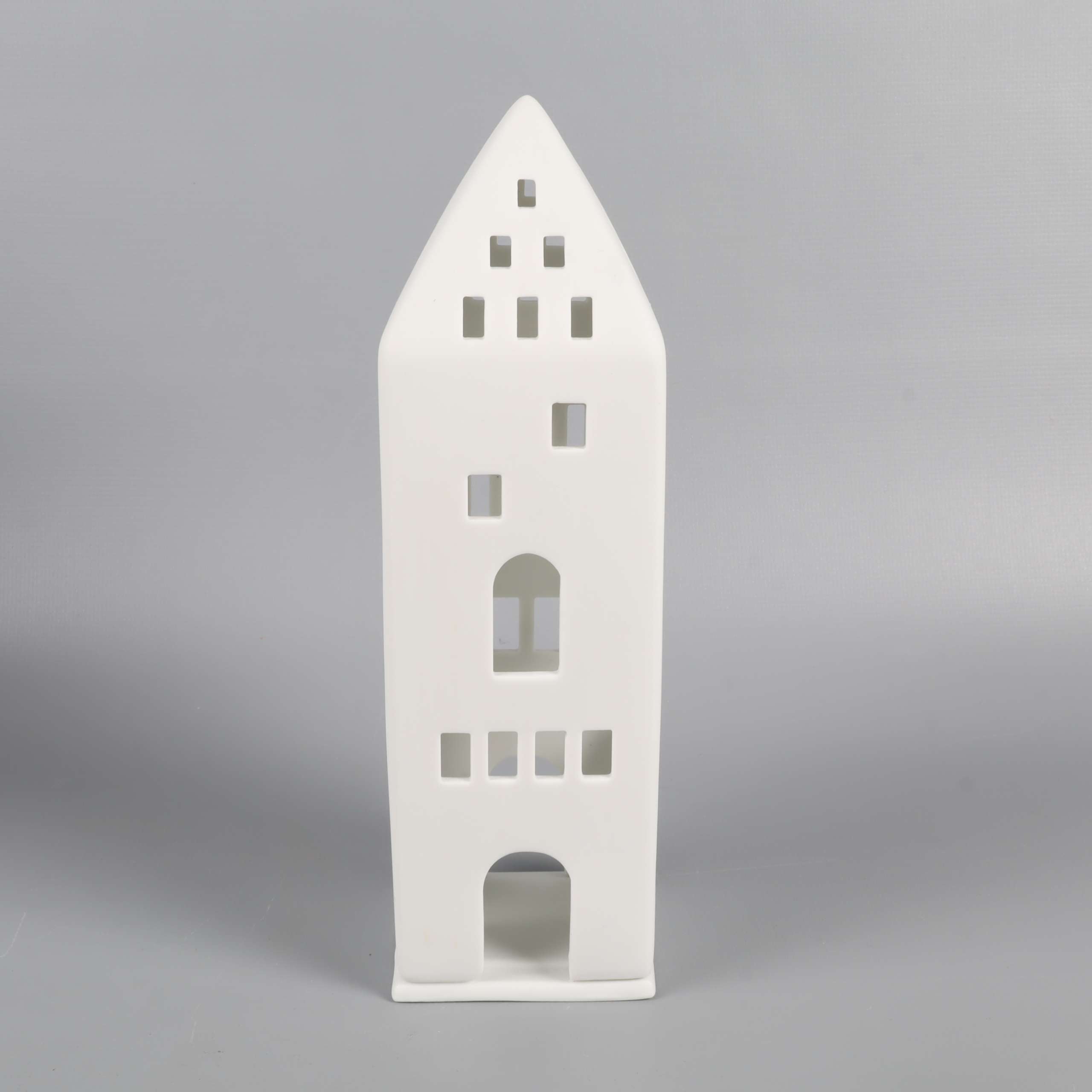 Stilren ljuslykta i form av ett högt hus med dekorativa fönster och dörrar skapar mysig stämning. Gjord i matt vit keramik som ger ett modernt och tidlöst intryck. Avtagbar botten för enkel användning.