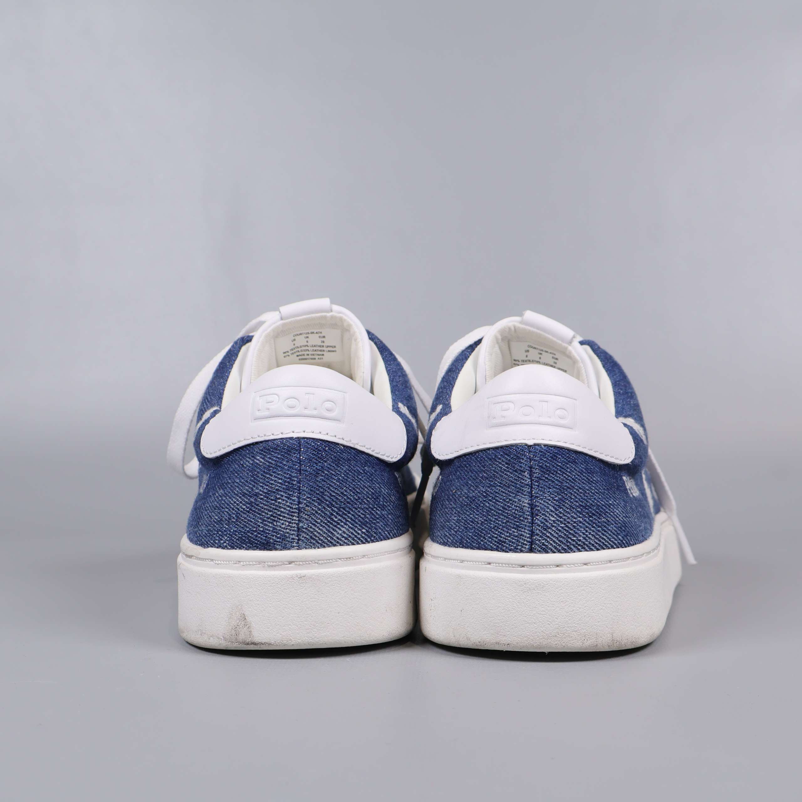 Storlek: 39 Innermått: 25,4 cm. Snygga sneakers med blå textilyta och vit sulkant, prydda med Polo Ralph Lauren-loggor för en sportig och stilren känsla. Kontrasterande vita skosnören och häl ger ett fräscht utseende. Tidlös design som passar dig som gillar klassiska detaljer med en modern touch.