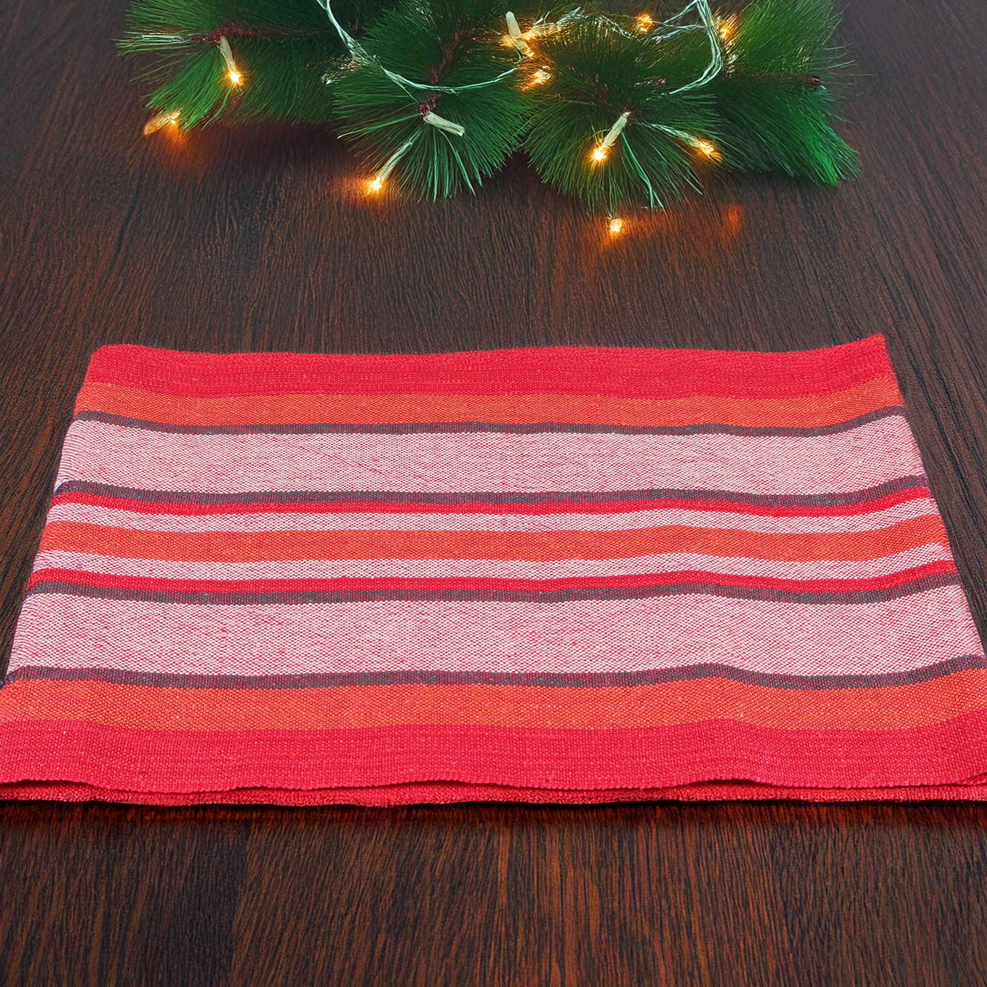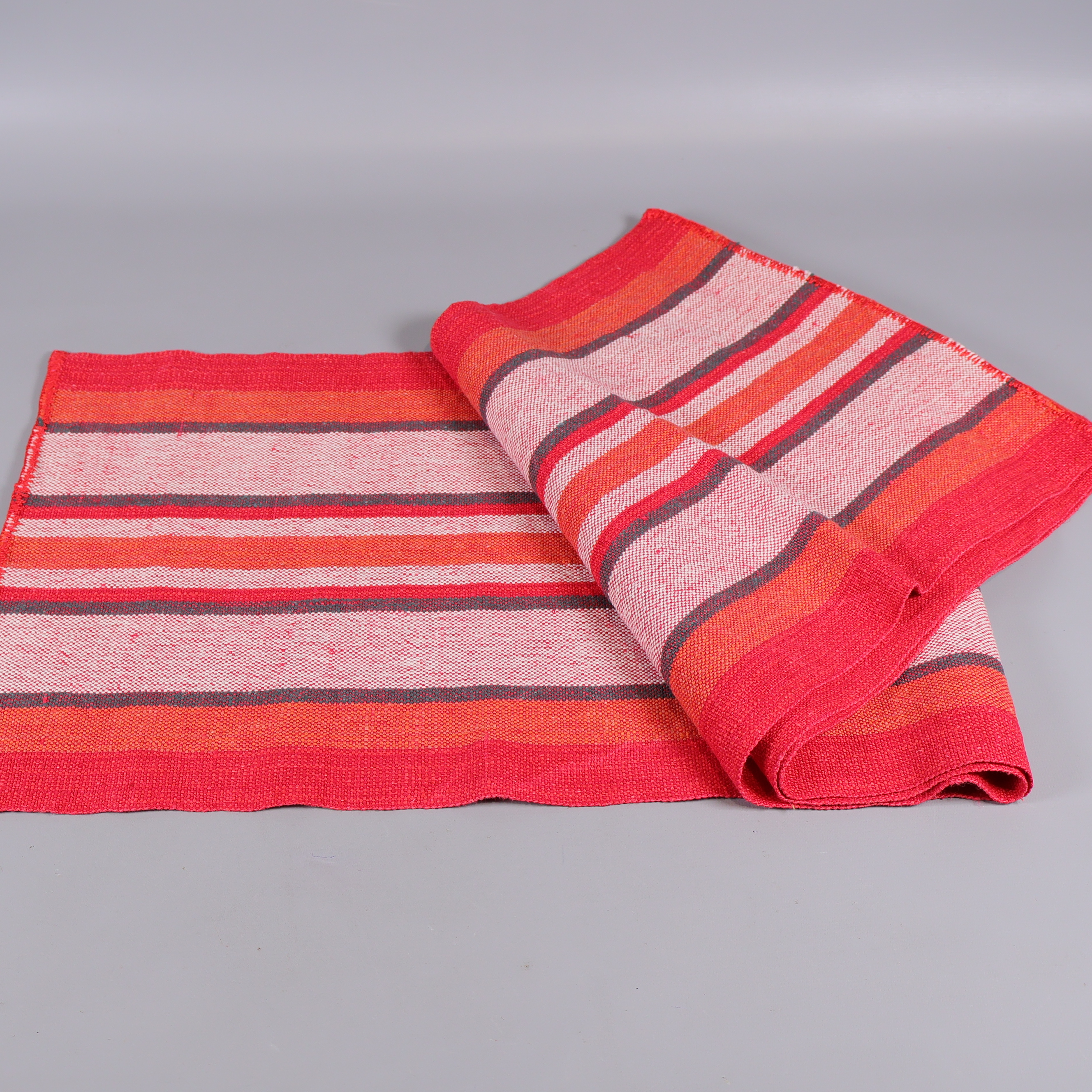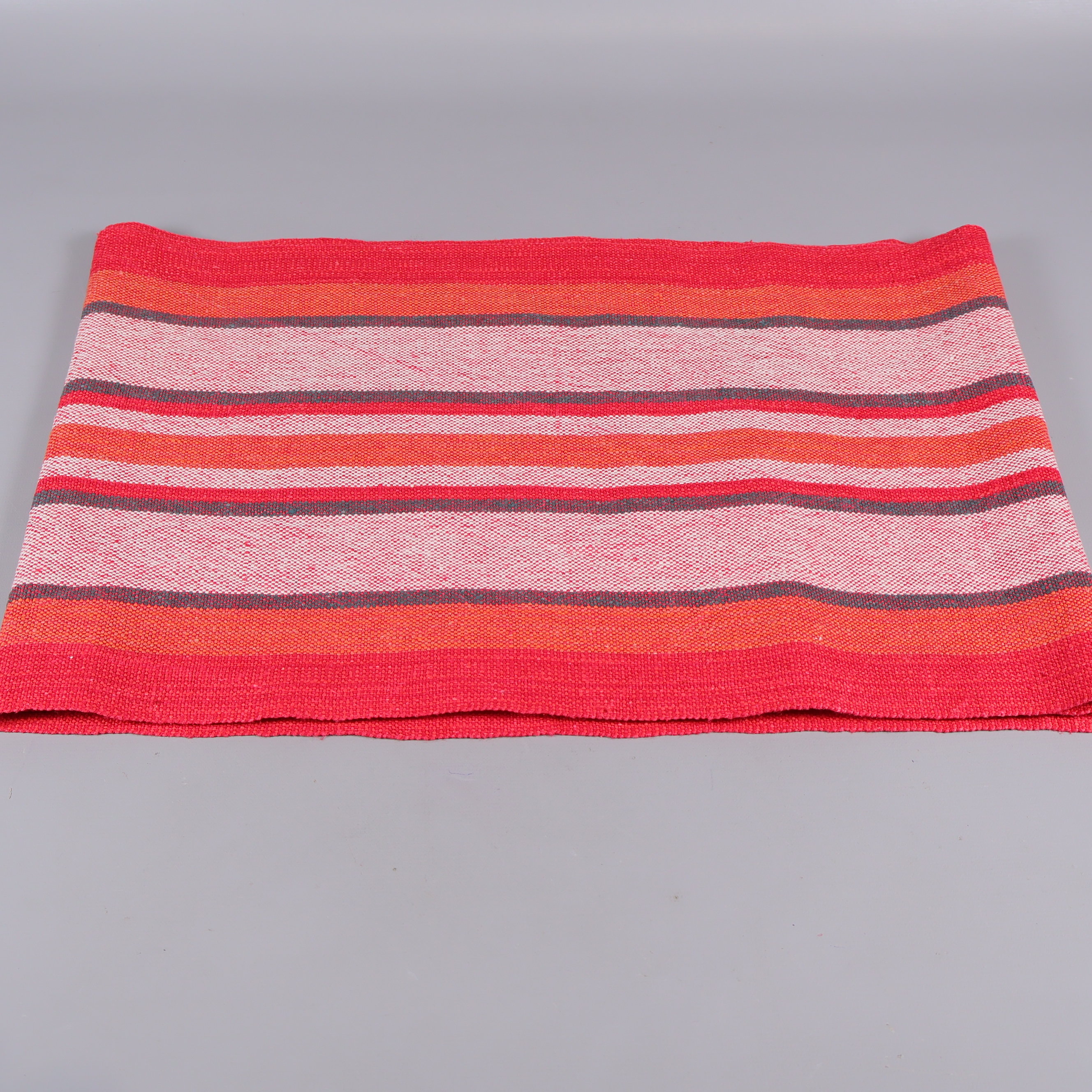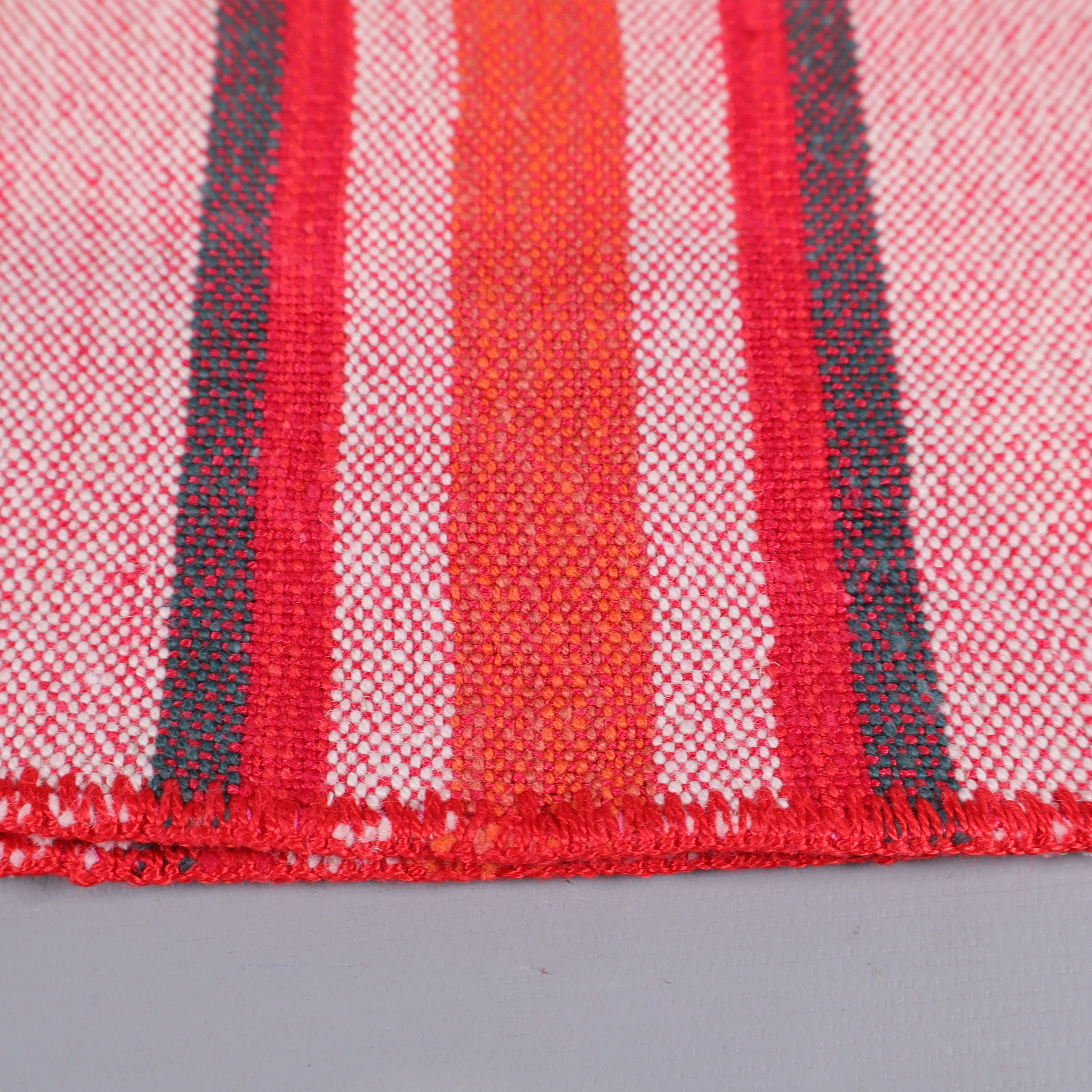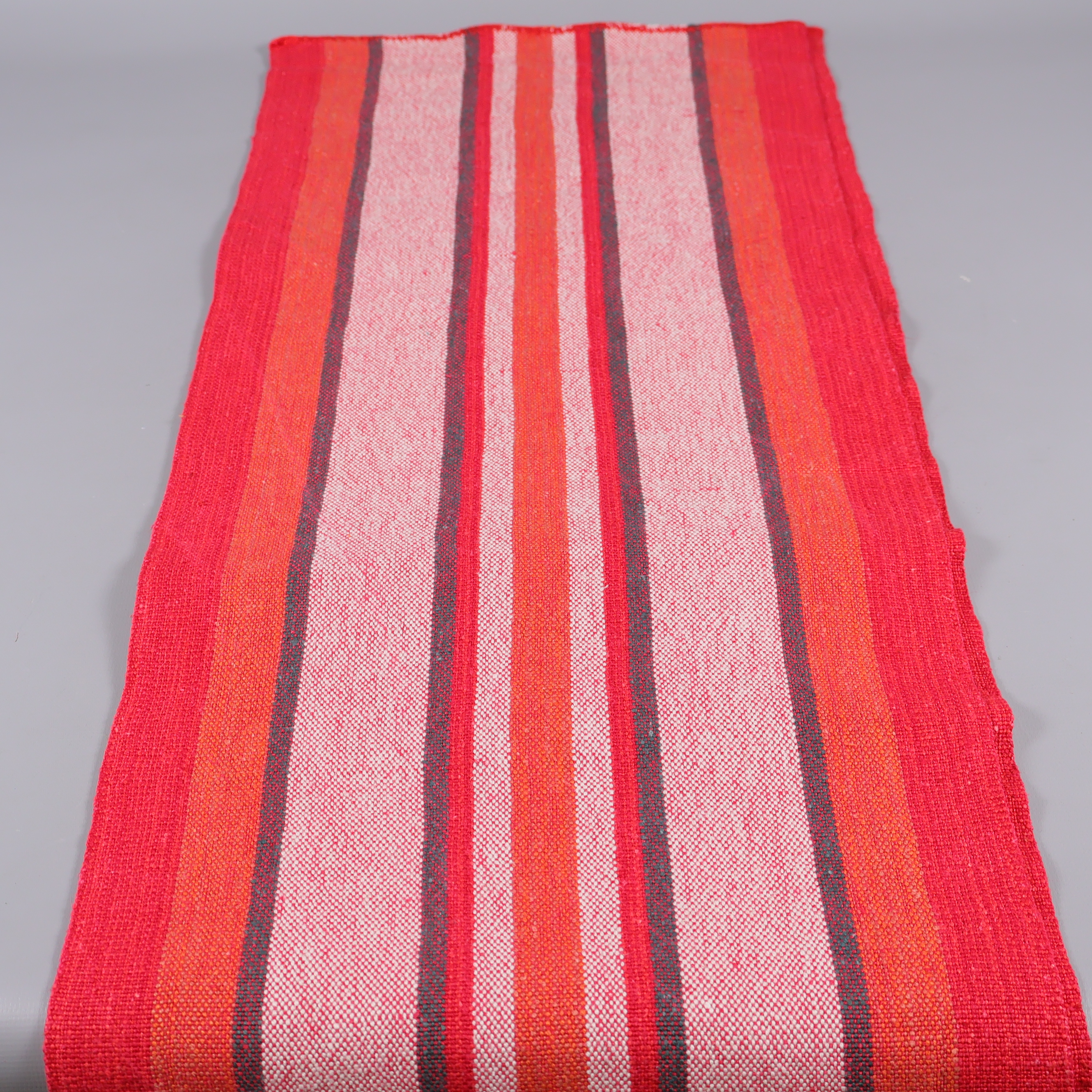 En färgstark löpare med breda, röda och rosa ränder och subtila inslag av grått. Den vävda strukturen ger en genuin textilkänsla och passar lika bra på köksbordet som till annan dukning. Löparen har ett mjukt uttryck och härliga vintage vibes.