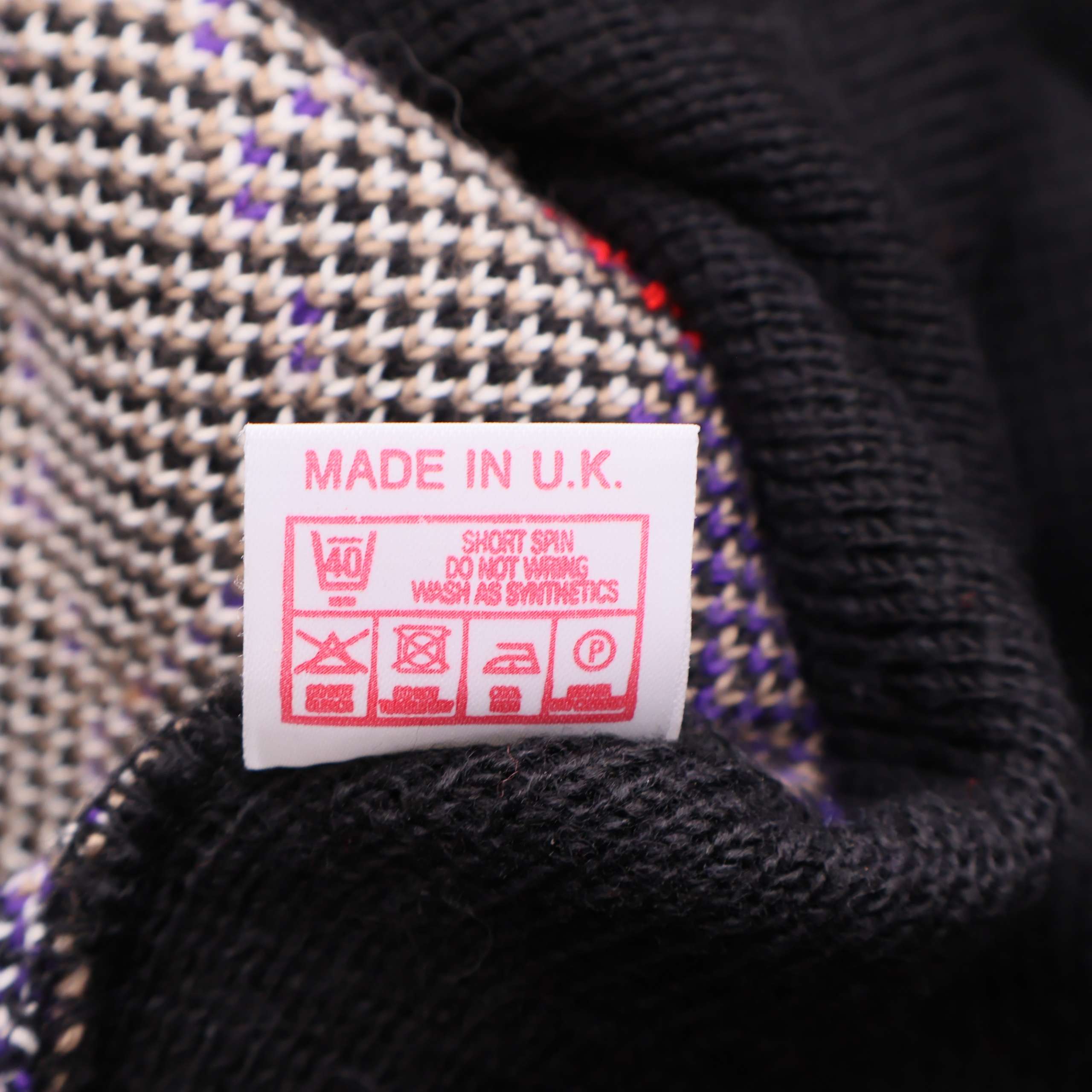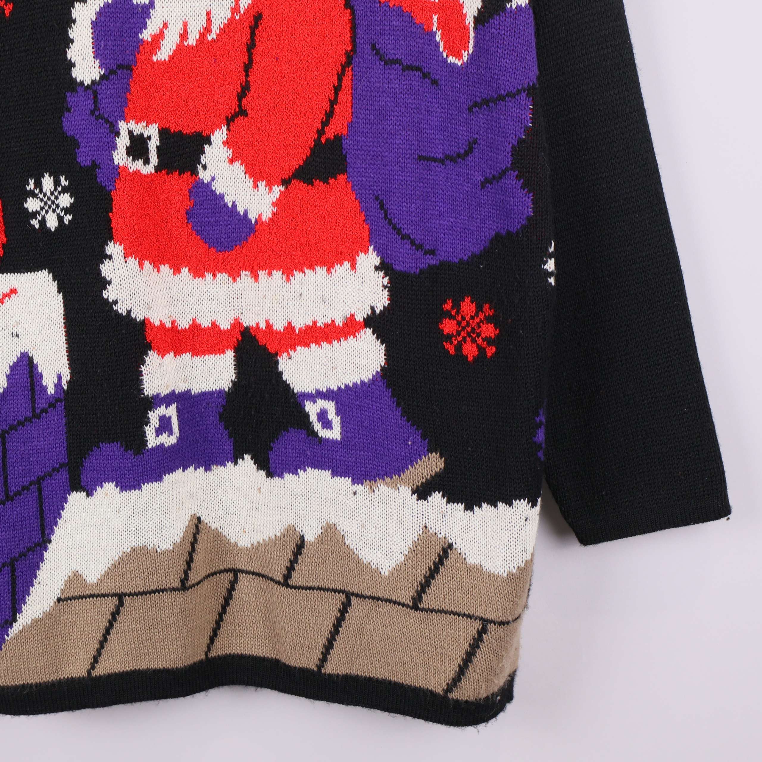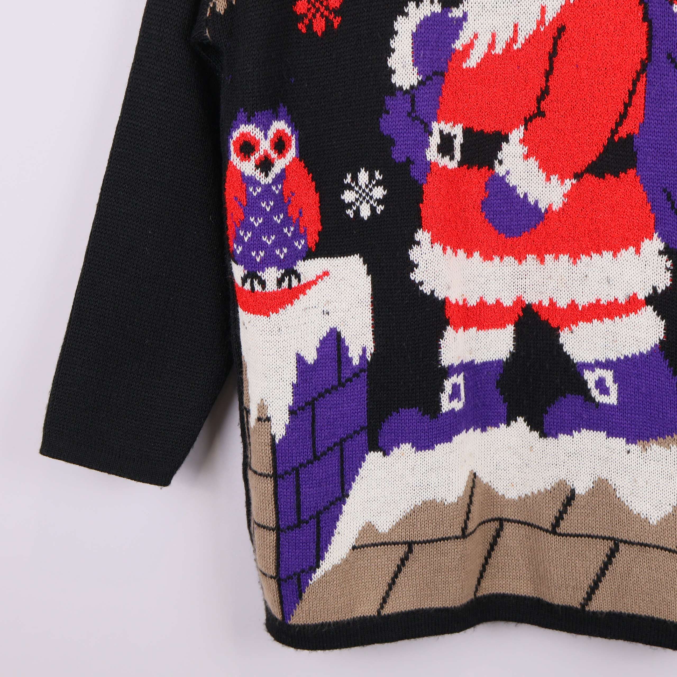 Rolig och färgstark stickad tröja med julmotiv där tomten levererar klappar på ett tak bland snöflingor. Tjock ribbstickad krage i kontrastfärg och detaljer i lila, rött, vitt och brunt ger en härlig vintage vibe.