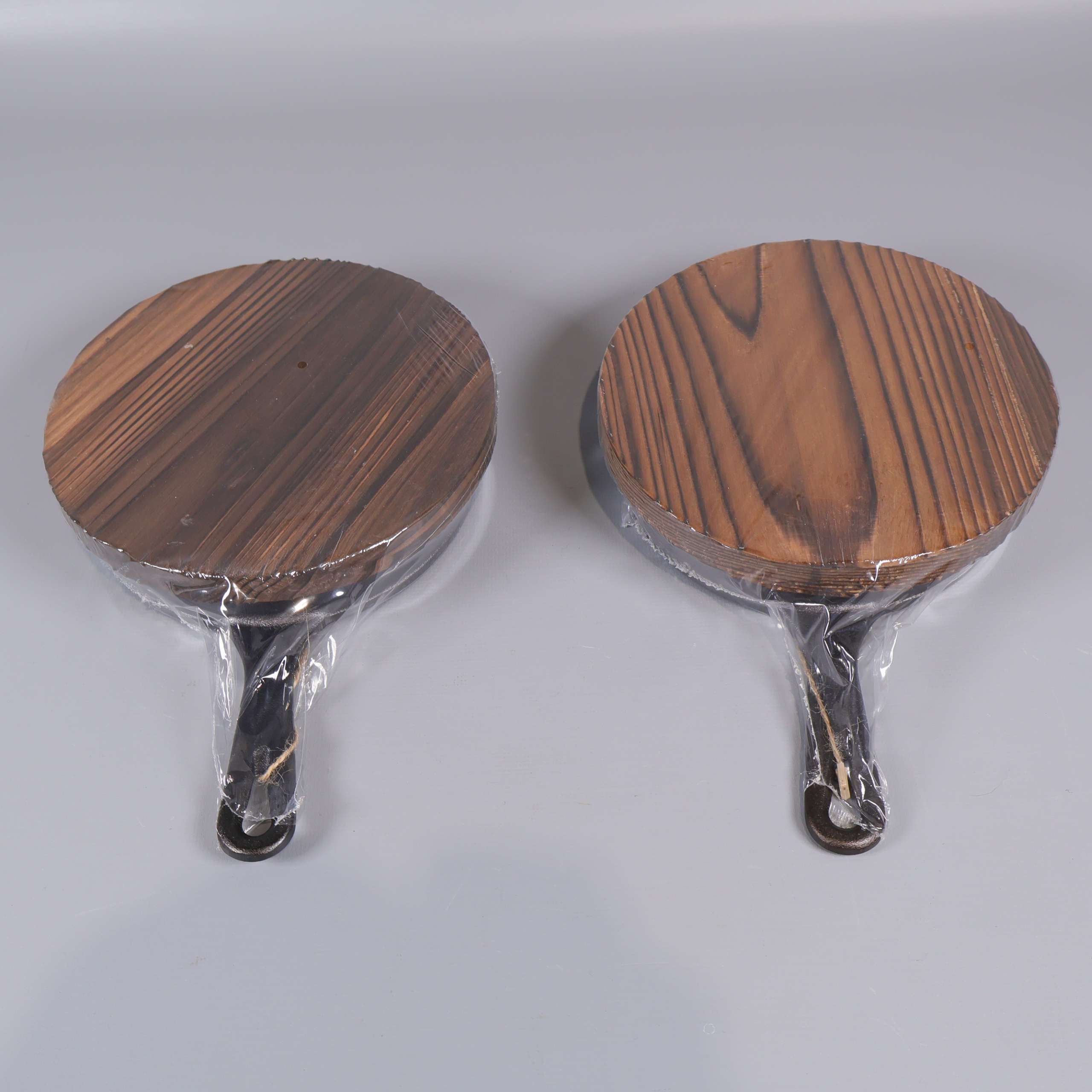 Två klassiska portionspannor i svart gjutjärn med runda, träfärgade underlägg. Den snygga kombon av robust metall och naturligt trä ger en rustik känsla – perfekt för servering med en touch av traditionell stil. Varje panna har en diameter på 15 cm.