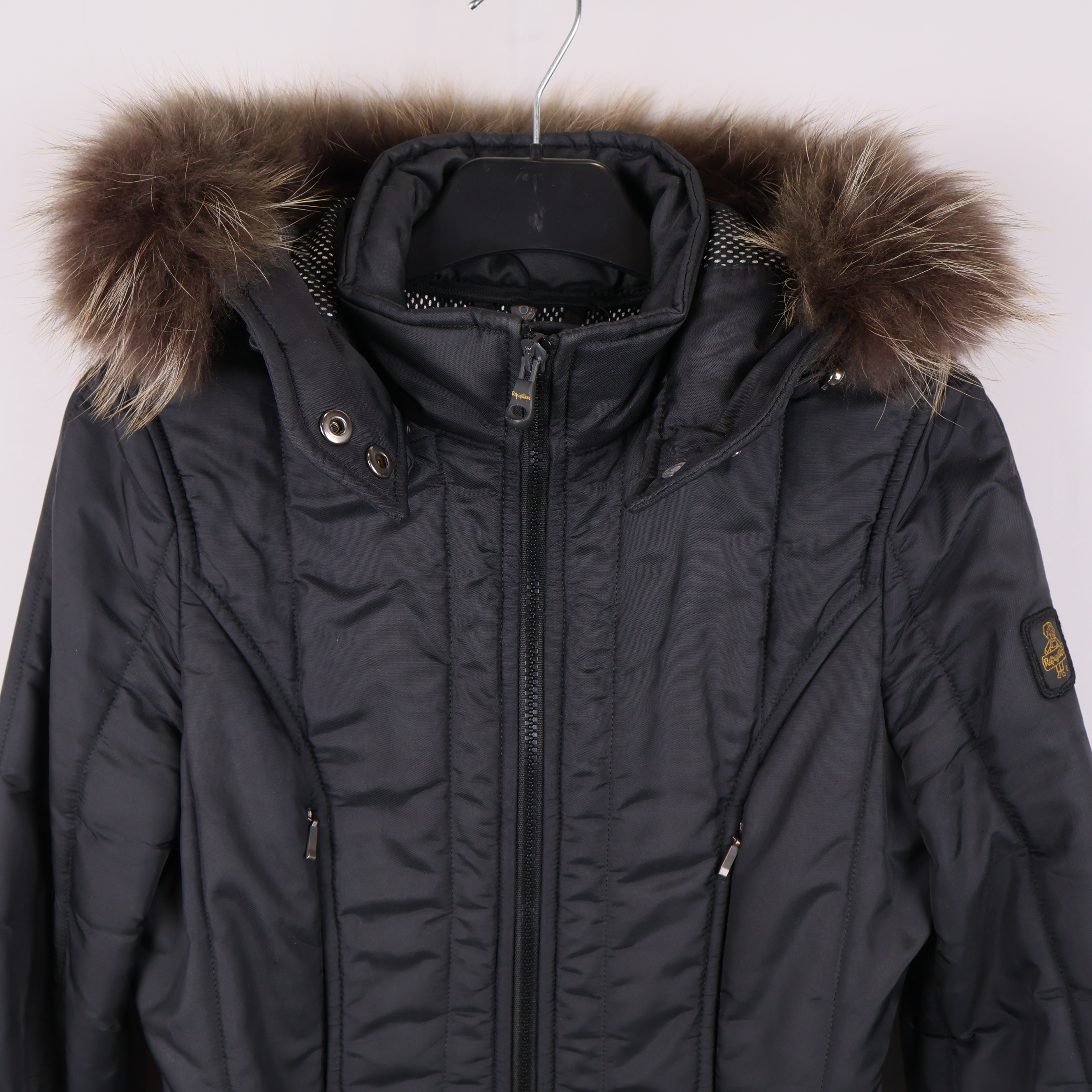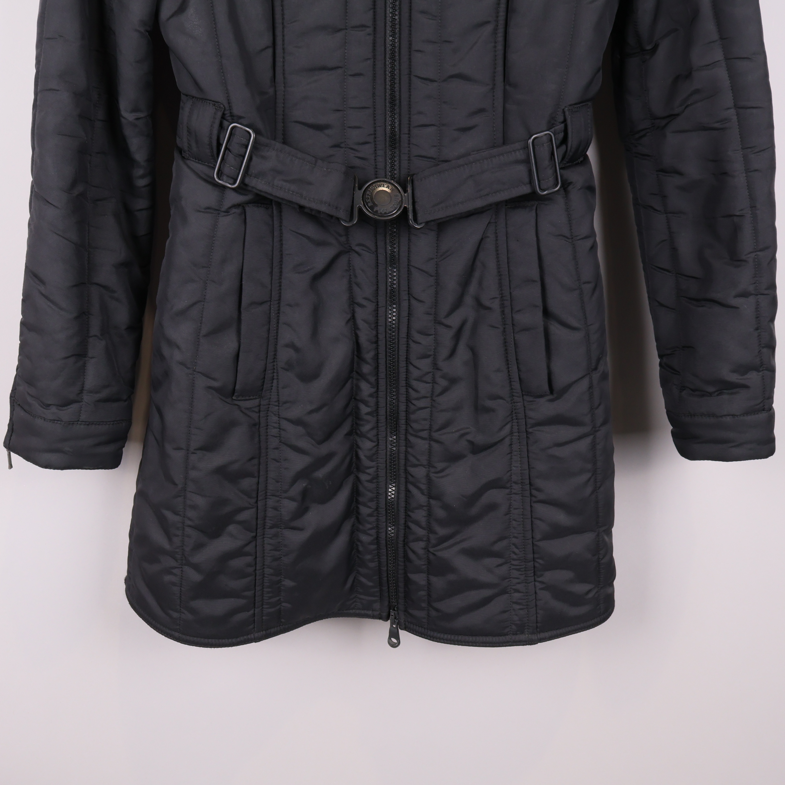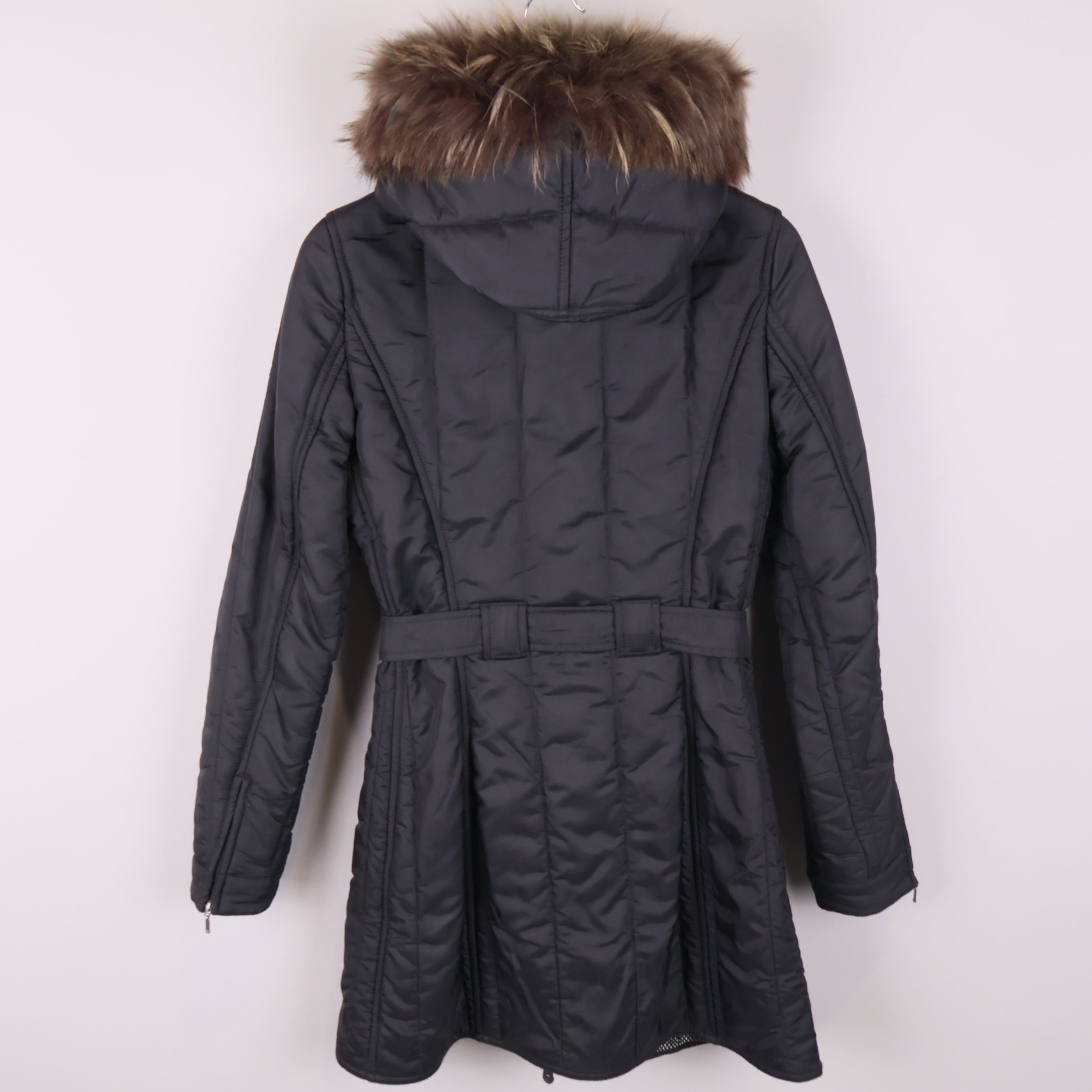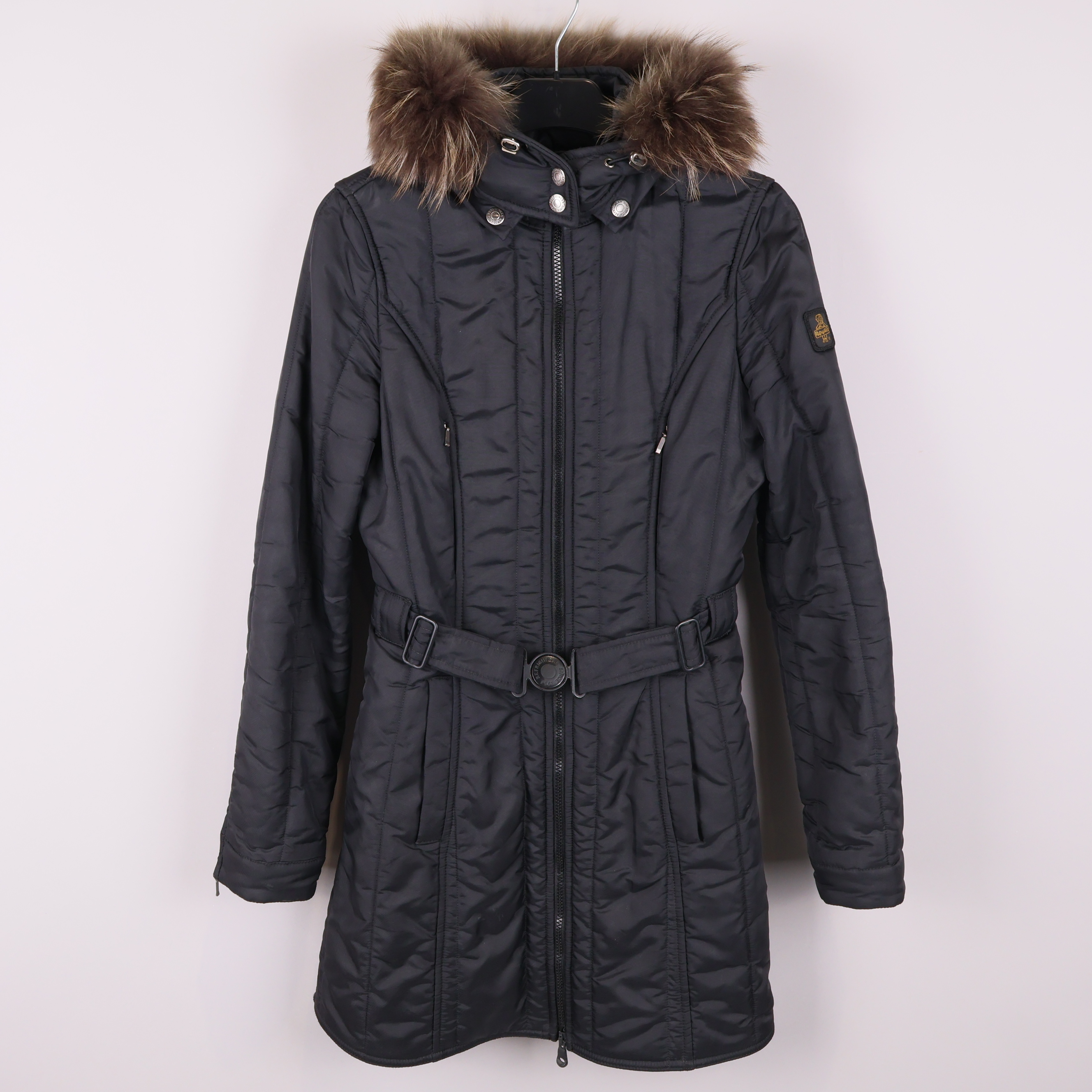 Stilren lång jacka med markerad midja, quiltad design och avtagbar huva med mjuk pälskant. Jackan har bältesdetalj, flera fickor och blank yta som ger ett modernt uttryck. Passar perfekt för dig som söker både funktion och en snygg siluett. Praktiska knapp- och dragkedjeförslutningar samt diskreta detaljer i metall.
