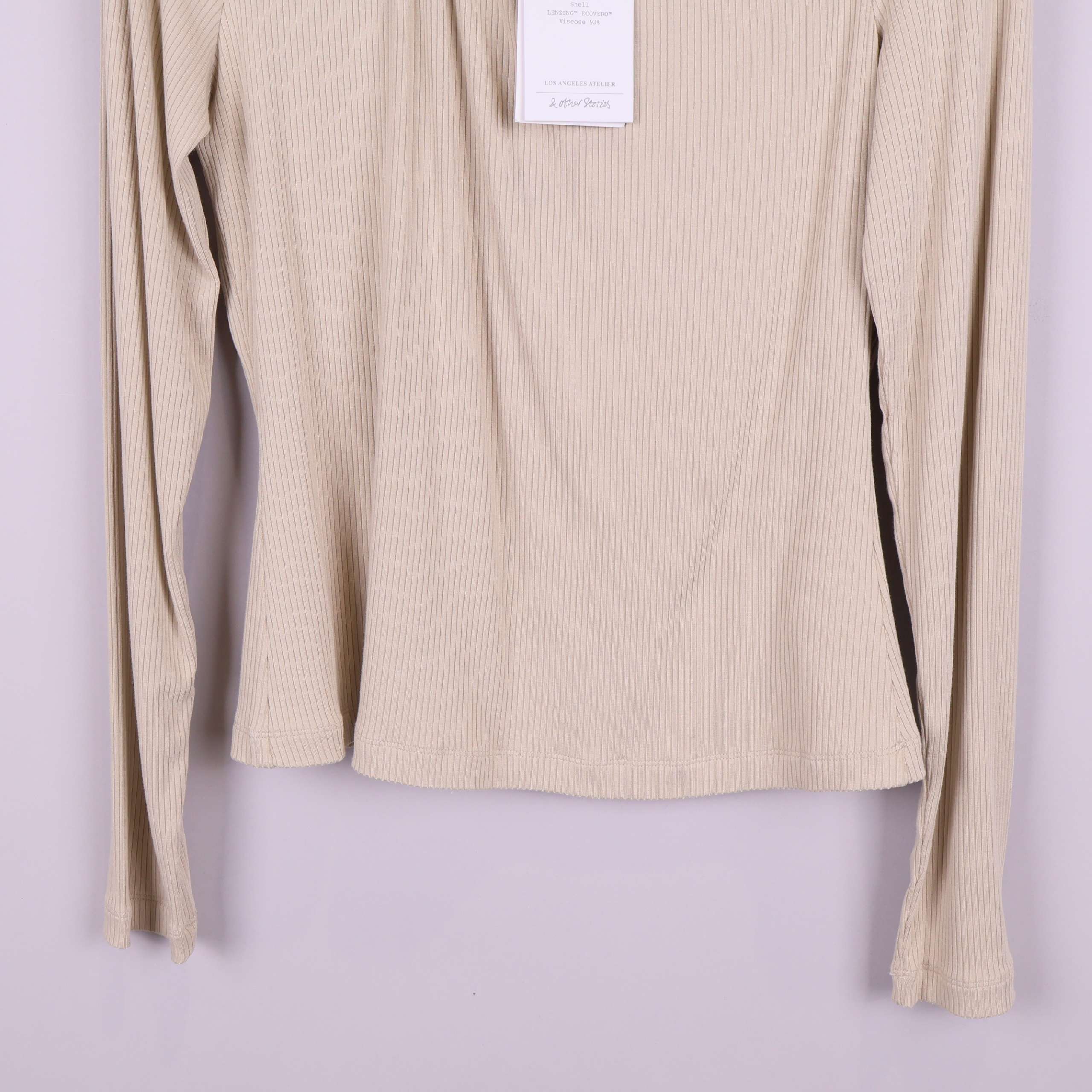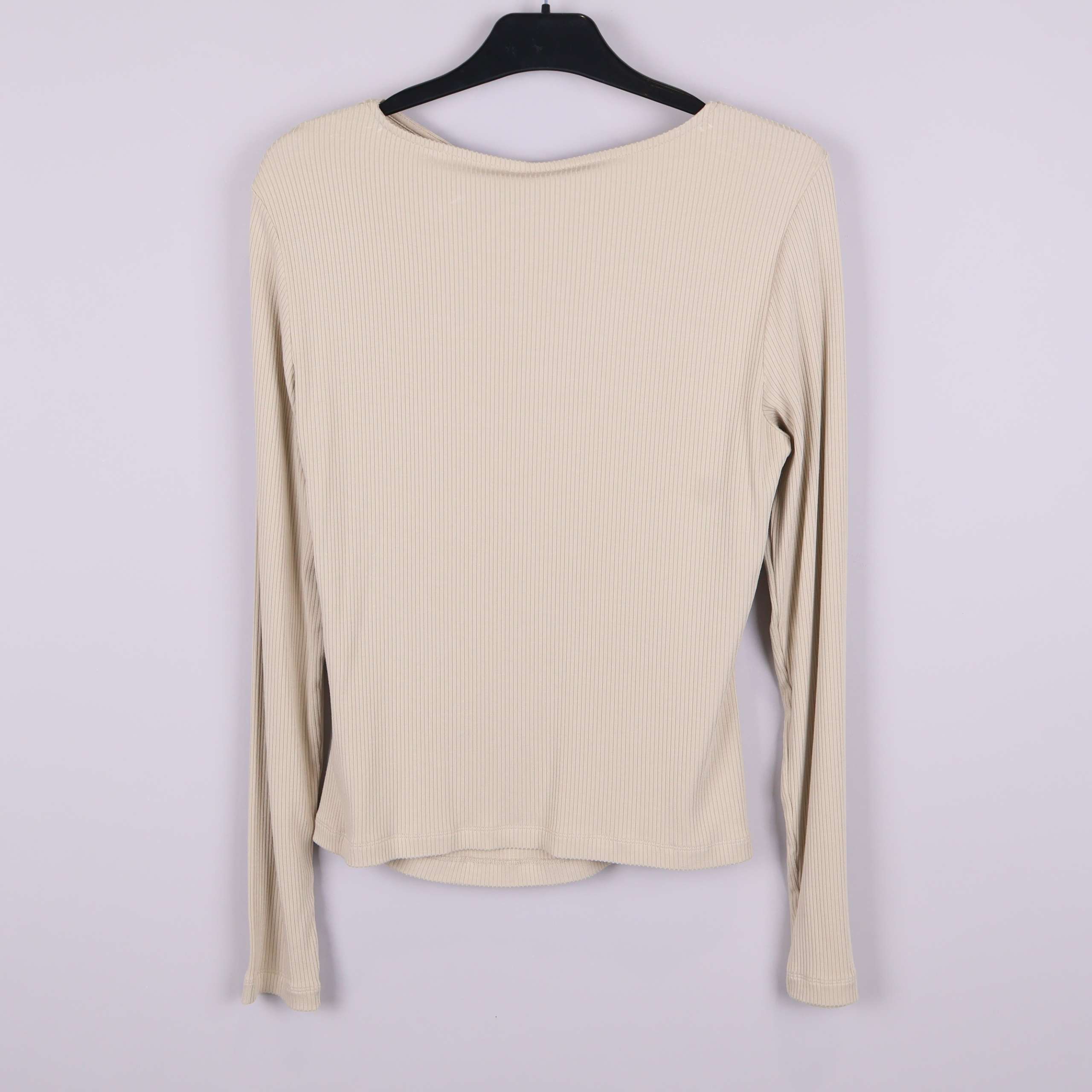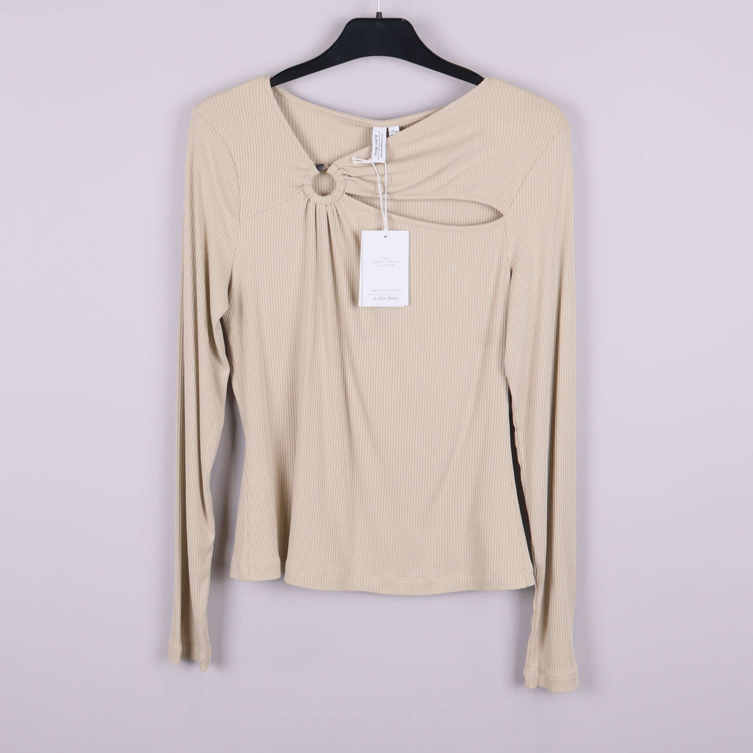 Ribbmönstrad topp i ljusbeige med lång ärm och unik ringdetalj på axeln som skapar ett snyggt och modernt uttryck. Den mjuka och stretchiga kvalitén ger en skön känsla.