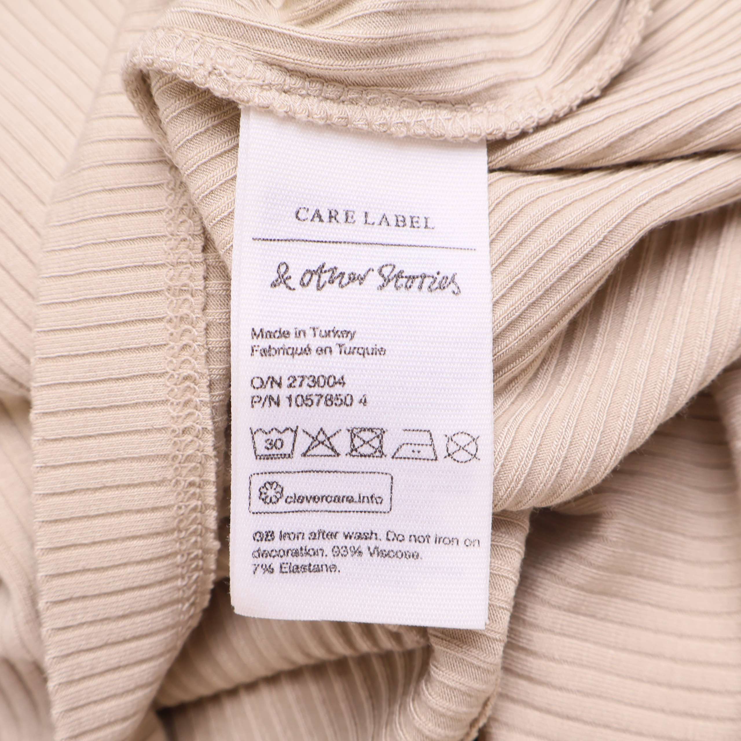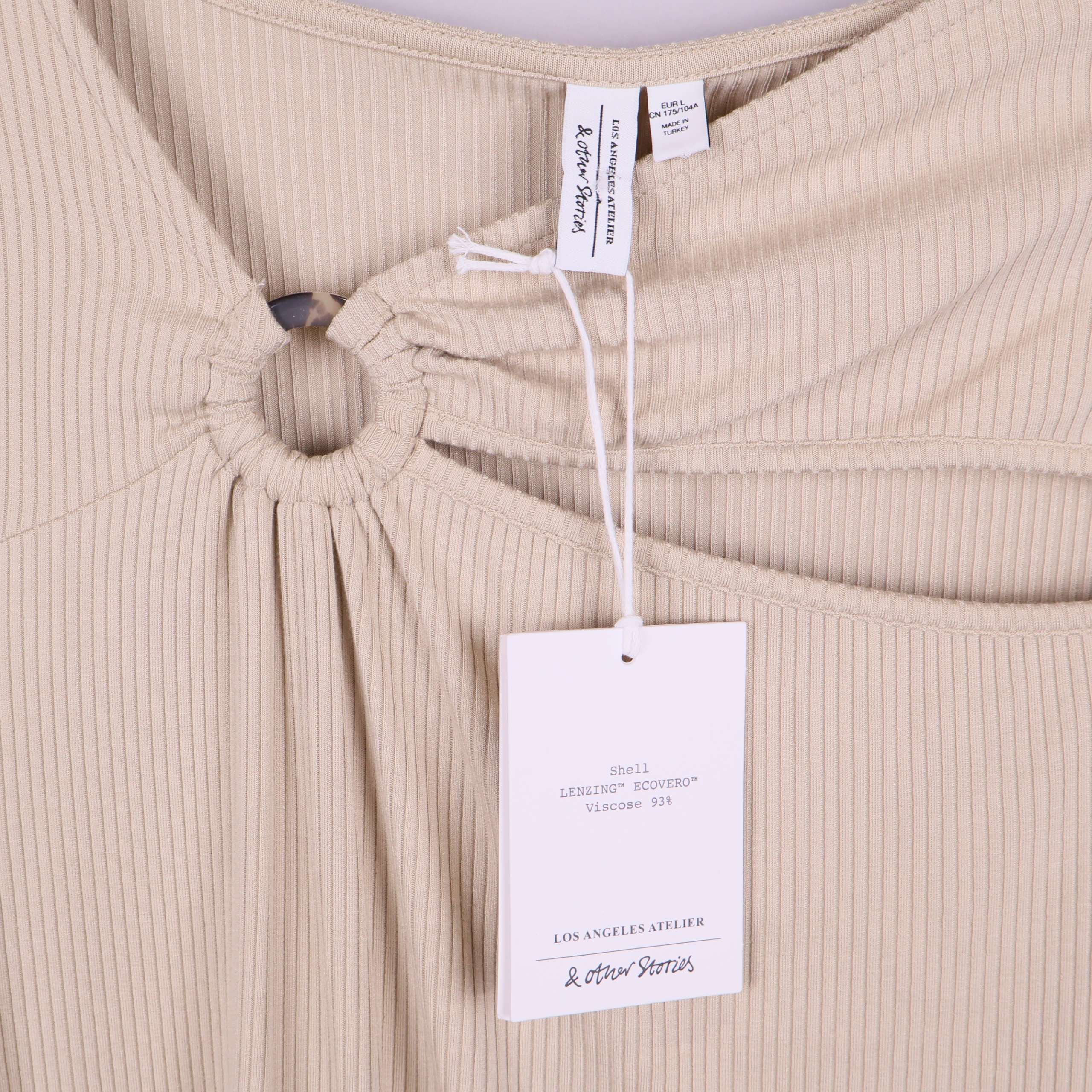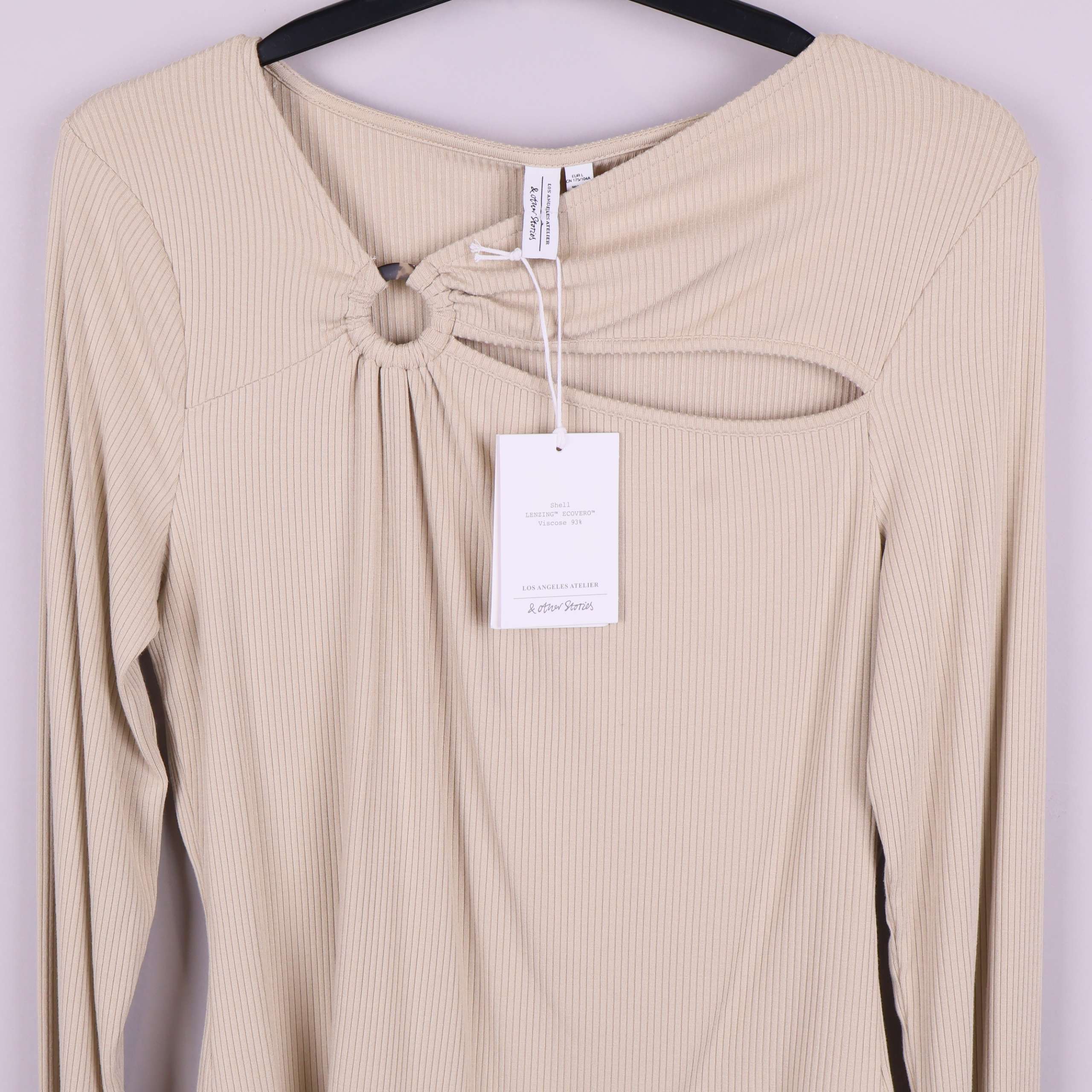 Ribbmönstrad topp i ljusbeige med lång ärm och unik ringdetalj på axeln som skapar ett snyggt och modernt uttryck. Den mjuka och stretchiga kvalitén ger en skön känsla.