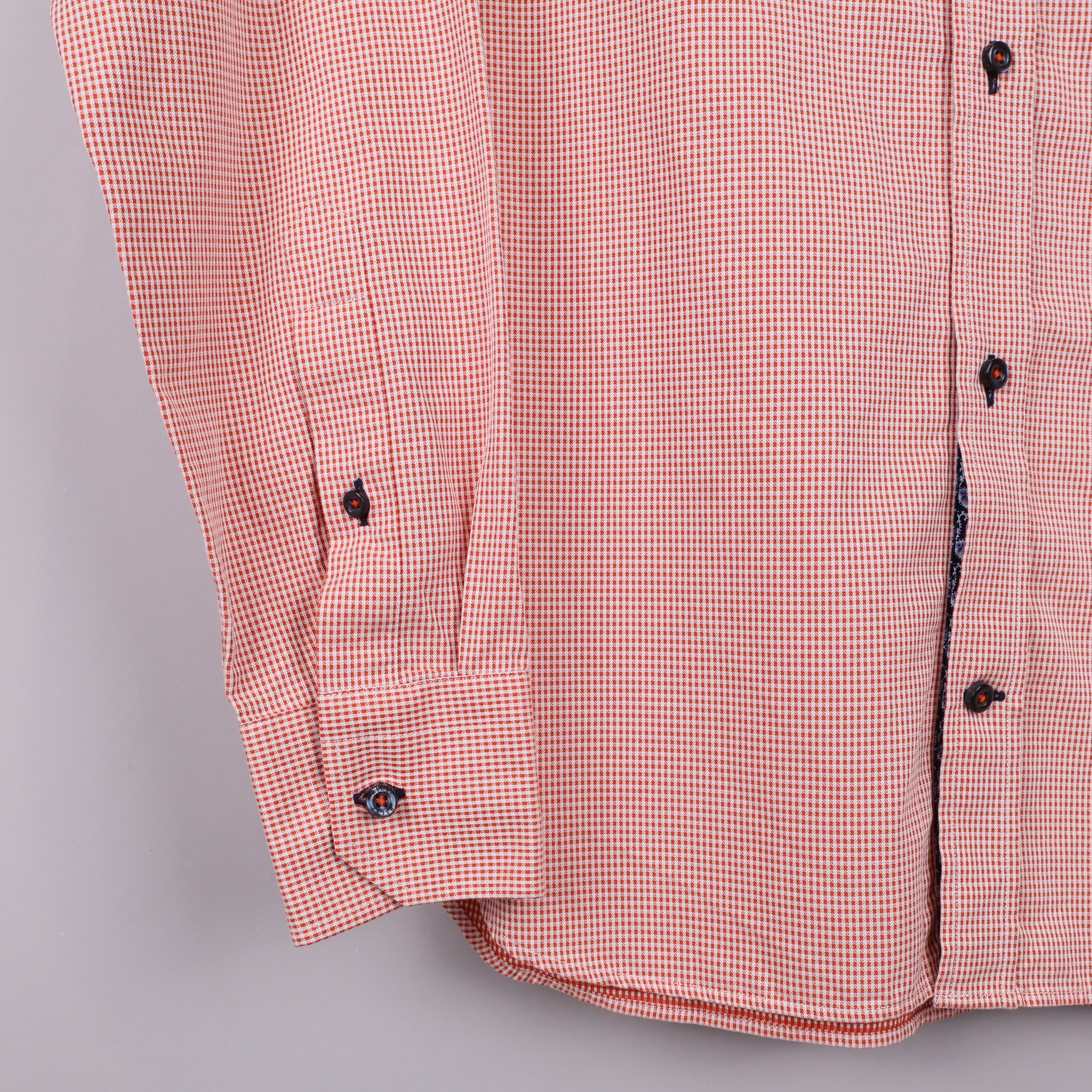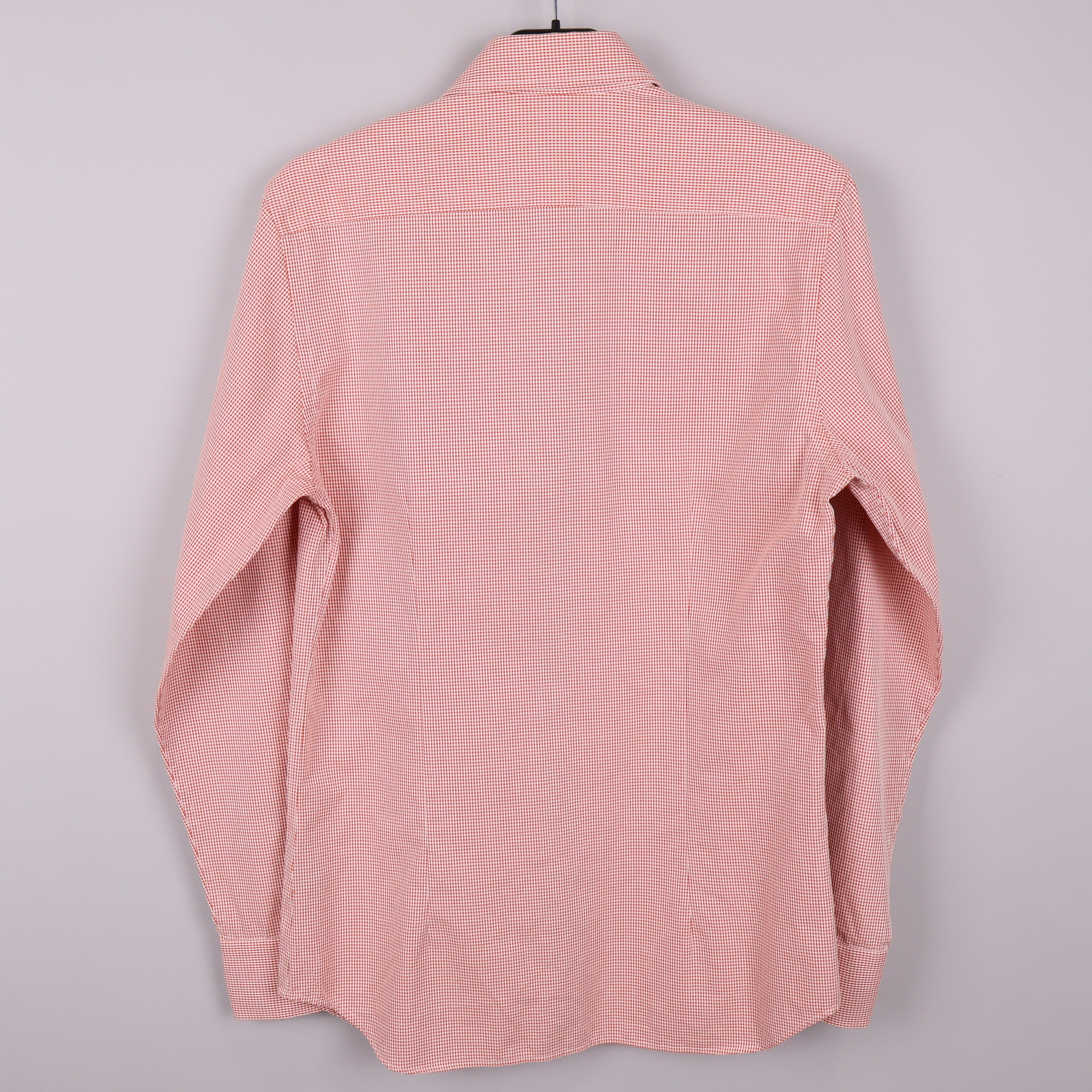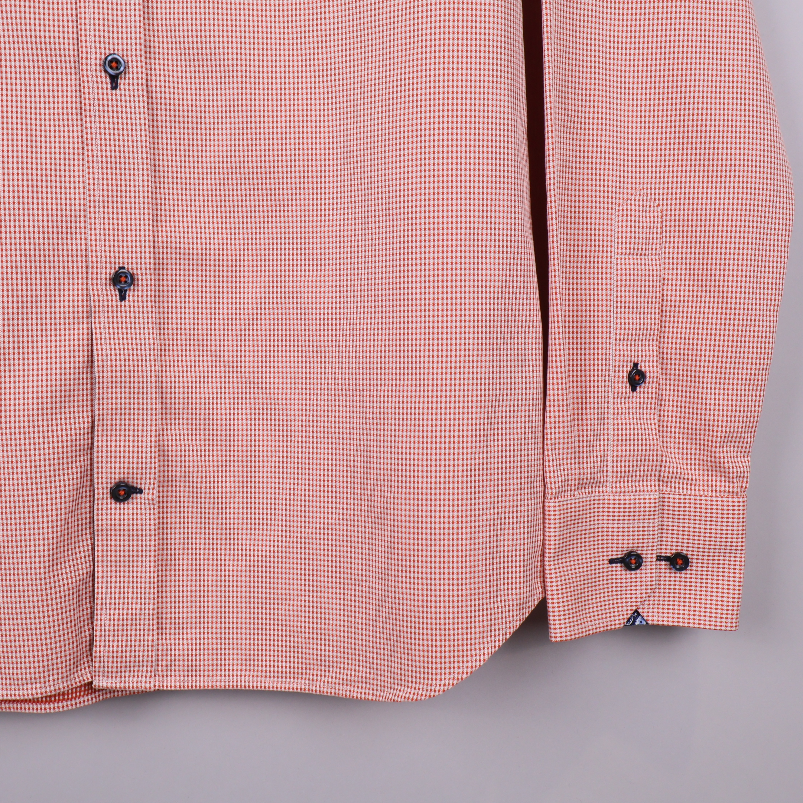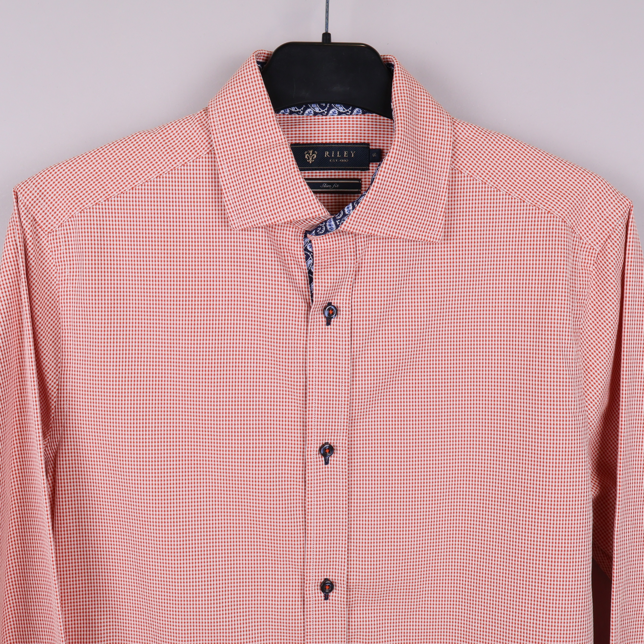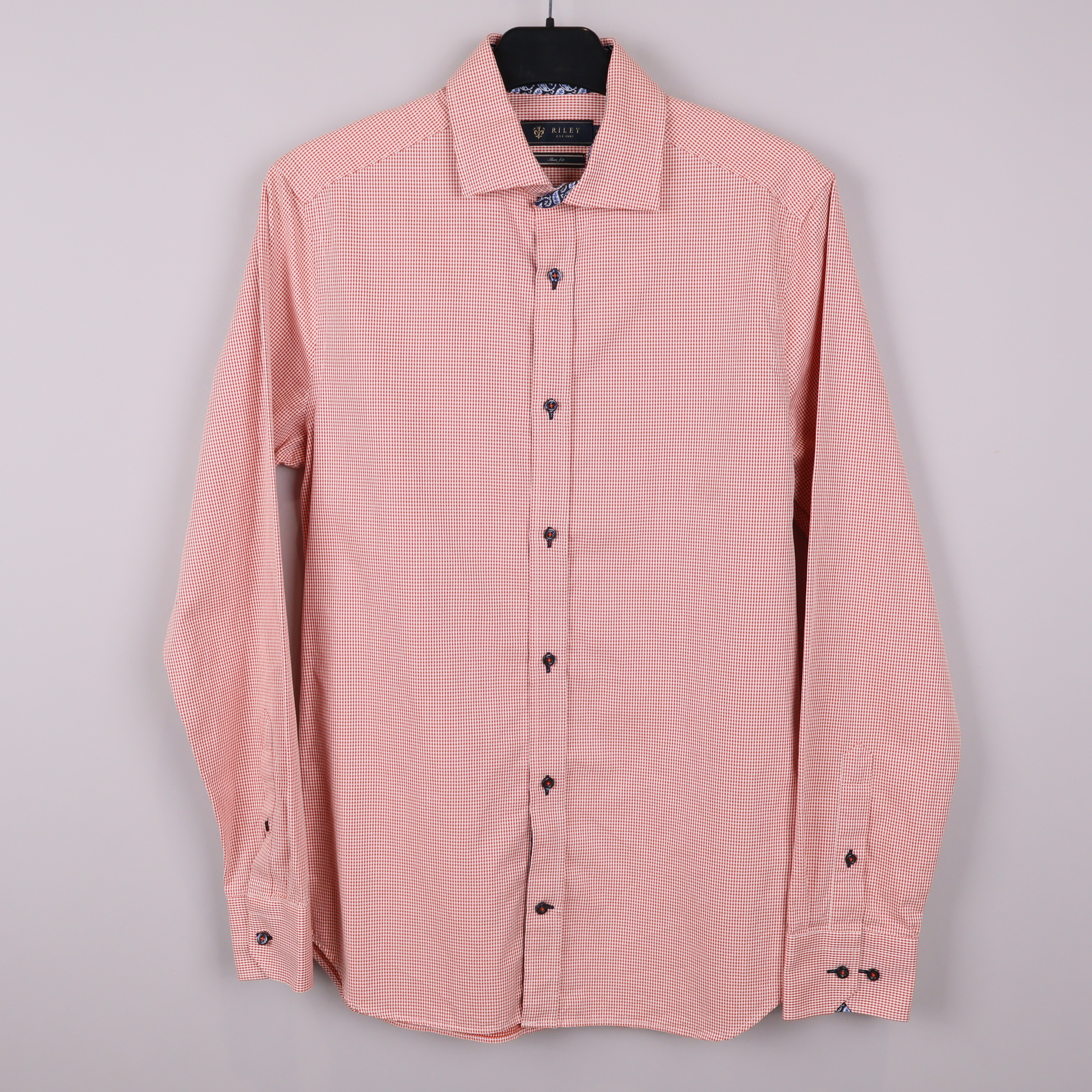 Rutigt mönstrad skjorta från Riley i rött och vitt med klassisk krage och lång ärm. Skjortan har smal passform och snygga kontrastknappar.
