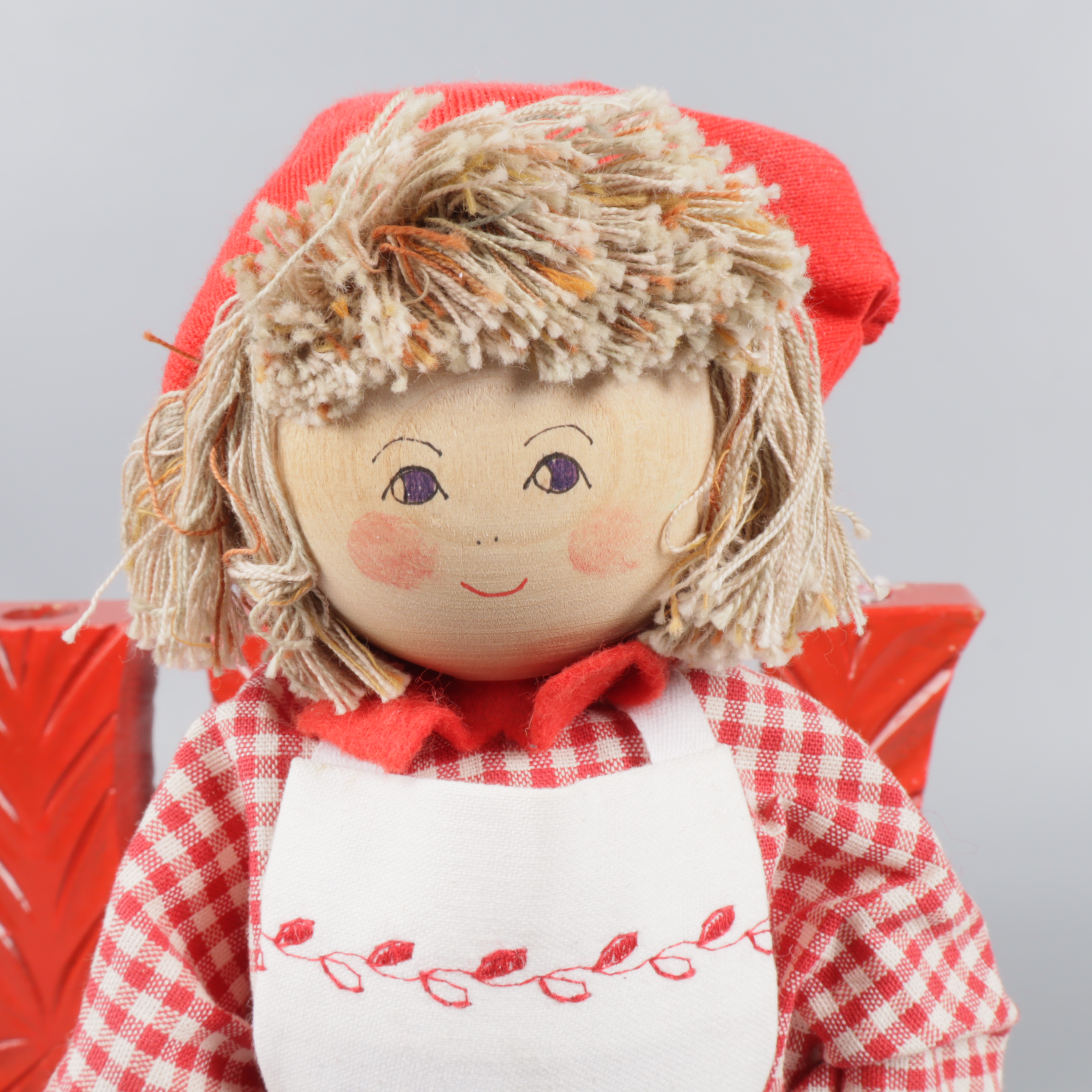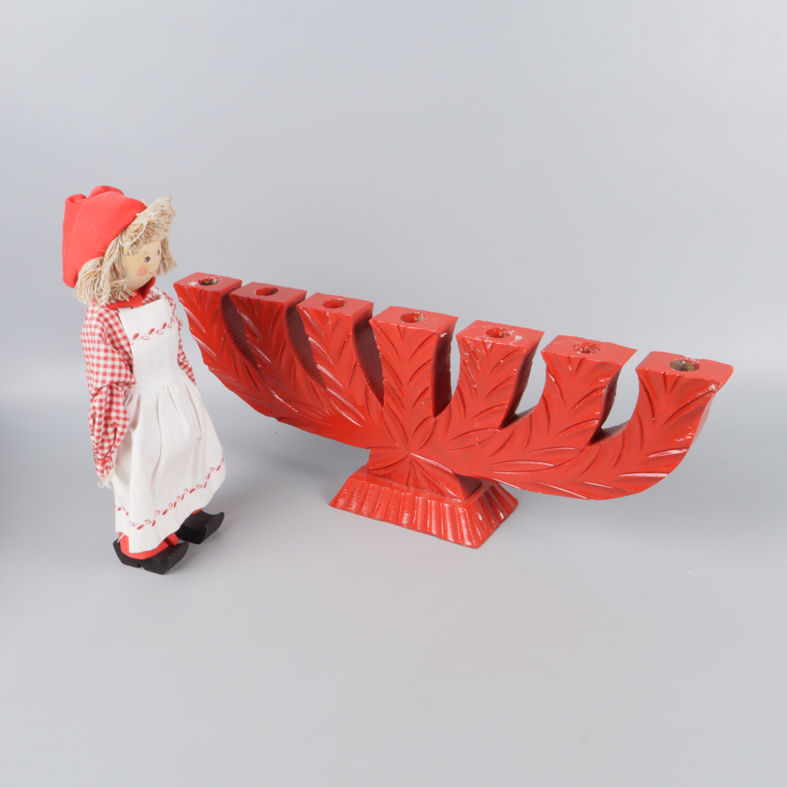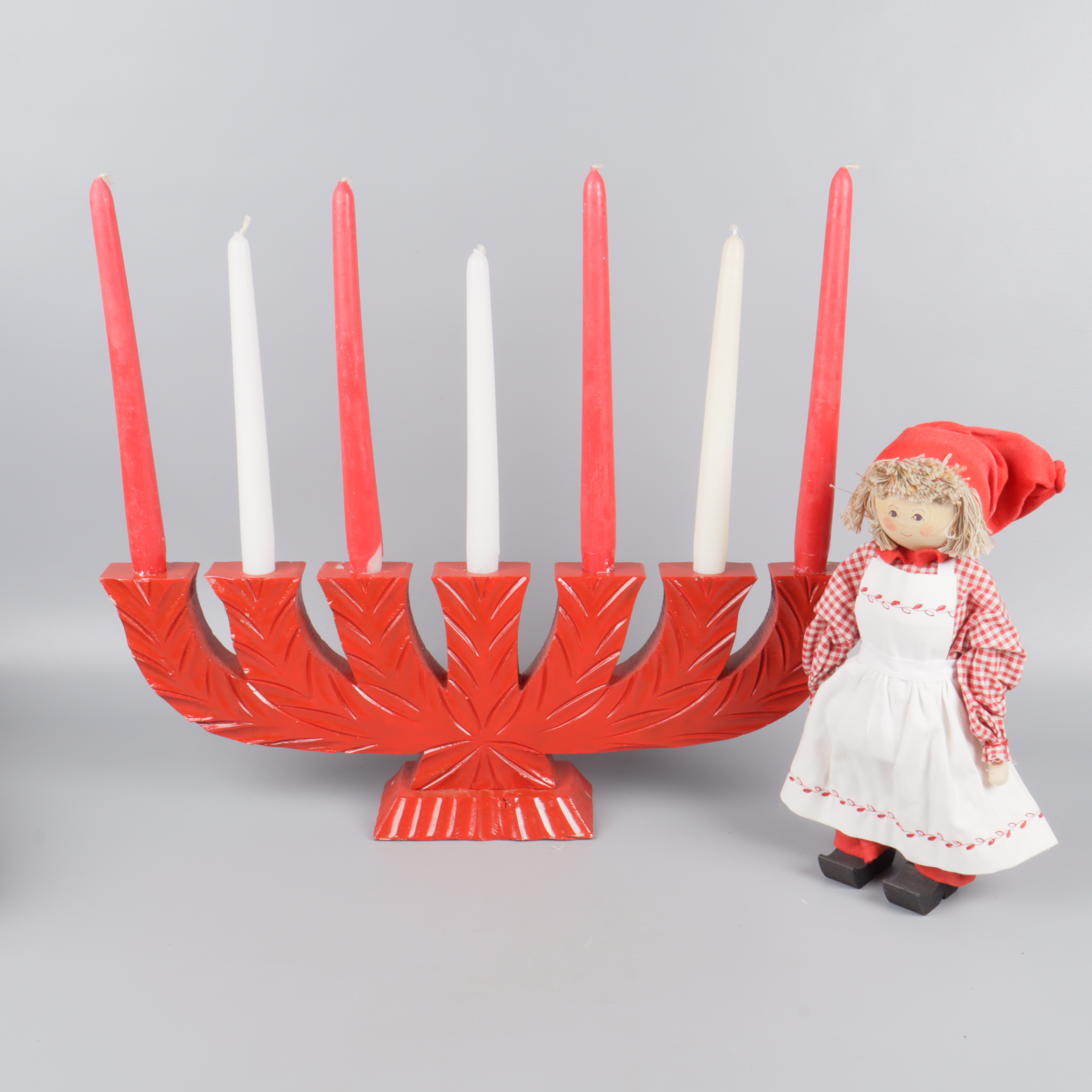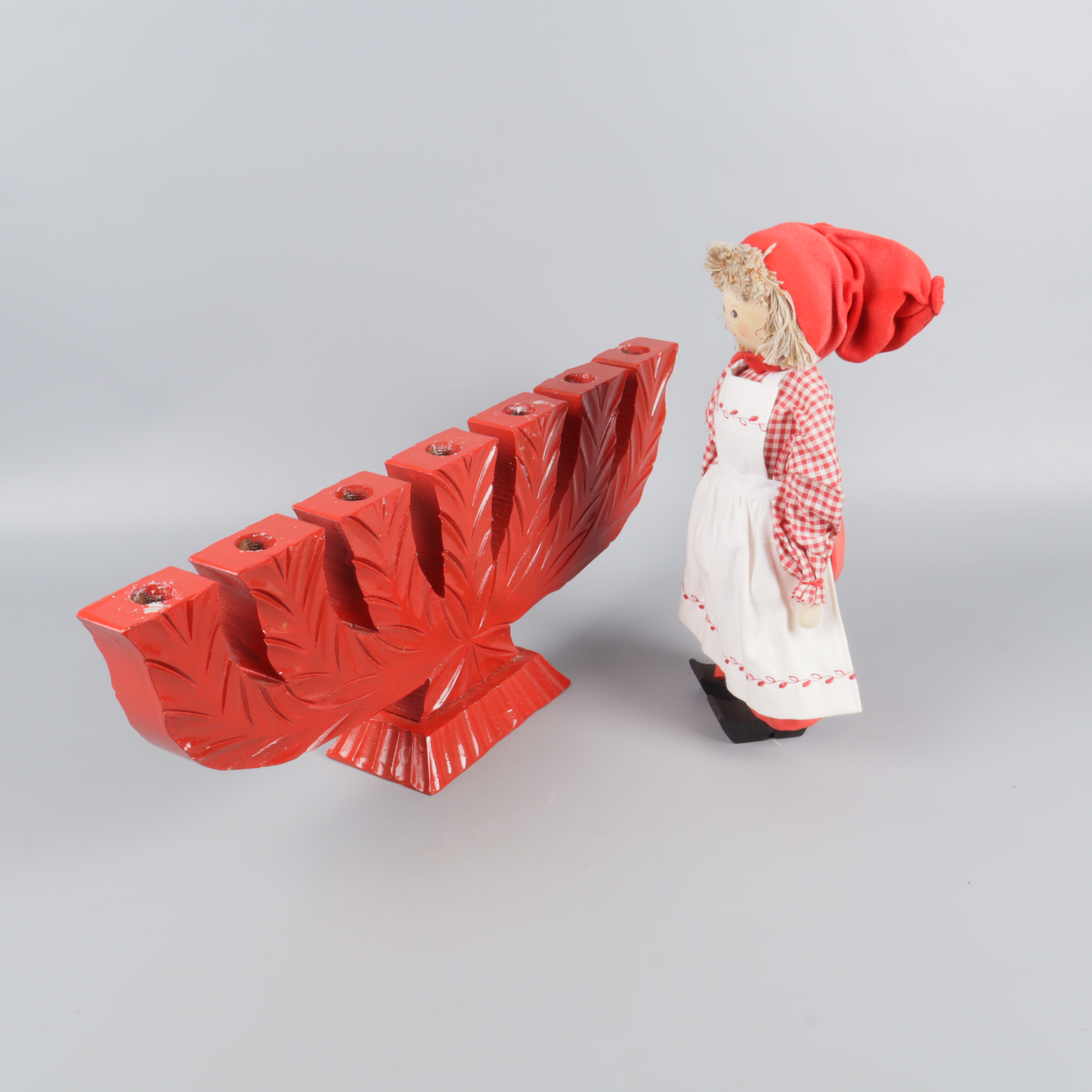 Charmigt set med en handmålad röd ljusstake i trä med distinkt bladmönster och plats för sju ljus. Tillhörande mjuk tomtedocka med rutiga detaljer och broderat förkläde bidrar till en lekfull och hemtrevlig känsla. Ljus ingår ej.