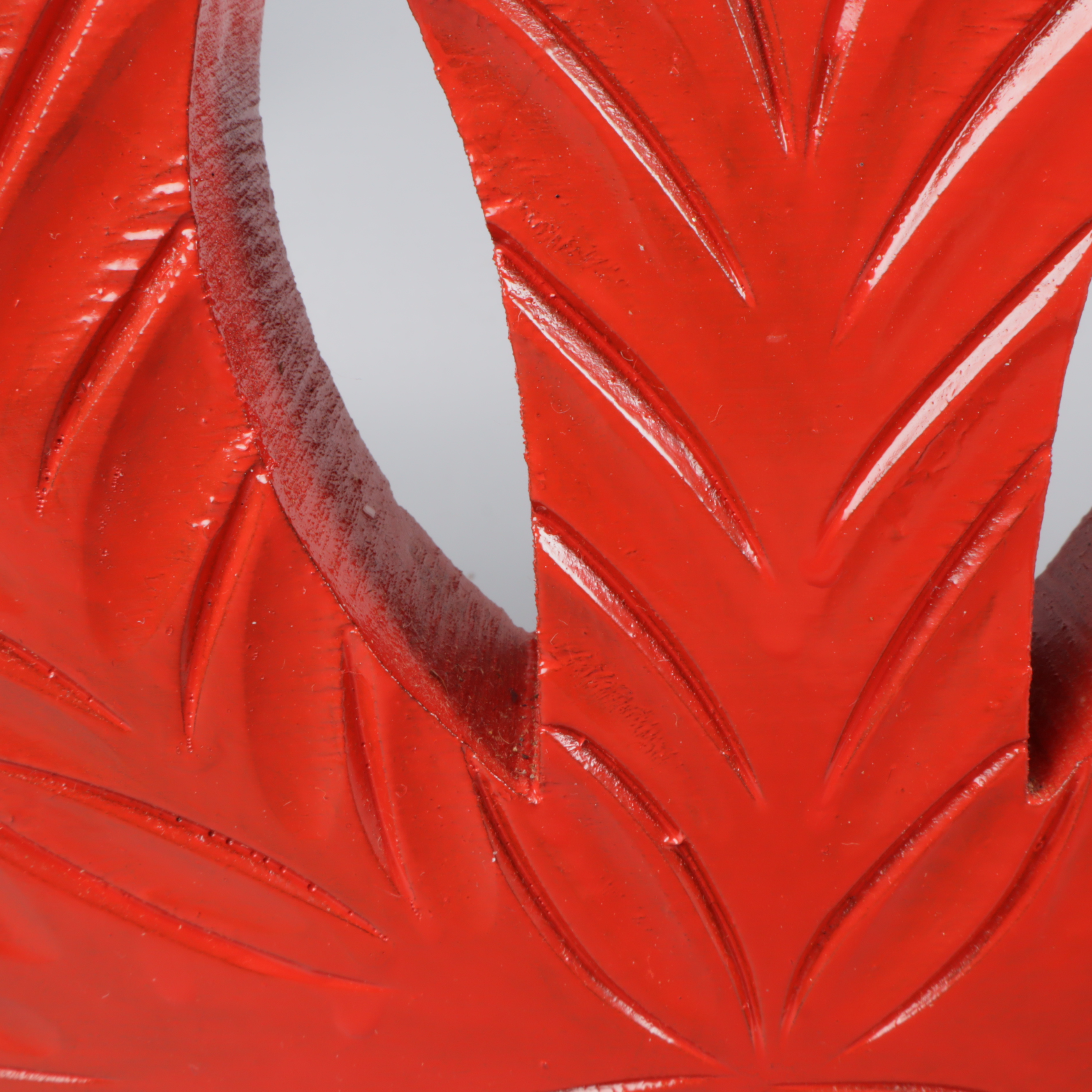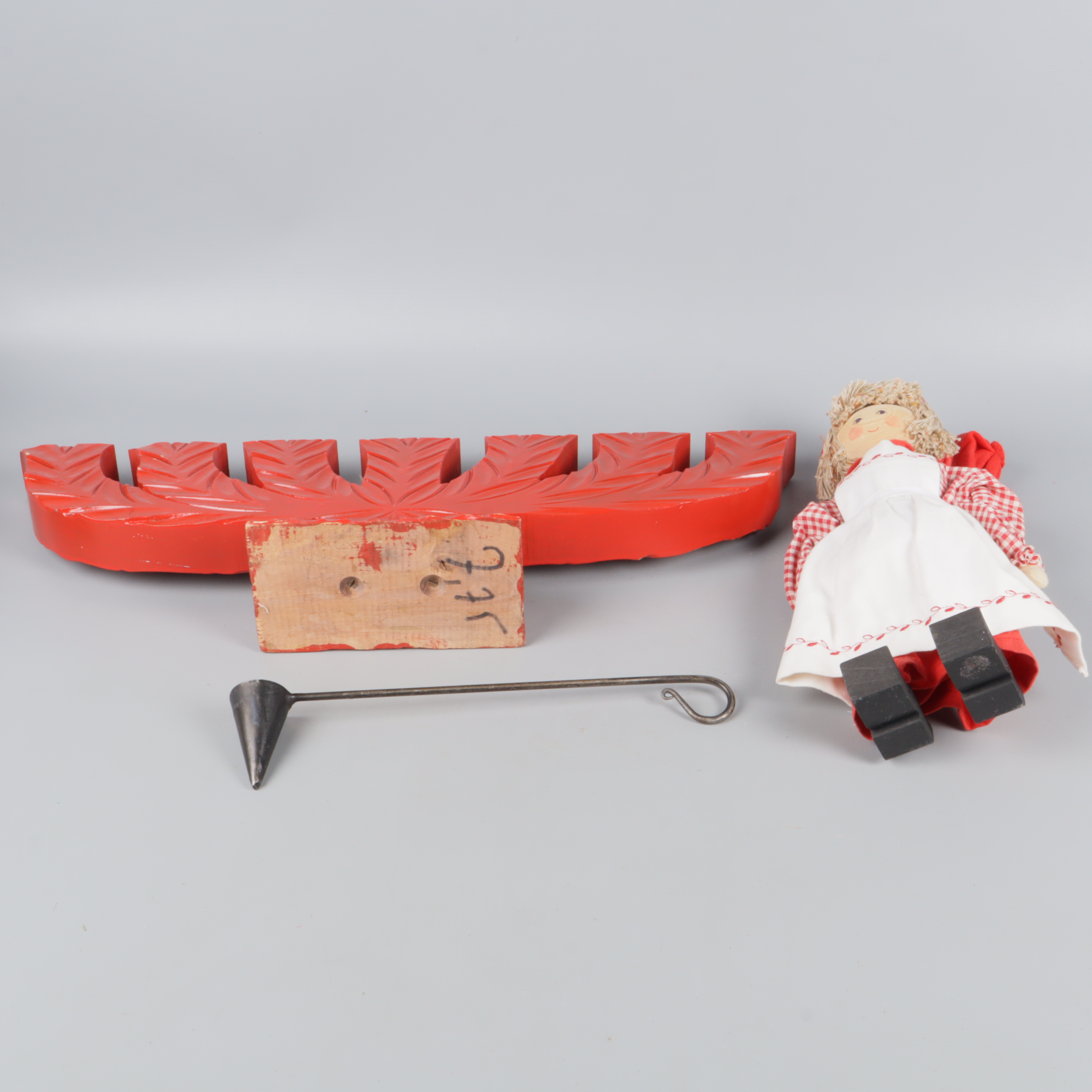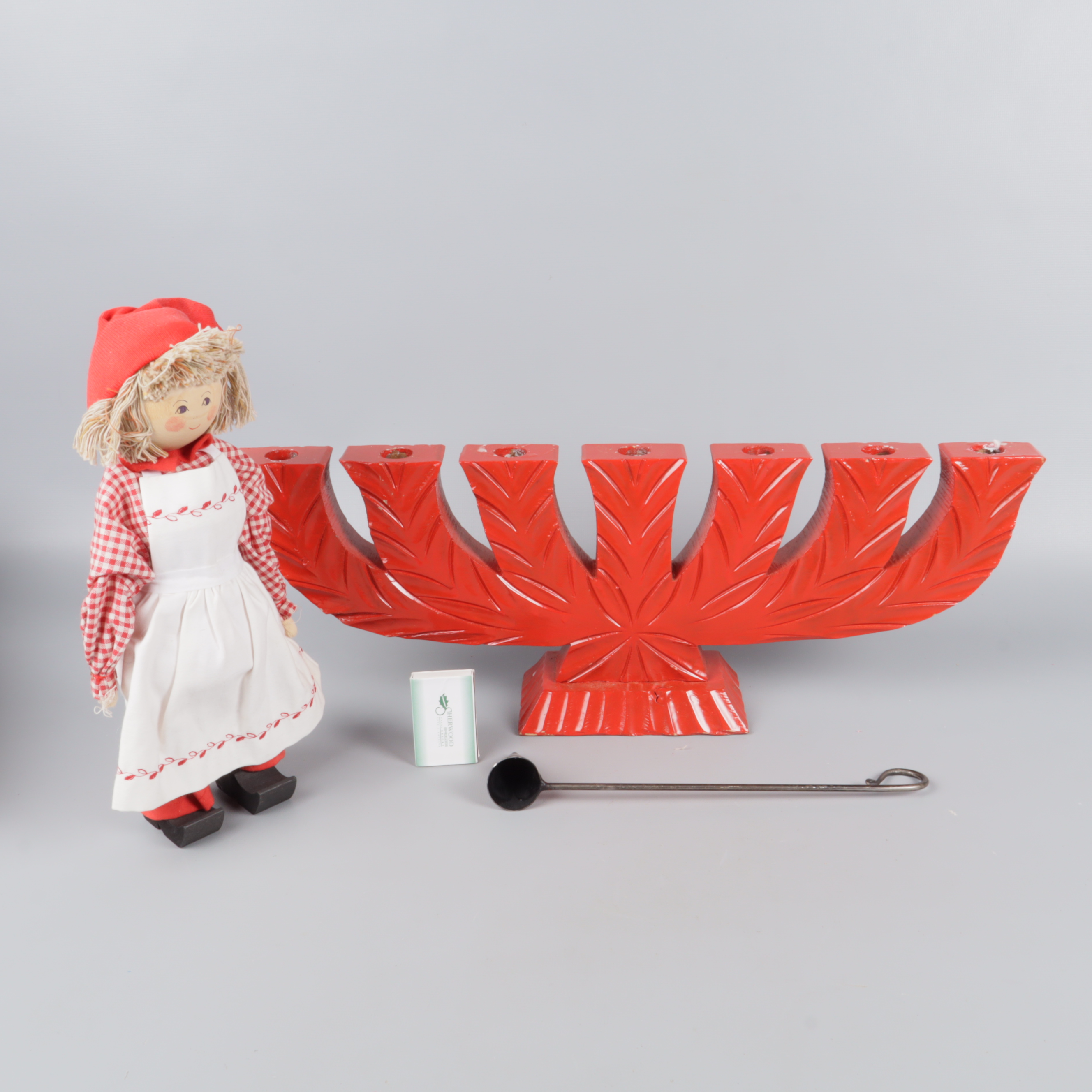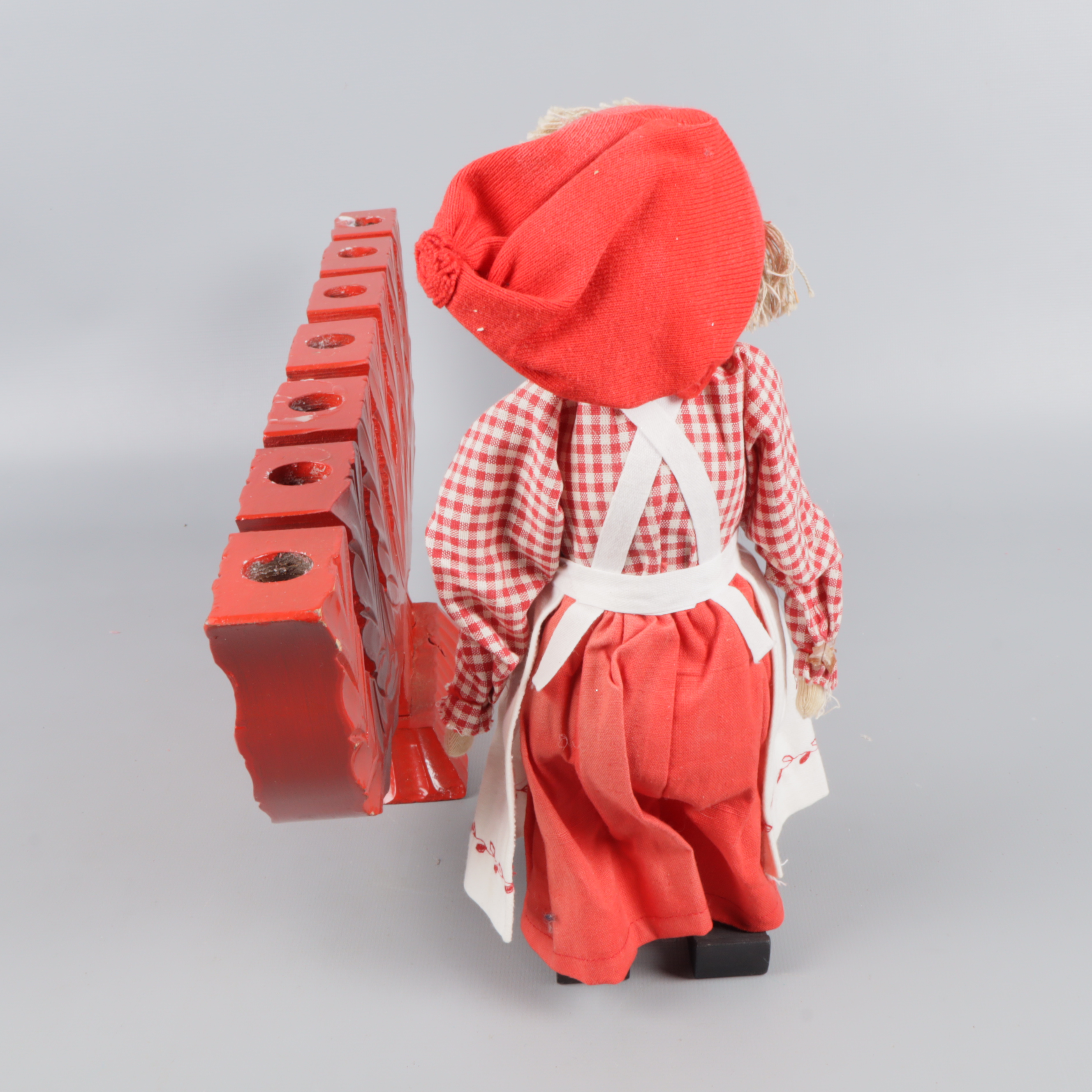 Charmigt set med en handmålad röd ljusstake i trä med distinkt bladmönster och plats för sju ljus. Tillhörande mjuk tomtedocka med rutiga detaljer och broderat förkläde bidrar till en lekfull och hemtrevlig känsla. Ljus ingår ej.