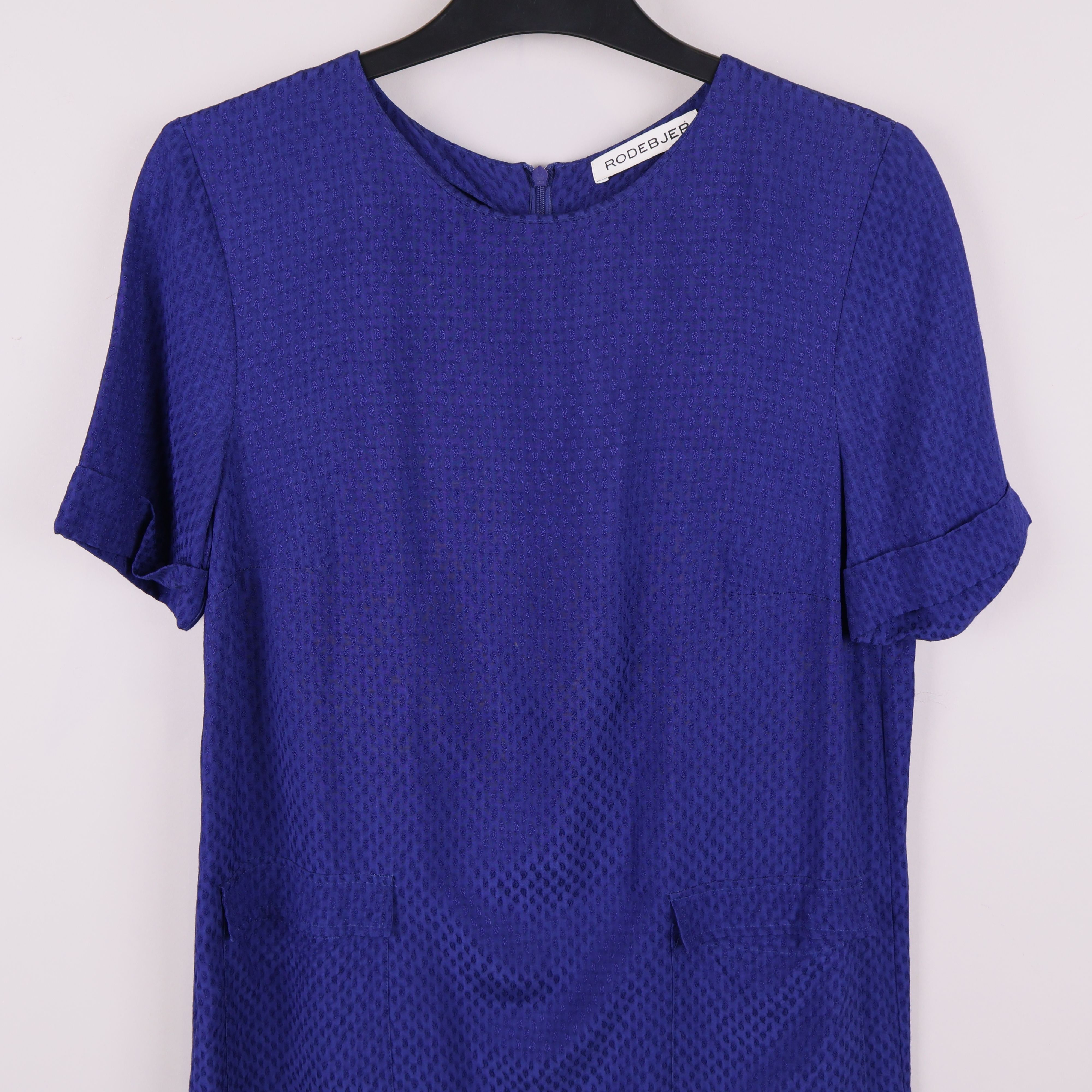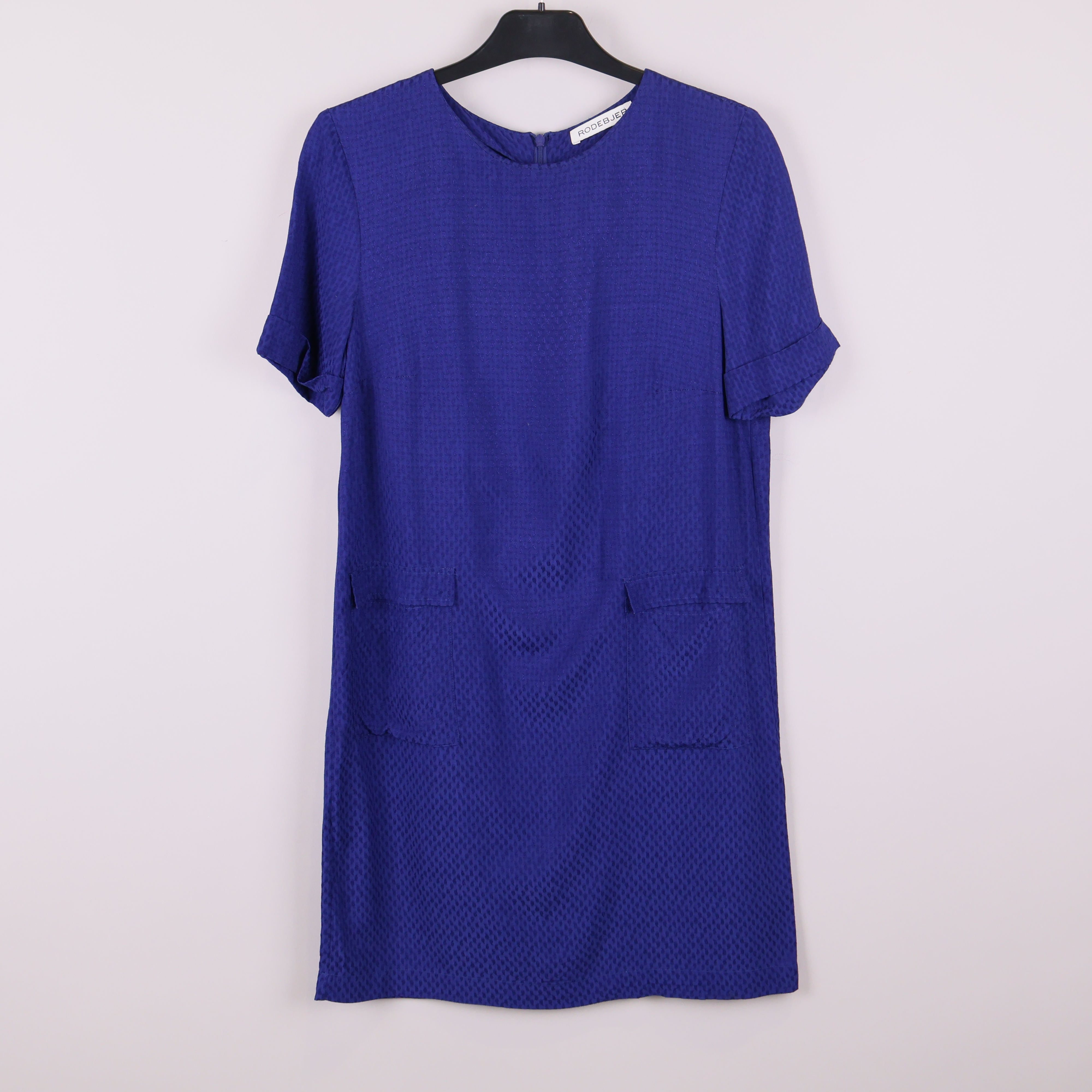 Den här klänningen i klar blå ton har en mjukt strukturerad yta som ger en modern känsla. Modellen har korta ärmar, rund halsringning och två praktiska framfickor för en avslappnad touch. Dragkedja bak och diskreta sömmar adderar till den stilrena designen.