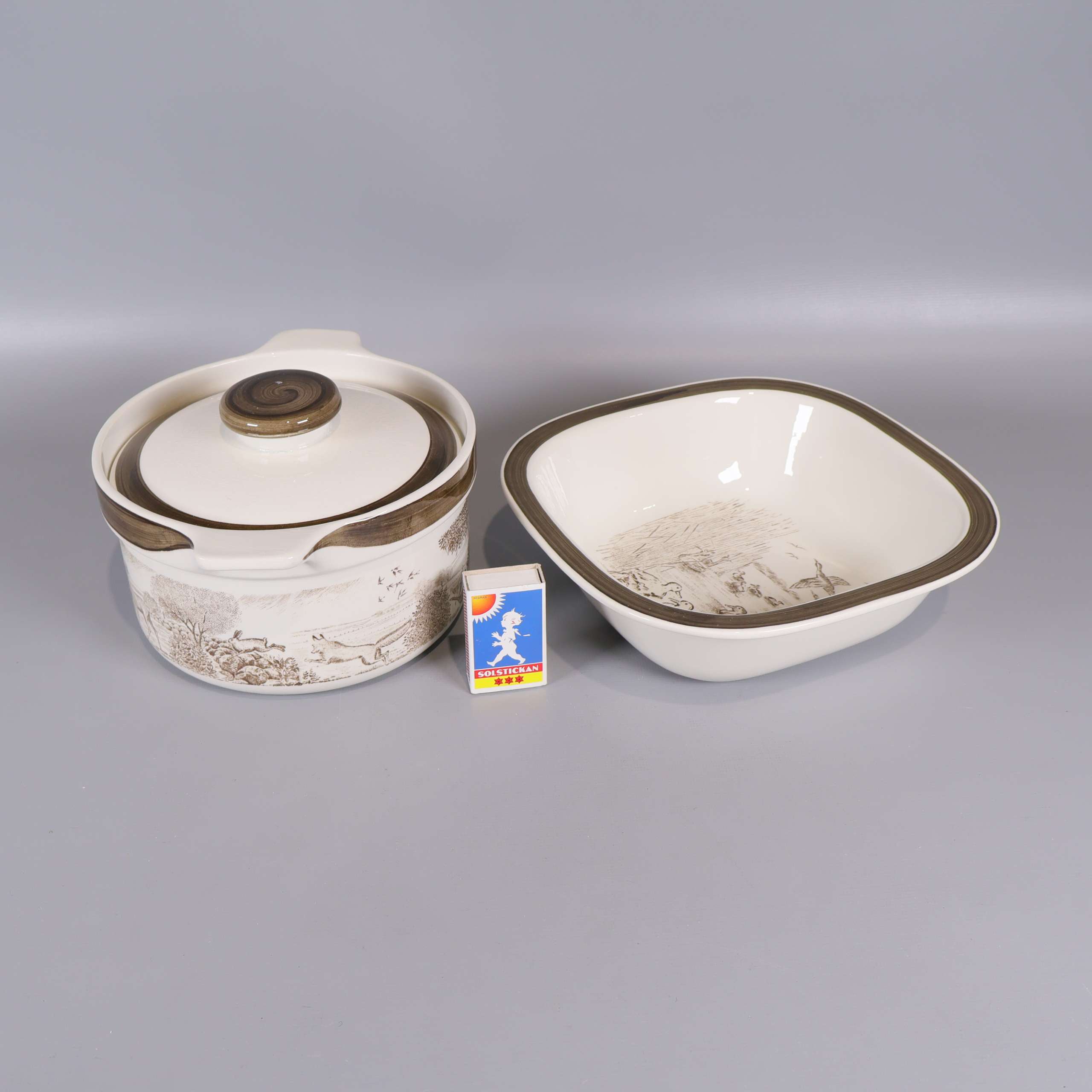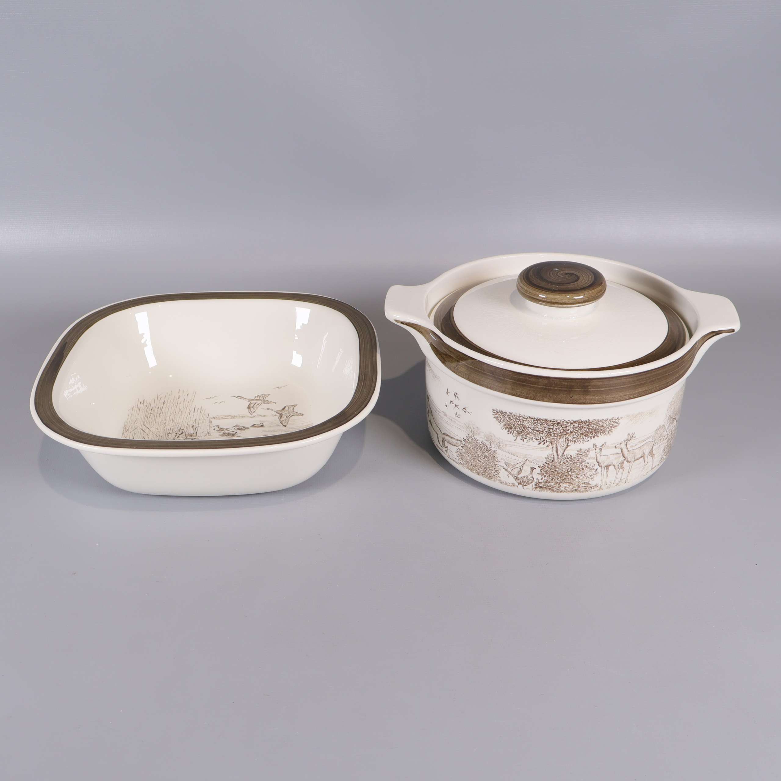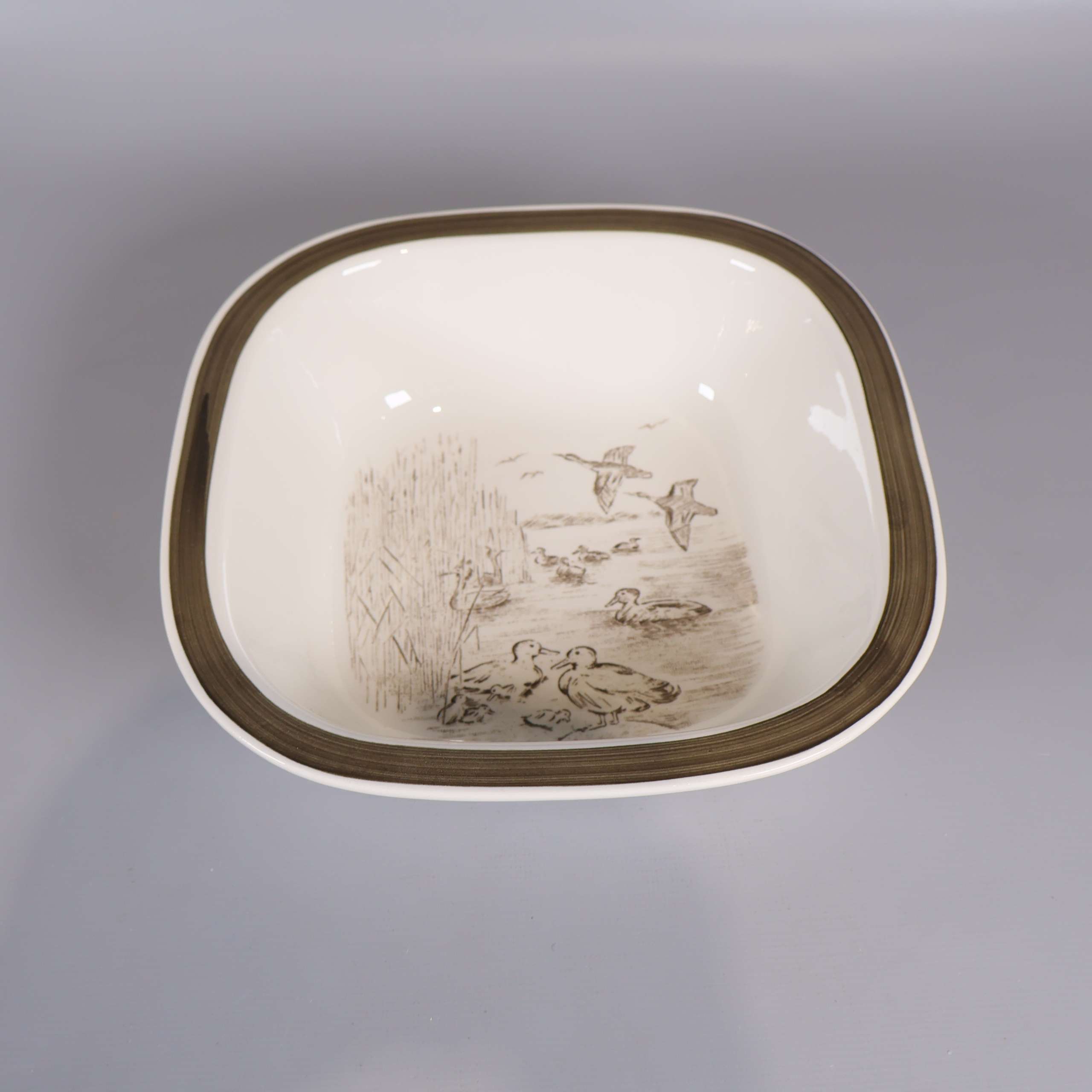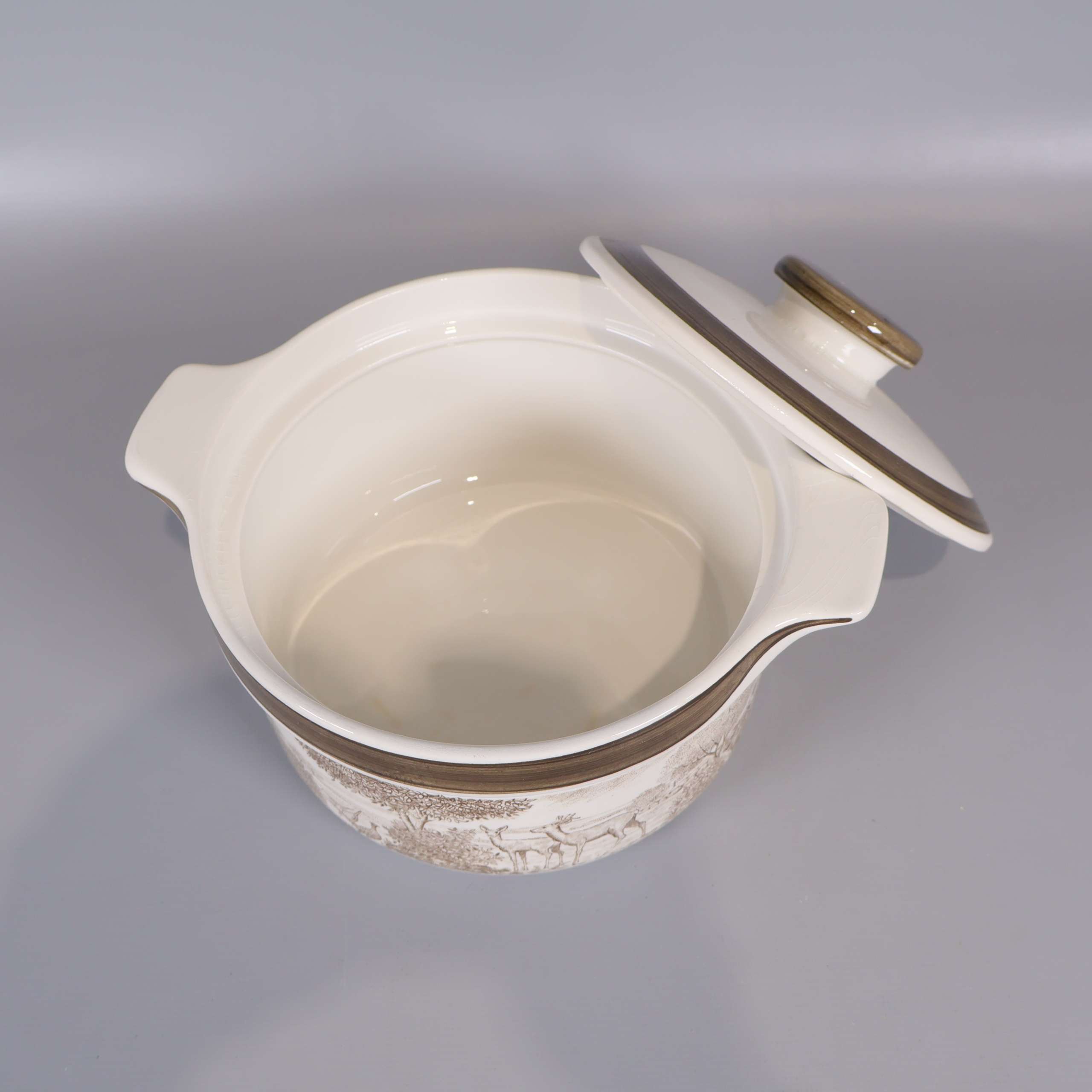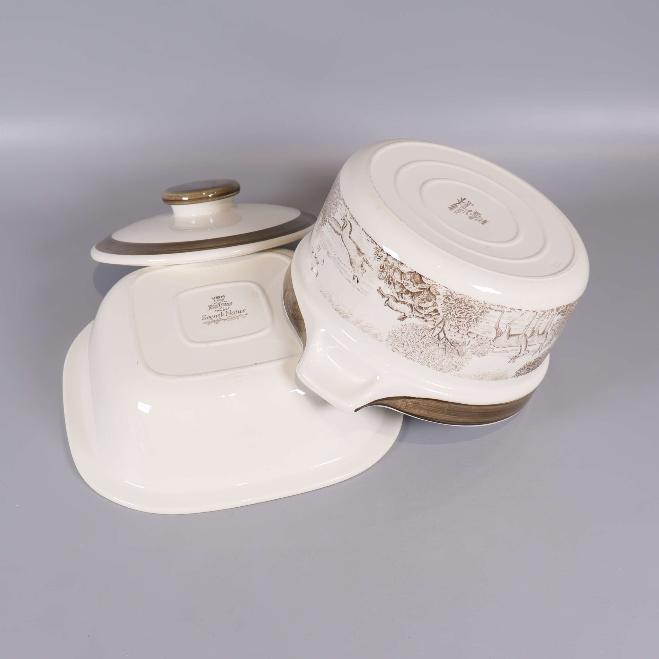 Vackert set med karott och skål från Rörstrand, dekorerade med detaljerat naturmotiv i mjuka toner och rustika bruna kanter. Tidlös retrostil med rundade former och greppvänliga handtag. Perfekt för dig som gillar klassisk design och uppskattar Swedish vintage vibe.