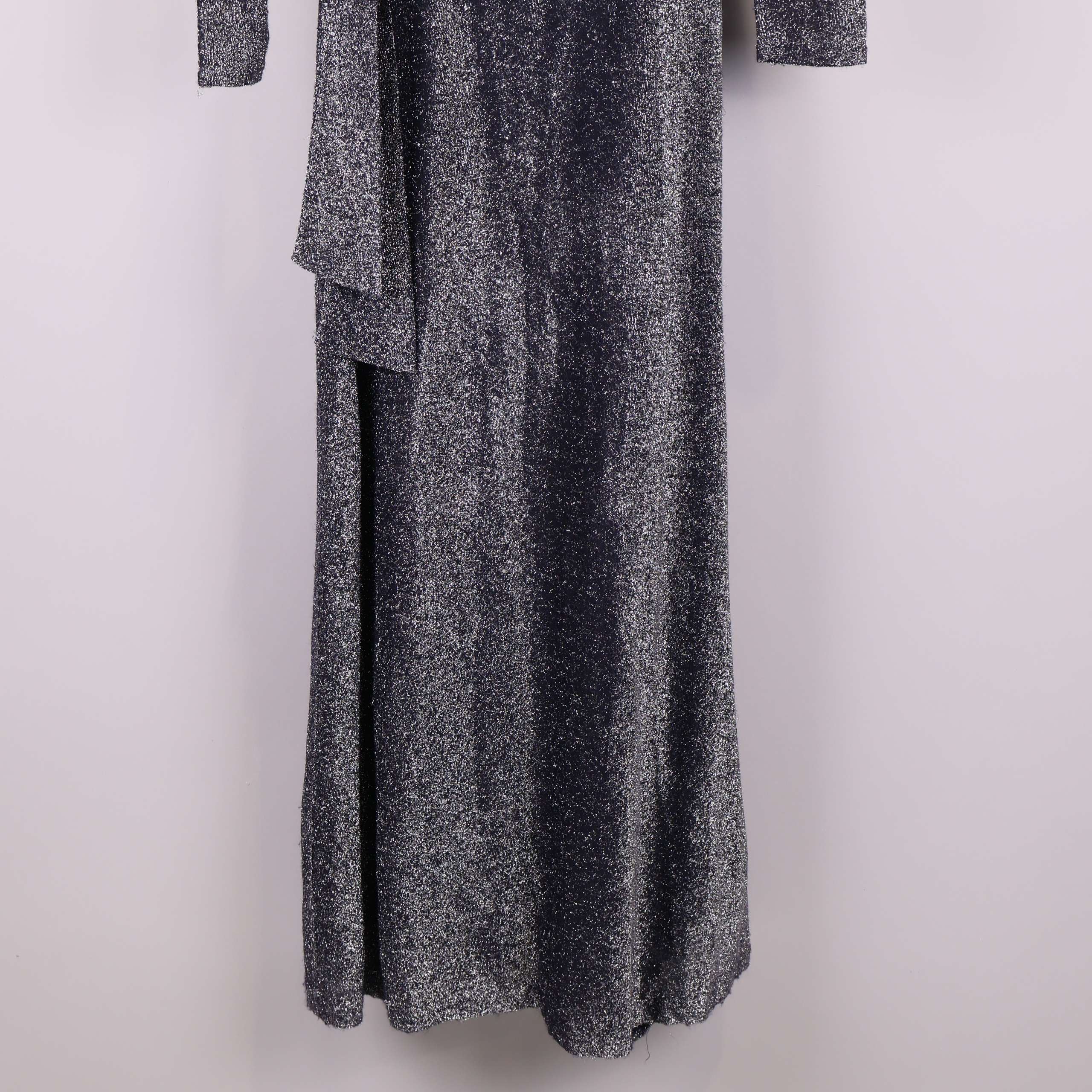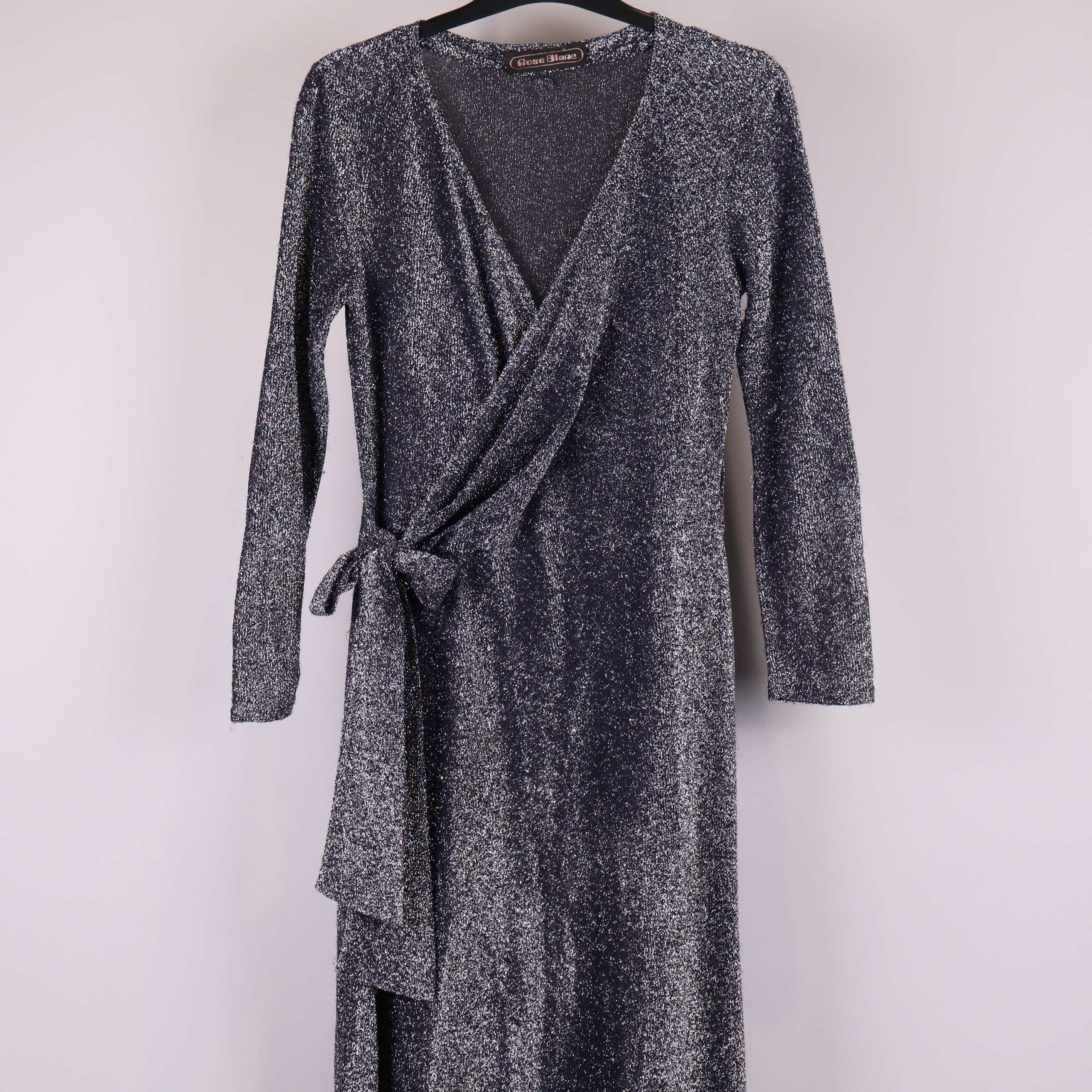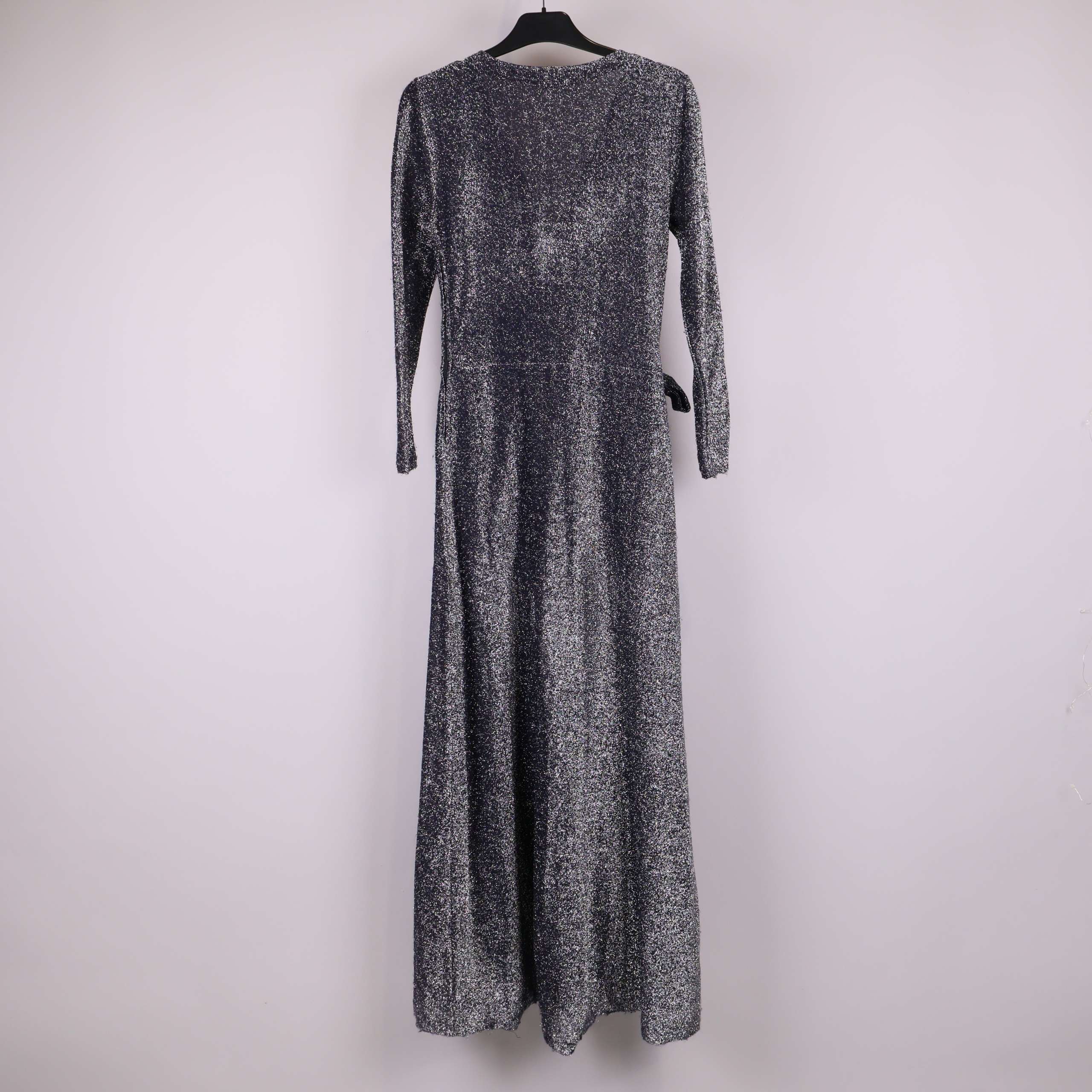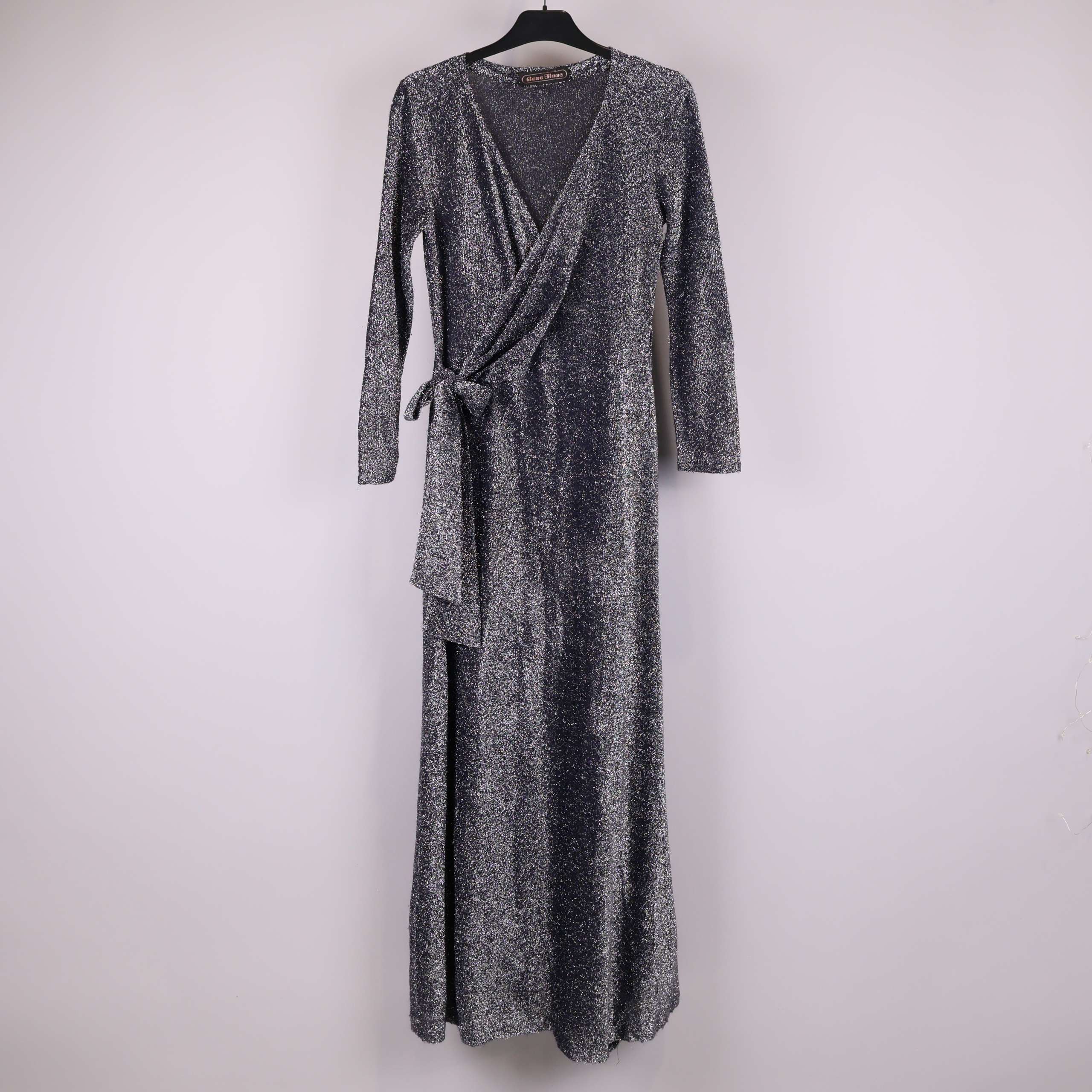 En lång omlottklänning med gnistrande glittereffekt, rak ärm och knytskärp i midjan som ger en elegant look. Klänningen har mjuk stretchig känsla och synlig dragkedja i sidan. Perfekt för dig som söker en festlig stil med modern sparkle.