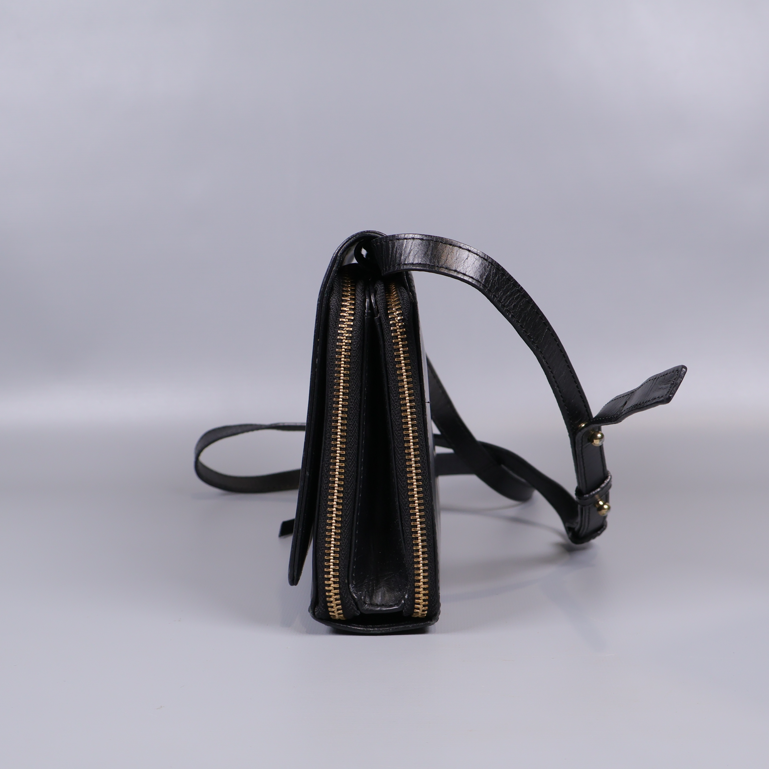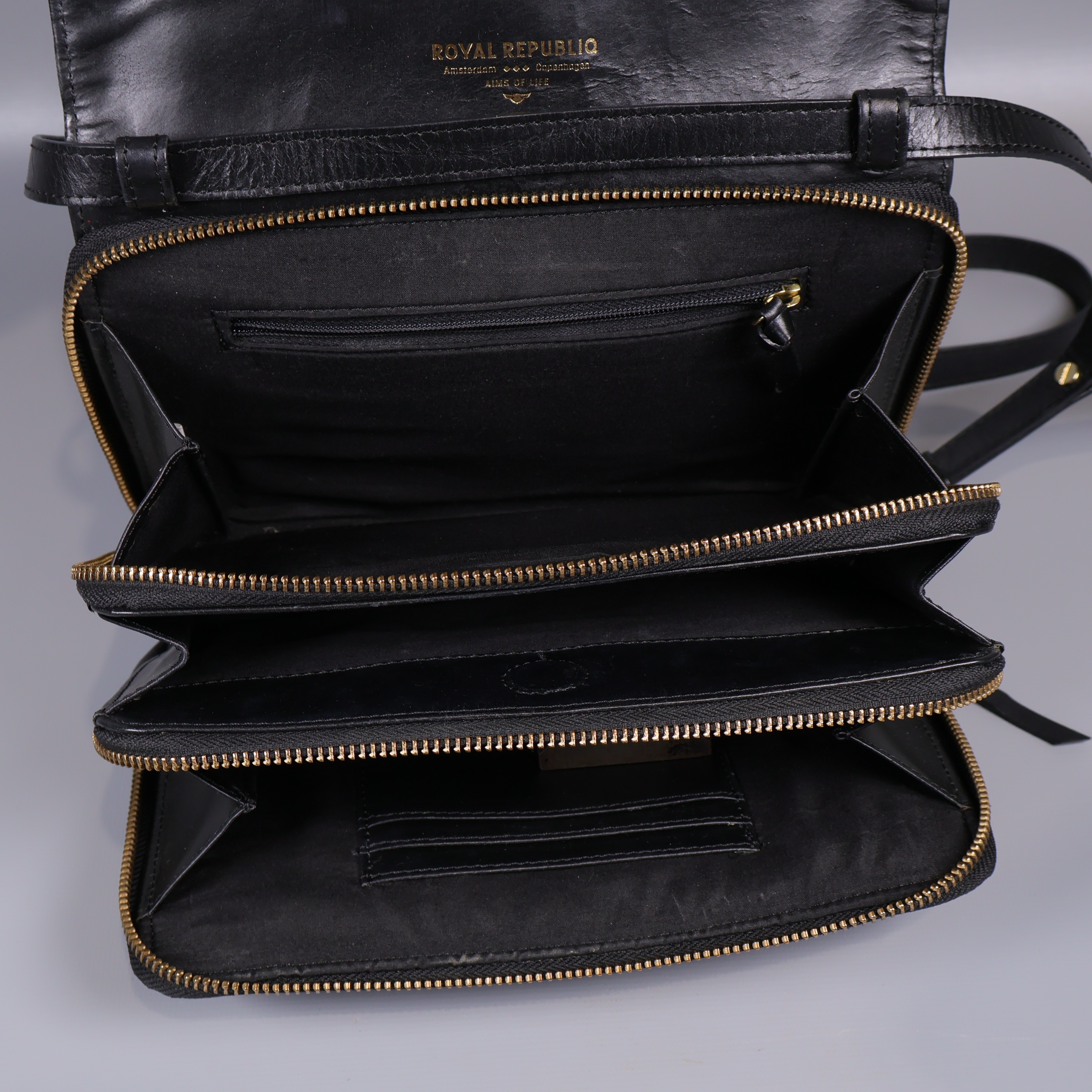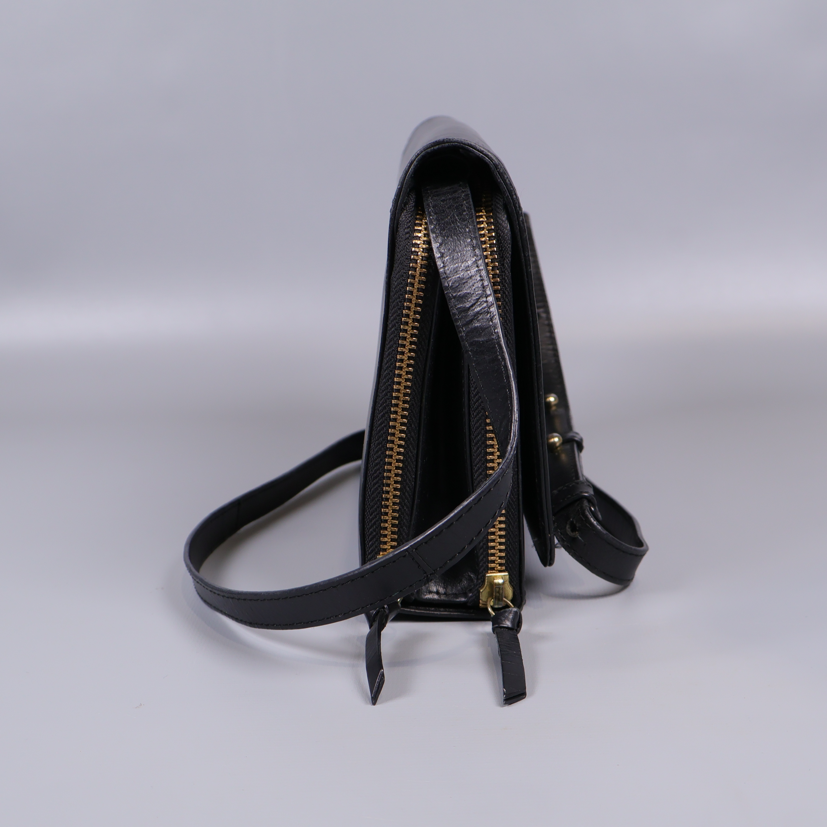 Snygg axelremsväska i svart med en stilren och kompakt design. Väskan har tre separata fack med guldfärgade dragkedjor, justerbar rem och ett slätt yttre som ger ett elegant intryck. Praktiska innerfack gör det enkelt att organisera dina saker och den passar perfekt både till vardag och fest.