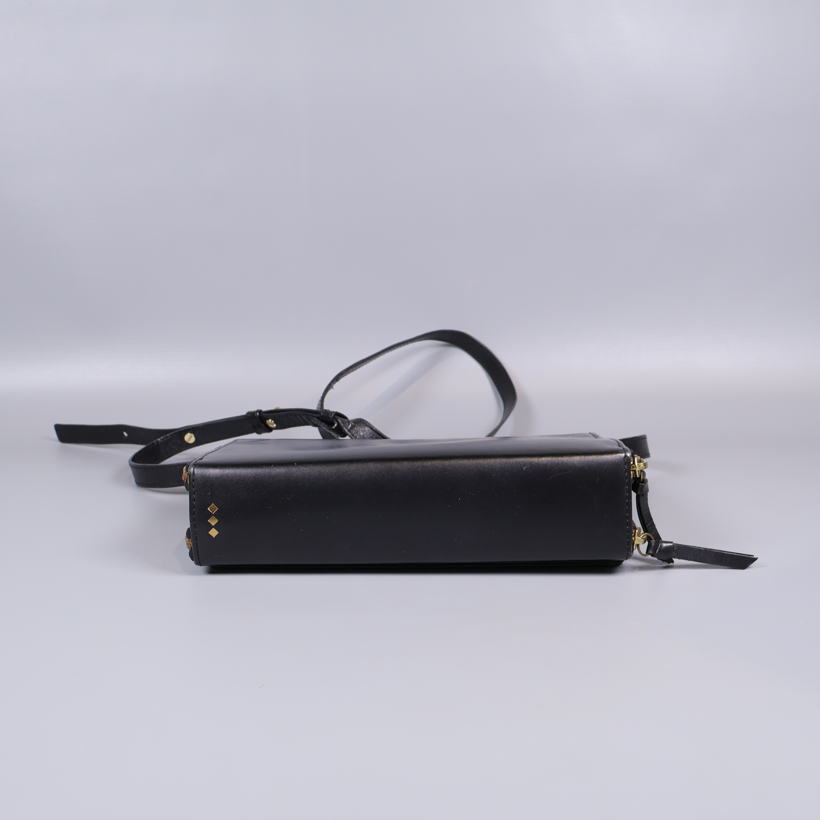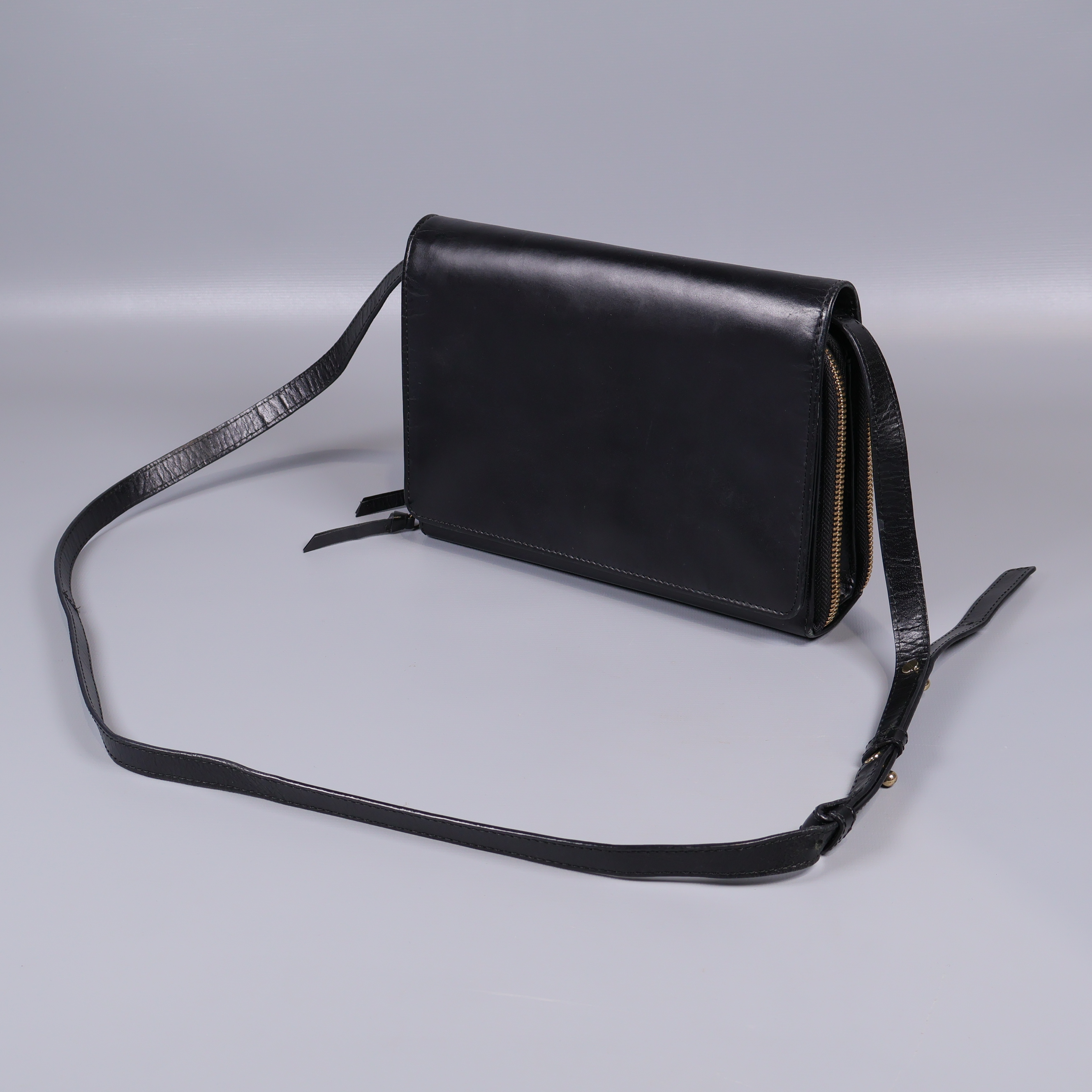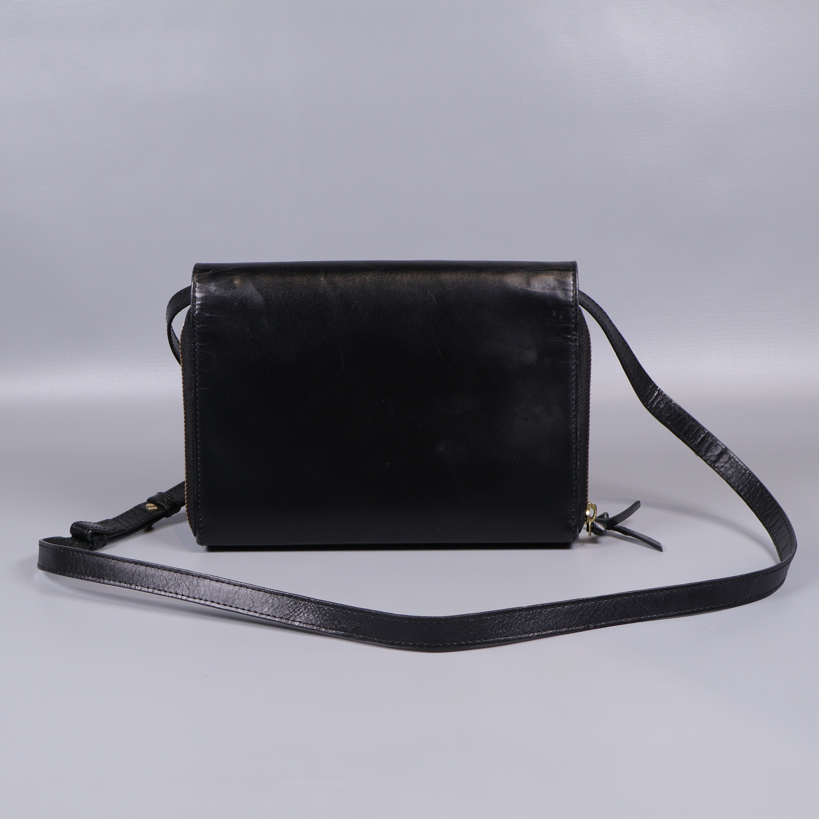 Snygg axelremsväska i svart med en stilren och kompakt design. Väskan har tre separata fack med guldfärgade dragkedjor, justerbar rem och ett slätt yttre som ger ett elegant intryck. Praktiska innerfack gör det enkelt att organisera dina saker och den passar perfekt både till vardag och fest.