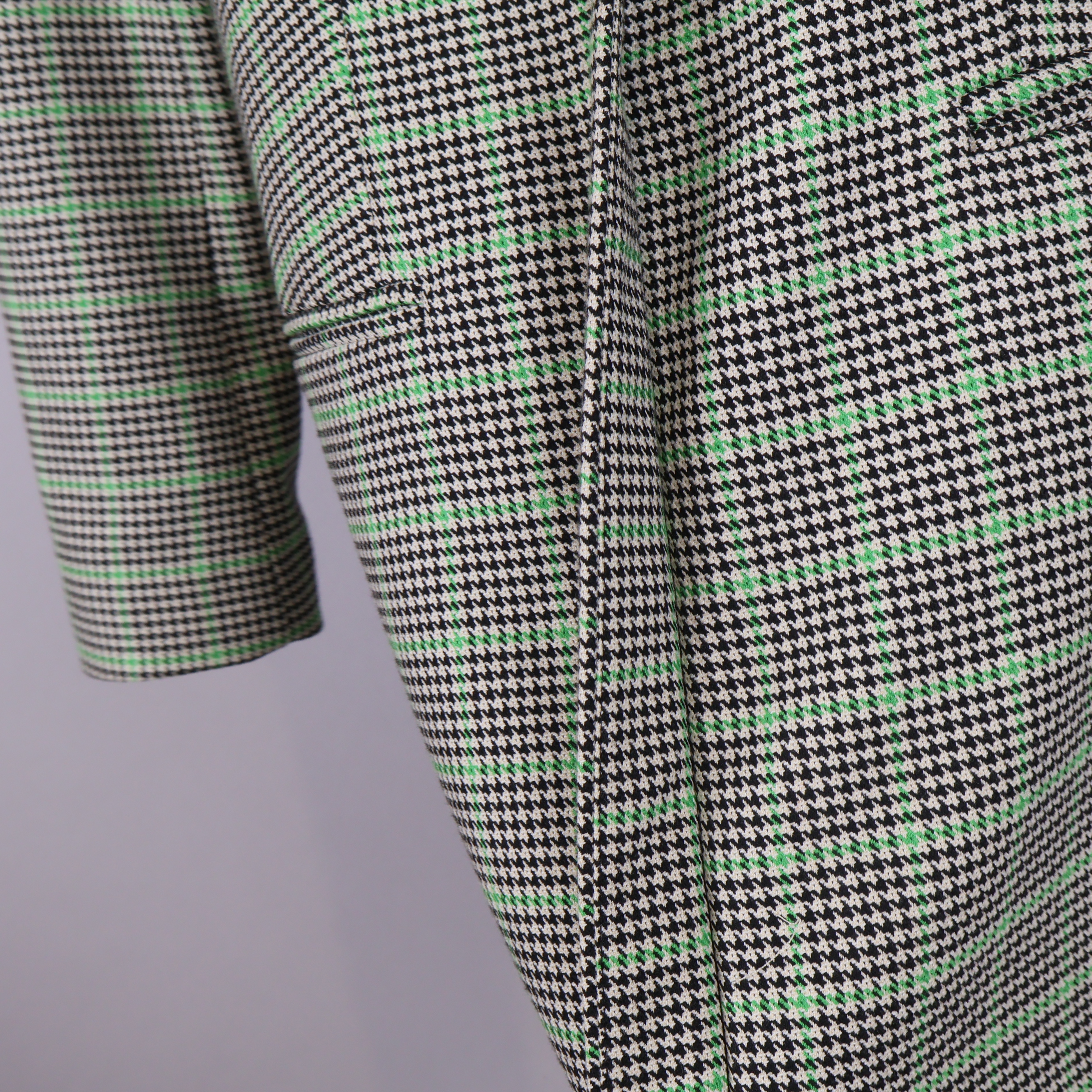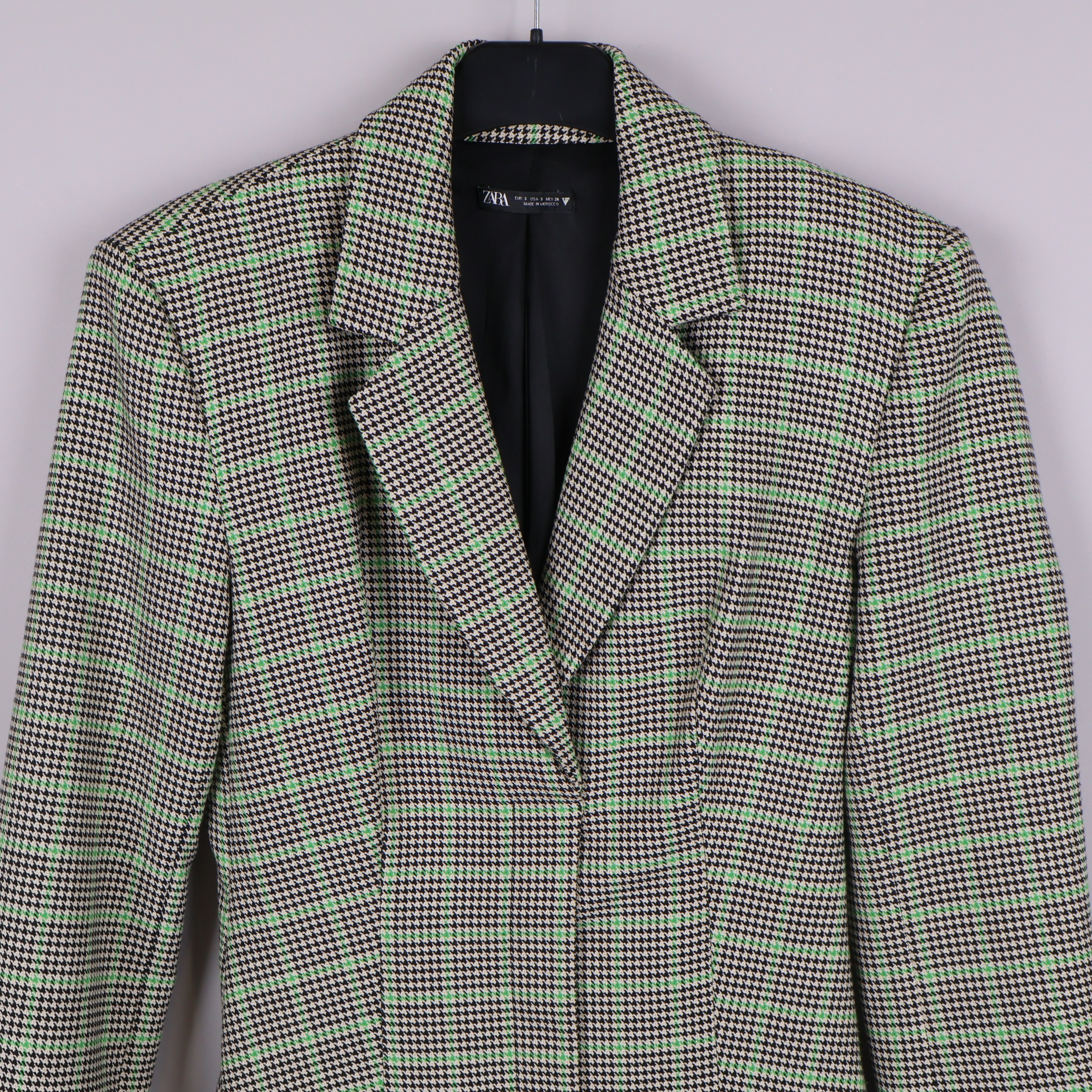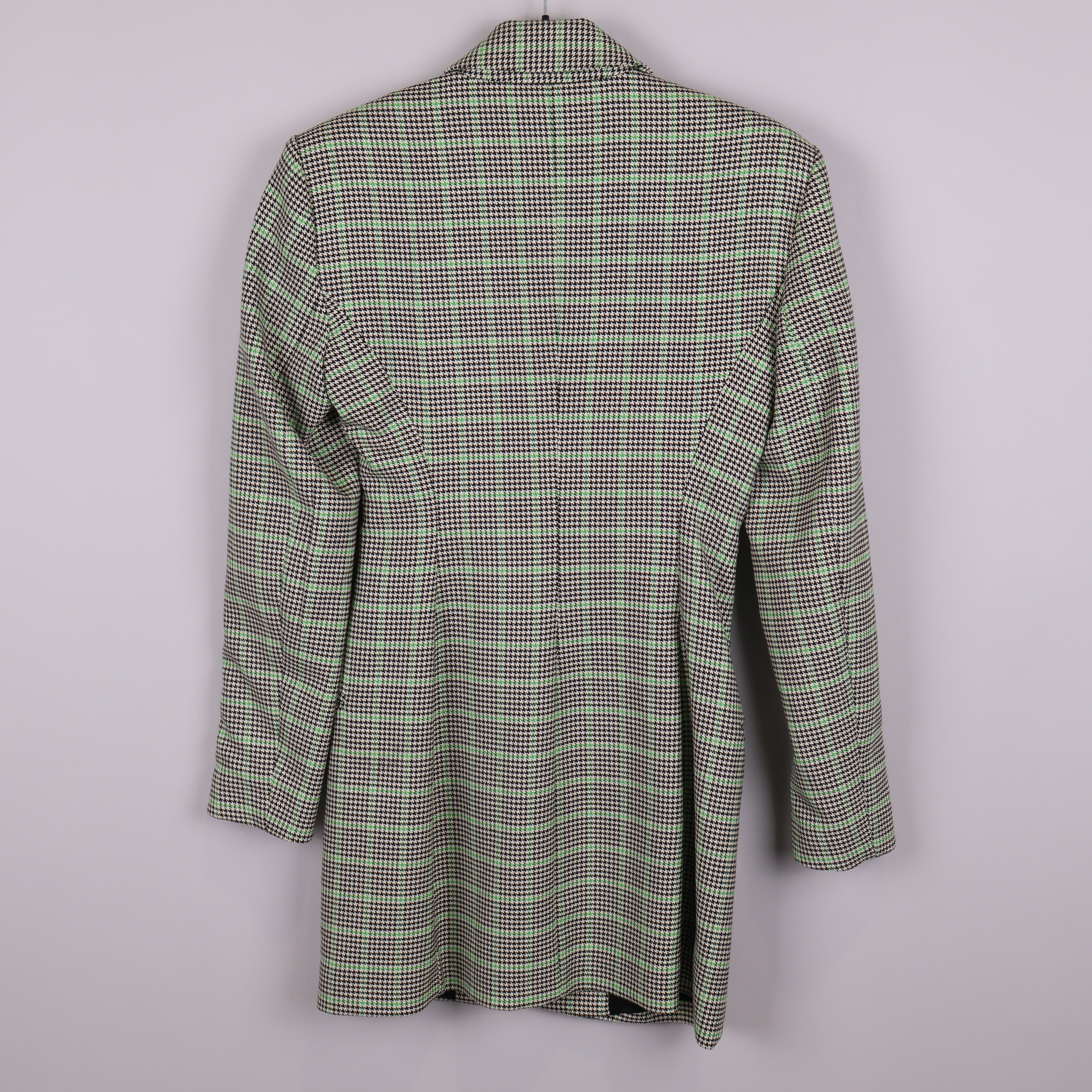 Stilren kavajklänning med klassiskt rutig mönster i svart, vitt och grönt som ger en modern och pigg look. Klänningen har rak passform, markerad krage och två fake fickor. Dold dragkedja i sidan. Fodret är svart för extra kontrast. Rutmönstret med gröna inslag skapar en uppdaterad vintage vibe som passar till många stilar.